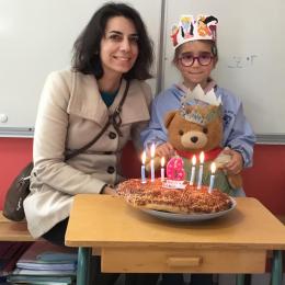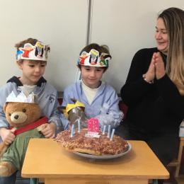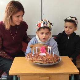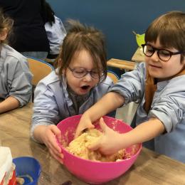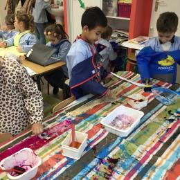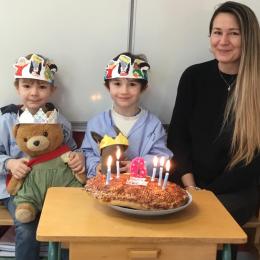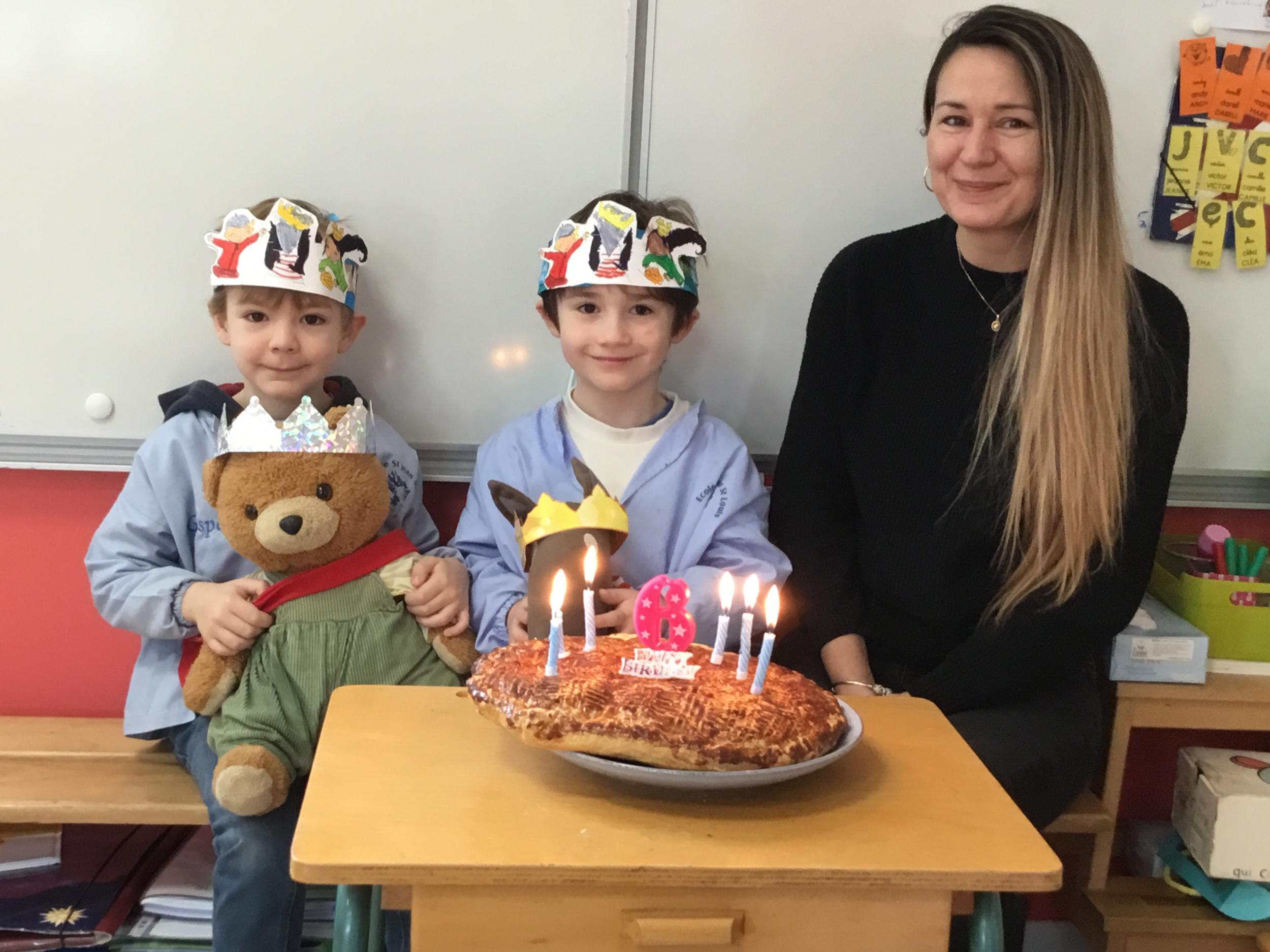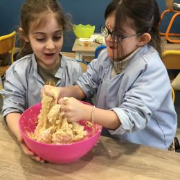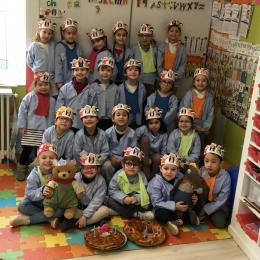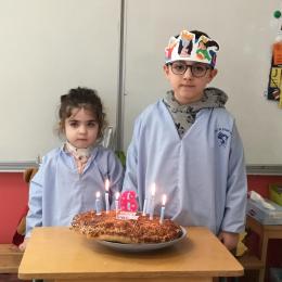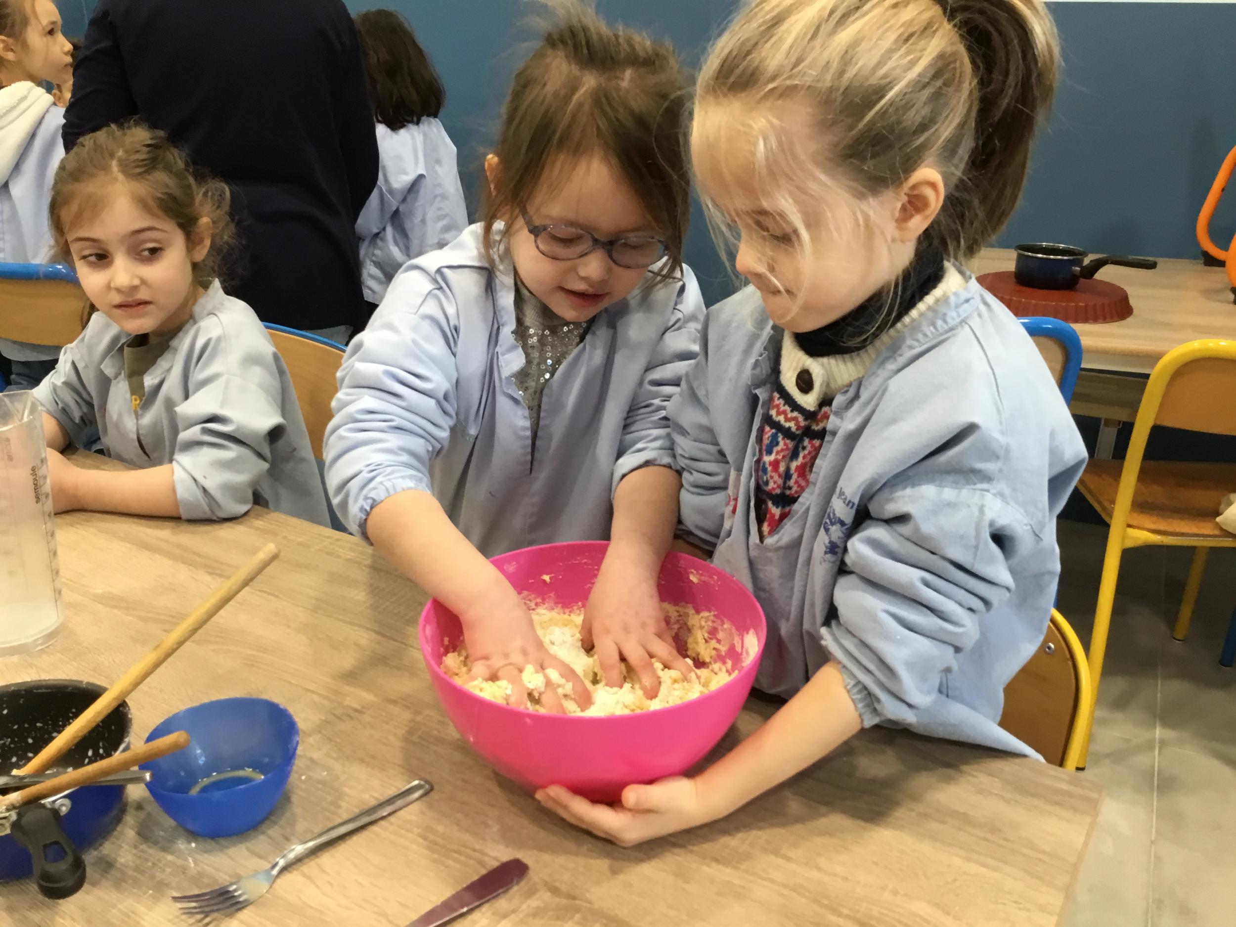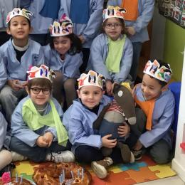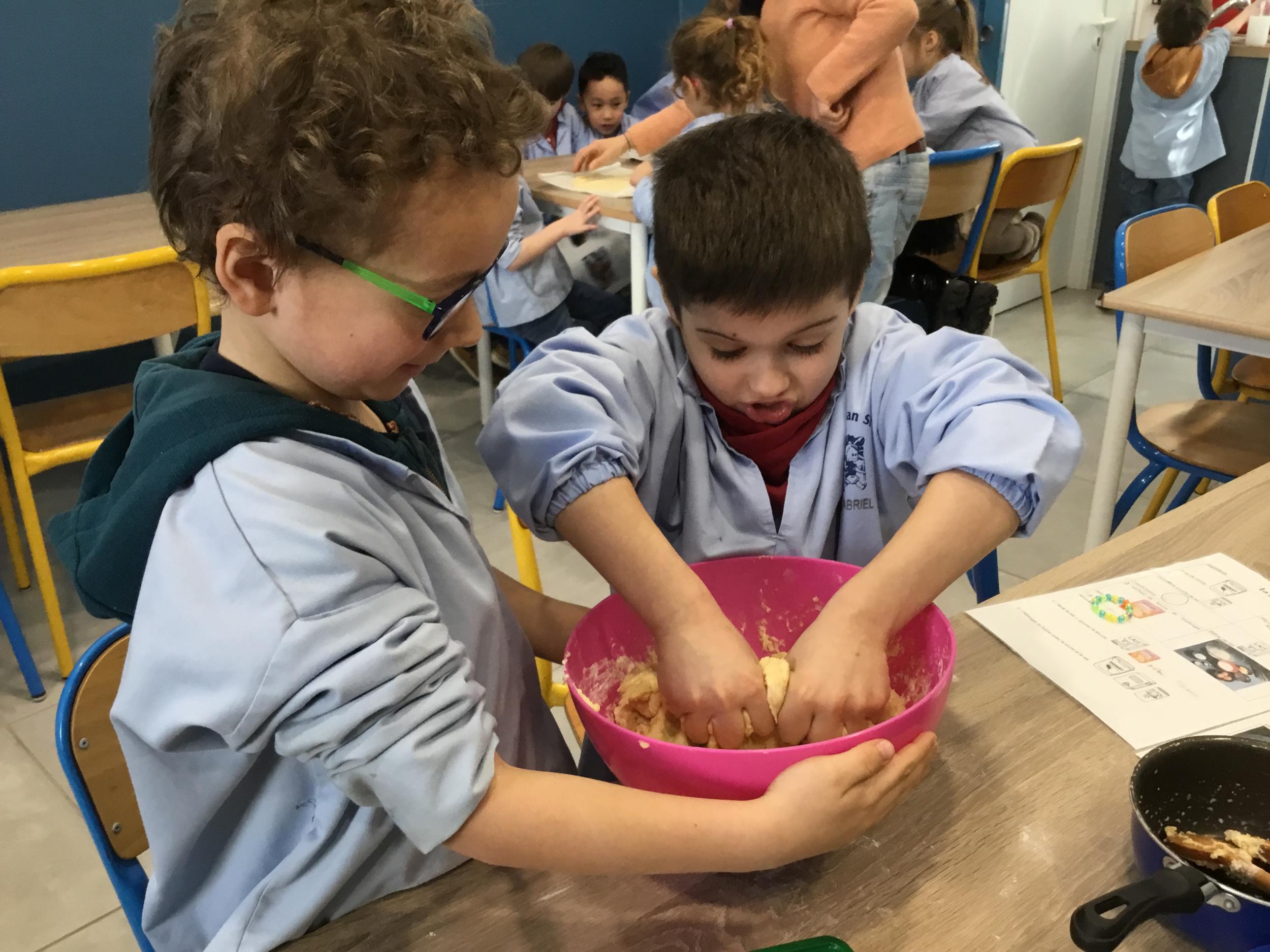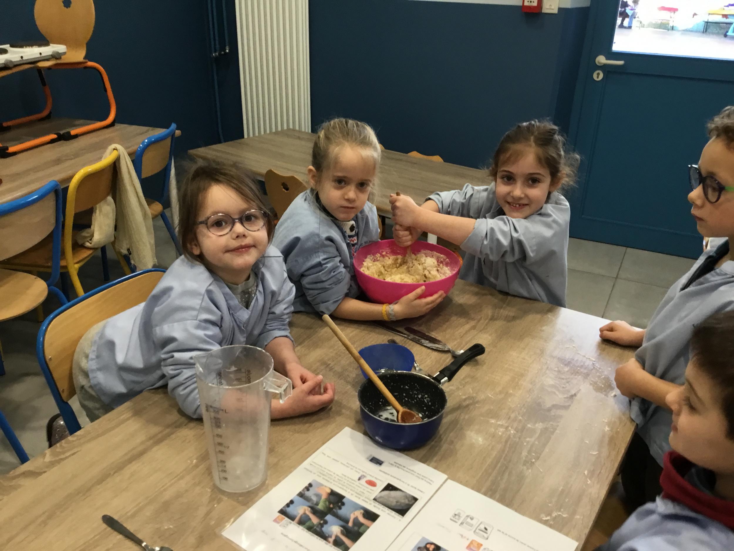 Nous avons travaillé sur un album de galette "la galette du roi loup". Les élèves ont inventé et dessiné plusieurs fins de cette histoire. Ils ont aussi réalisé une couronne en utilisant diverses techniques : choisir un gabarit de couronne, tracer les contours et la découper précisément. La peindre à l'encre et au gros sel : en l'enlevant après séchage, le sel a laissé divers motifs.