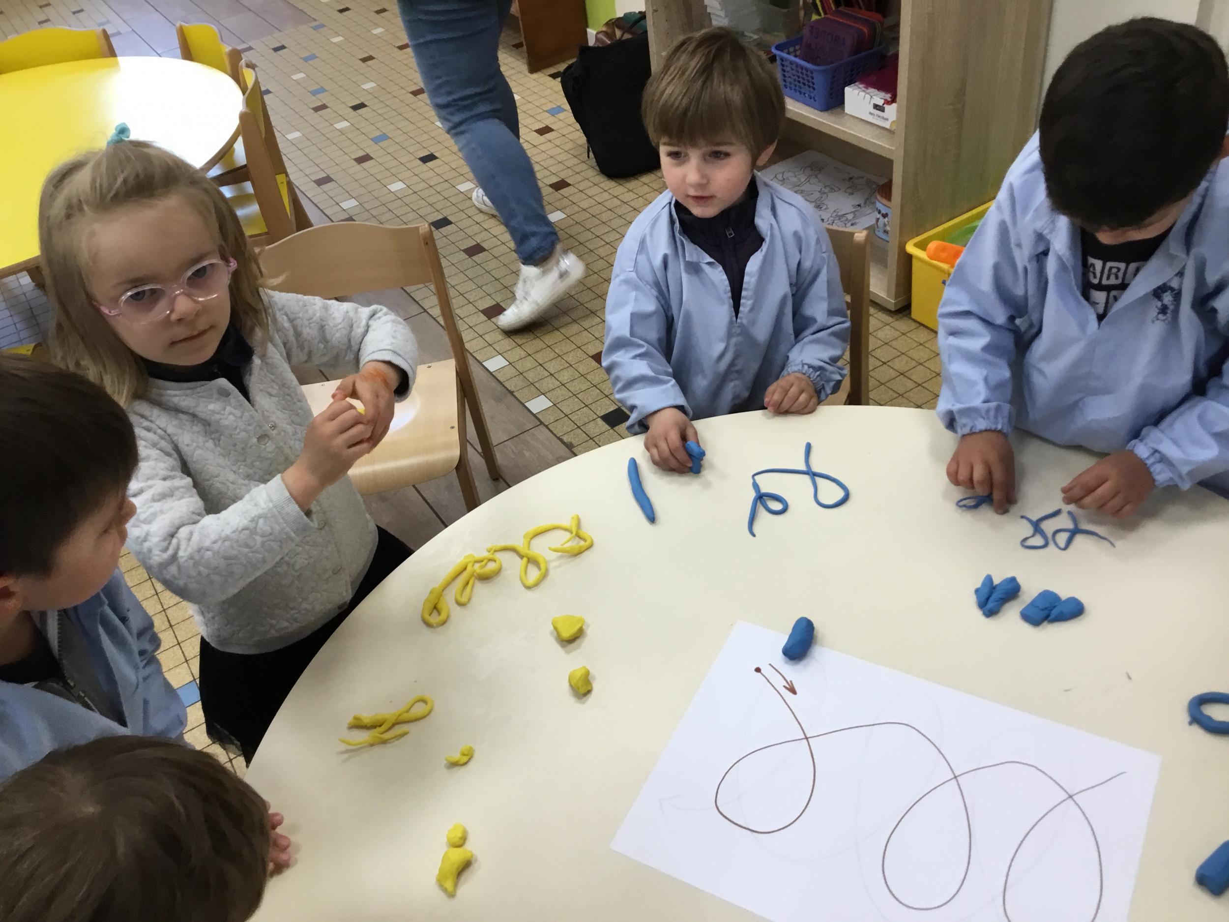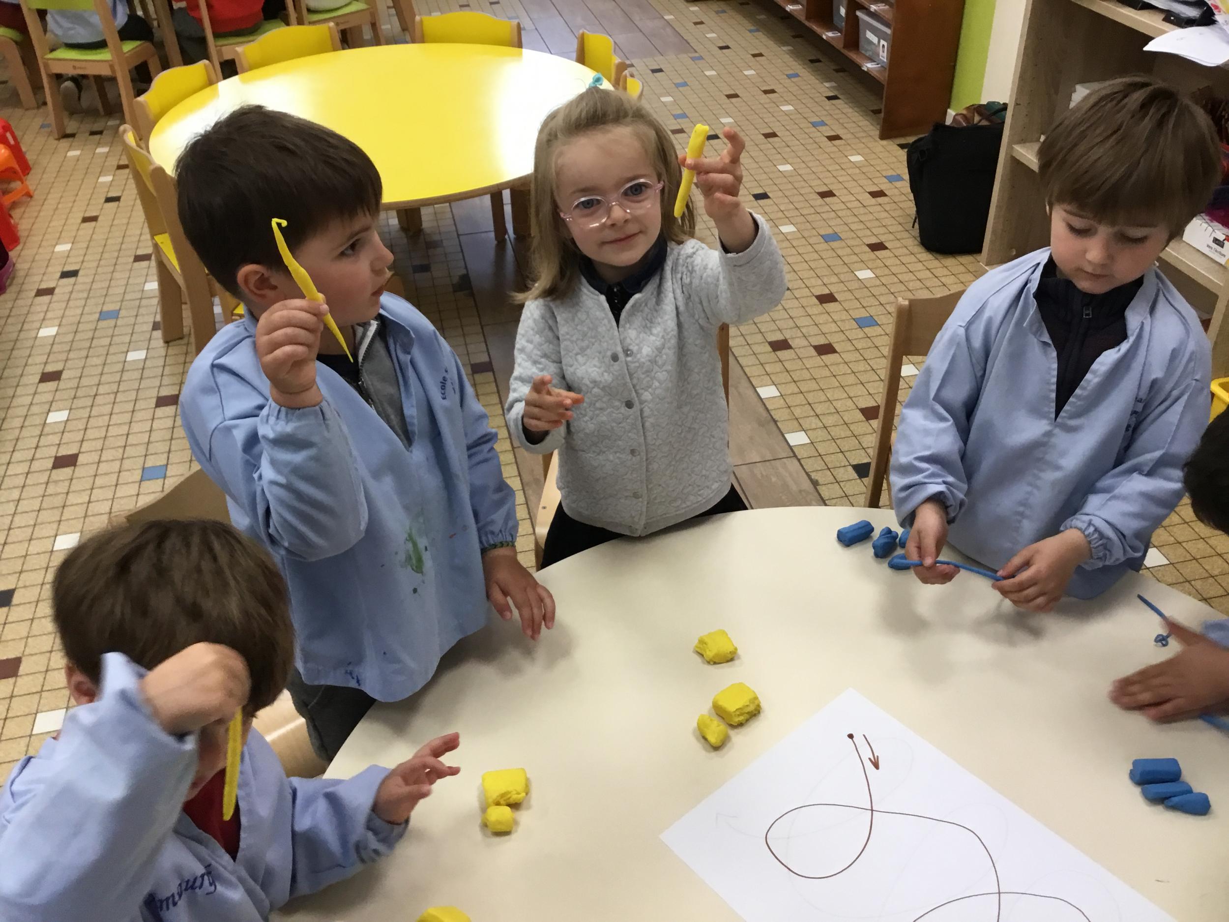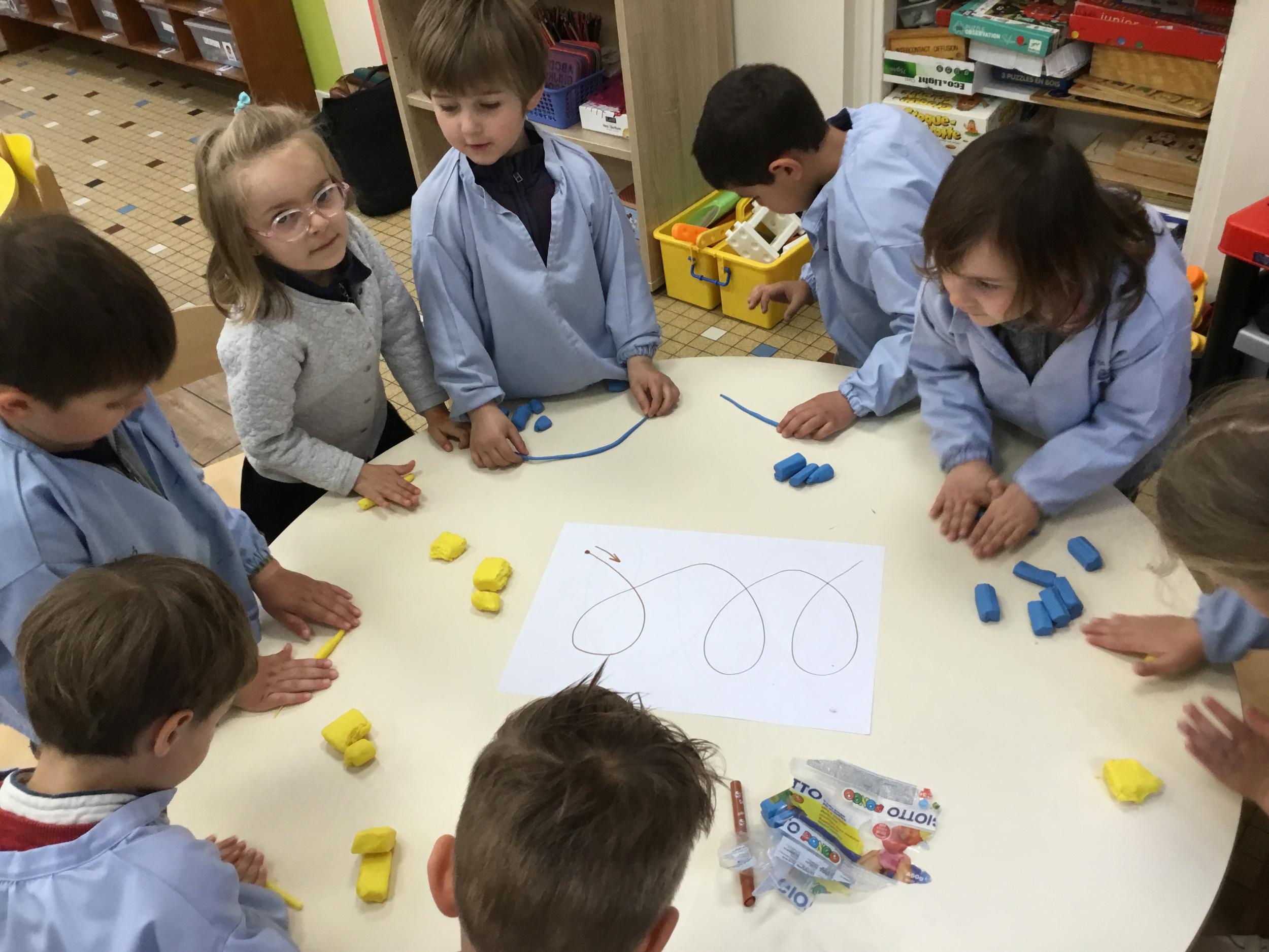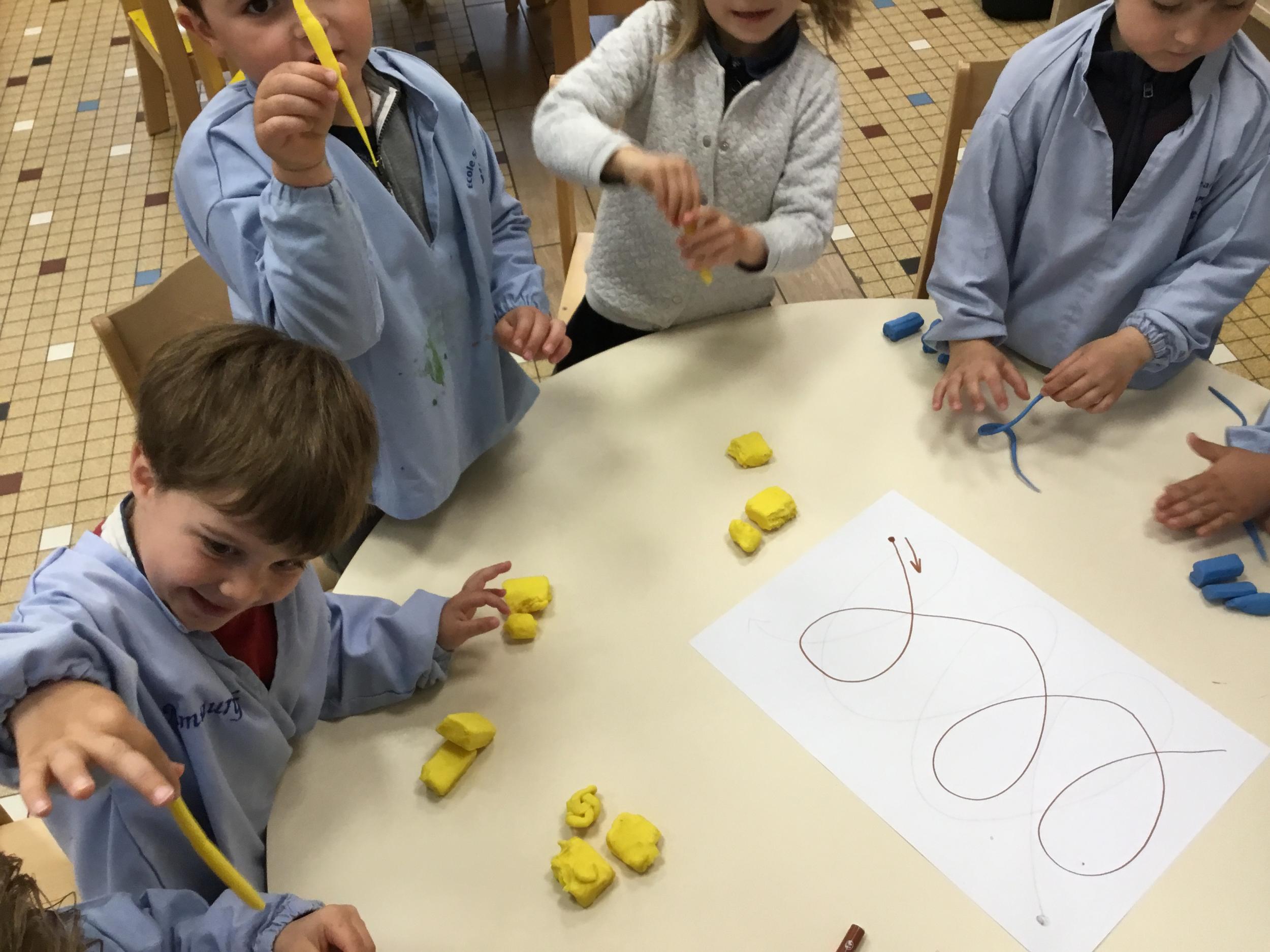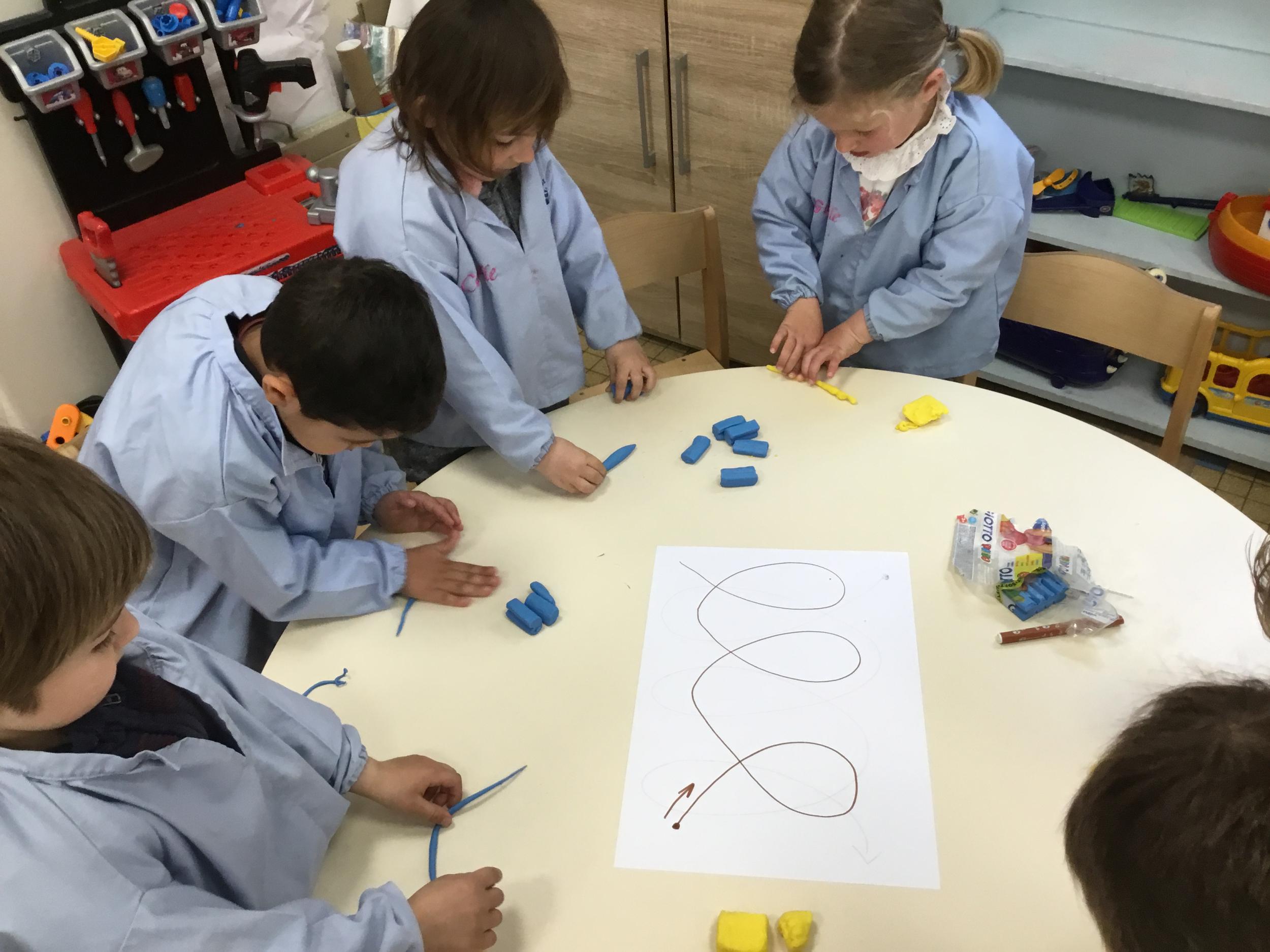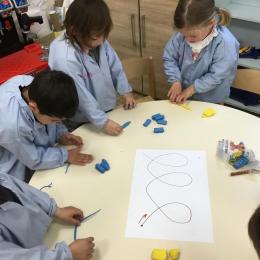 Petite et moyenne section 19/05/2021 En graphisme , les élèves apprennent à faire des boucles en pâte à modeler dans le sens d’écriture. Puis ils peignent des boucles à la manière d’Alexander Calder après avoir observé son tableau .
