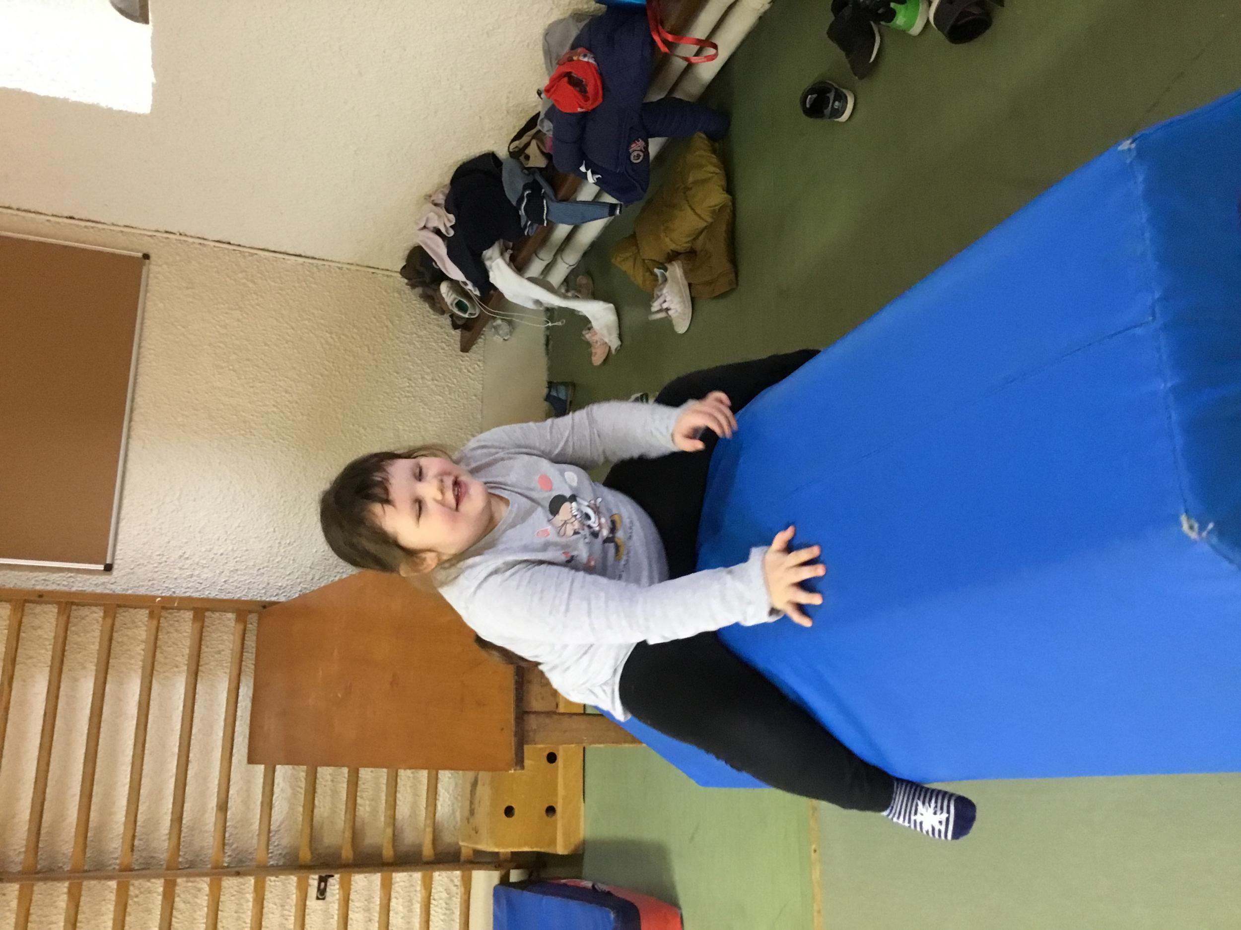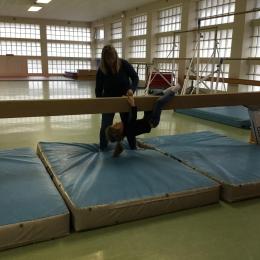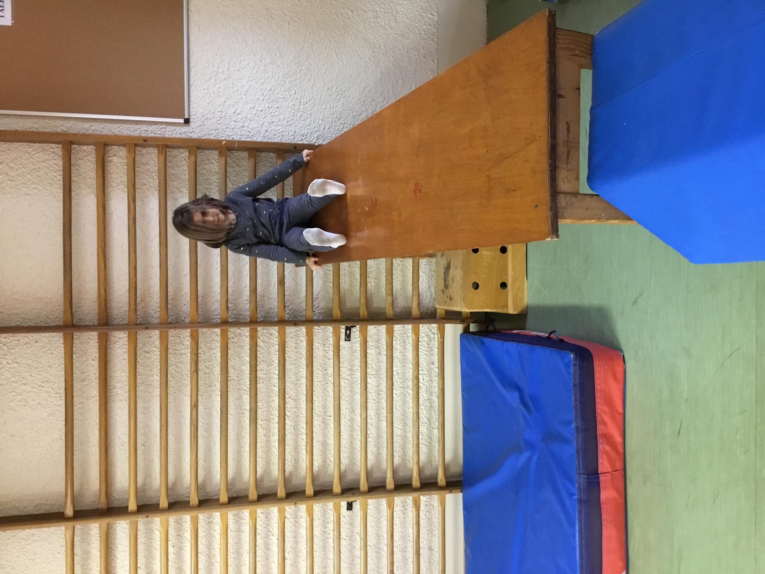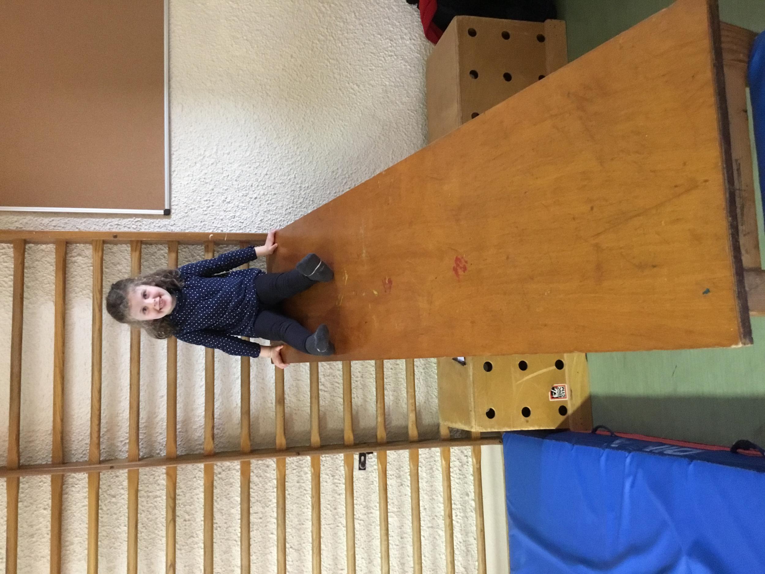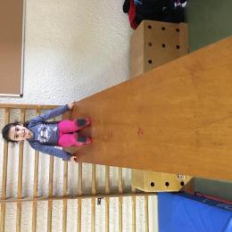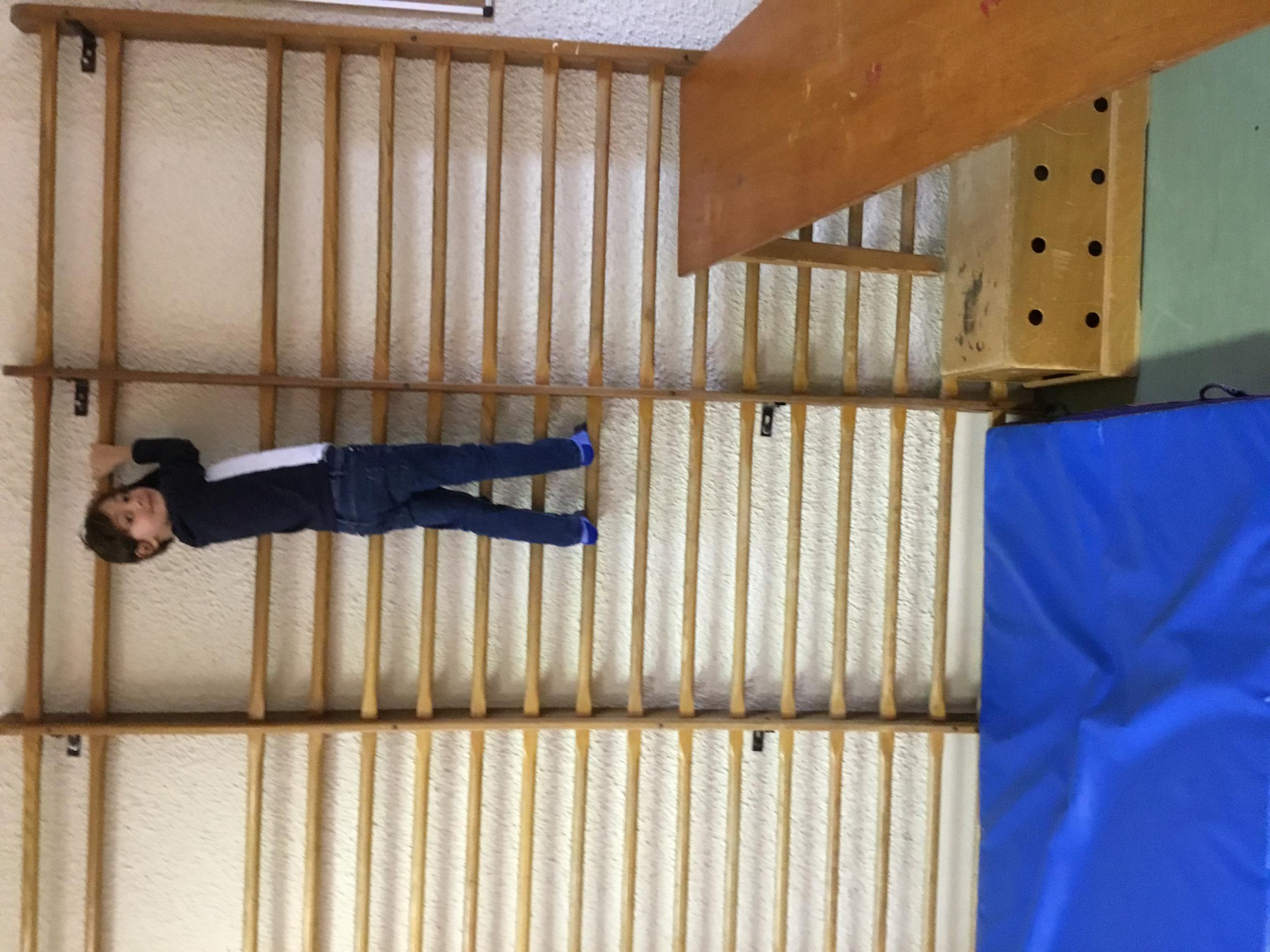 A la salle de sport, profitant du matériel, les élèves ont vaincu leur peur en grimpant sur les espaliers aussi haut qu'ils le pouvaient! Ensuite ils glissaient sur un plan incliné puis se déplaçaient sur un gros matelas.