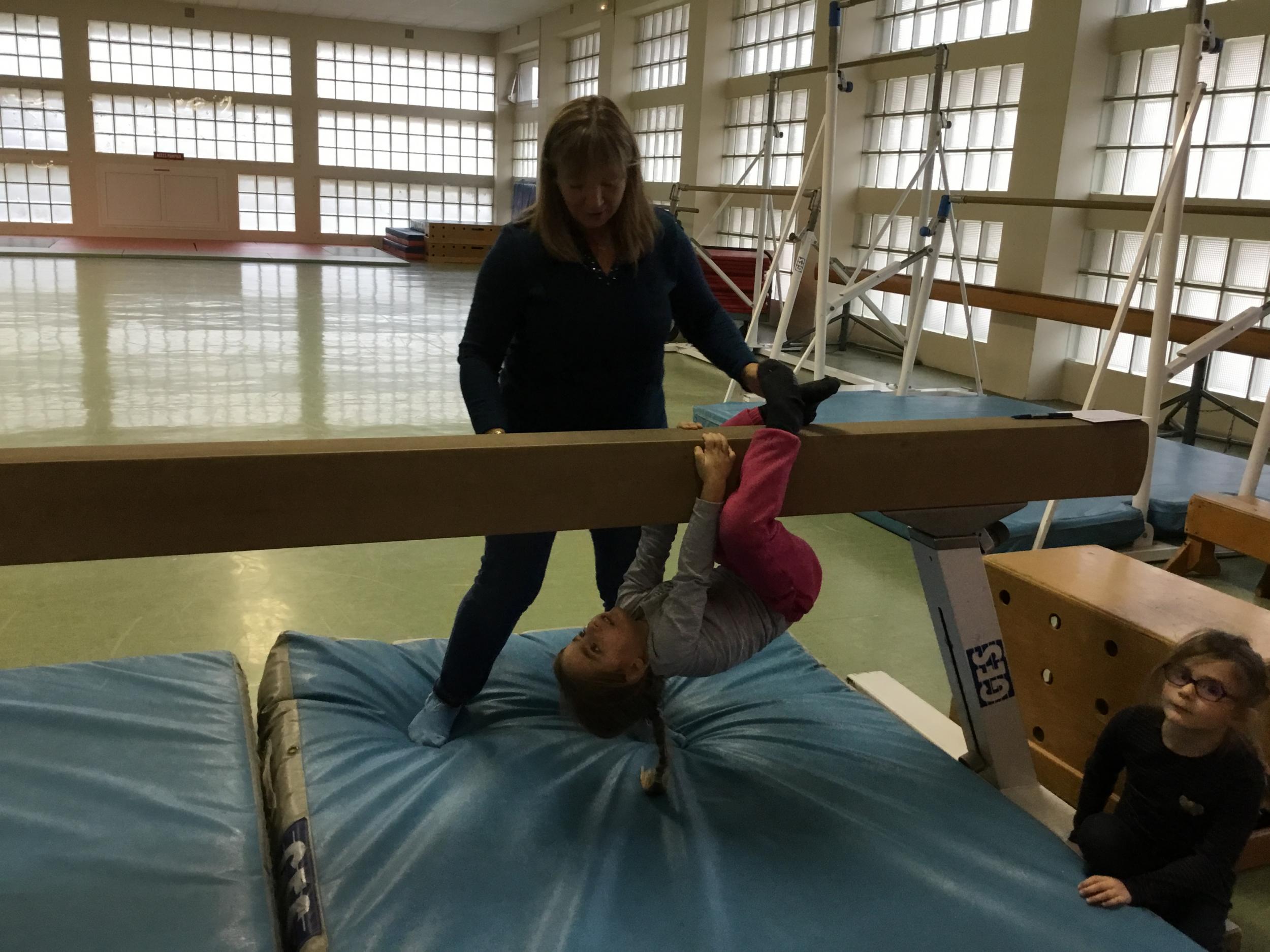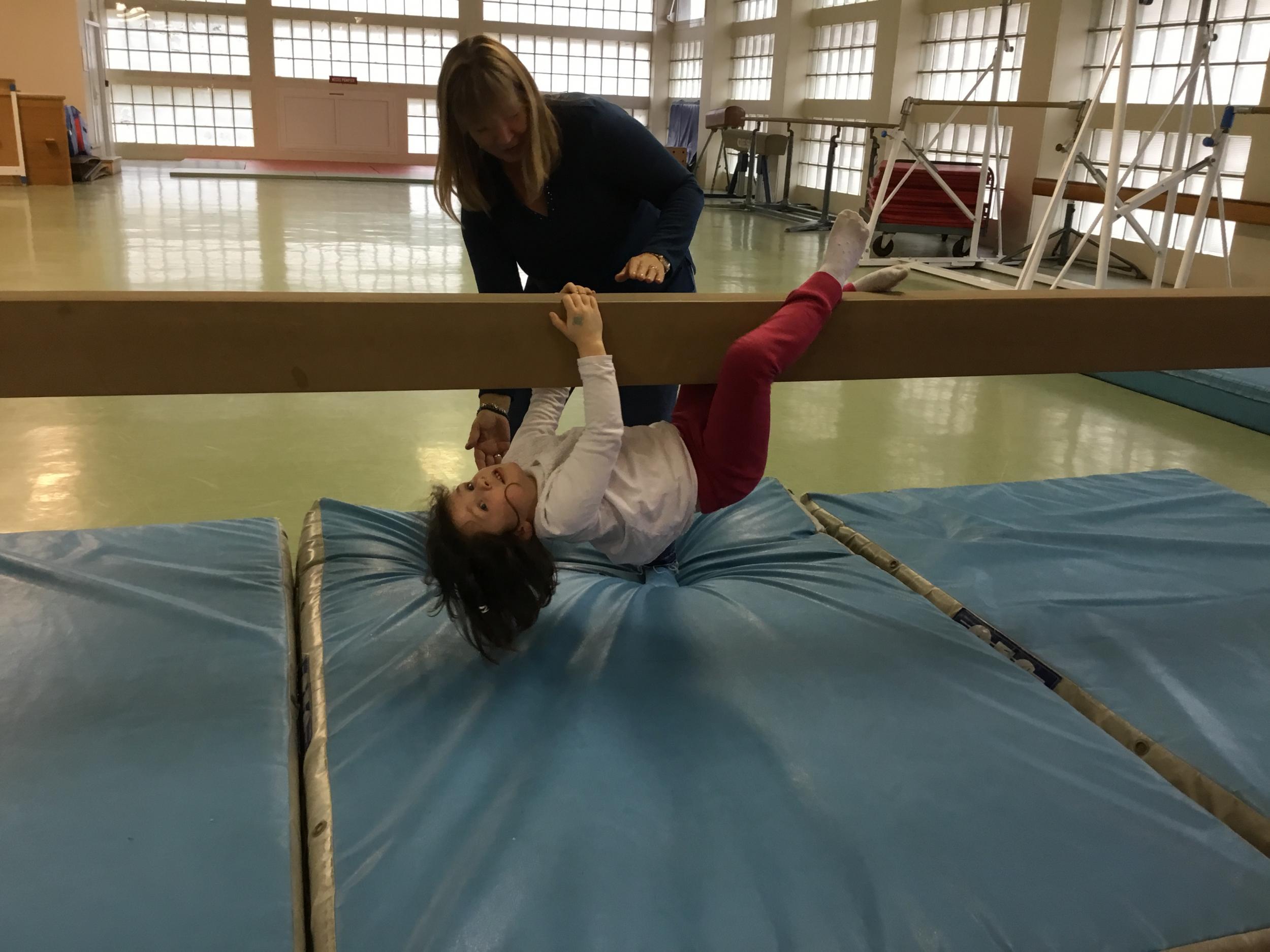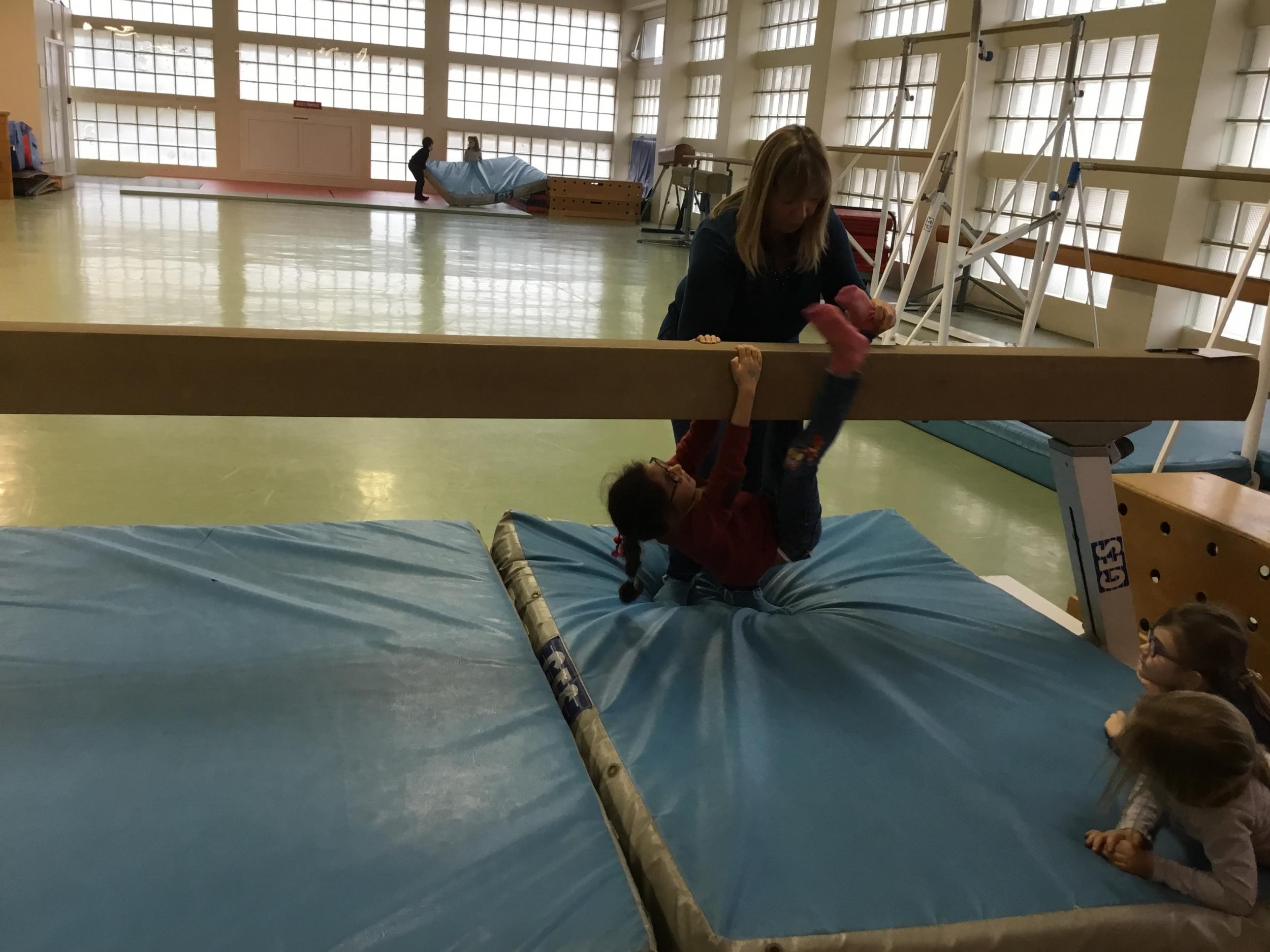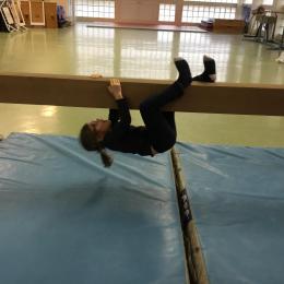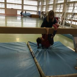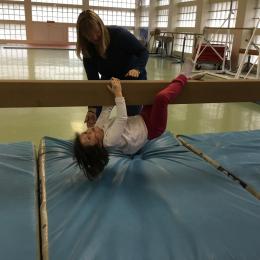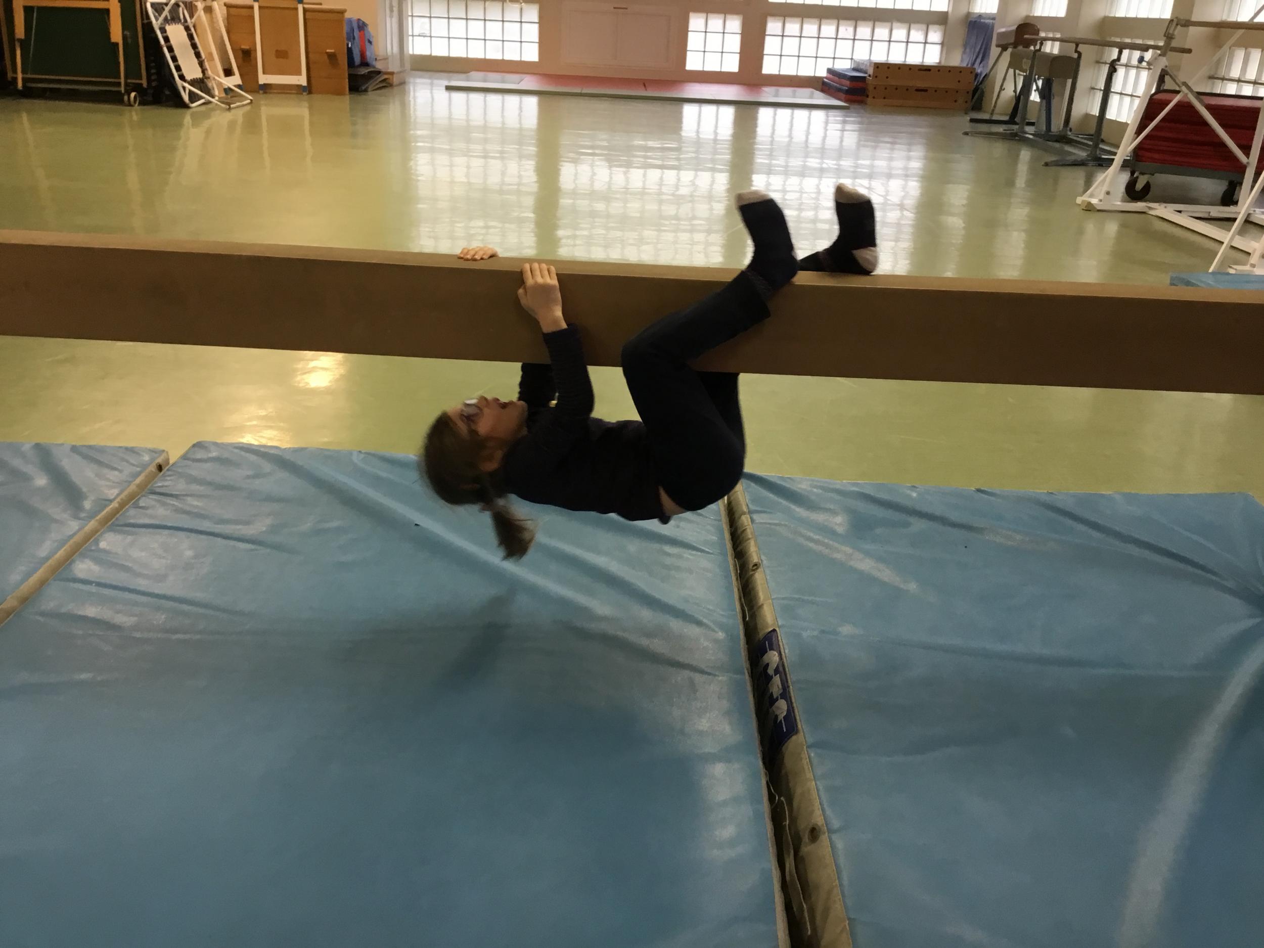 D'autres ont réalisé divers mouvements sur la grande poutre : marcher, s'accroupir, se retourner, la traverser... puis s'accrocher à l'envers et se déplacer en "cochon pendu"!