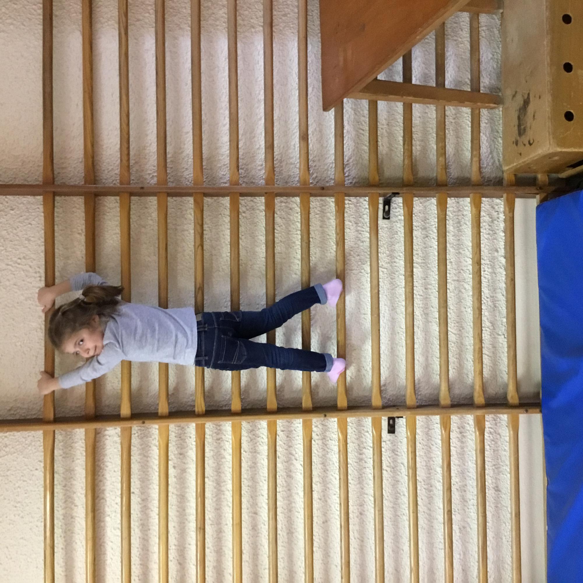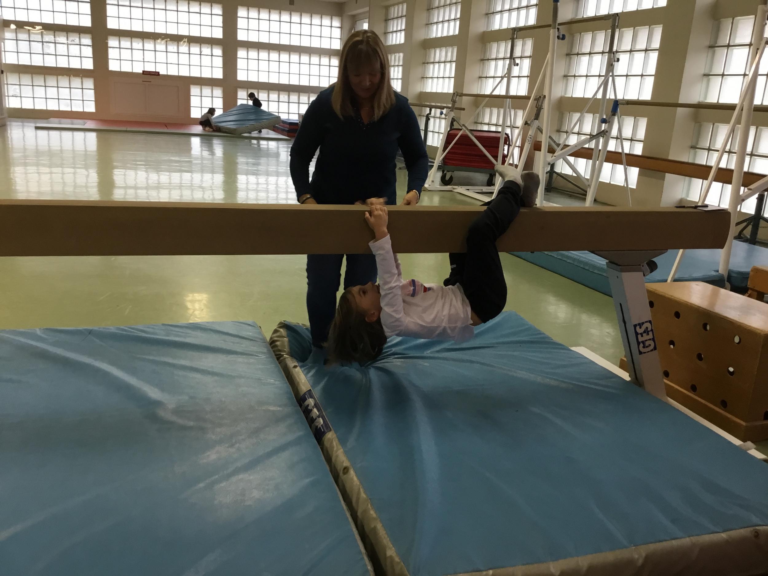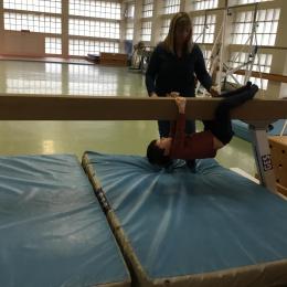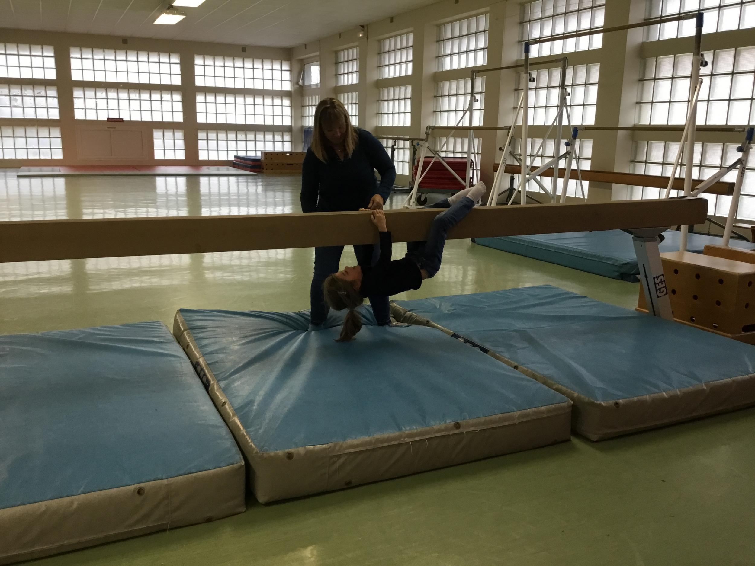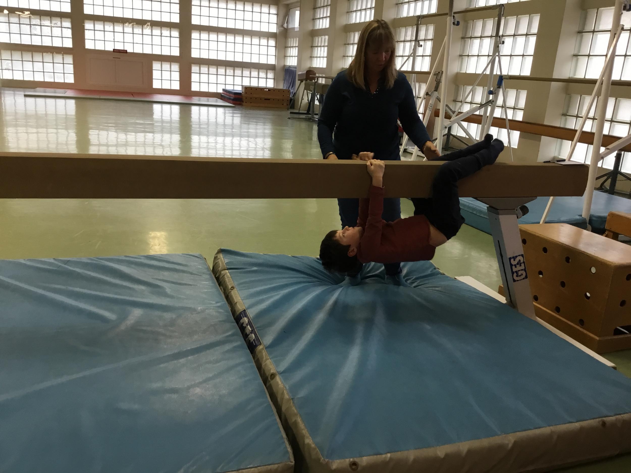D'autres ont réalisé divers mouvements sur la grande poutre : marcher, s'accroupir, se retourner, la traverser... puis s'accrocher à l'envers et se déplacer en "cochon pendu"!