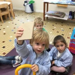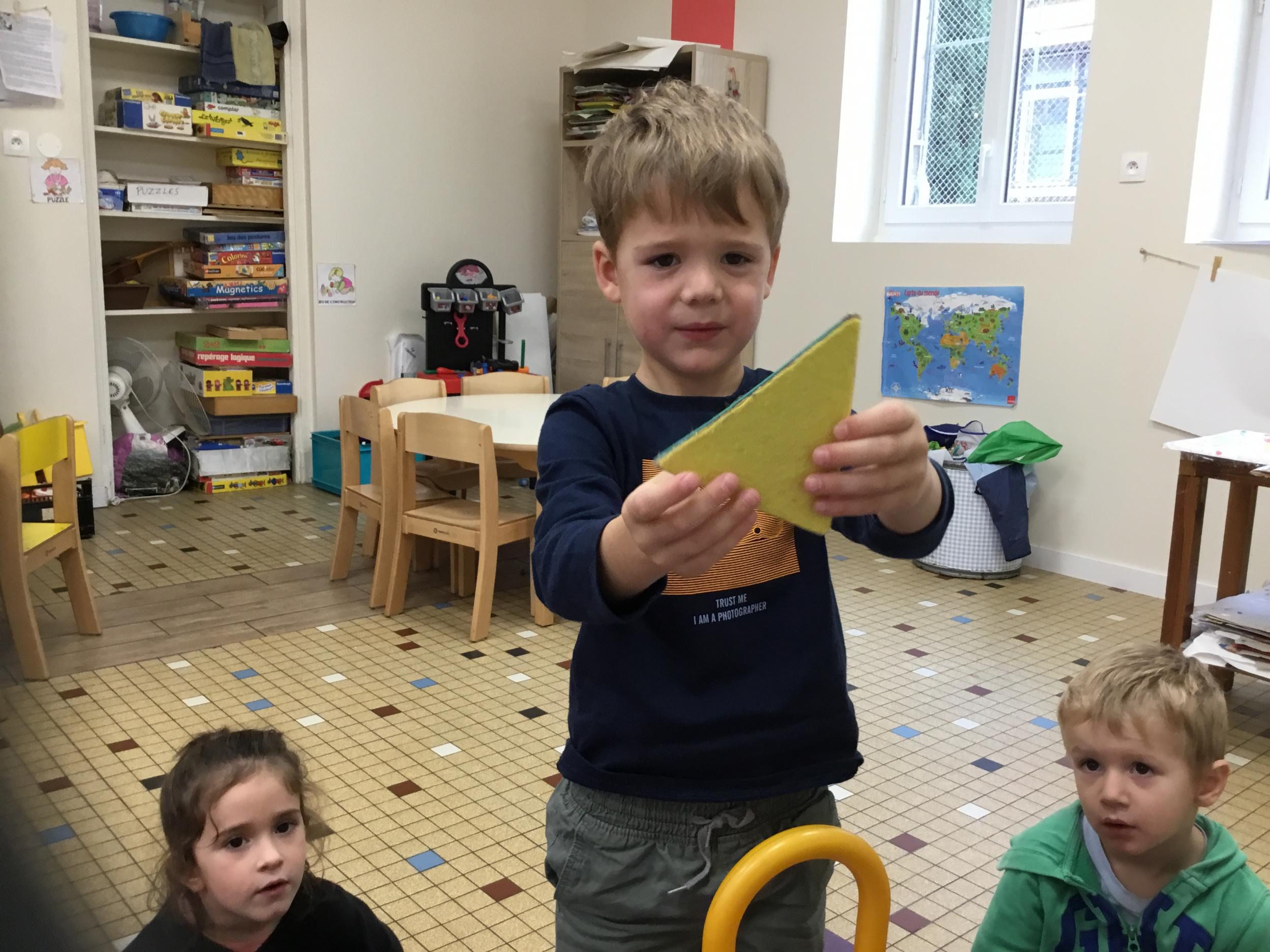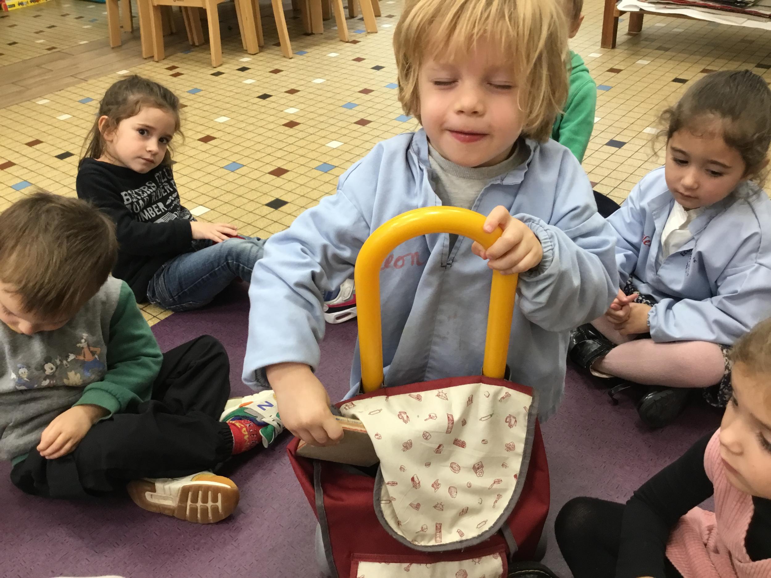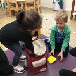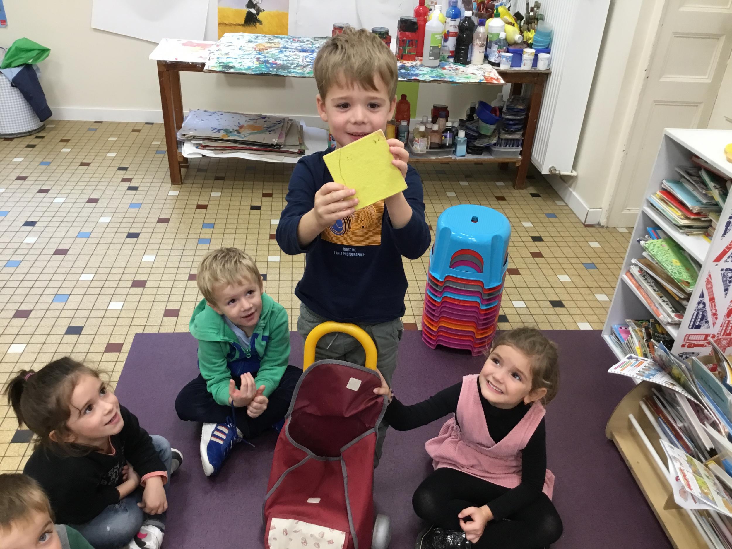 Grâce à ce jeu de devinette , les enfants doivent les yeux fermés , trouver au fond du sac et nommer une forme géométrique et dire par le toucher sa taille ( grande ou petite) sa texture ( doux ou rugueux) et son nom ( carré, triangle ou rond)