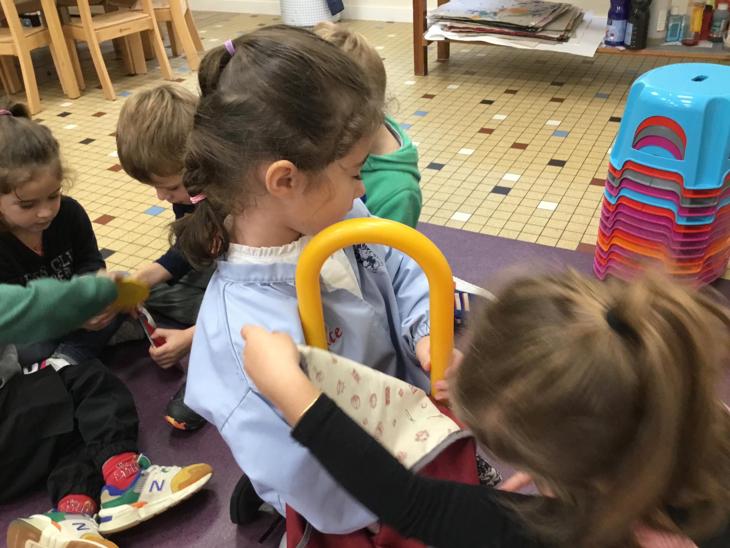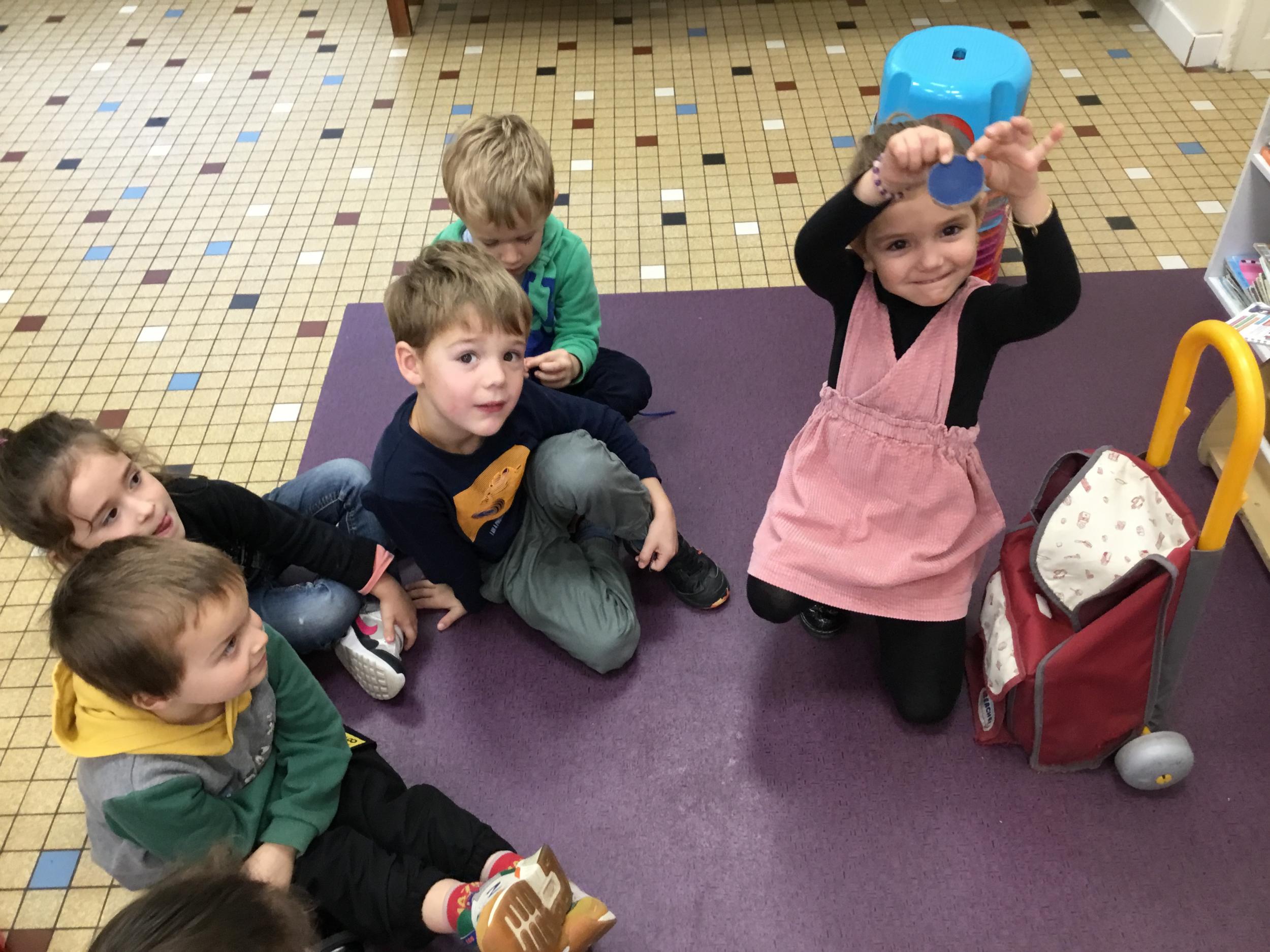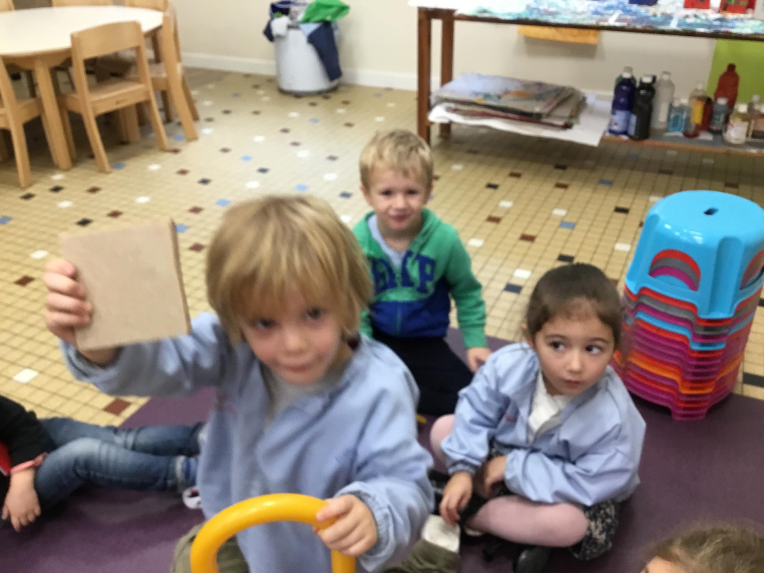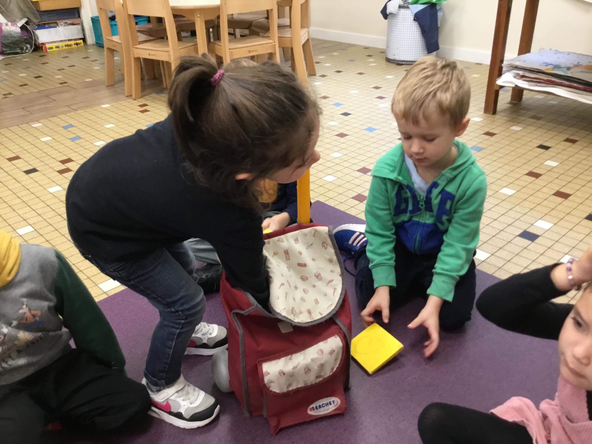 Grâce à ce jeu de devinette , les enfants doivent les yeux fermés , trouver au fond du sac et nommer une forme géométrique et dire par le toucher sa taille ( grande ou petite) sa texture ( doux ou rugueux) et son nom ( carré, triangle ou rond)