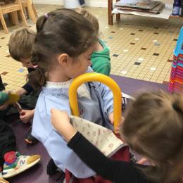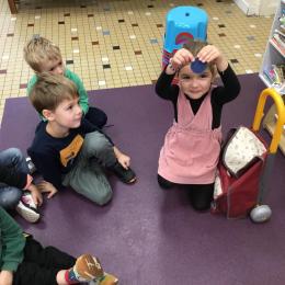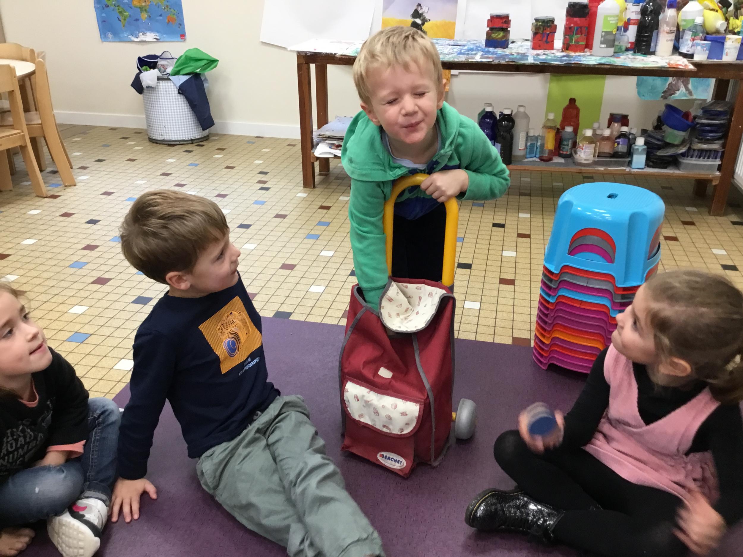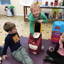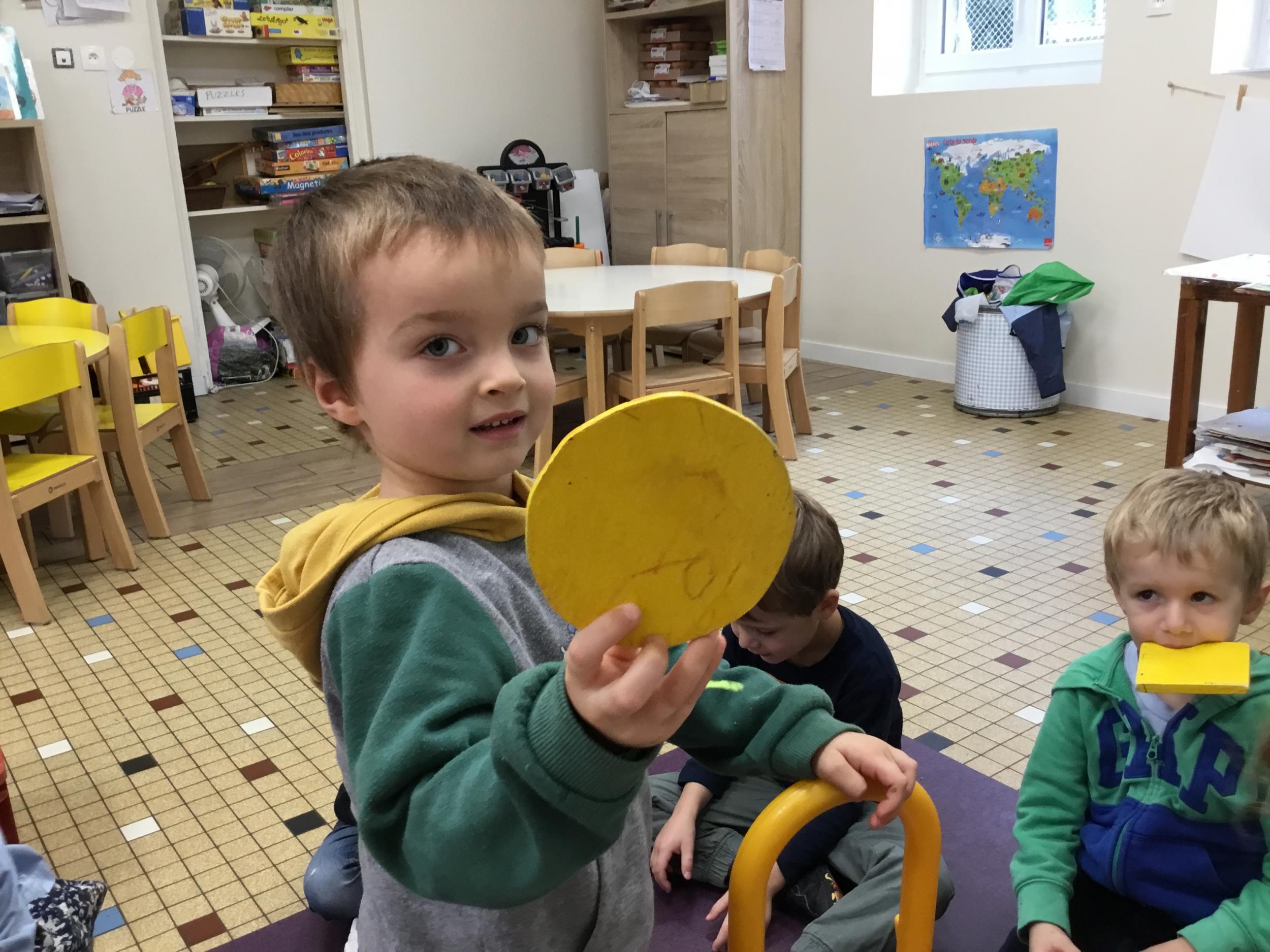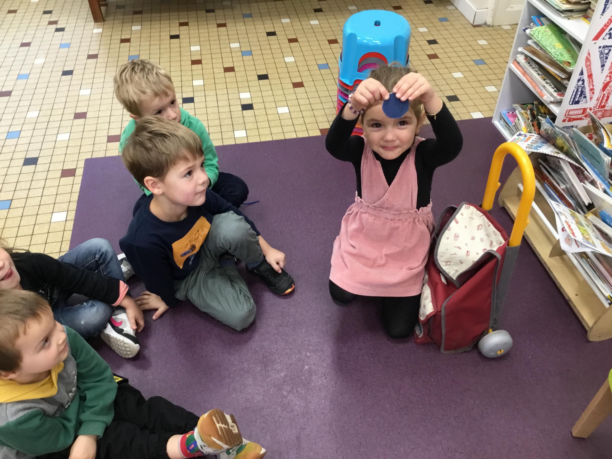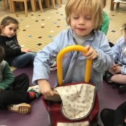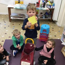 Grâce à ce jeu de devinette , les enfants doivent les yeux fermés , trouver au fond du sac et nommer une forme géométrique et dire par le toucher sa taille ( grande ou petite) sa texture ( doux ou rugueux) et son nom ( carré, triangle ou rond)