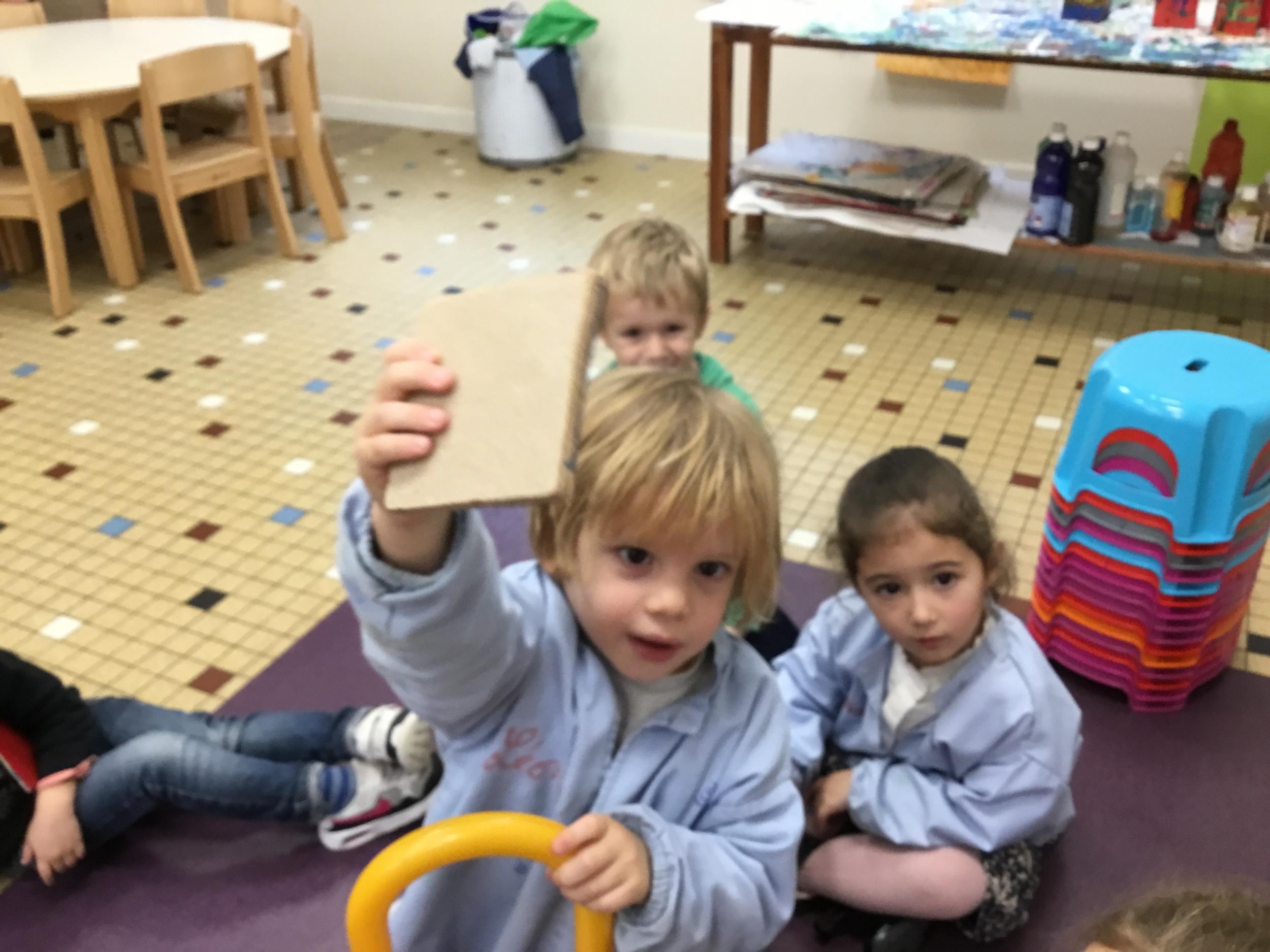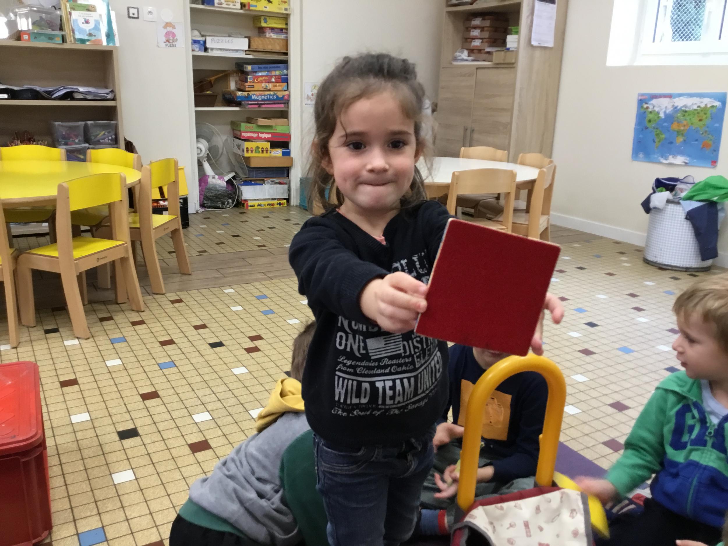 Puis ils sortent l’objet et nous vérifions en grattant en comparant et en comptant les côtés du bloc logique . En plus de l’eveil du toucher , ce jeu facilite la déduction chez l’enfant.