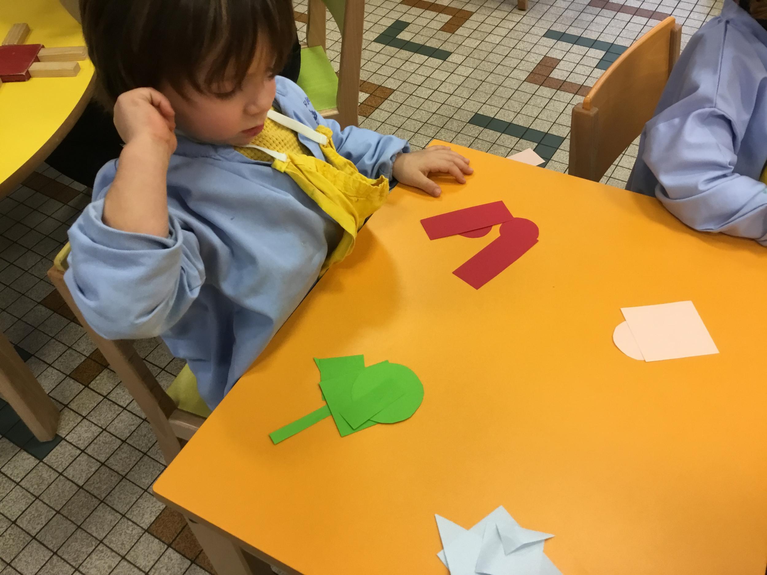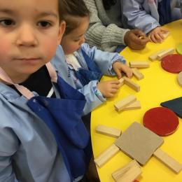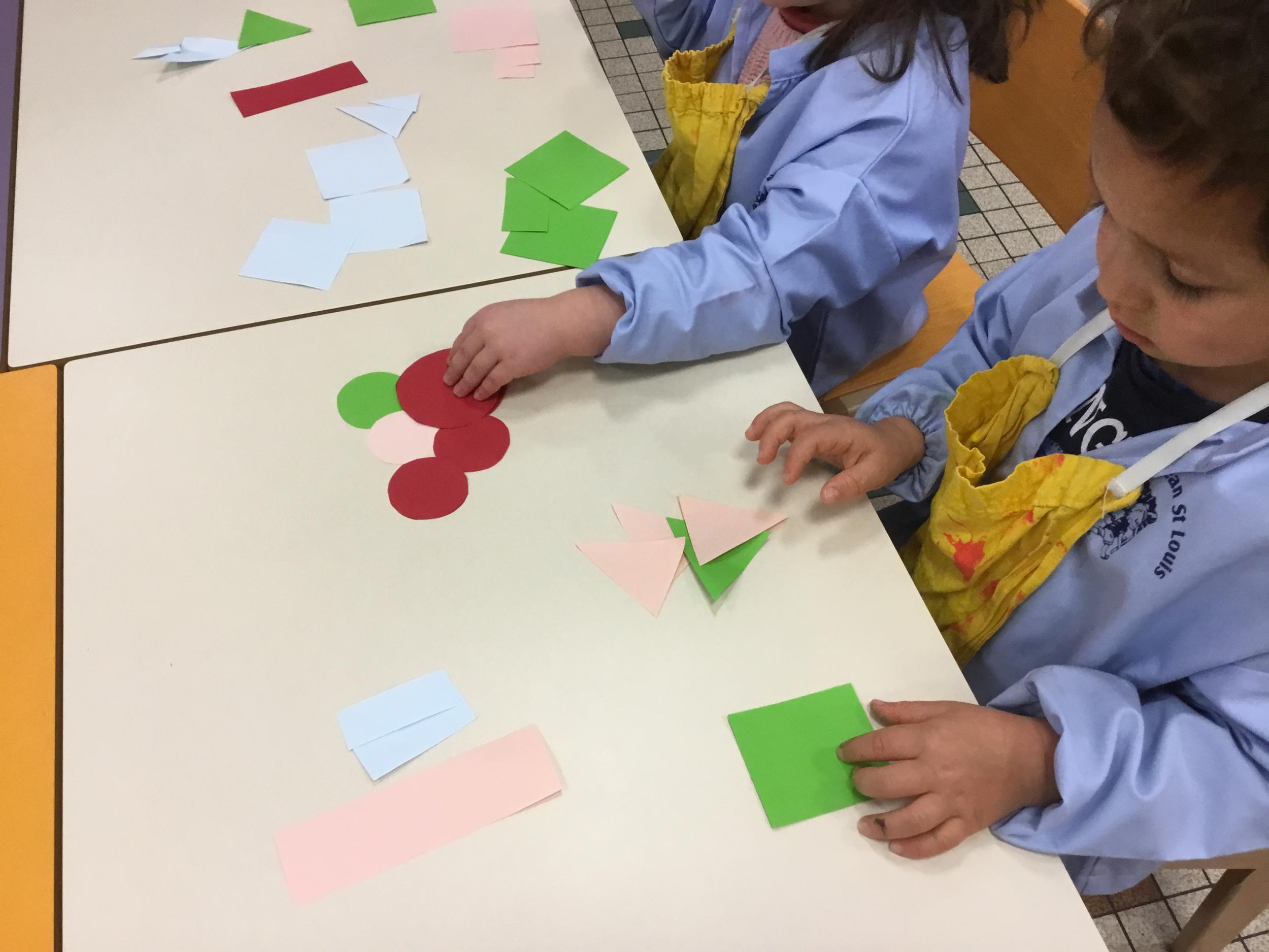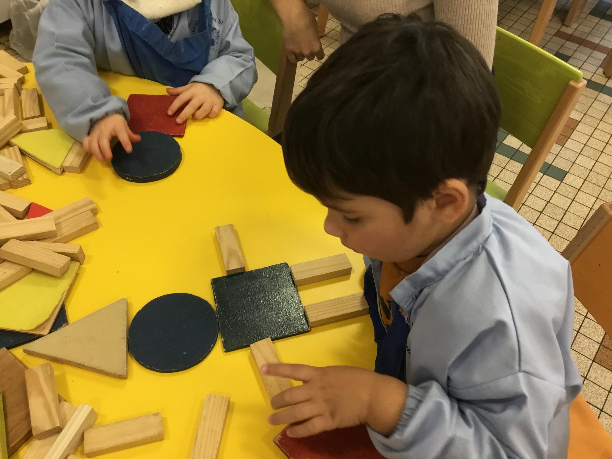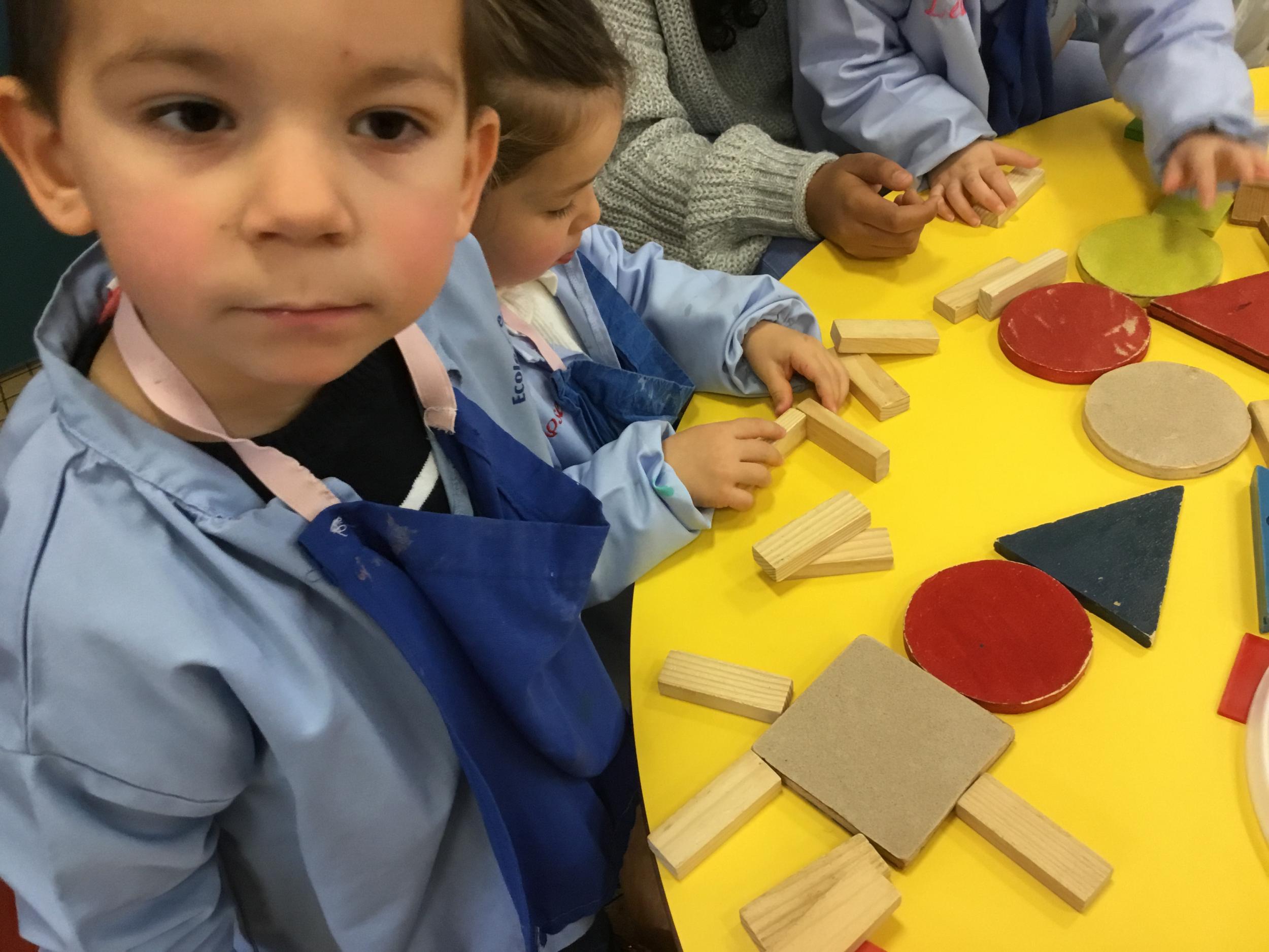 Les élèves ont manipulé des formes en bois, joué avec. Ils ont créé des bonhommes , des maisons ´ des sapins ... différents dessins.