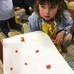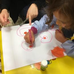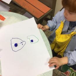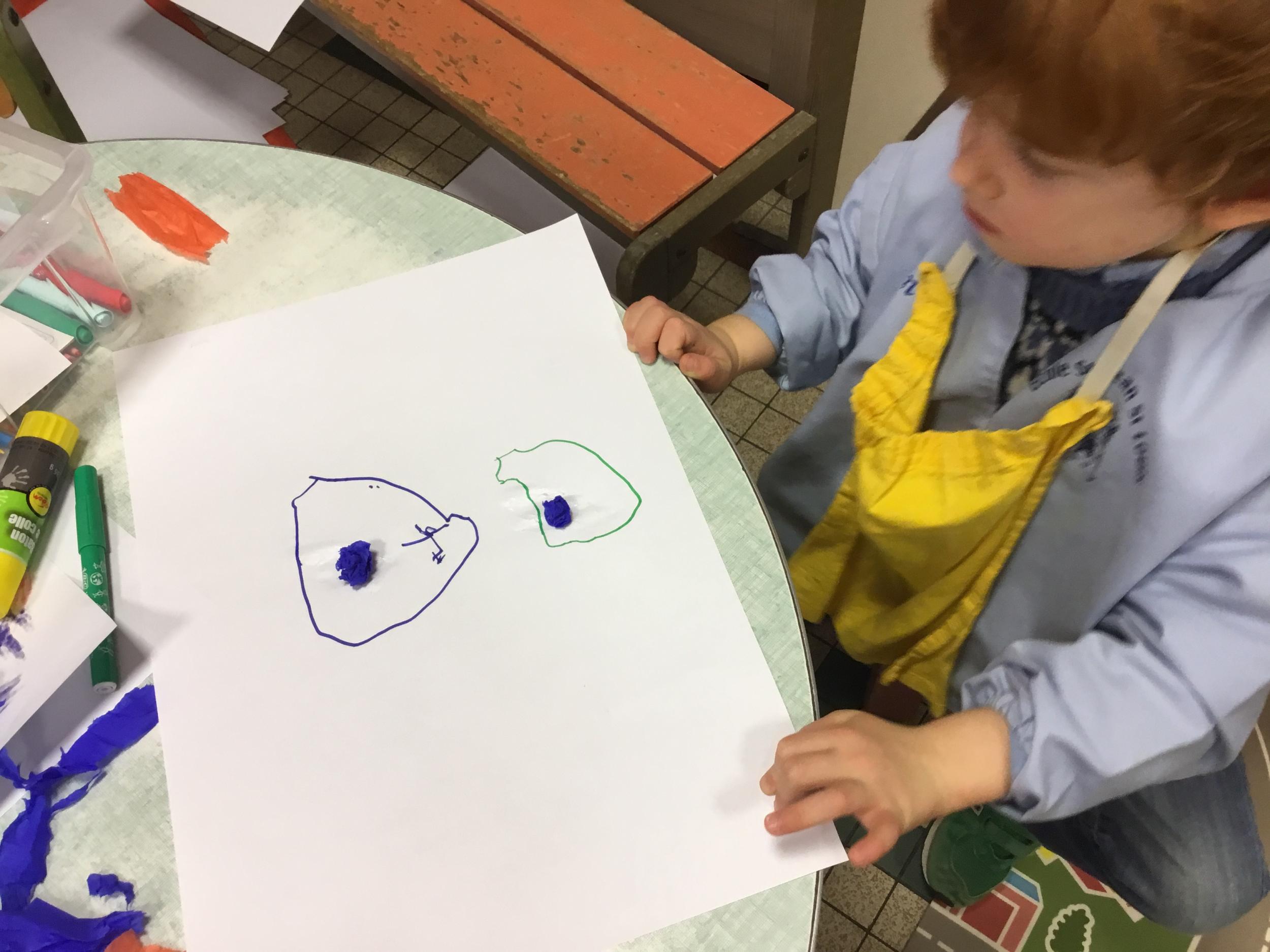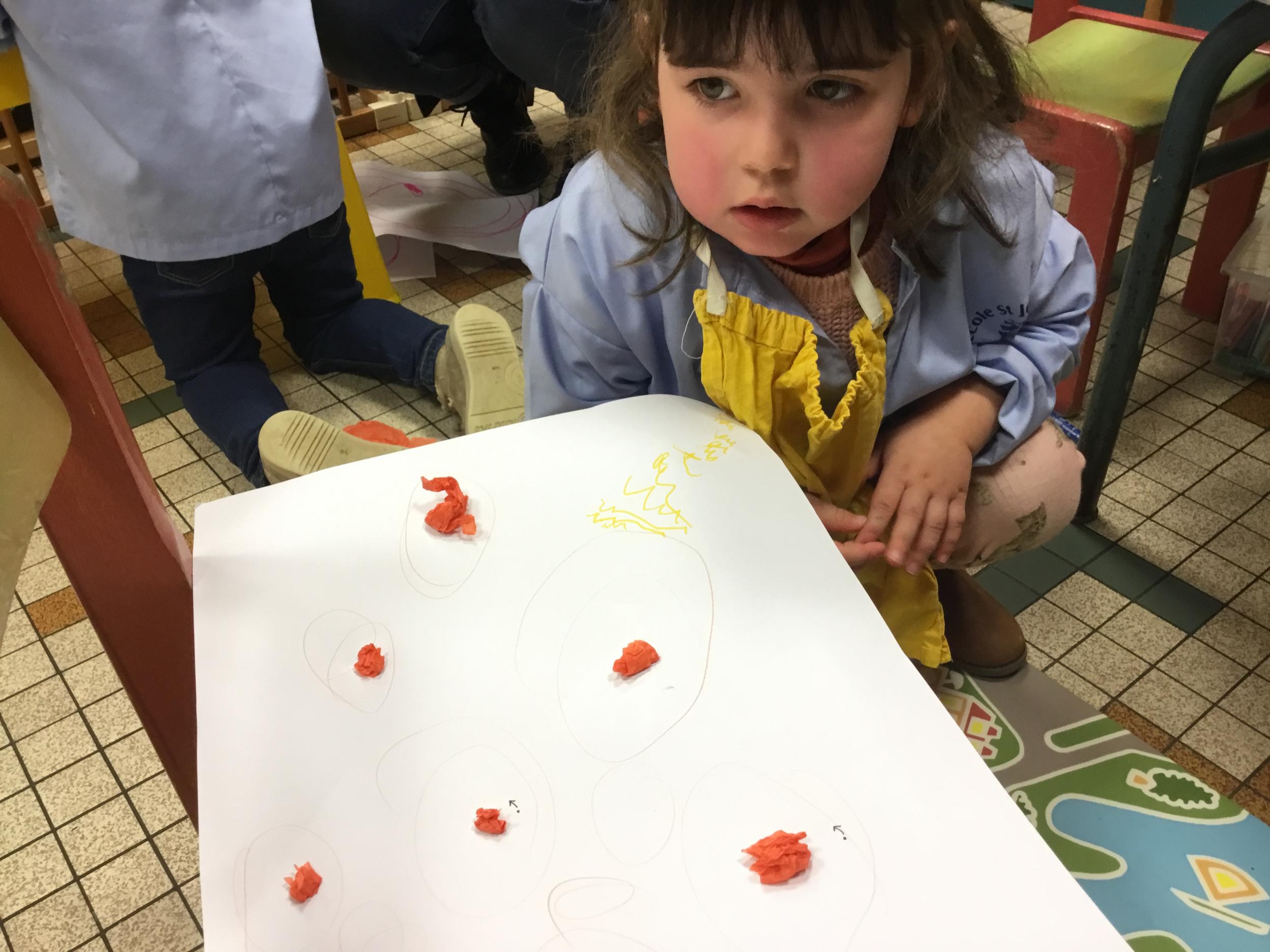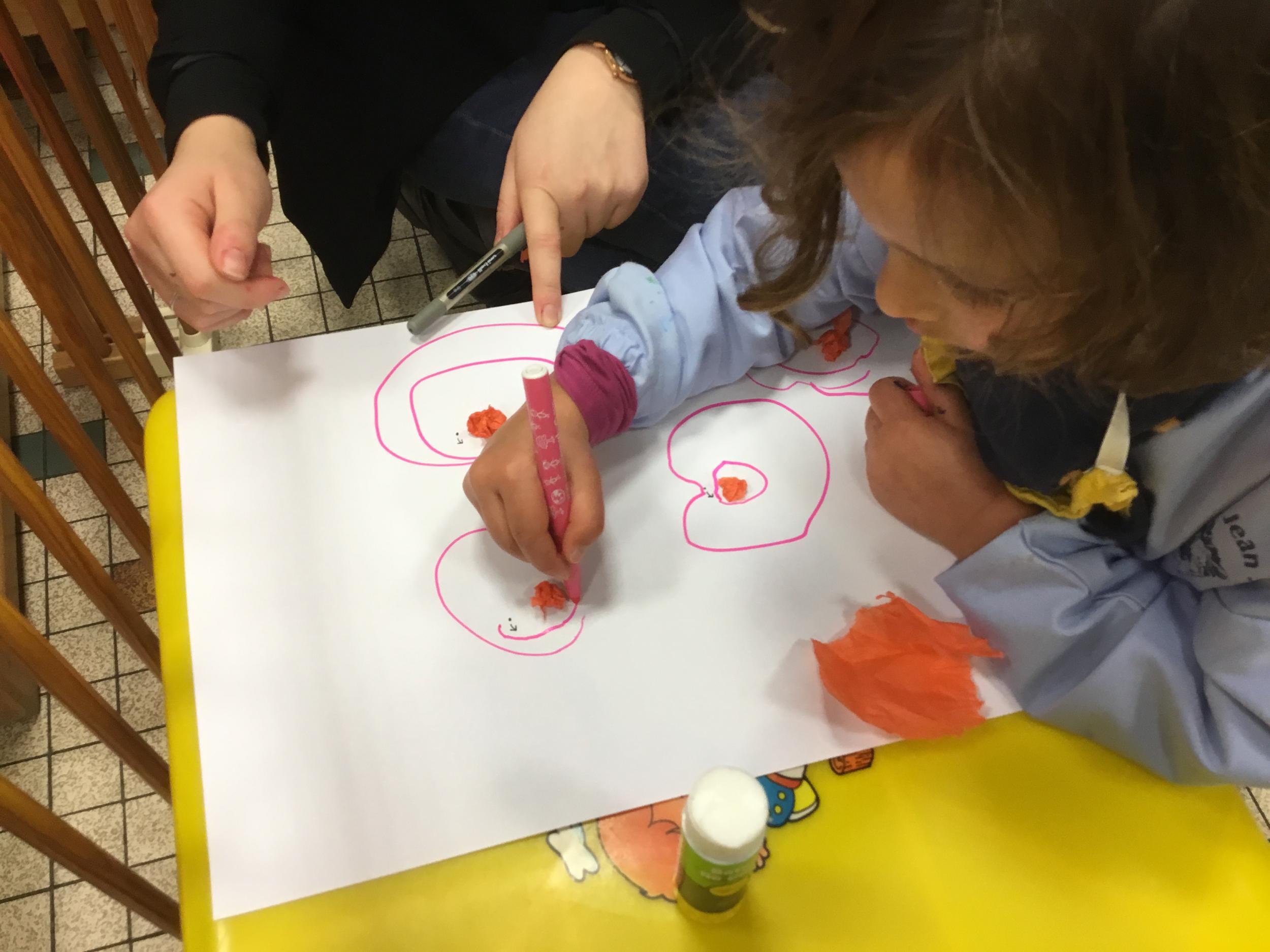 Avec Leigh ils ont fabriqué des boules en papier soie qu’ils ont collées sur une feuille , puis avec un feutre ils ont tracé des ronds autour de chaque boule. Leigh a donné les consignes en anglais et a bien surveillé que les enfants tracent les ronds en respectant le sens de l’écriture.