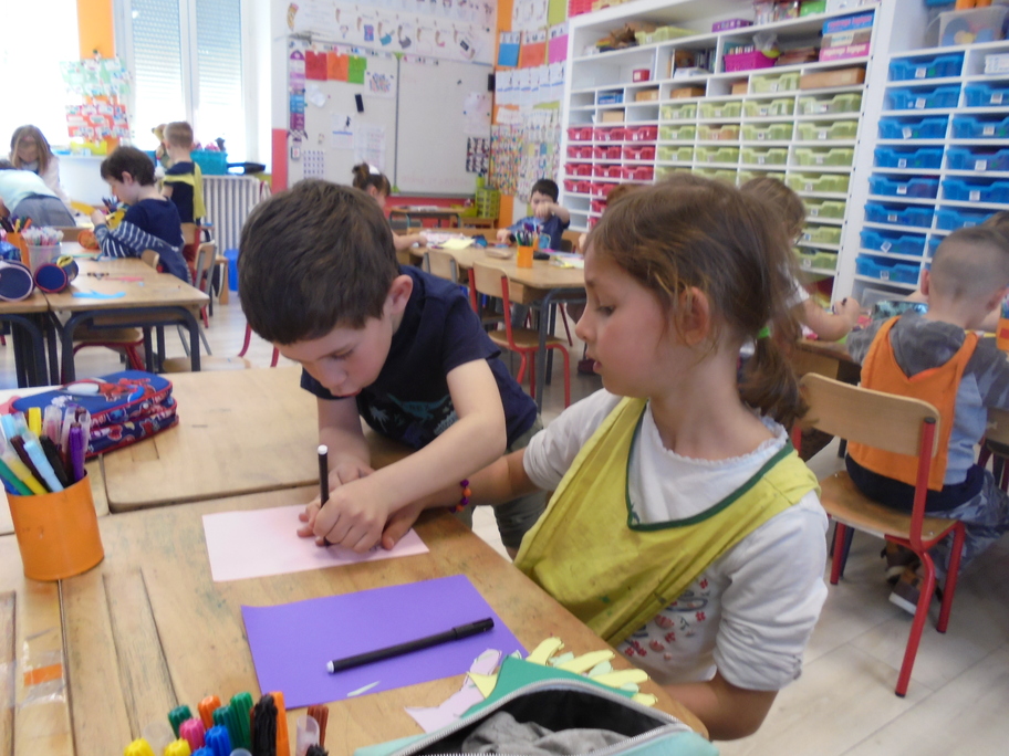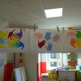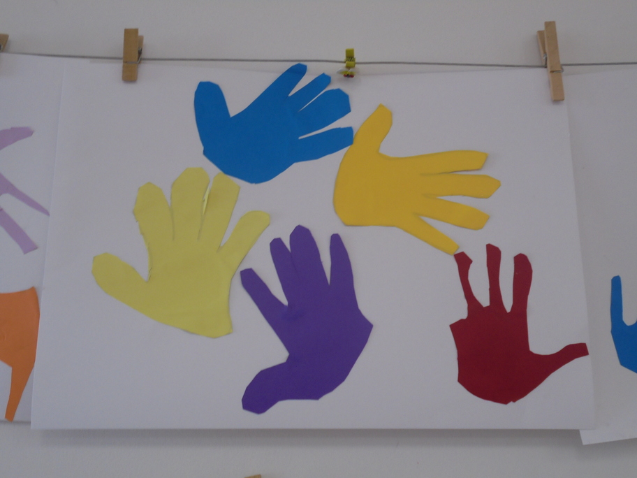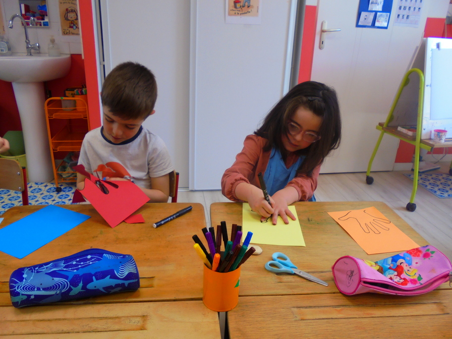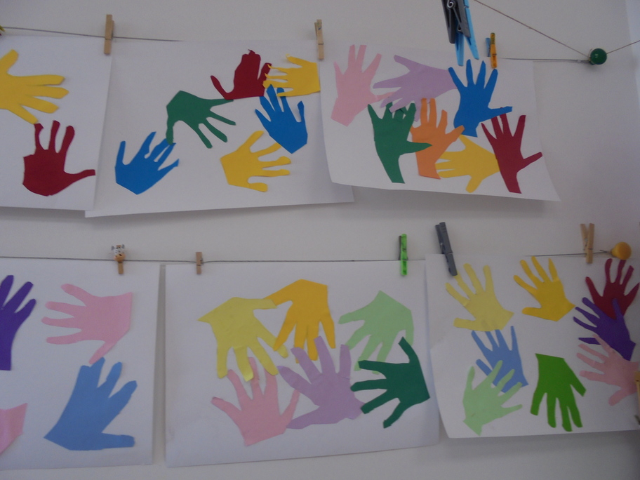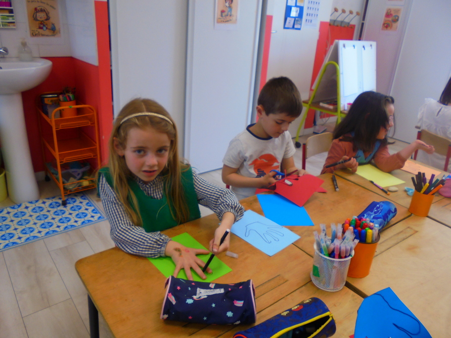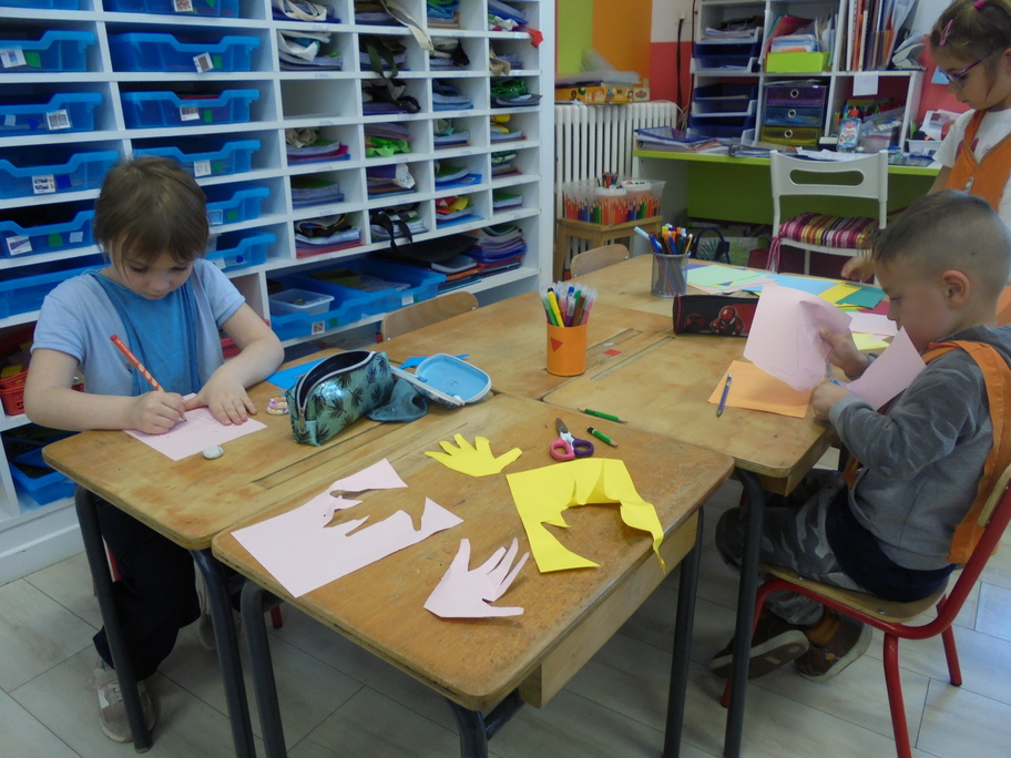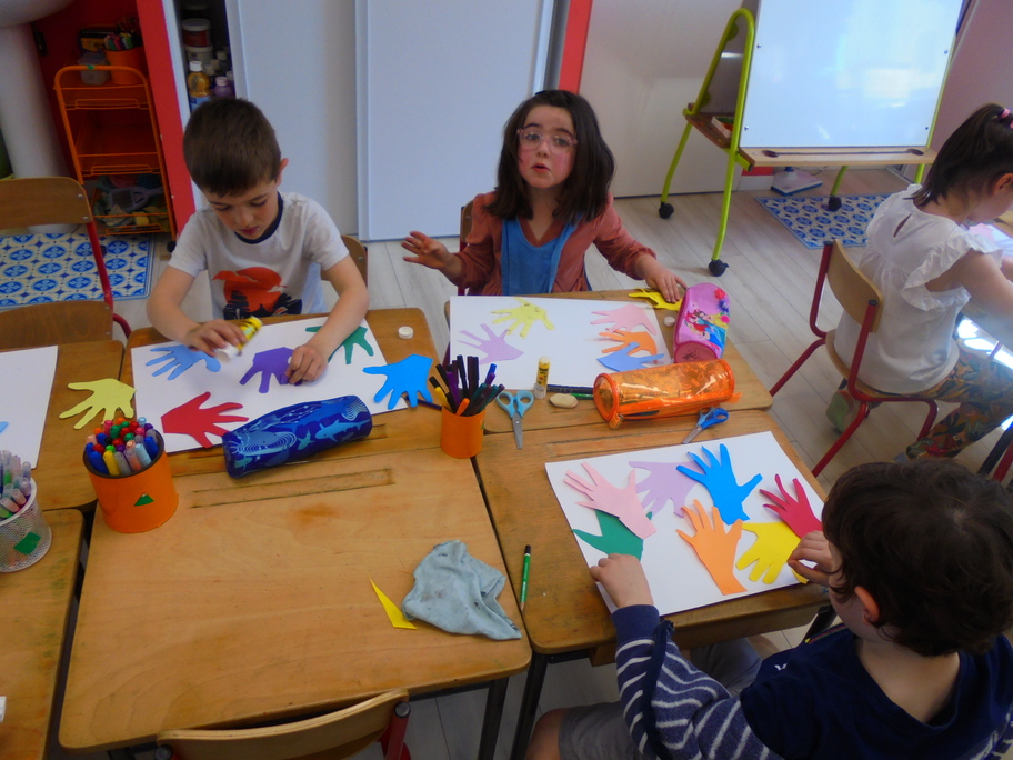 Après avoir observé et décrit un tableau de Matisse, les élèves se sont essayé à la technique du découpage. Ils ont utilisé leurs mains comme modèle pour en découper plusieurs dans divers papiers colorés. Puis ils les ont organisées entre elles pour créer leur tableau. Le résultat final est bien coloré!