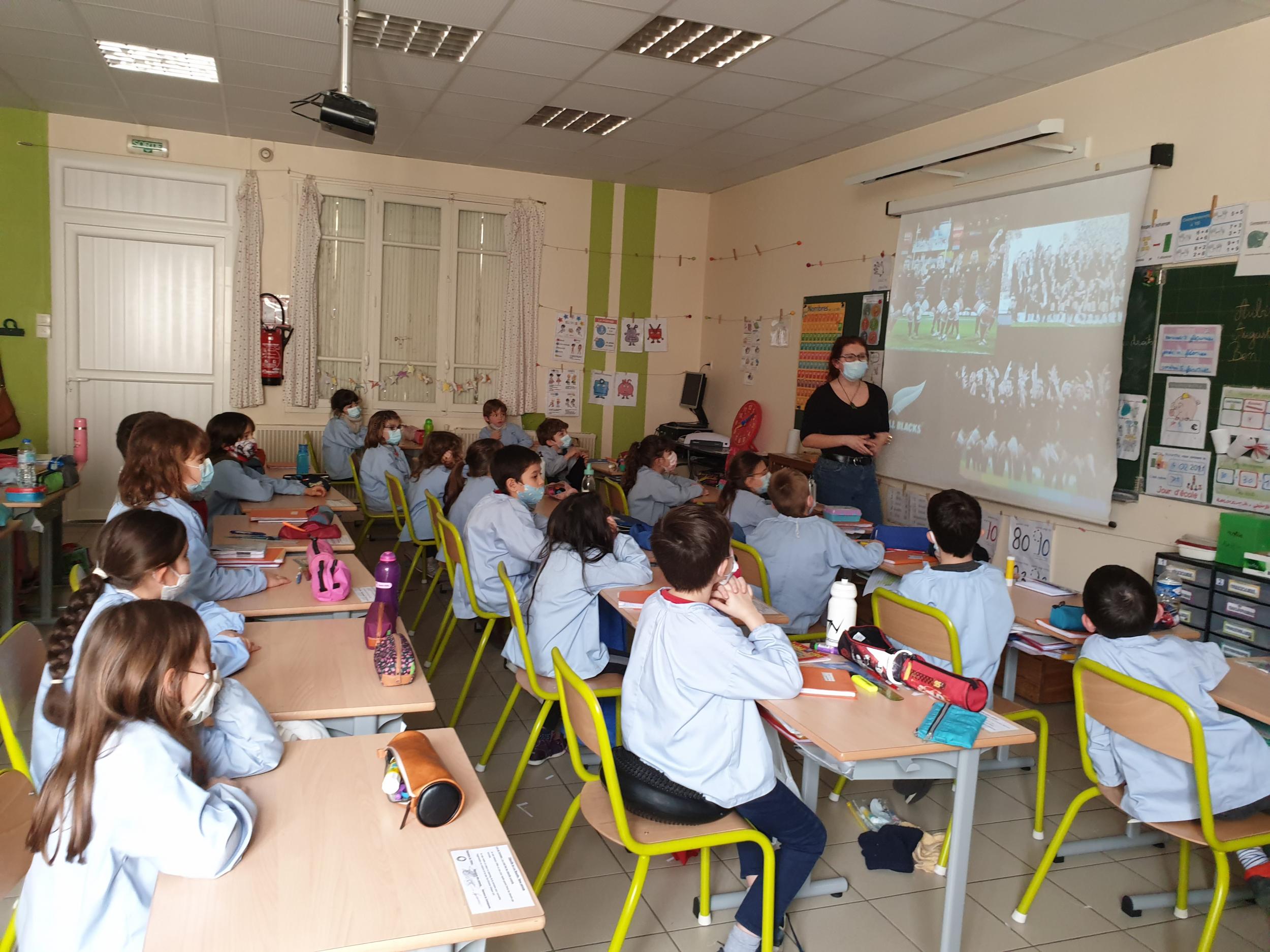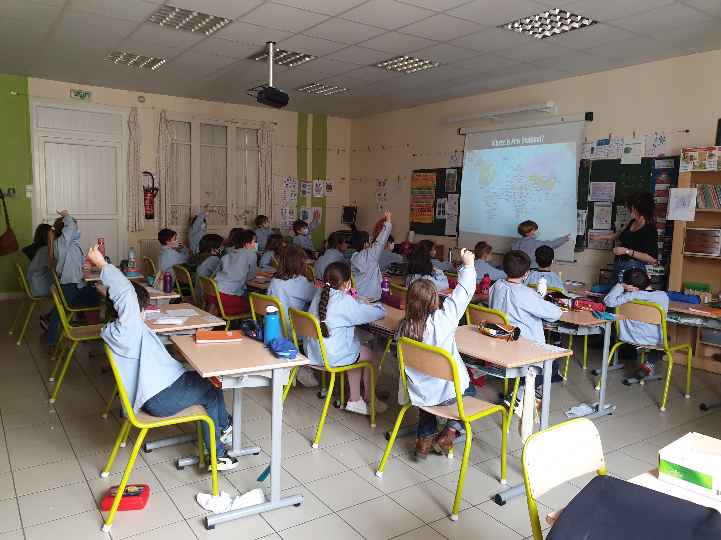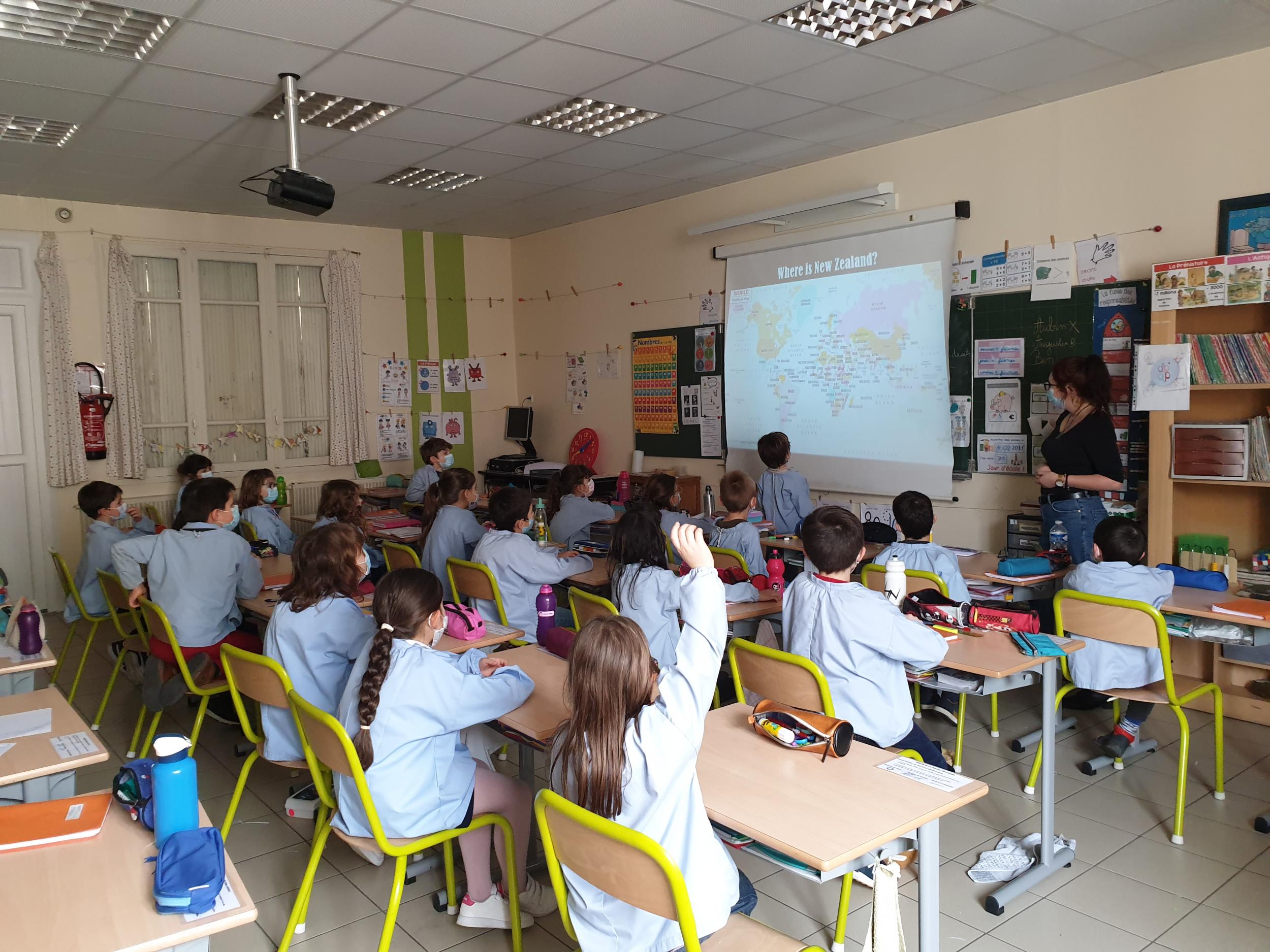 À l'occasion de la fête nationale en Nouvelle Zélande, le "Waitangi day", Leigh, qui enseigne l'anglais aux élèves, est venue dans la classe de CE1 nous faire découvrir son pays d'origine. Nous avons tout d'abord dû situer ce pays sur un planisphère puis Leigh nous a montré des animaux étranges comme le Kiwi, des monuments époustouflants comme la "sky tower" et un peuple merveilleux, les Maoris. Elle nous a aussi montré l'équipe nationale néo-zélandaise de rugby, les All Blacks, chantant le Haka, que les férus de rugby ont tout de suite reconnu !