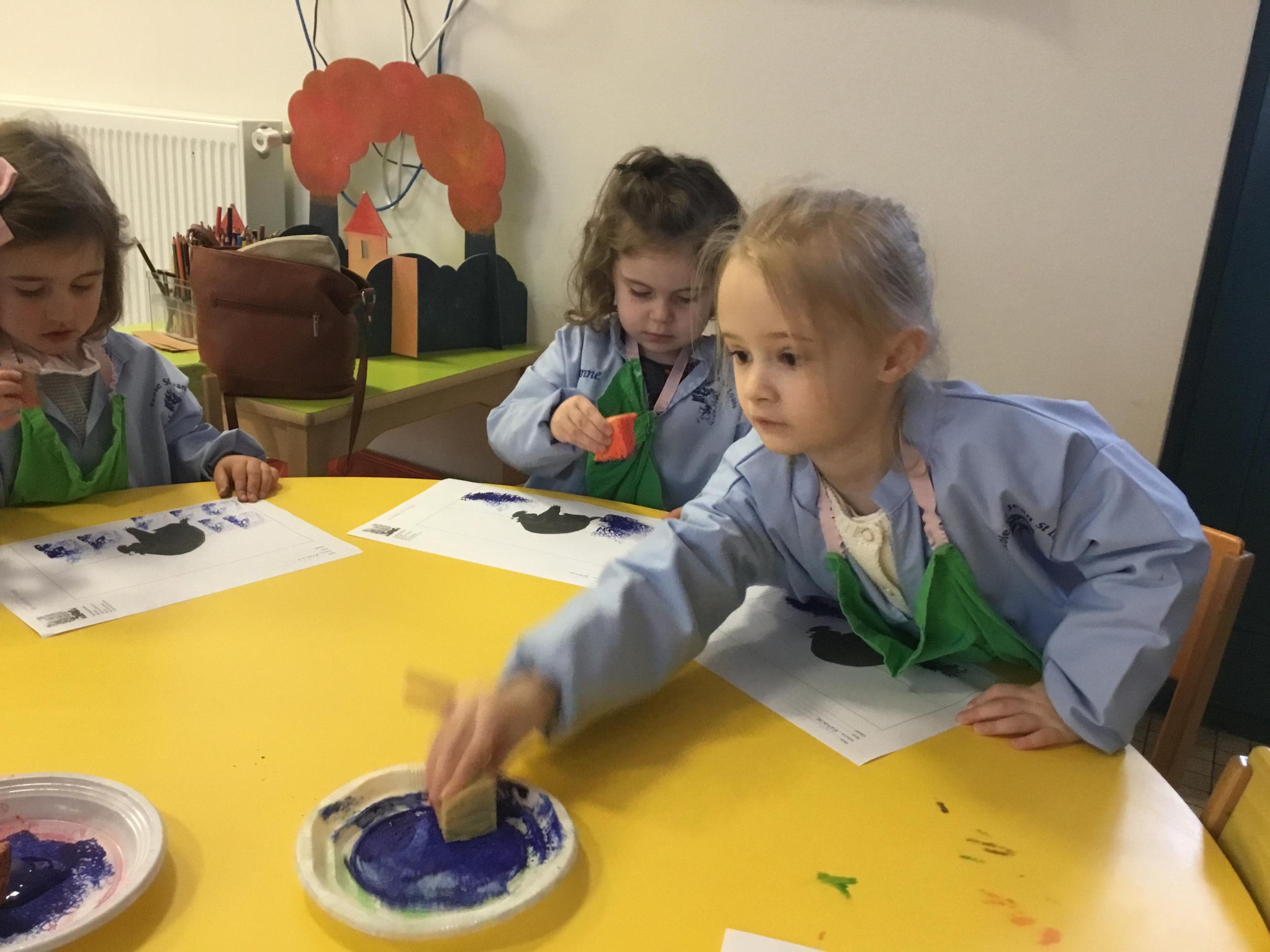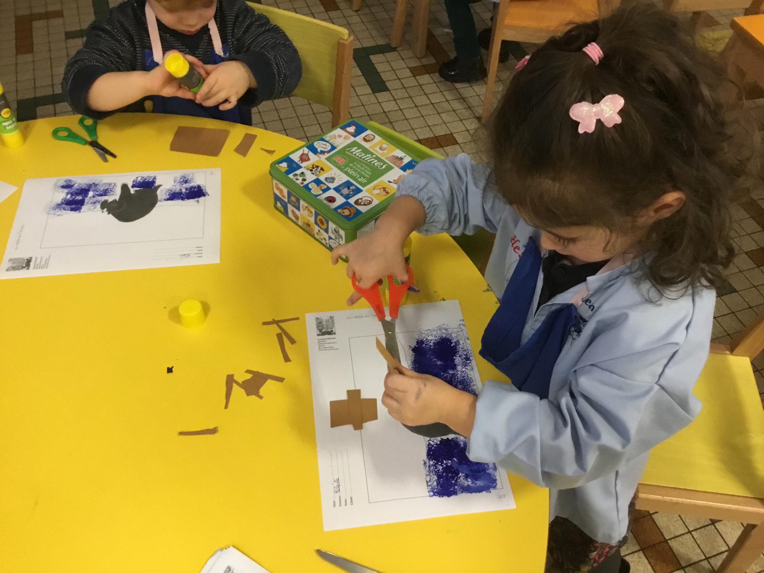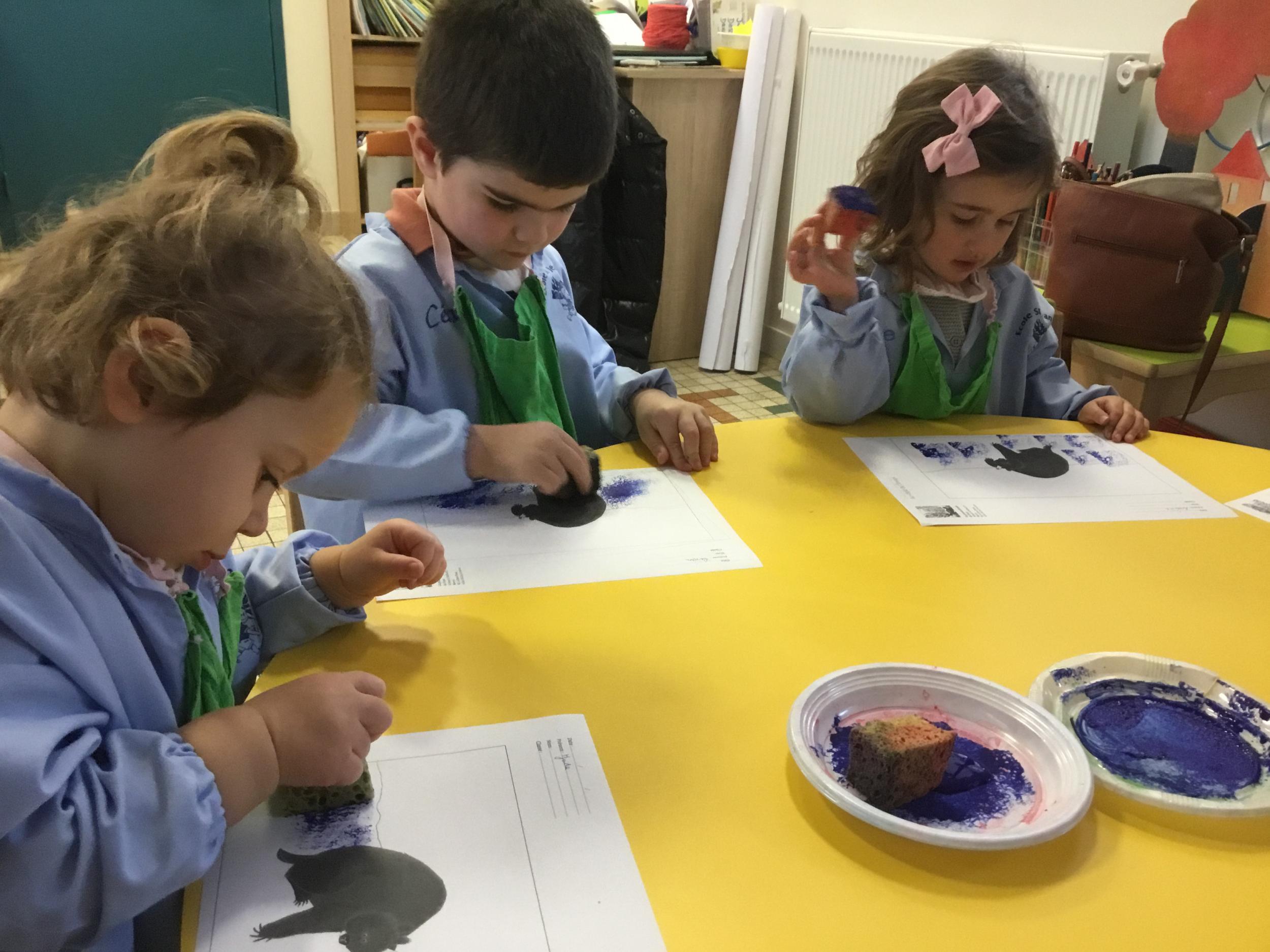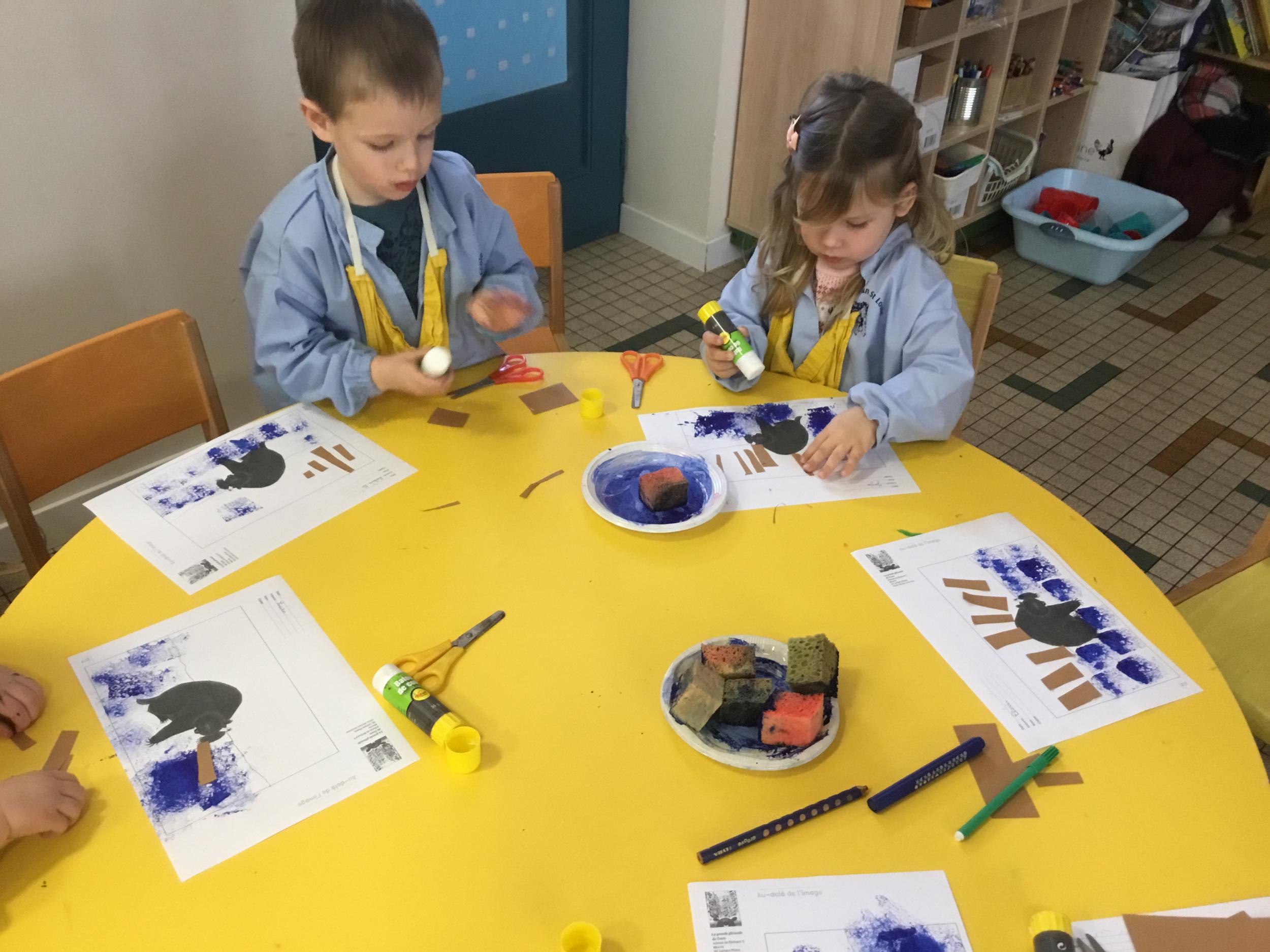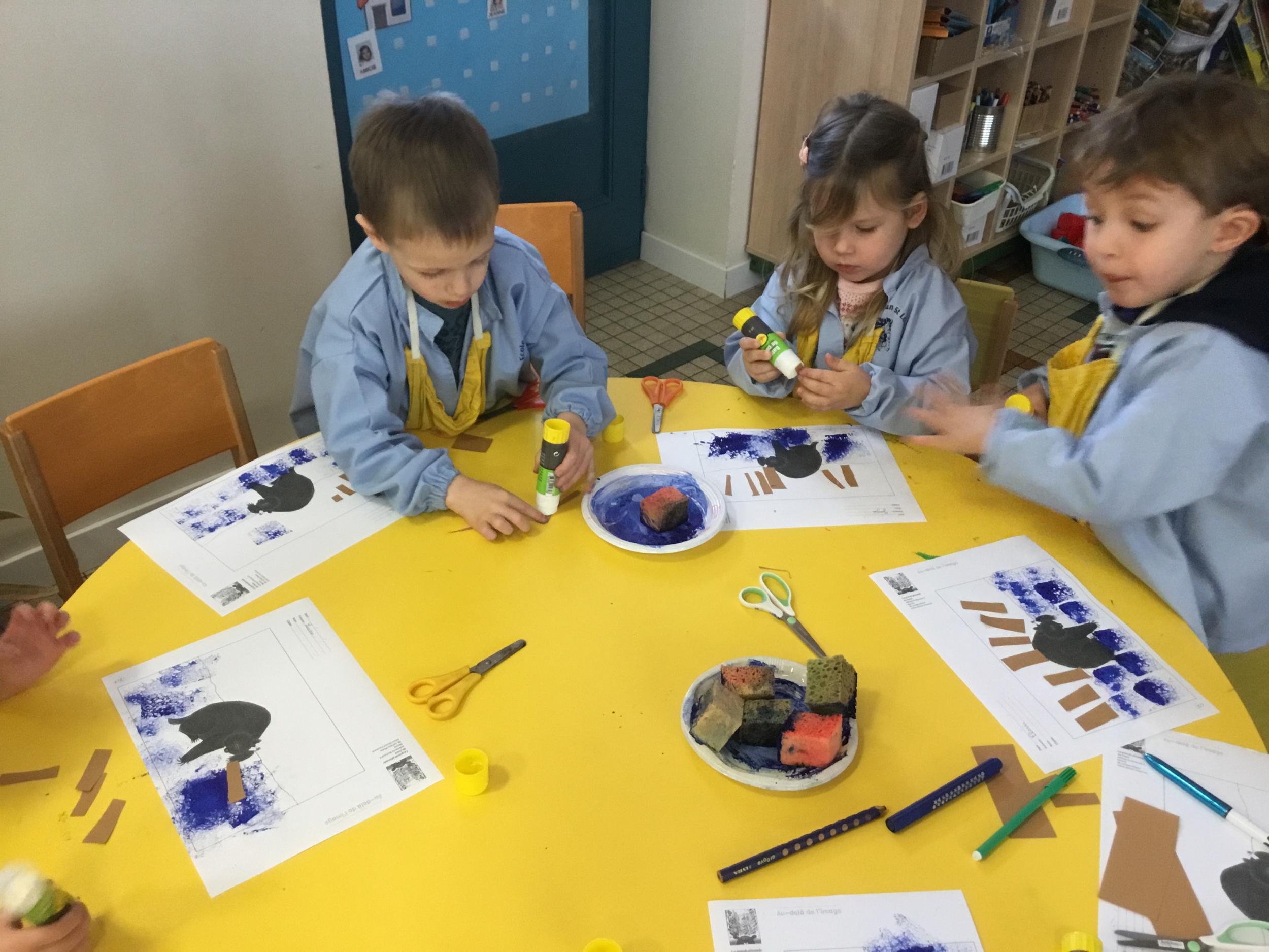 Cette semaine nous avons continué à travailler sur l’album « La grande glissade », le deuxième album du concours Les « Incos ». En groupe de langage, les élèves ont raconté ce qu’ils ont retenu de l’histoire et ont répondu à un quizz. Puis ils ont illustré un passage de l’histoire en utilisant des éponges pour représenter l’eau de la rivière et découpé des bandes de papier pour représenter les sapins au bord de la rivière. Ce travail plastique s’achèvera par un travail de graphisme pour représenter les branches des sapins.