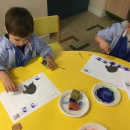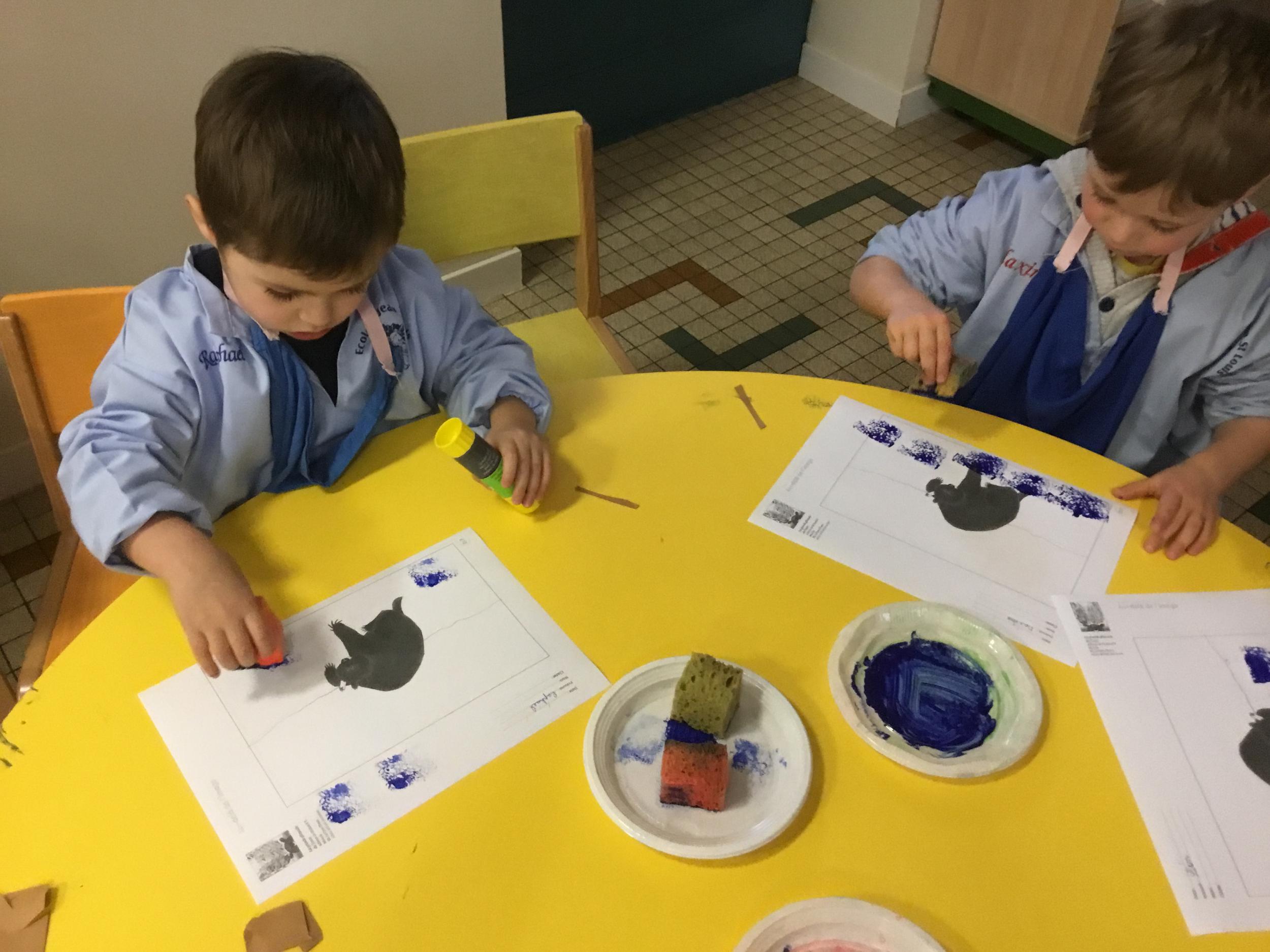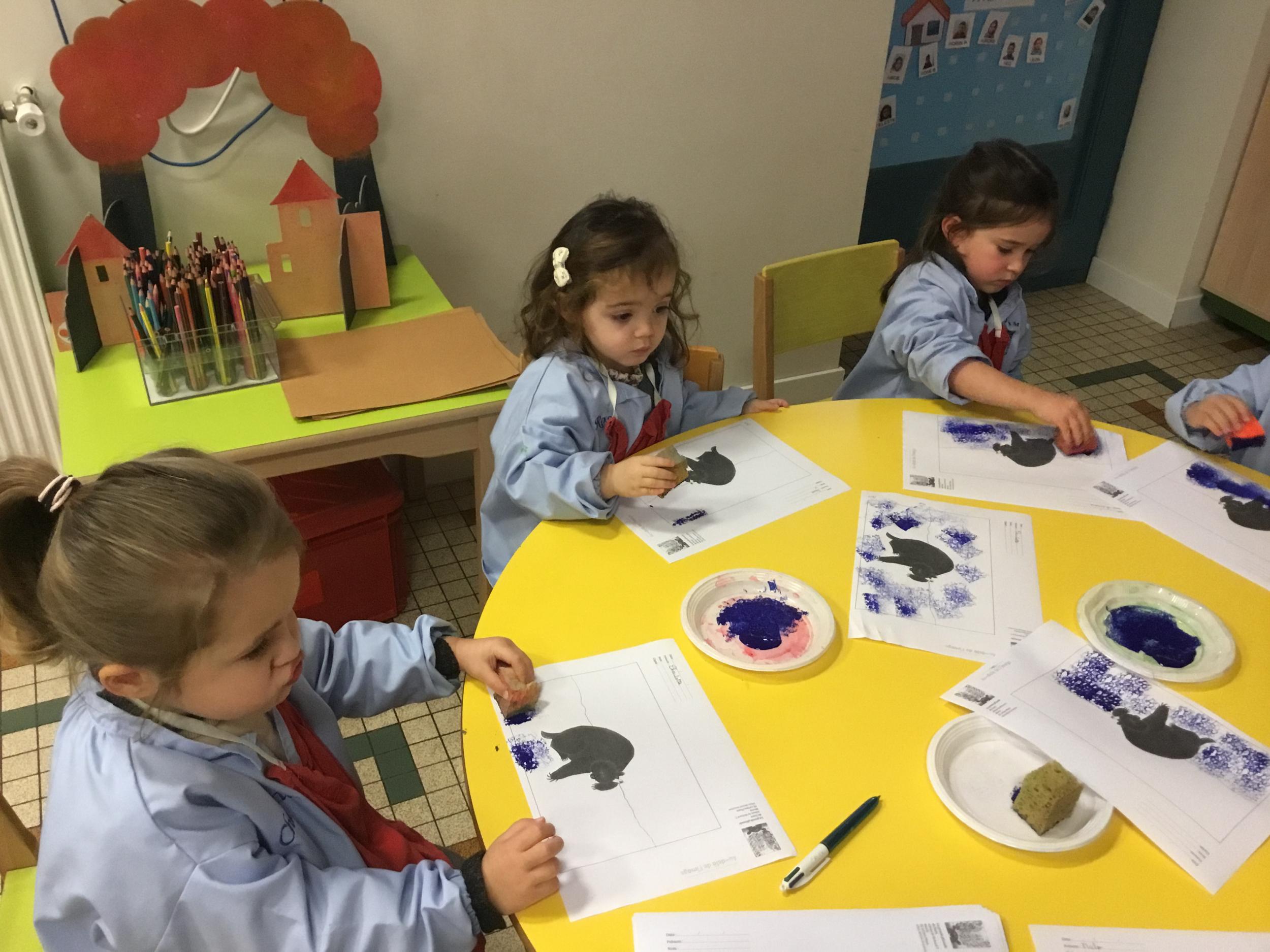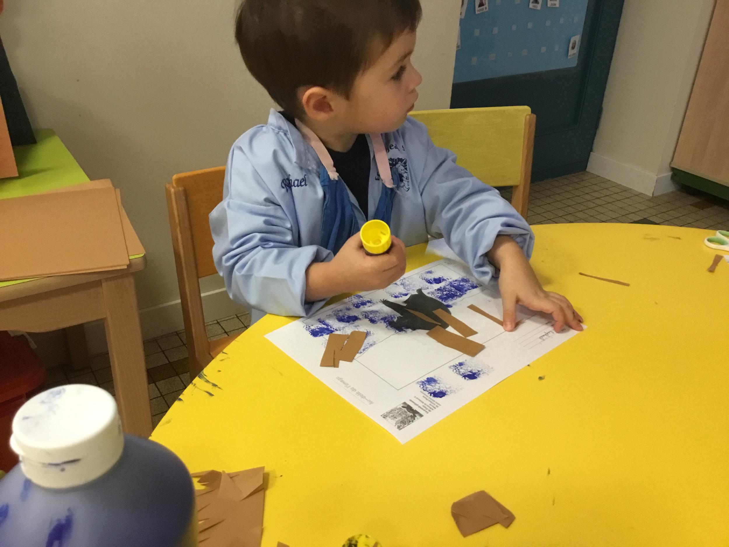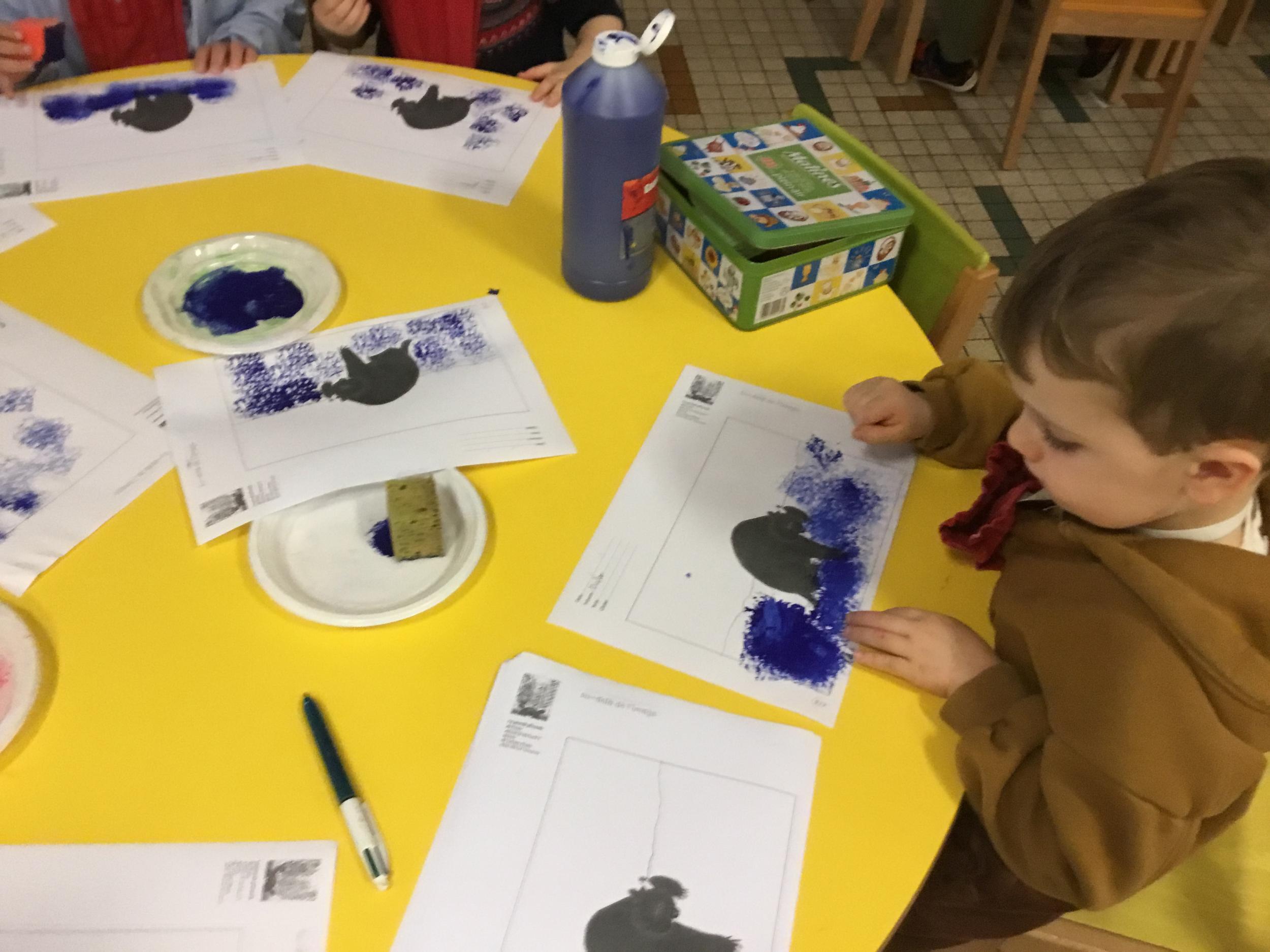 Cette semaine nous avons continué à travailler sur l’album « La grande glissade », le deuxième album du concours Les « Incos ». En groupe de langage, les élèves ont raconté ce qu’ils ont retenu de l’histoire et ont répondu à un quizz. Puis ils ont illustré un passage de l’histoire en utilisant des éponges pour représenter l’eau de la rivière et découpé des bandes de papier pour représenter les sapins au bord de la rivière. Ce travail plastique s’achèvera par un travail de graphisme pour représenter les branches des sapins.