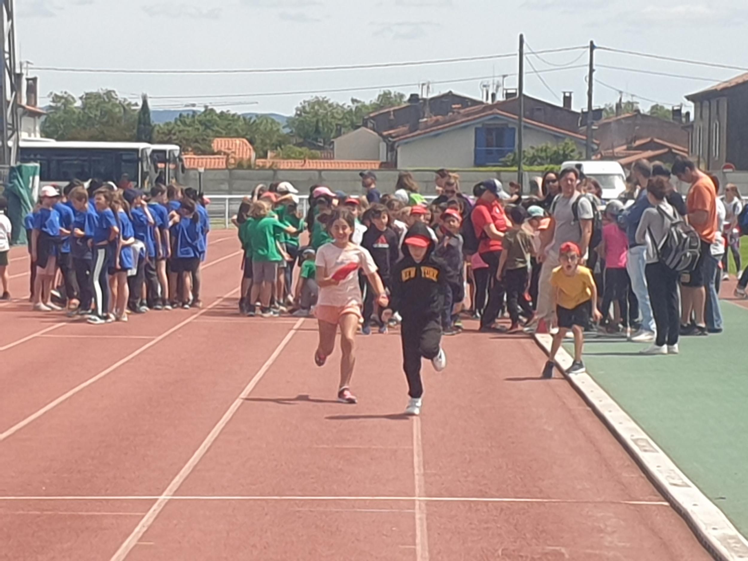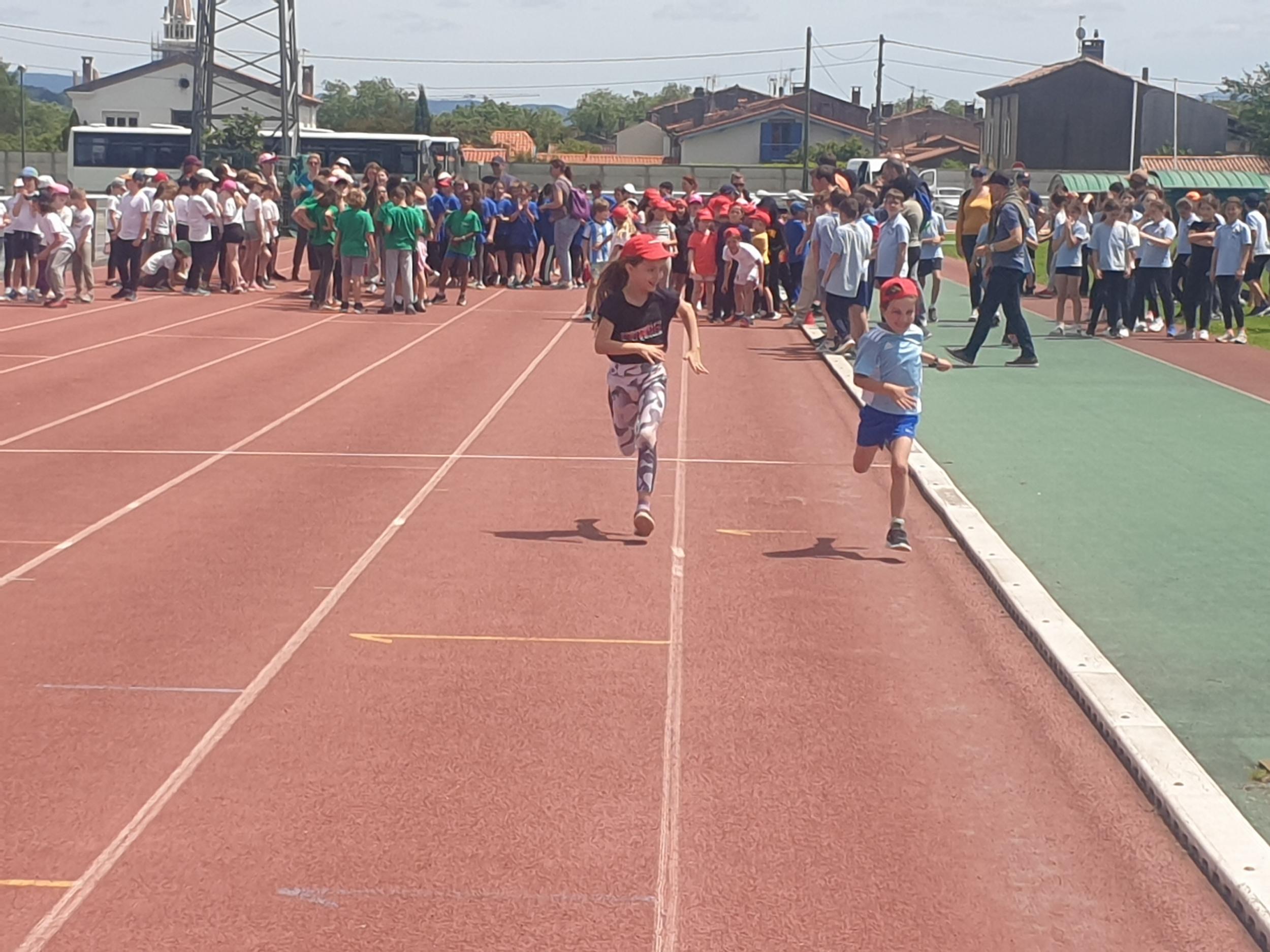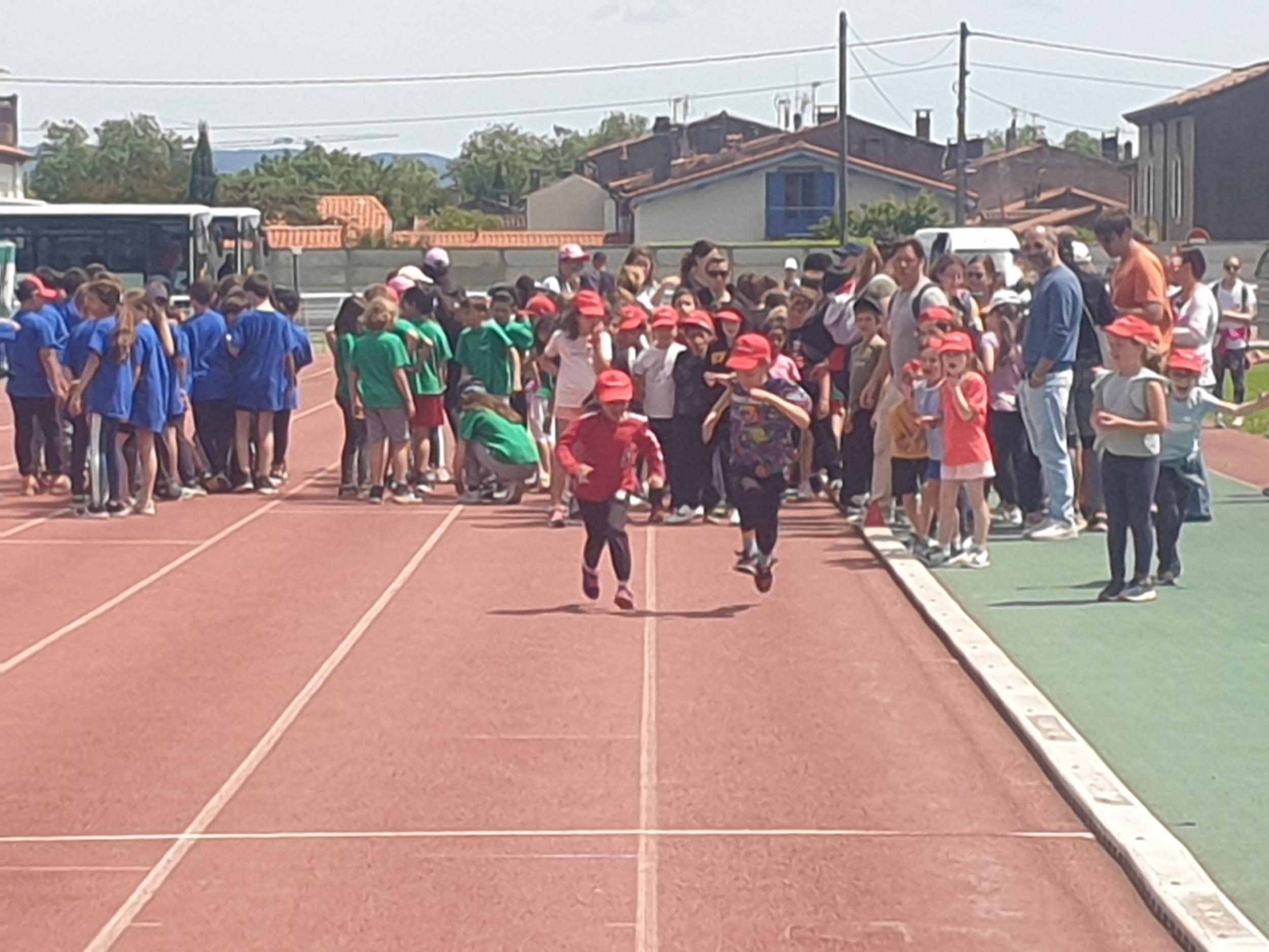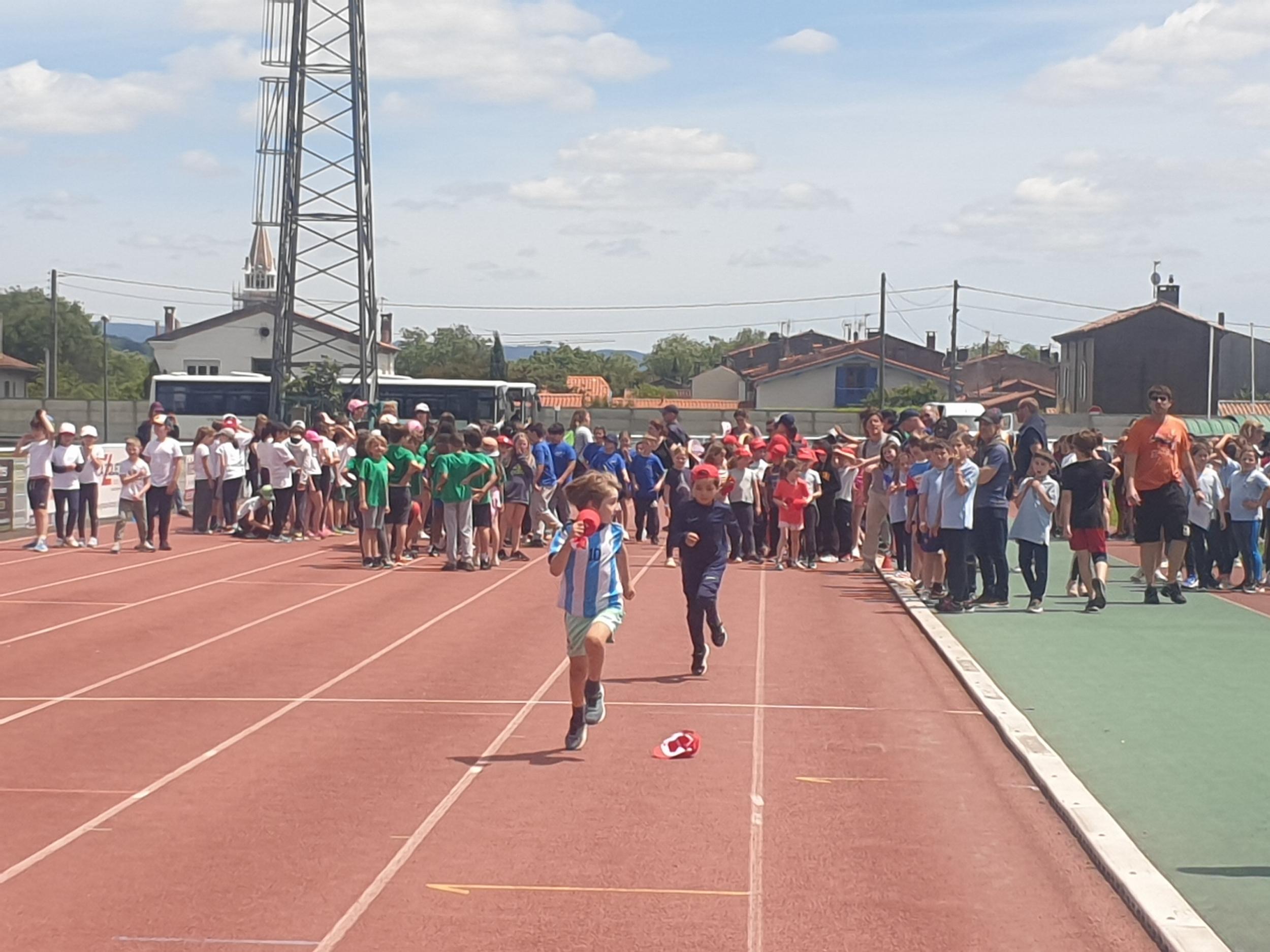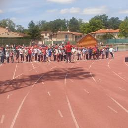 Mardi 28 mai les classes de CP, CE1 et CE2 ont participé à la journée athlétisme organisée par l'UGSEL au stade du Travet. Les élèves ont commencé par le saut en longueur, puis ont continué avec le lancer de vortex. Ensuite, nous avons pique-niqué et les enfants ont participé à la course de demi-fond, ce n'était pas facile après le repas...Ils se sont enfin affrontés sur une épreuve de sprint. A la fin de la journée, ils étaient tous très heureux, et fiers de ce qu'ils avaient fait mais pas autant que leur maîtresse et que les parents présents.