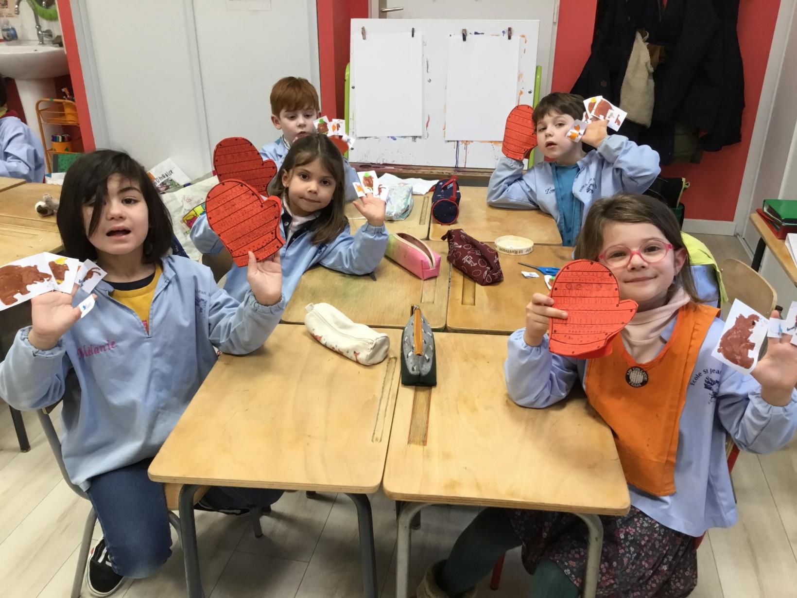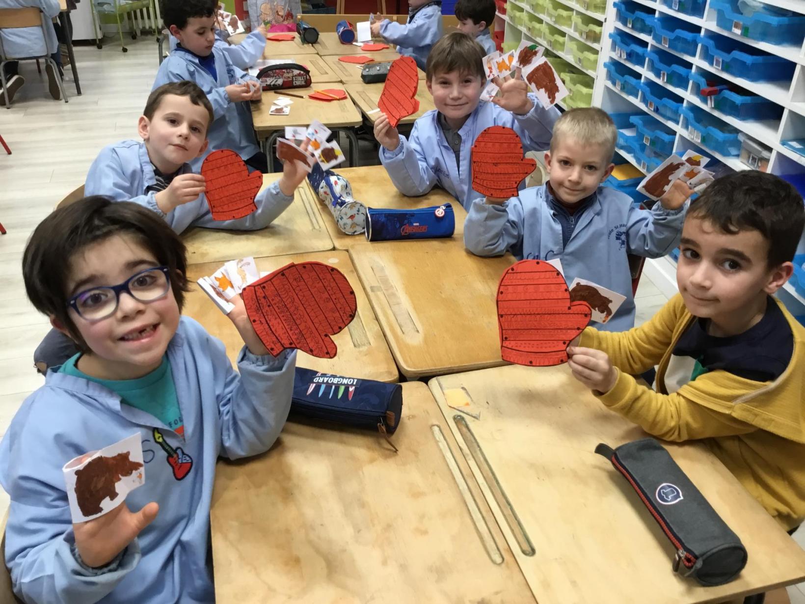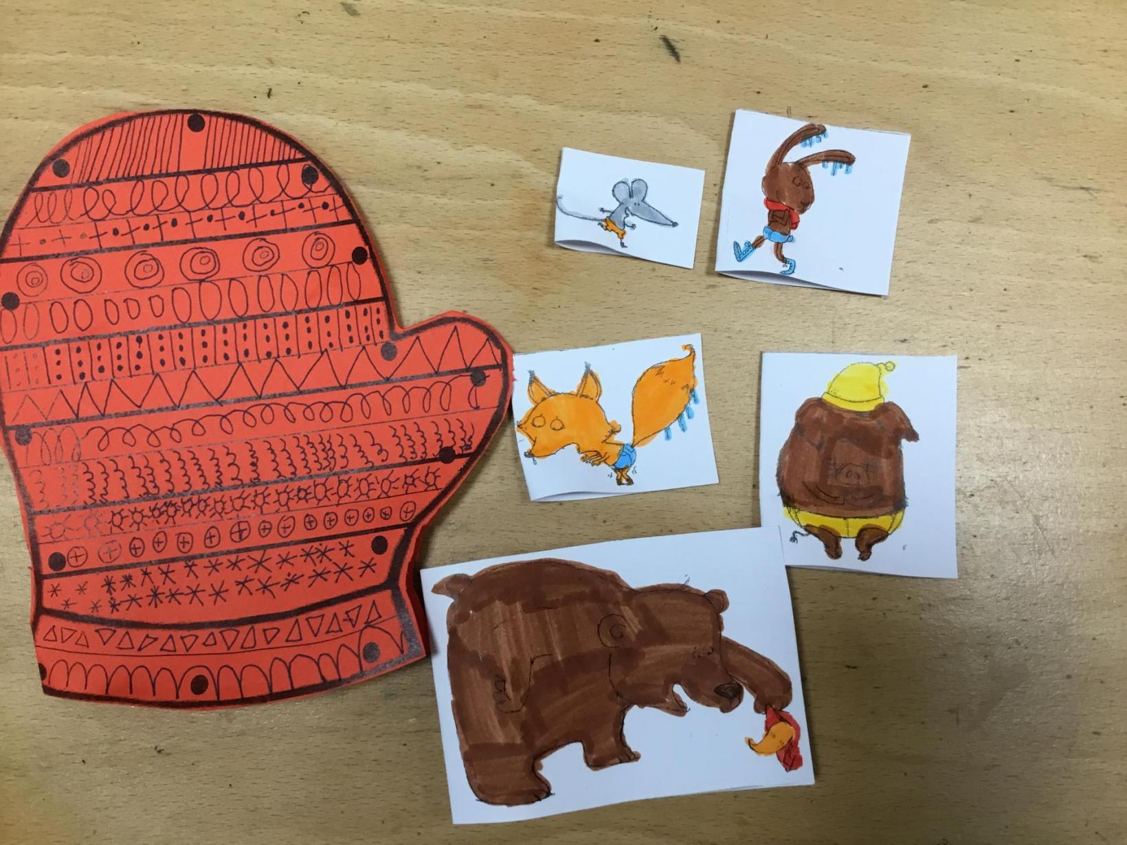 Avec la fin de l'hiver, nous avons beaucoup travaillé autour de diverses versions de "la Moufle", conte en randonnée avec répétition des évènements. pour clôturer ces apprentissages et s'approprier encore mieux l'histoire, chacun s'est confectionné sa moufle, décorée de nombreux graphismes minutieux. Puis ils ont coloré les personnages de l'histoire, les transformant en marionnettes à doigts qui se cachent les unes après les autres dans la moufle, jusqu'à ce que celle-ci explose après l'arrivée du dernier animal!