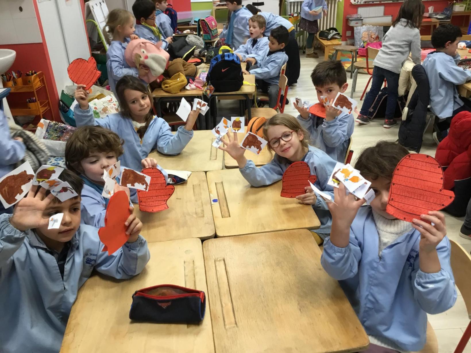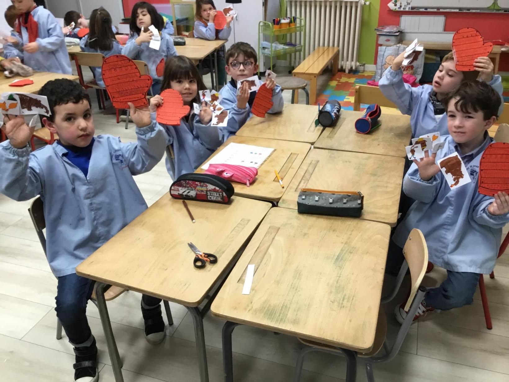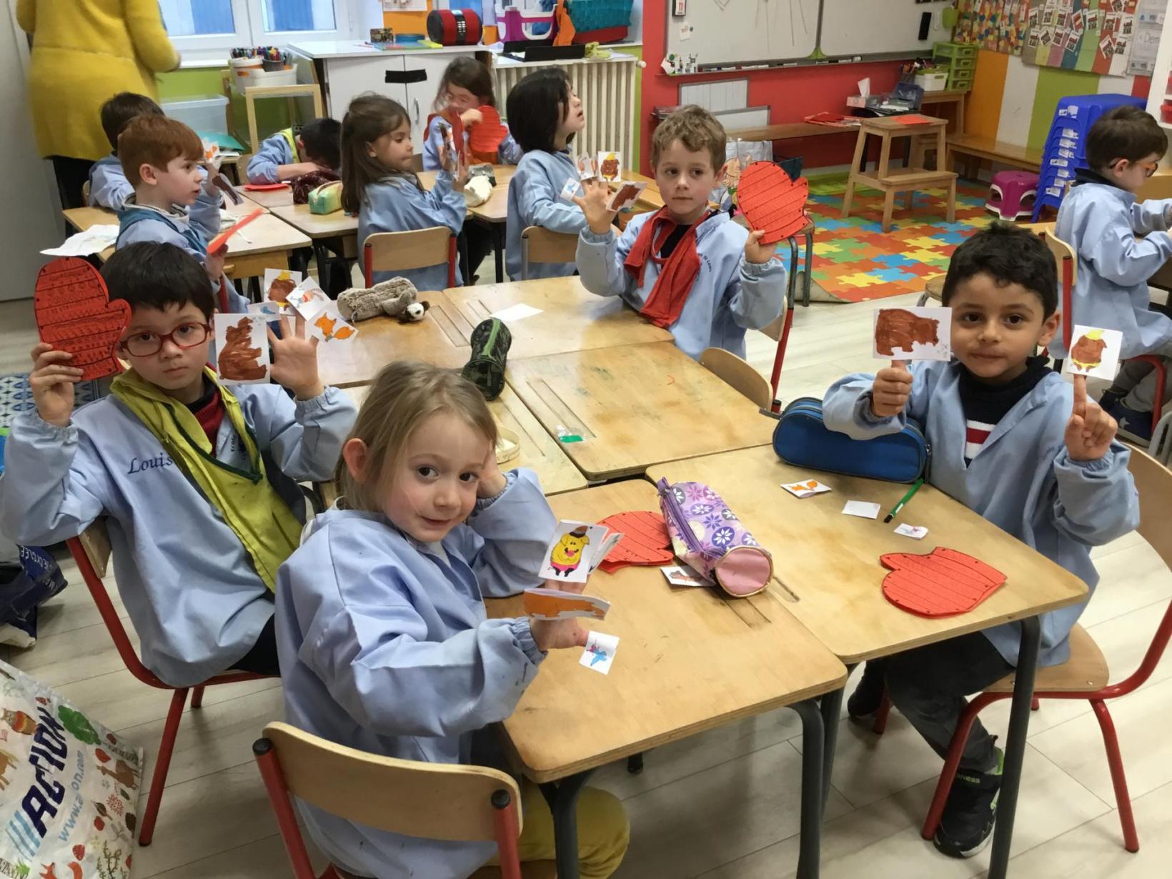 Avec la fin de l'hiver, nous avons beaucoup travaillé autour de diverses versions de "la Moufle", conte en randonnée avec répétition des évènements. pour clôturer ces apprentissages et s'approprier encore mieux l'histoire, chacun s'est confectionné sa moufle, décorée de nombreux graphismes minutieux. Puis ils ont coloré les personnages de l'histoire, les transformant en marionnettes à doigts qui se cachent les unes après les autres dans la moufle, jusqu'à ce que celle-ci explose après l'arrivée du dernier animal!