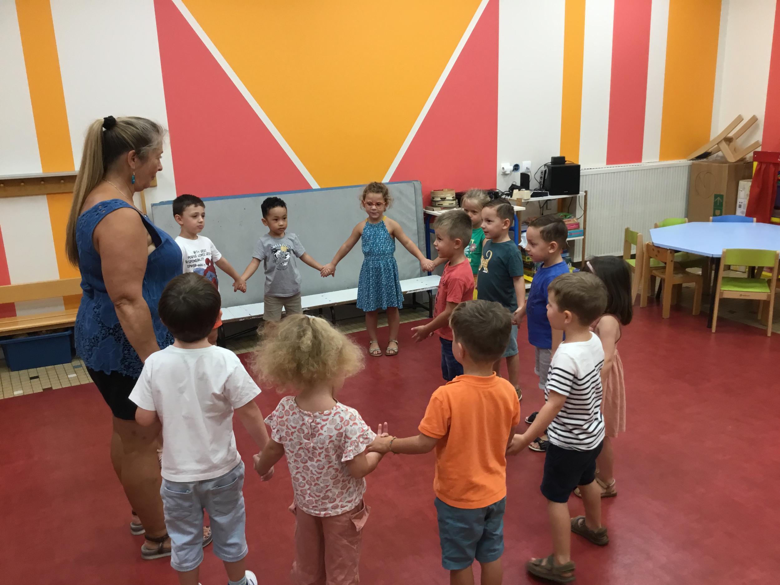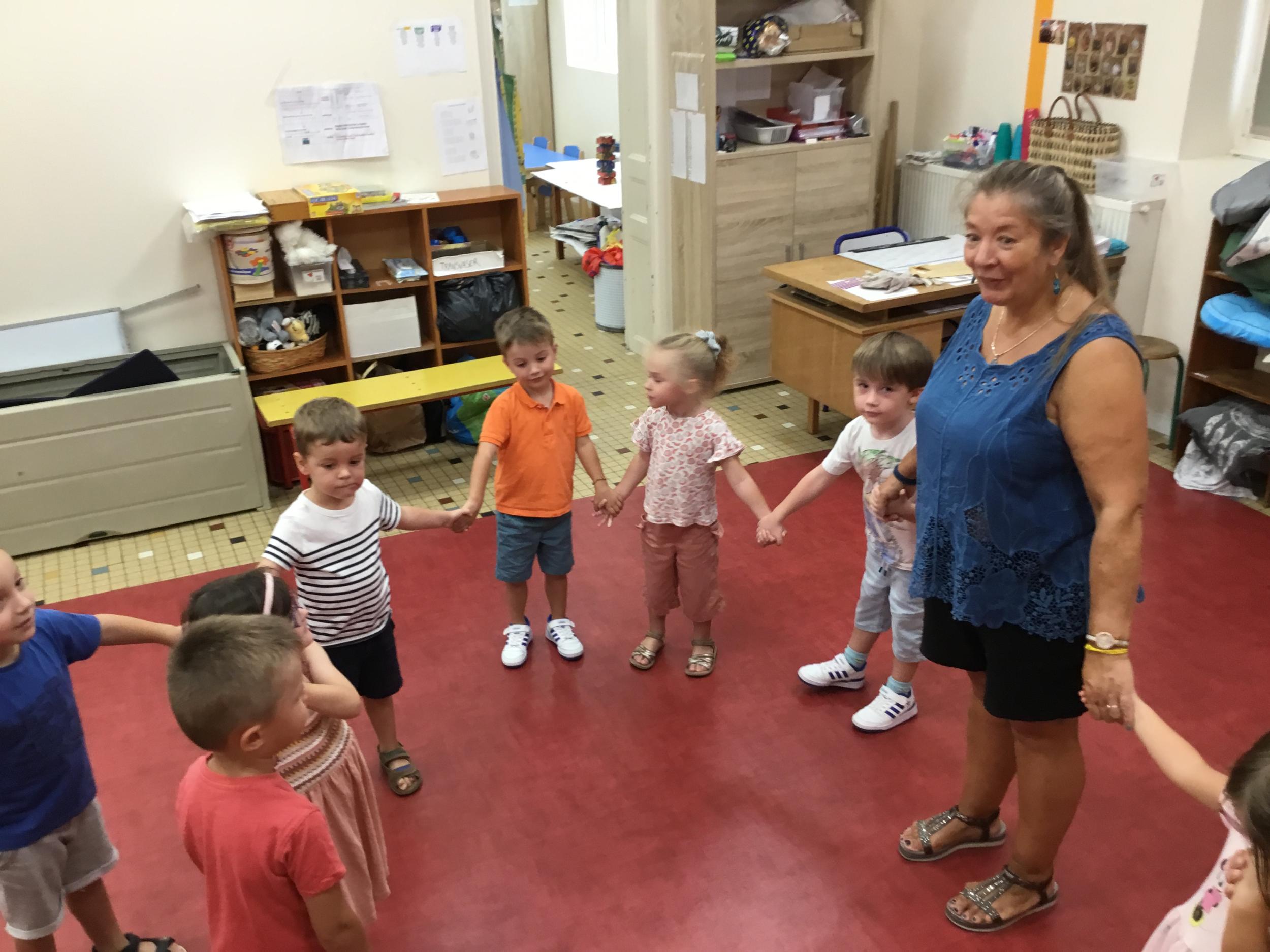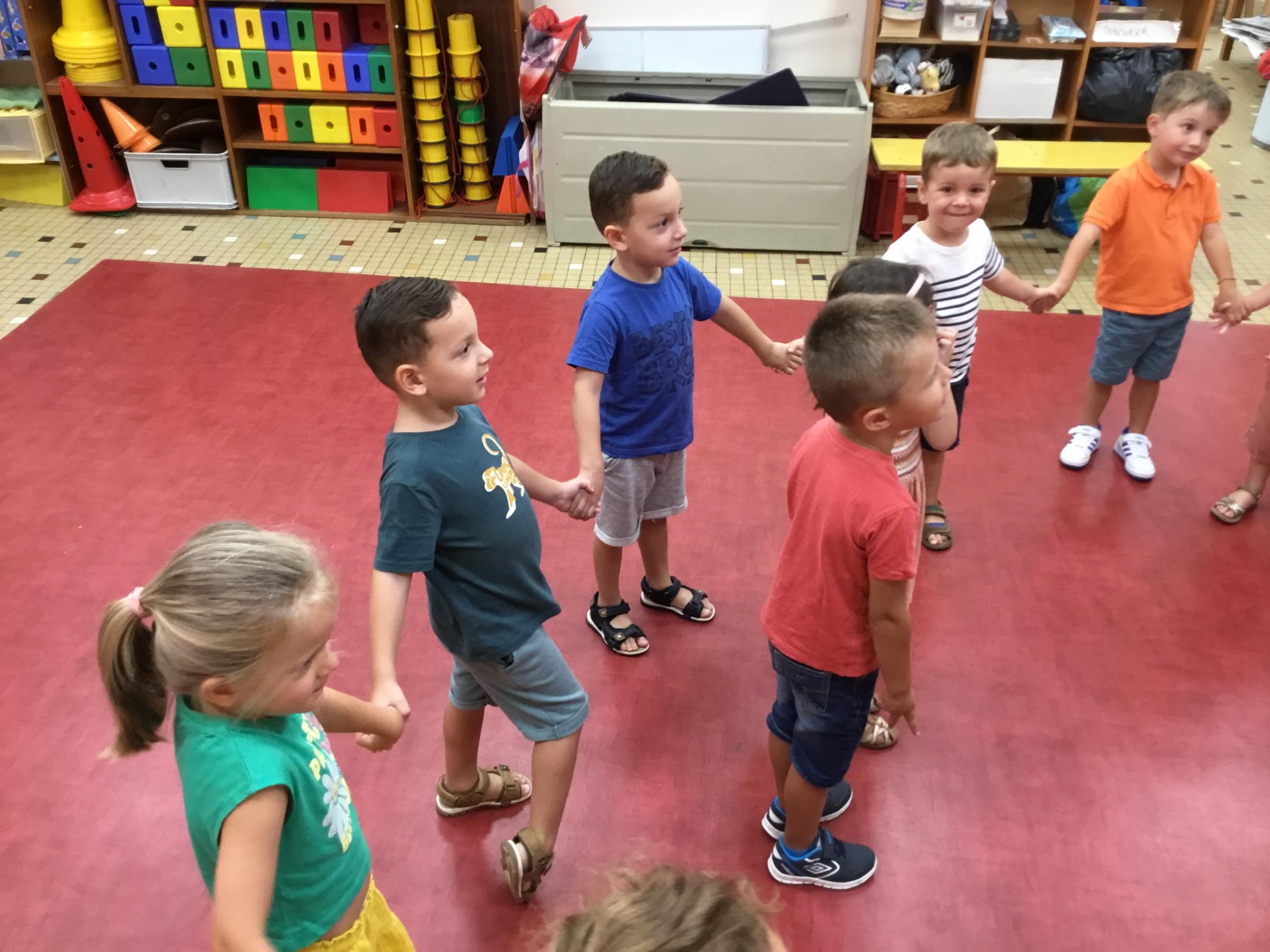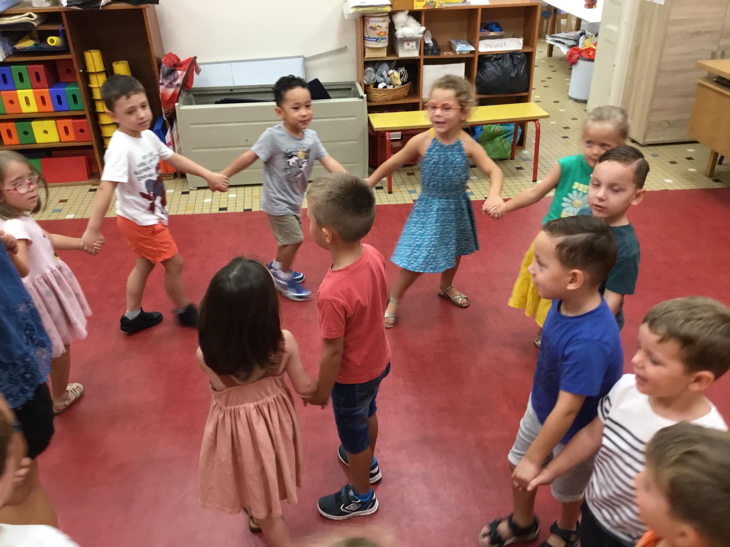Petite et moyenne section 14/09/2023 En début, rien de mieux qu’une ronde pour se socialiser et apprendre à vivre ensemble. C’est pour cela que c’est un temps fort de fraternité pour chanter et jouer ensemble.