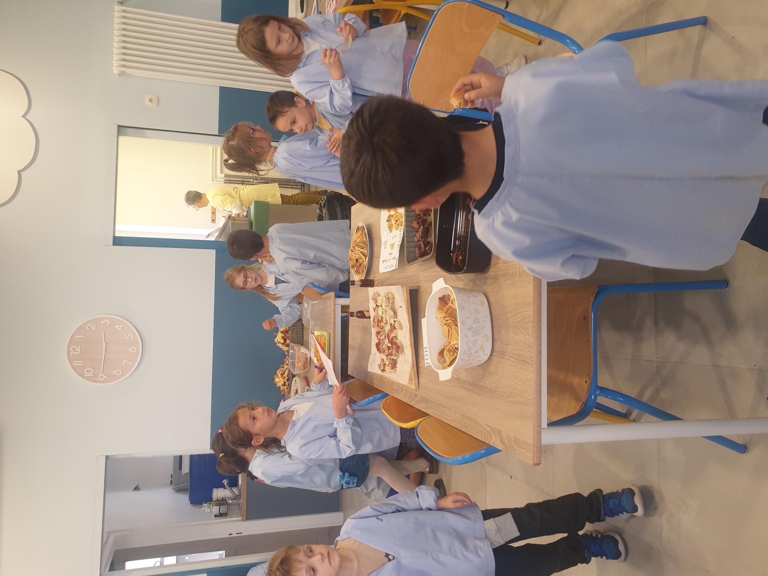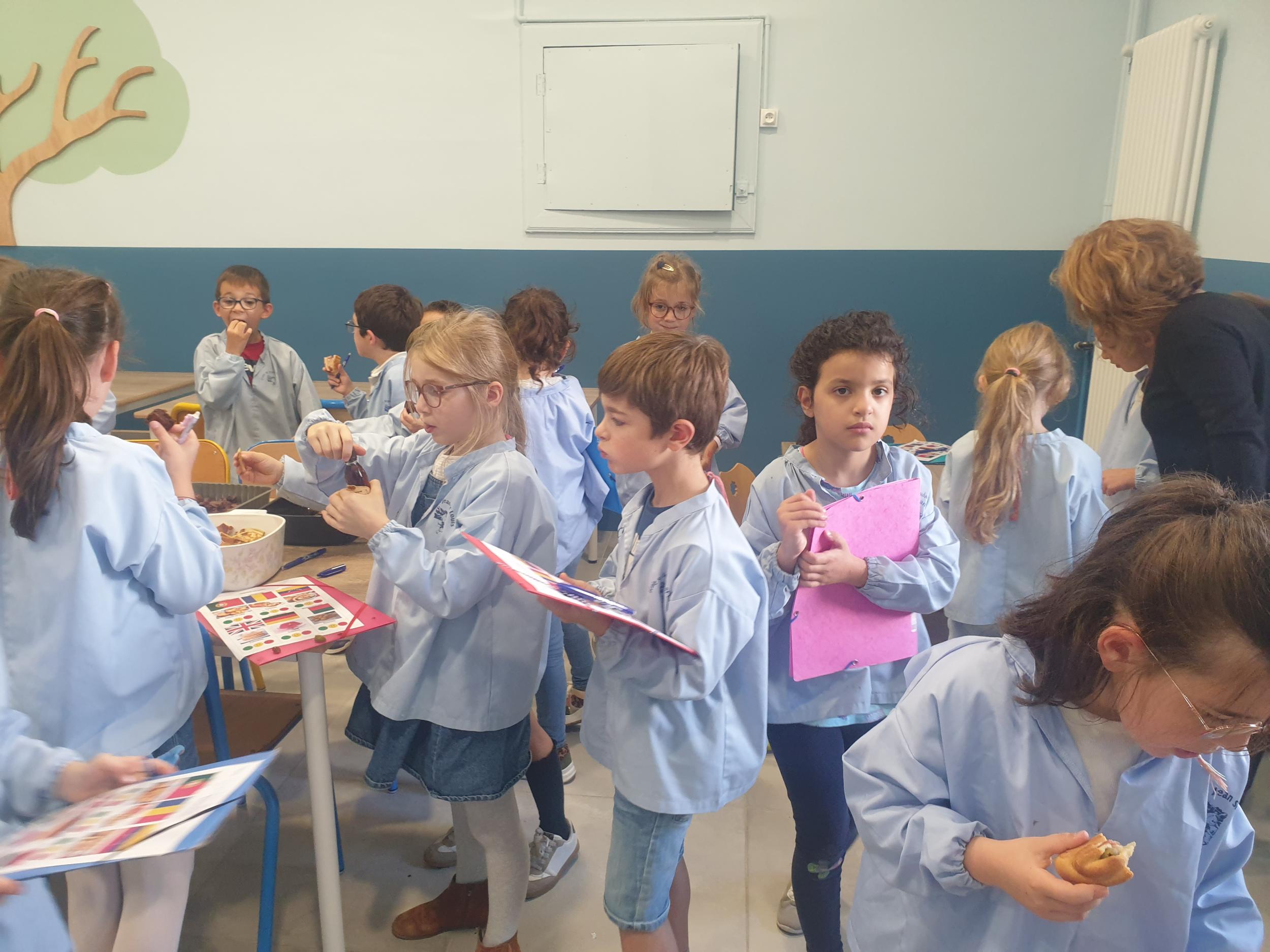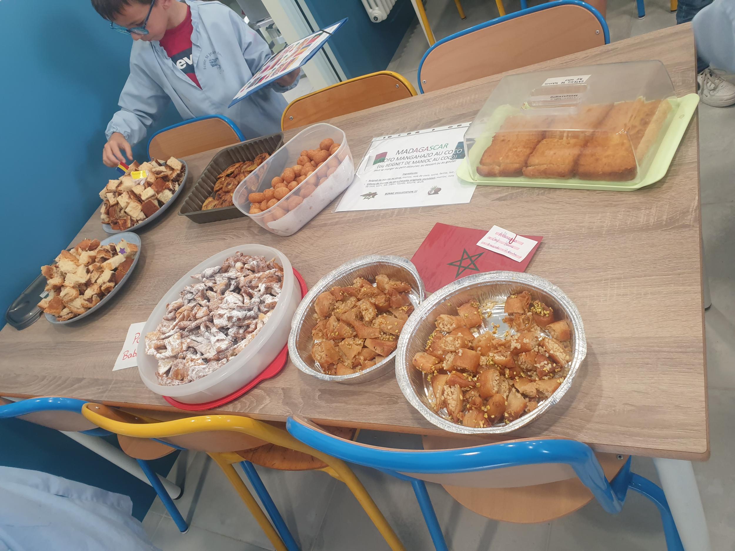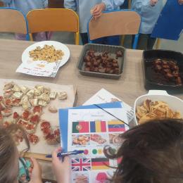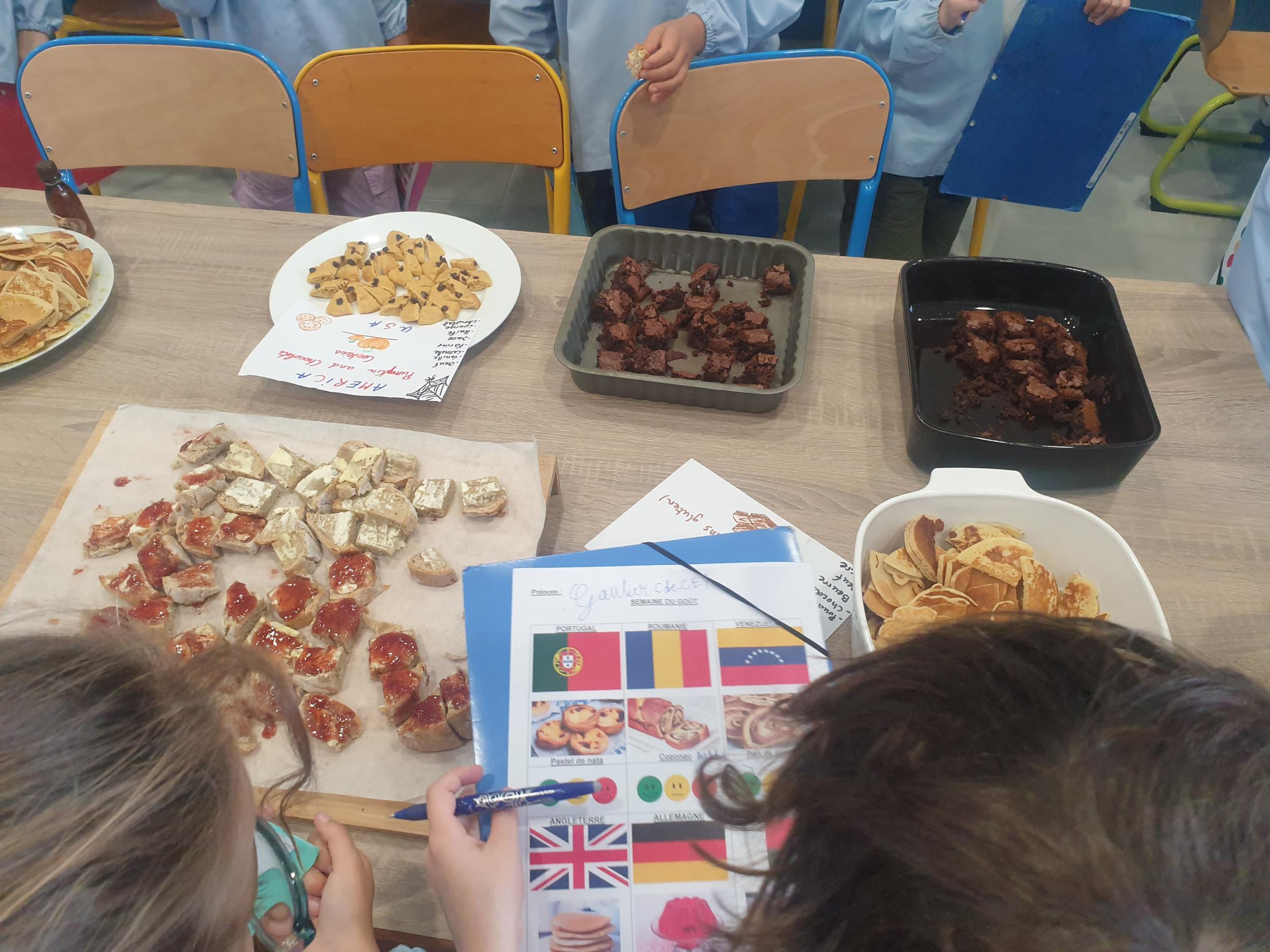 A l'occasion de la semaine du goût, certains parents de l'école se sont mobilisés pour nous confectionner un plat typique de leur pays d'origine. Aujourd'hui, le Portugal, le Maroc, Madagascar, l'Angleterre, le Vénézuéla, l'Allemagne, la Roumanie et les Etats-Unis étaient à l'honneur. Les élèves de CE1 ont pu goûter du pan de jamon, des Pastels de nata, du Cozonac, les pancakes, des beignets de Manioc et coco, du wakeld pudding, du brownie, et des Baklavas. Chacun a noté ses impressions sur une fiche puis de retour en classe chaque élève a pû écrire le plat qu'il avait préféré et desiner le drapeau du pays correspondant. Même si tout n'a pas été apprécié à sa juste valeur par tous, tous les enfants ont fait l'effort de goûter à chacune des spécialités. Merci beaucoup aux parents qui ont pris du temps pour nous faire découvrir toutes ses spécialités culinaires, les enfants et les adultes ont beaucoup apprécié!