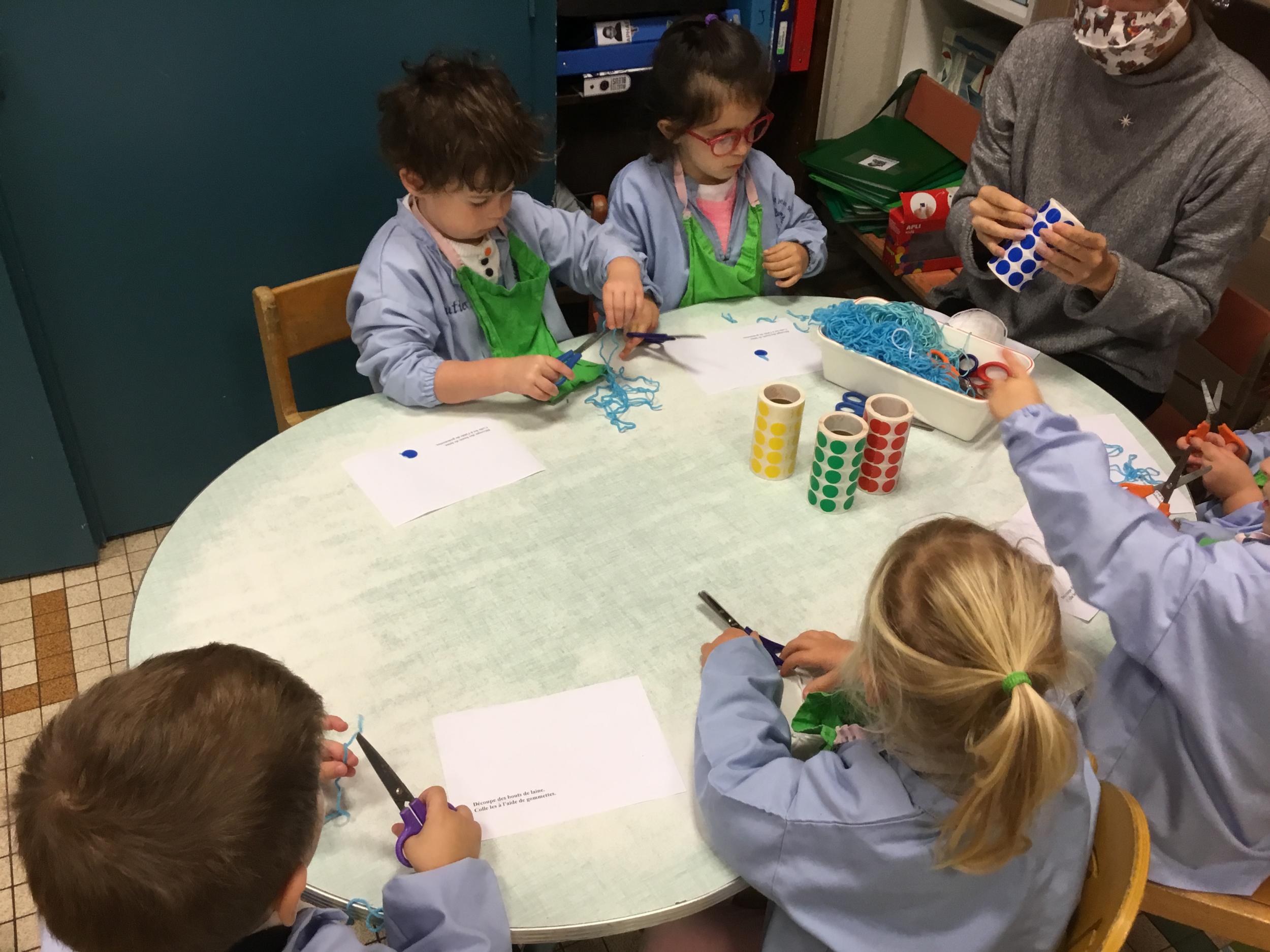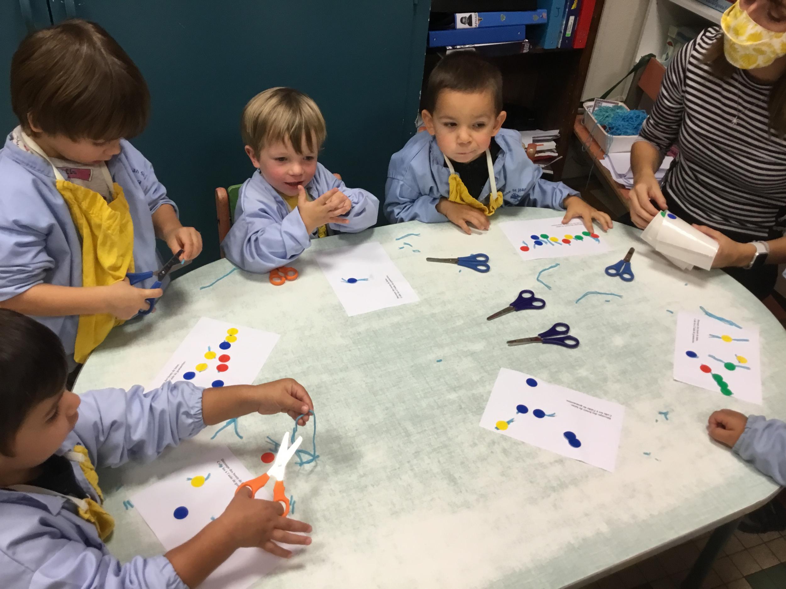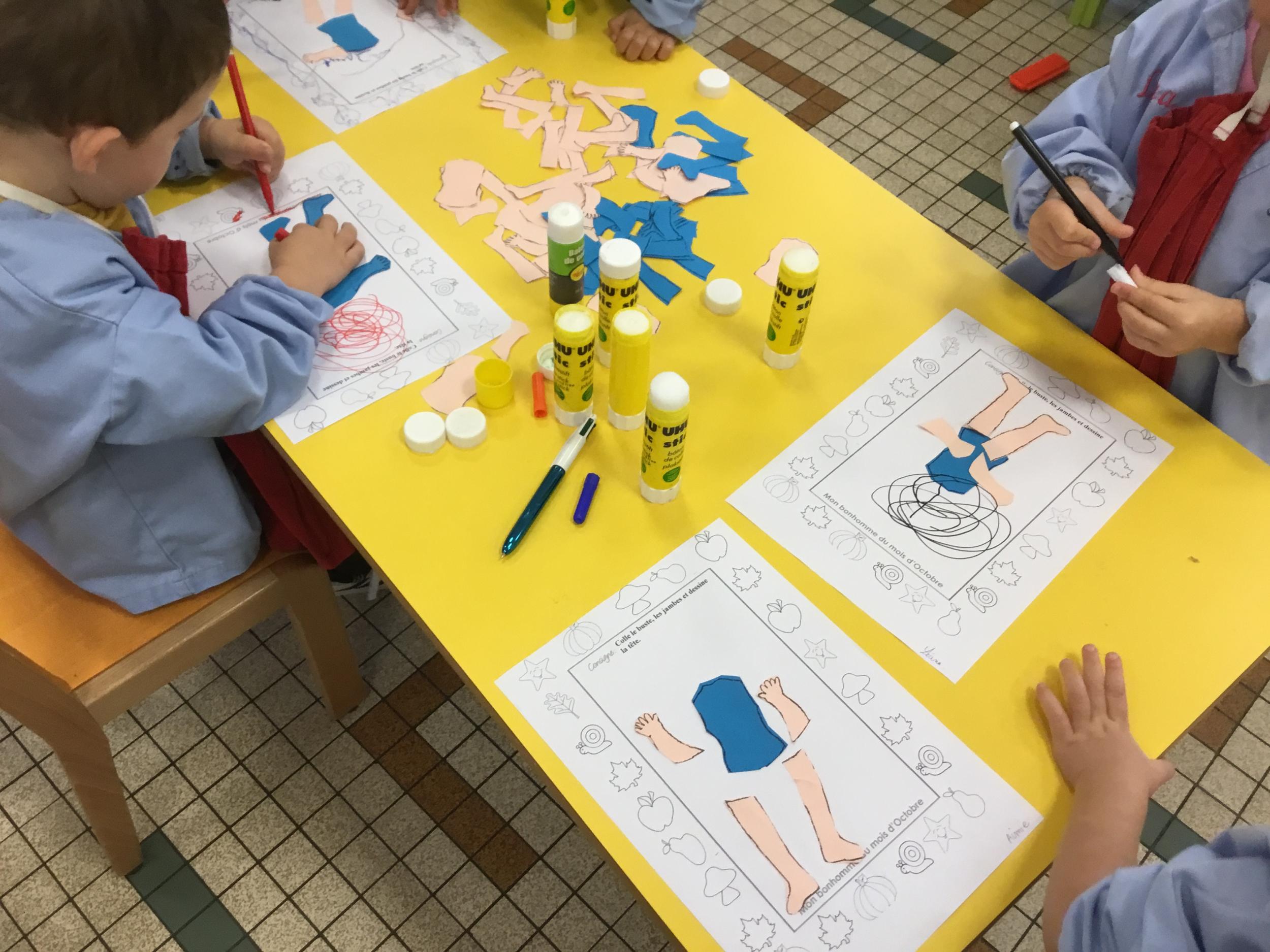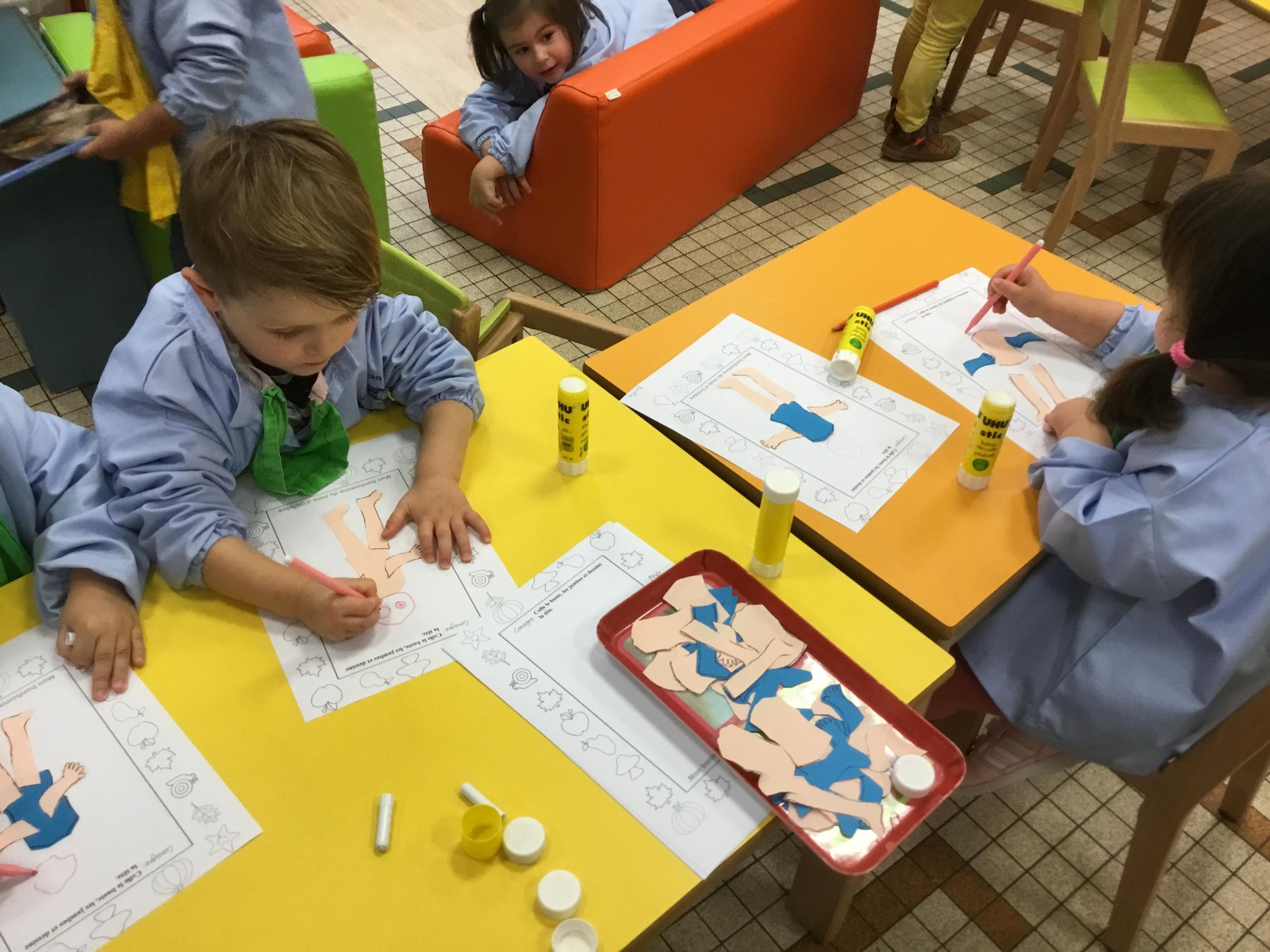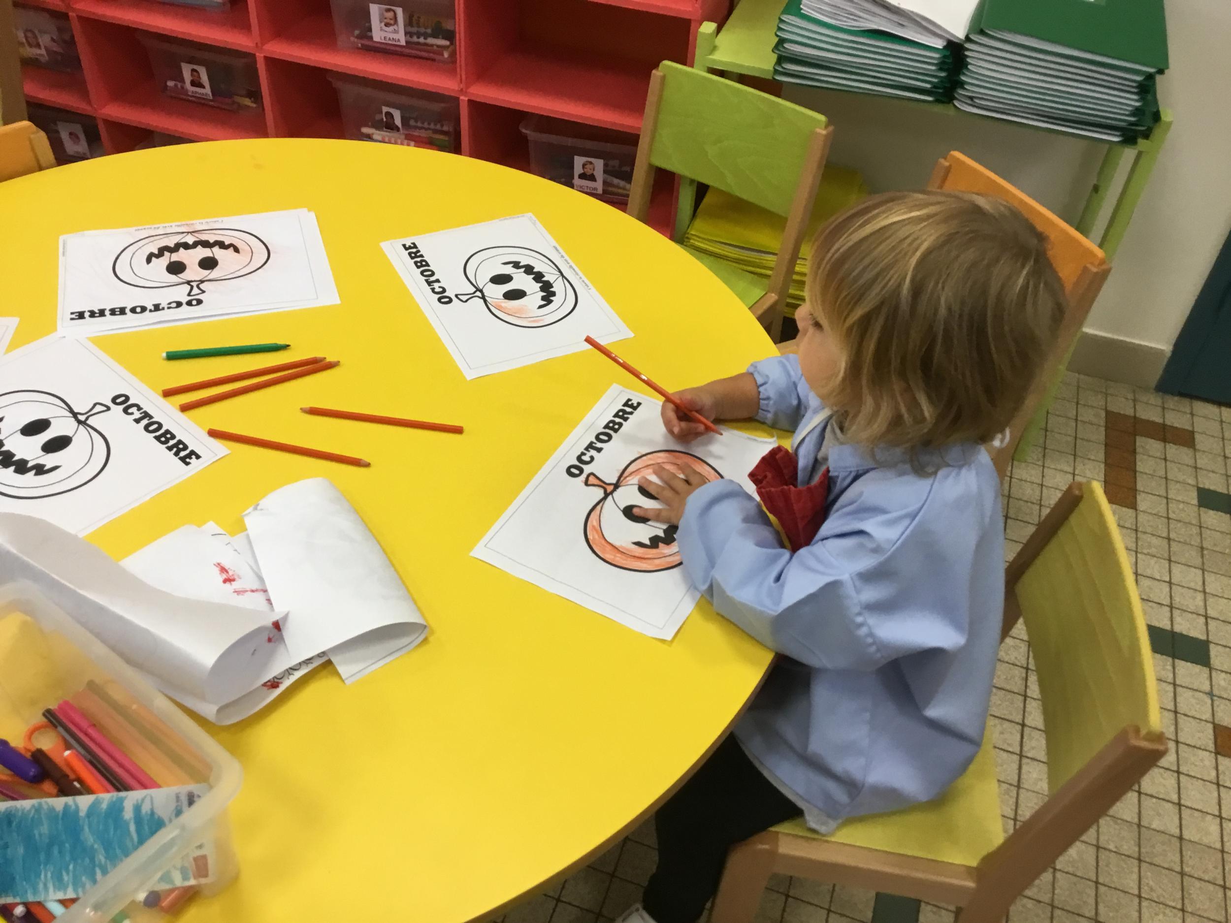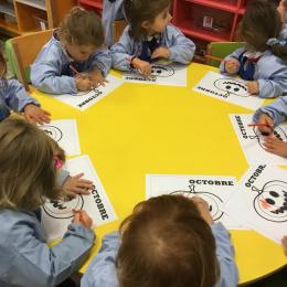 Petite et moyenne section 15/10/2020 Les élèves continuent à laisser des traces à l’aide de différents outils: la fourchette et le coton tige Le bonhomme du mois d’octobre Découper des bouts de laine. Les consignes sont données en anglais Écouter une histoire et la raconter à l’aide de marionnettes Atelier en autonomie: colorier la fiche du mois d’octobre pour le cahier de vie