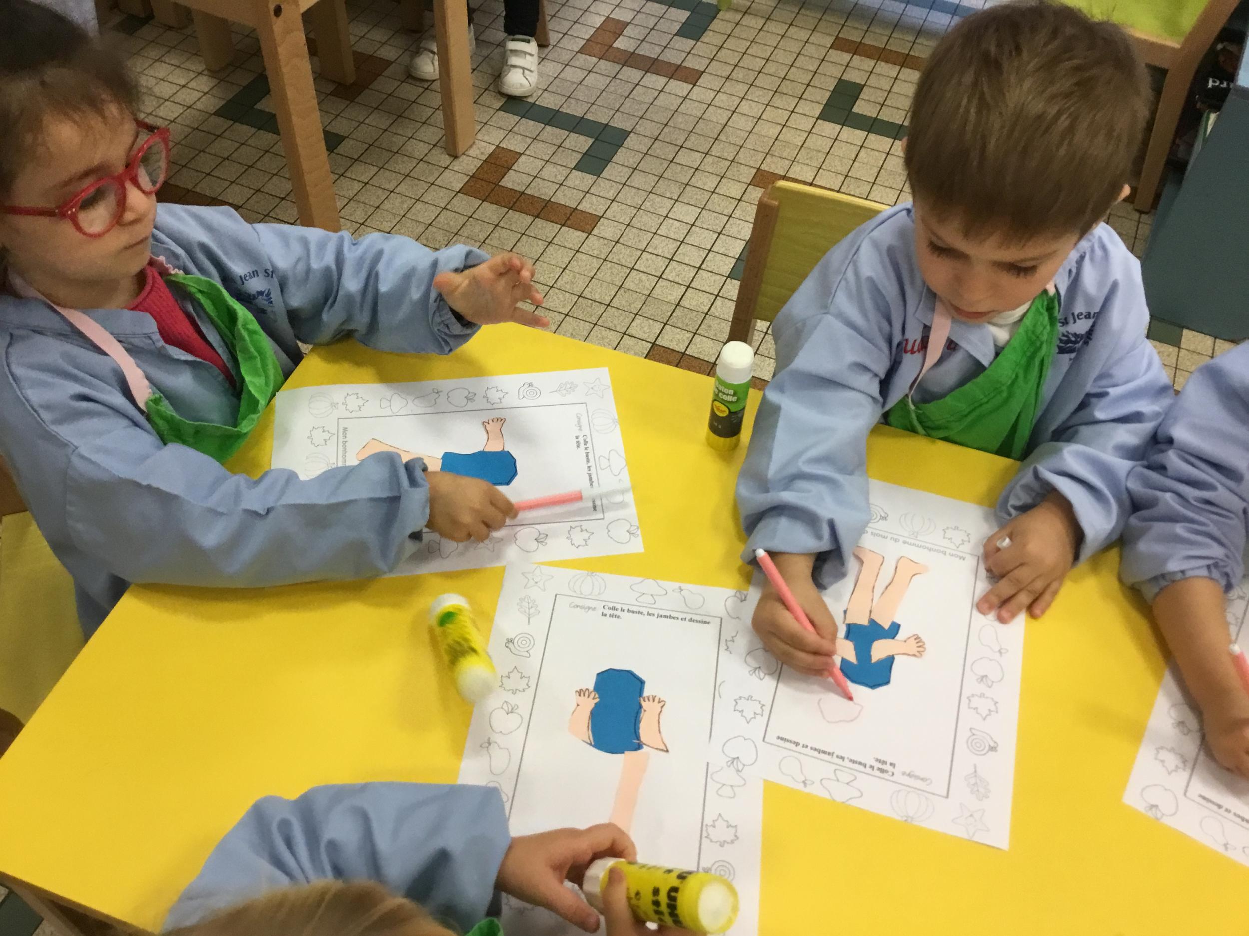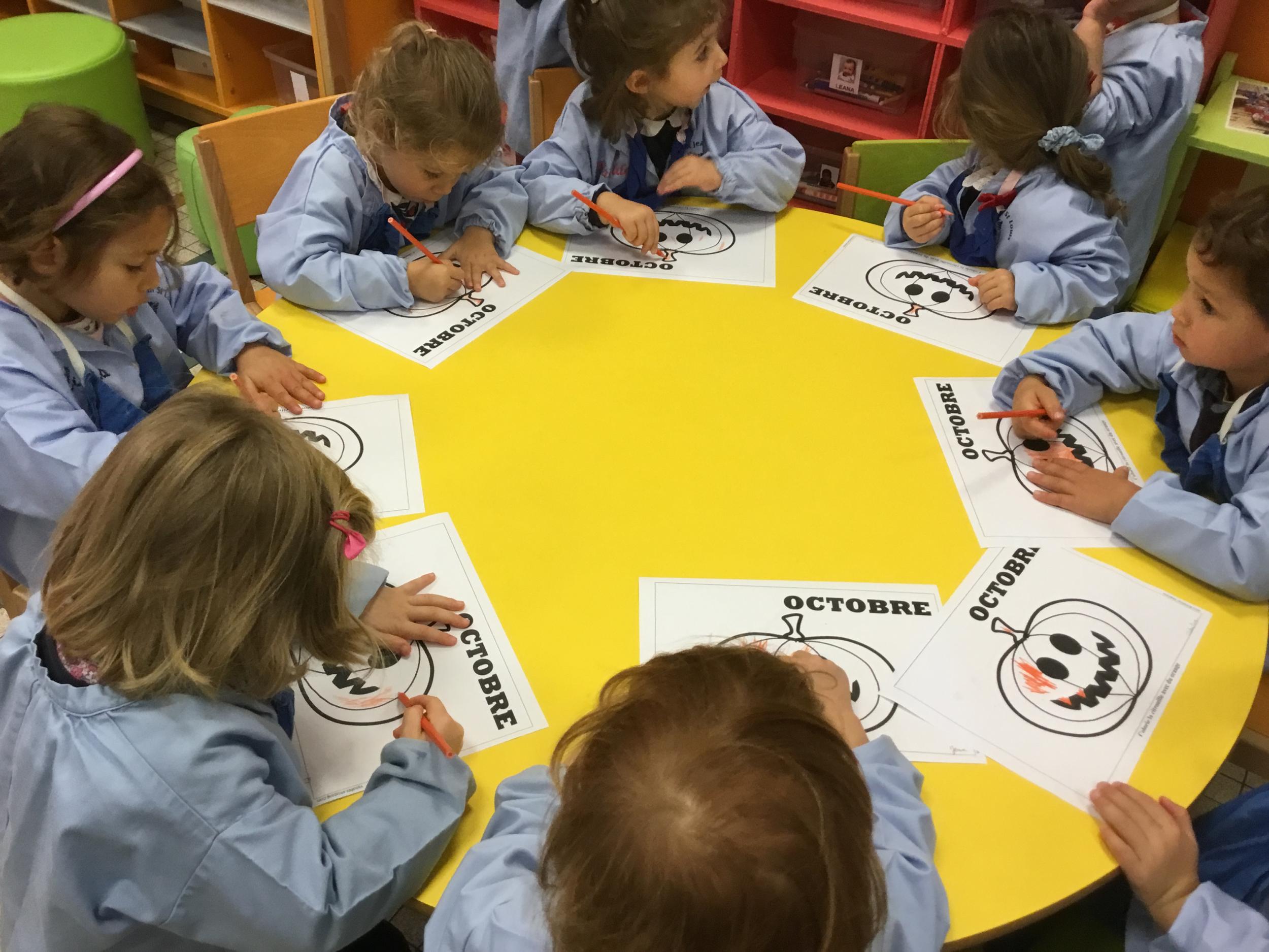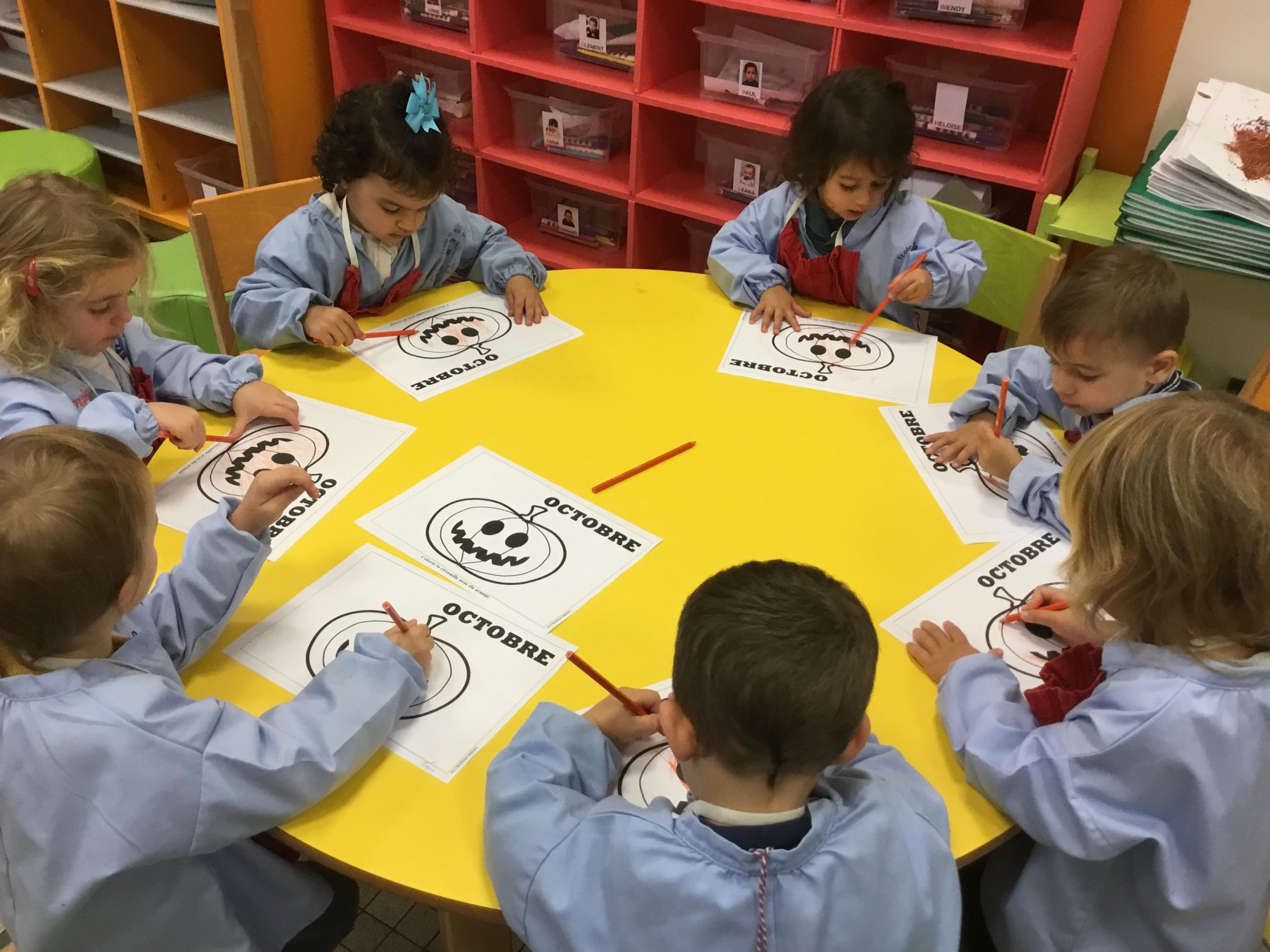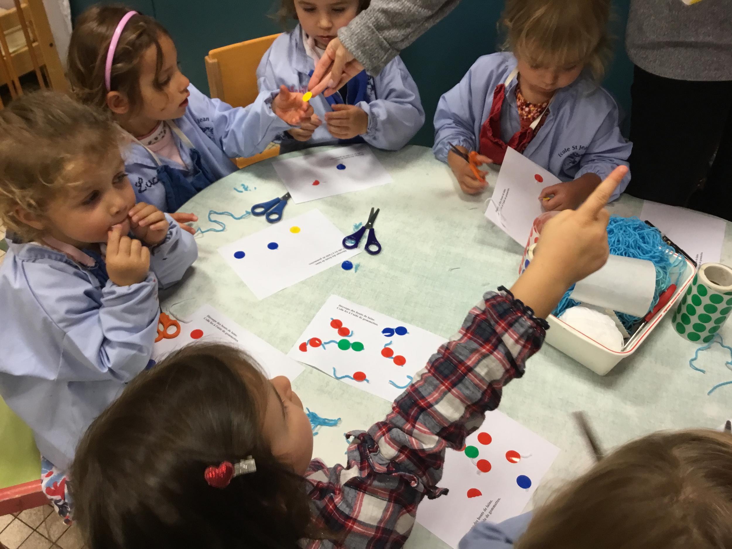 Petite et moyenne section 15/10/2020 Les élèves continuent à laisser des traces à l’aide de différents outils: la fourchette et le coton tige Le bonhomme du mois d’octobre Découper des bouts de laine. Les consignes sont données en anglais Écouter une histoire et la raconter à l’aide de marionnettes Atelier en autonomie: colorier la fiche du mois d’octobre pour le cahier de vie