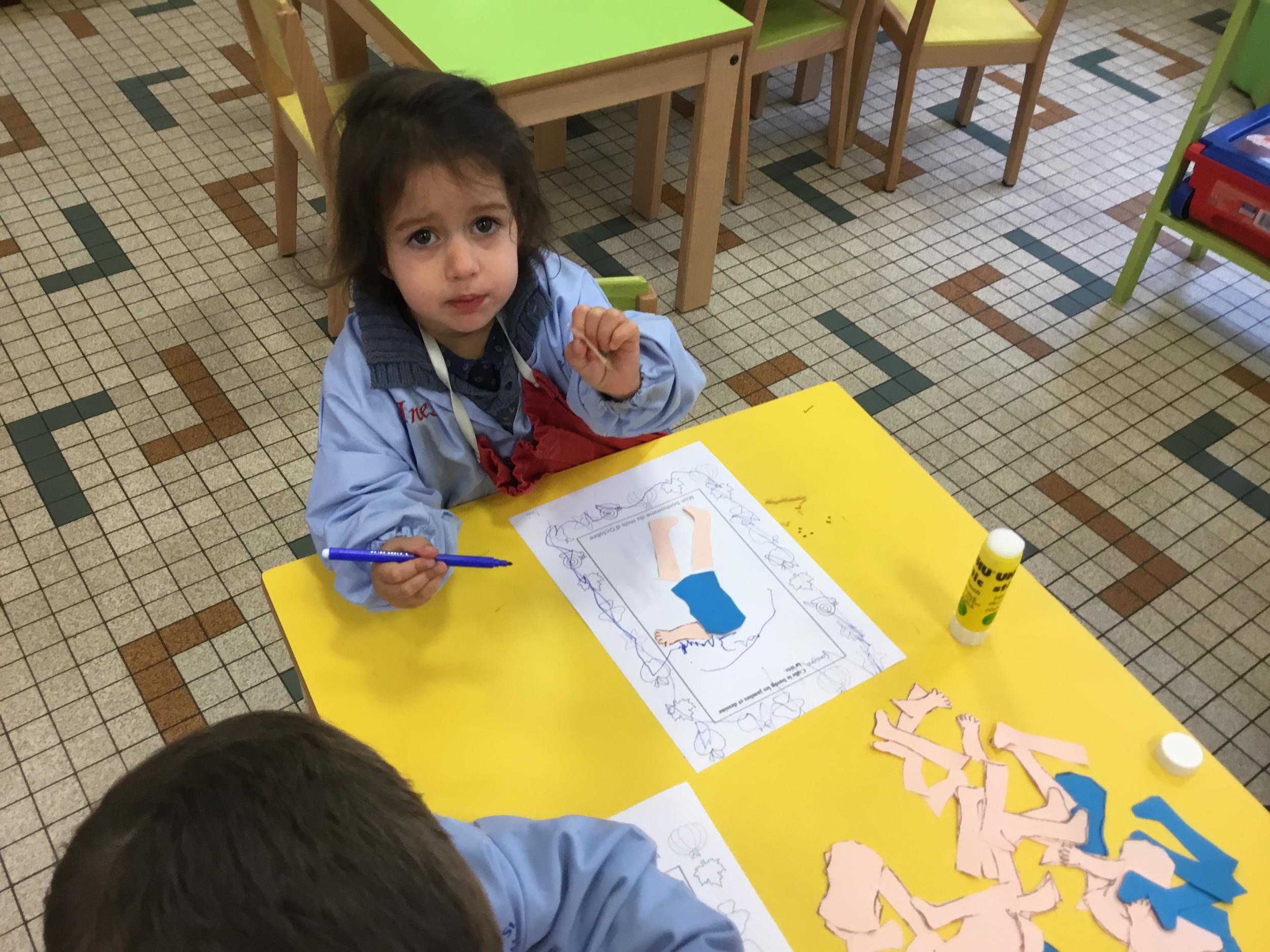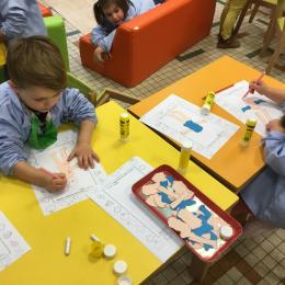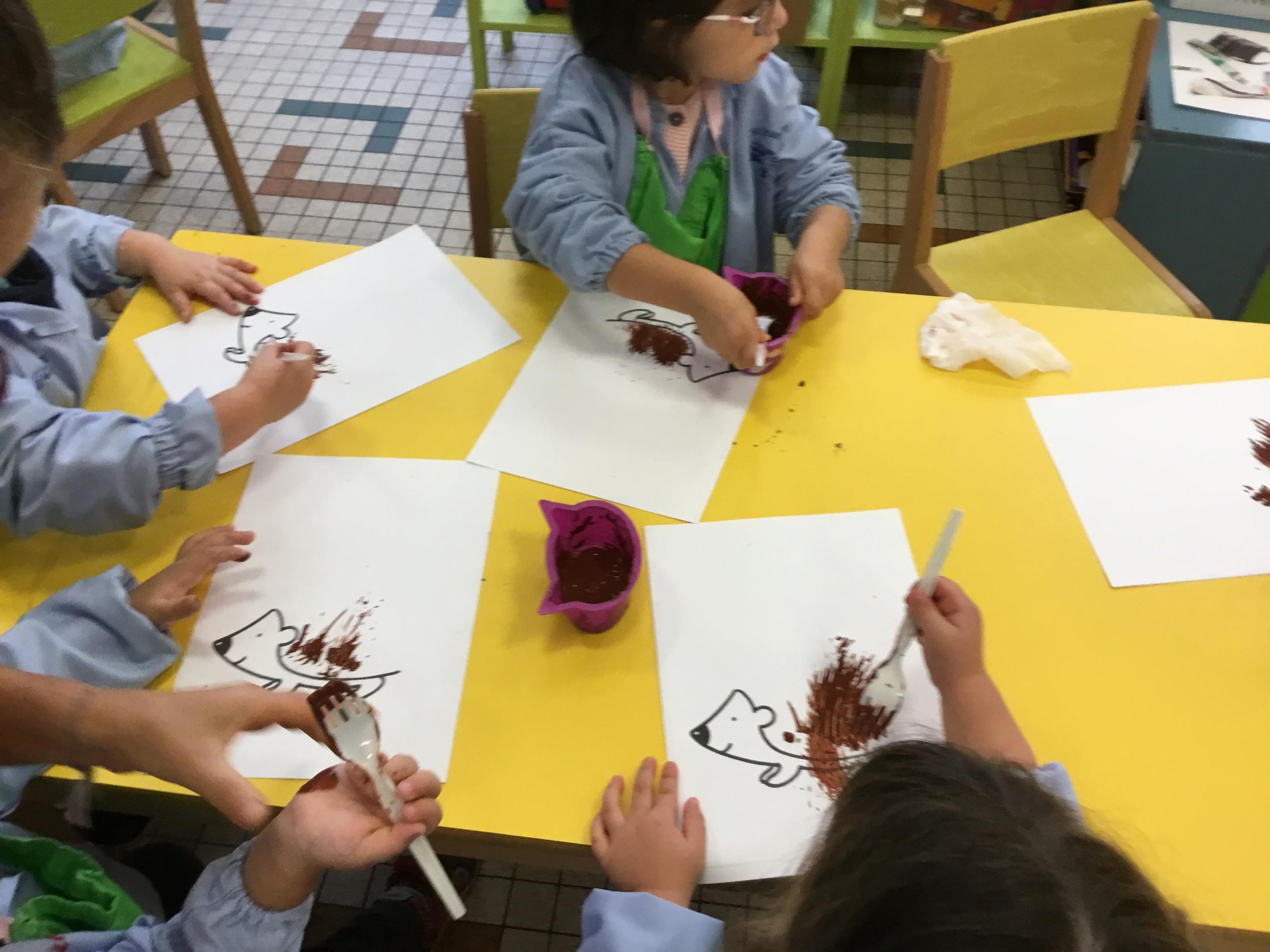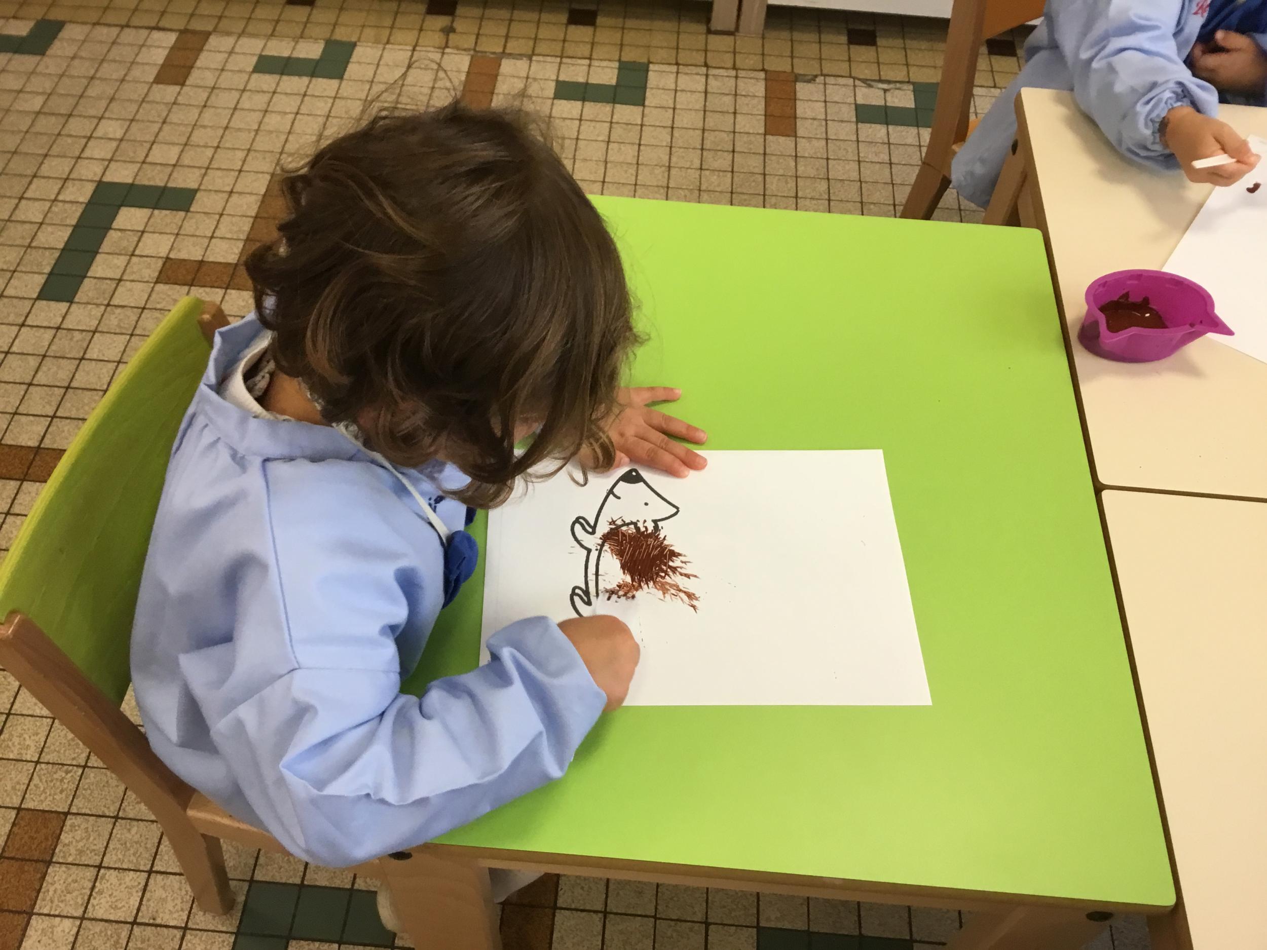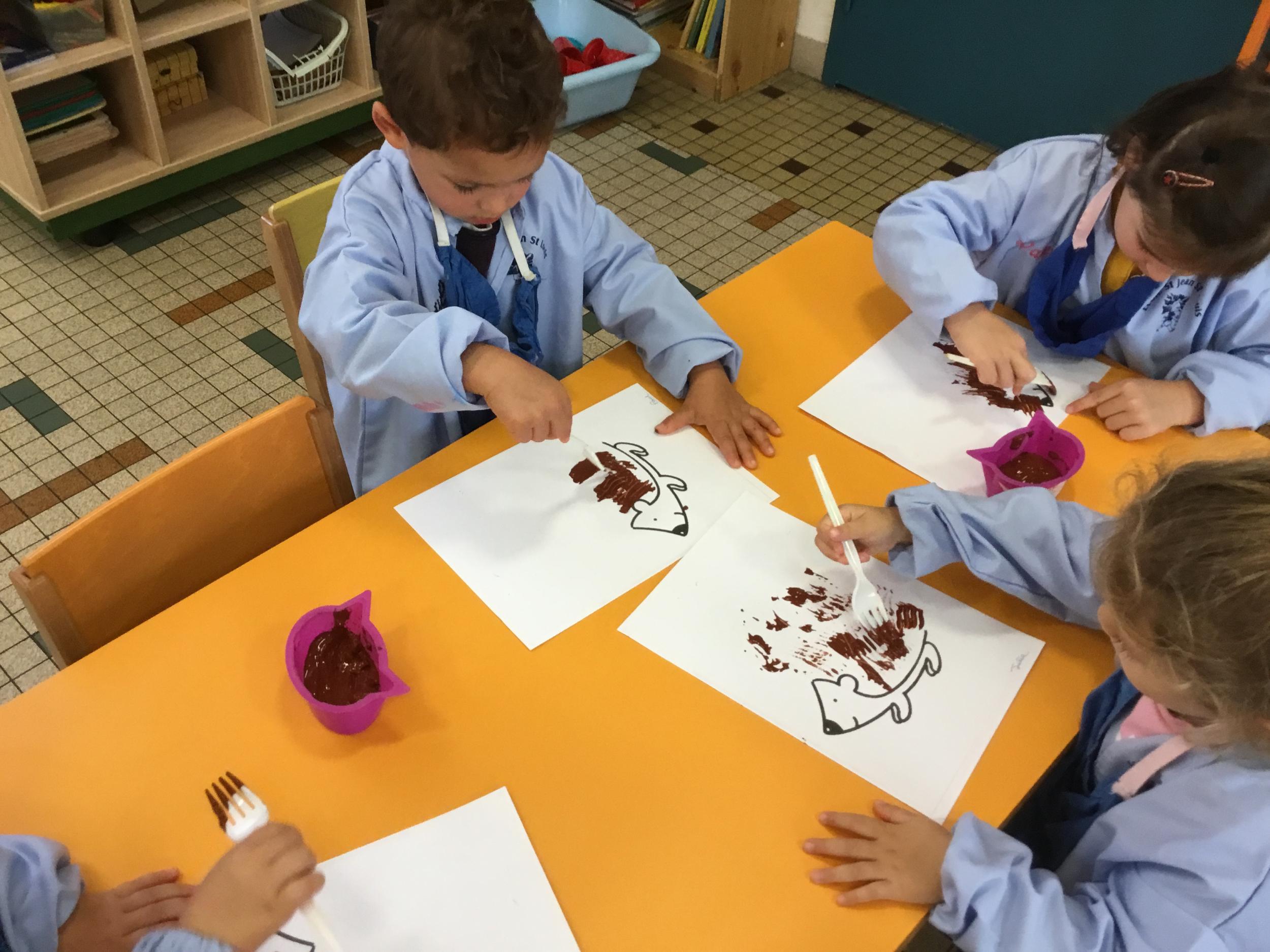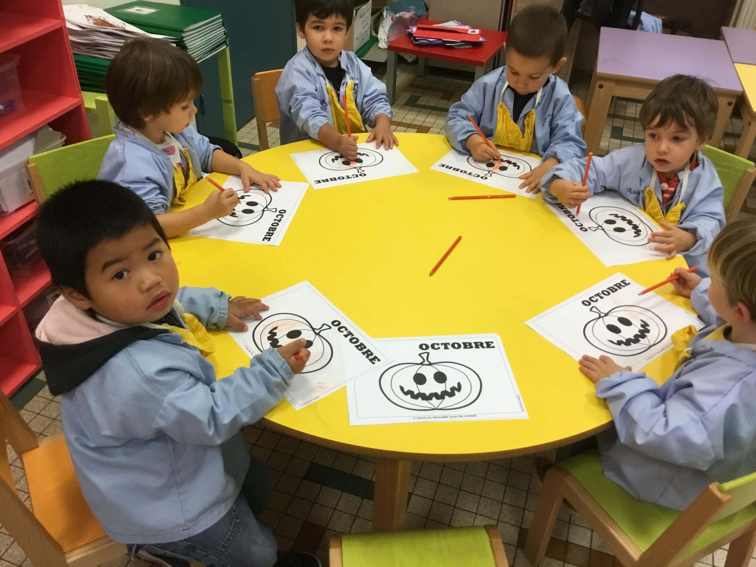 Petite et moyenne section 15/10/2020 Les élèves continuent à laisser des traces à l’aide de différents outils: la fourchette et le coton tige Le bonhomme du mois d’octobre Découper des bouts de laine. Les consignes sont données en anglais Écouter une histoire et la raconter à l’aide de marionnettes Atelier en autonomie: colorier la fiche du mois d’octobre pour le cahier de vie