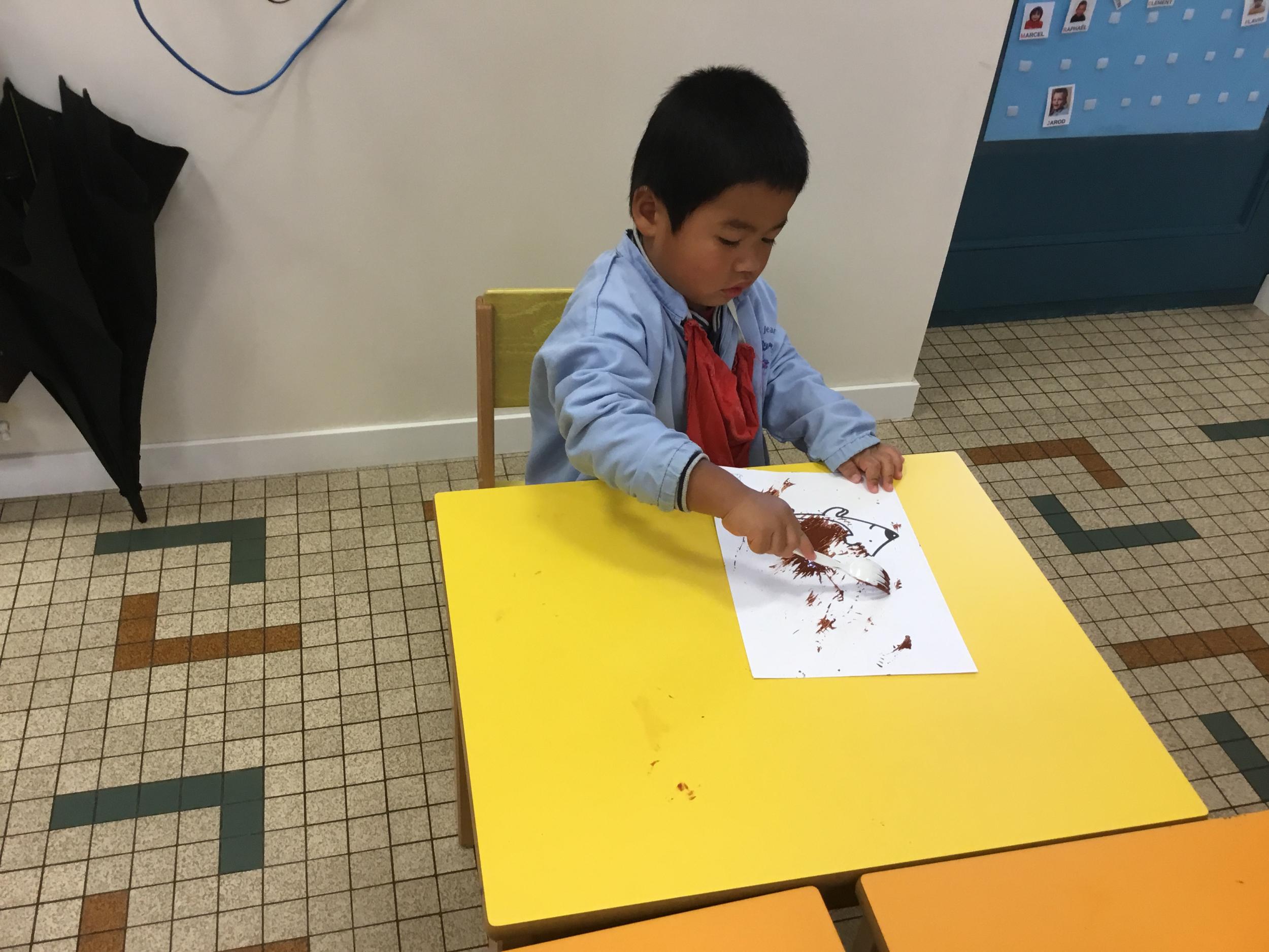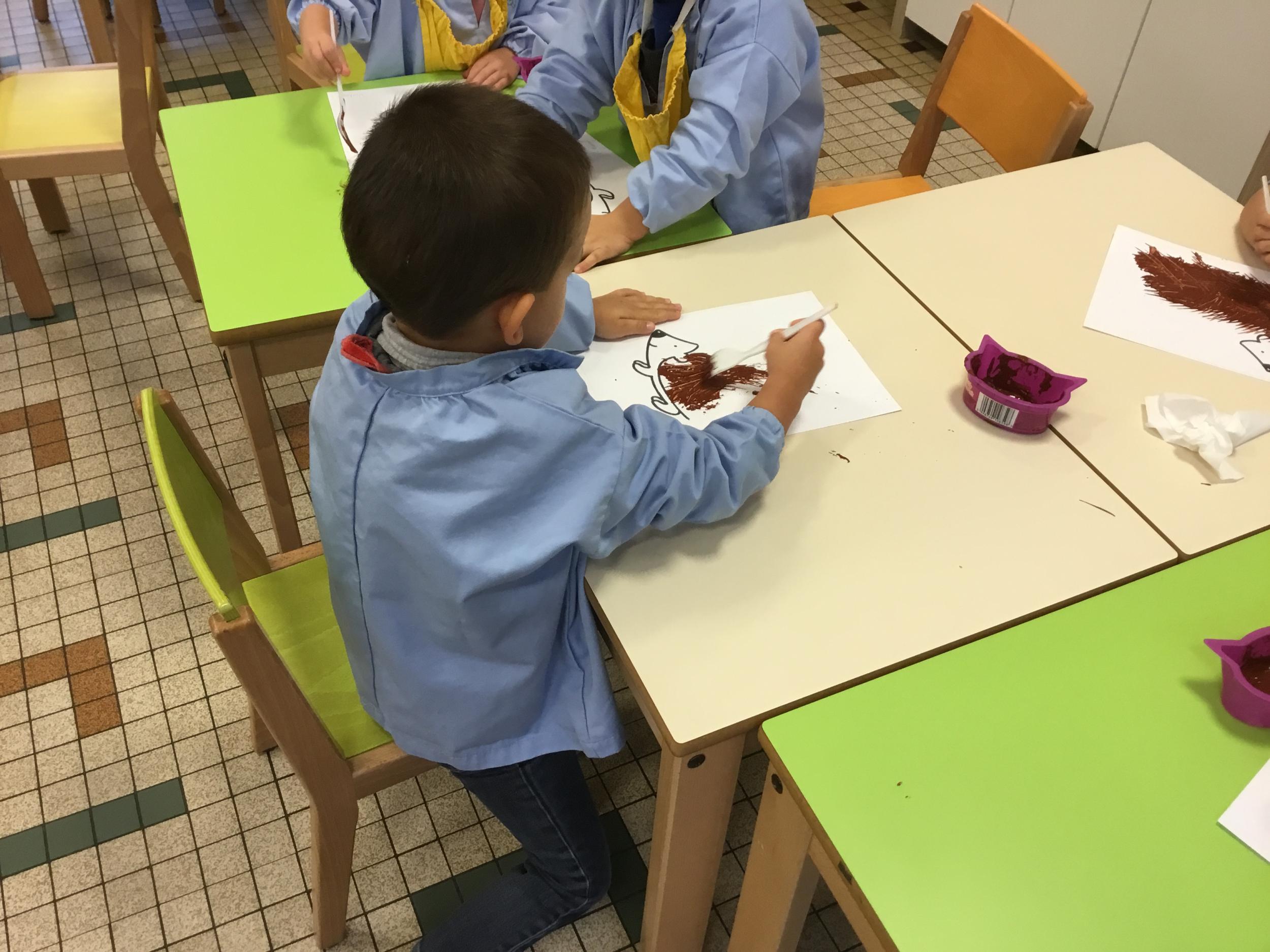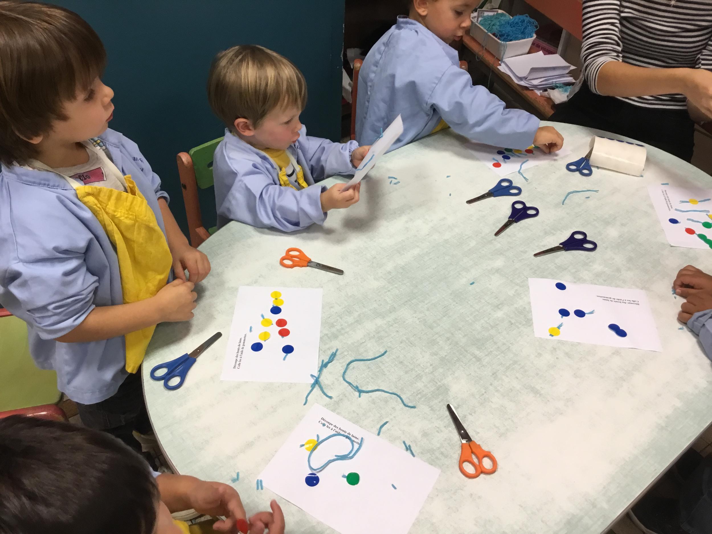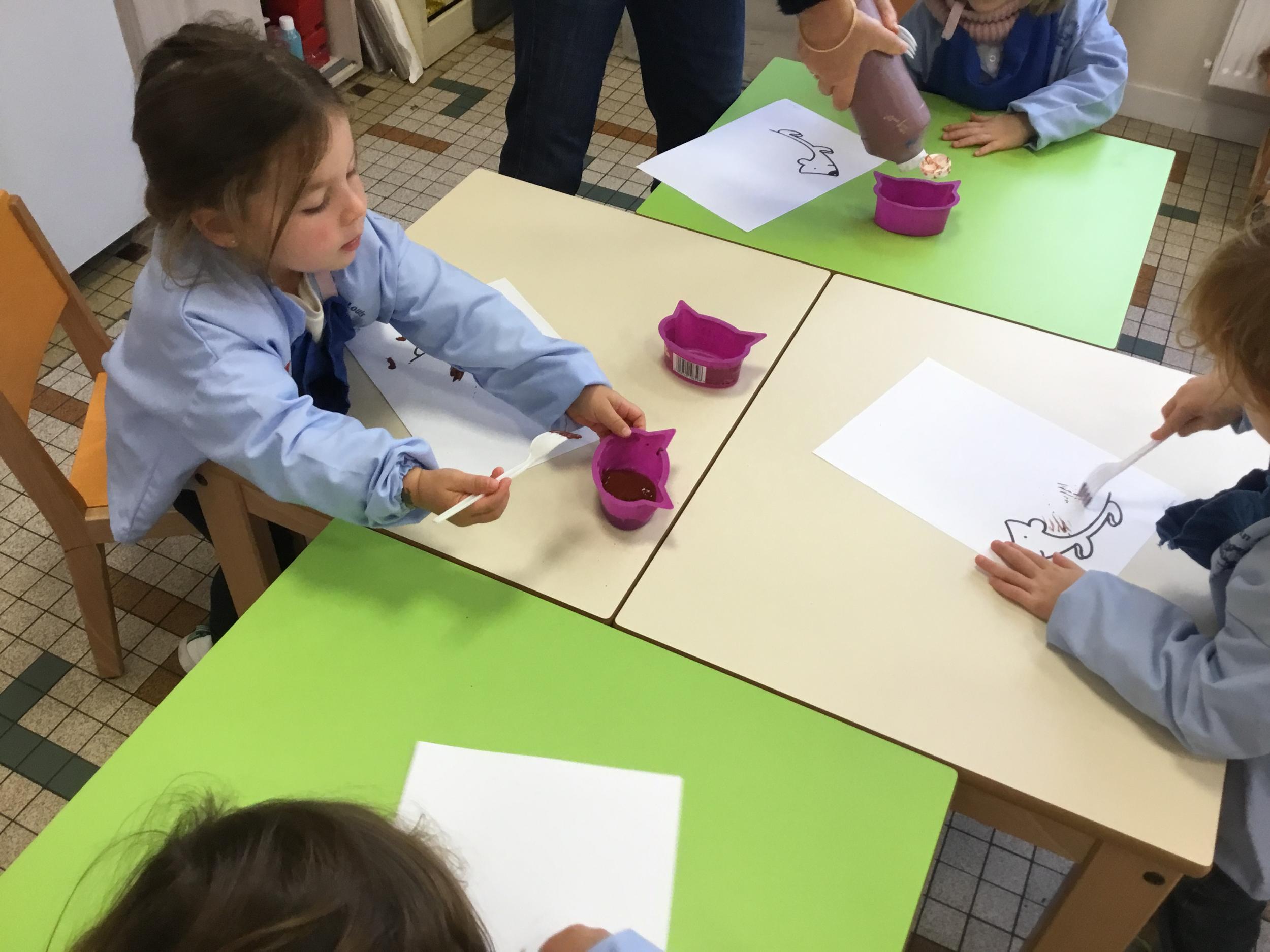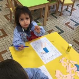 Petite et moyenne section 15/10/2020 Les élèves continuent à laisser des traces à l’aide de différents outils: la fourchette et le coton tige Le bonhomme du mois d’octobre Découper des bouts de laine. Les consignes sont données en anglais Écouter une histoire et la raconter à l’aide de marionnettes Atelier en autonomie: colorier la fiche du mois d’octobre pour le cahier de vie