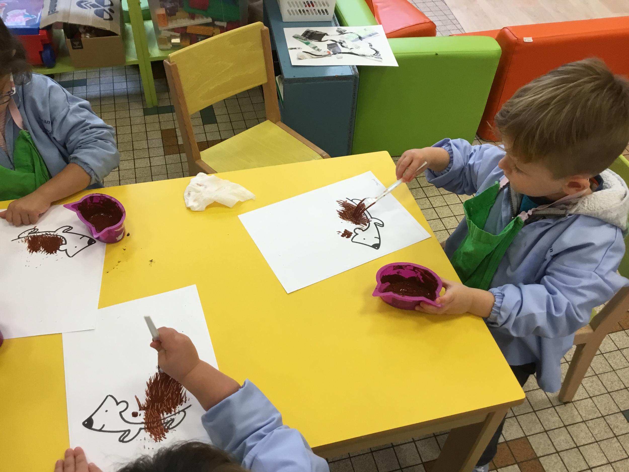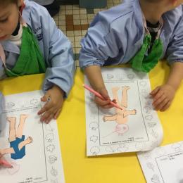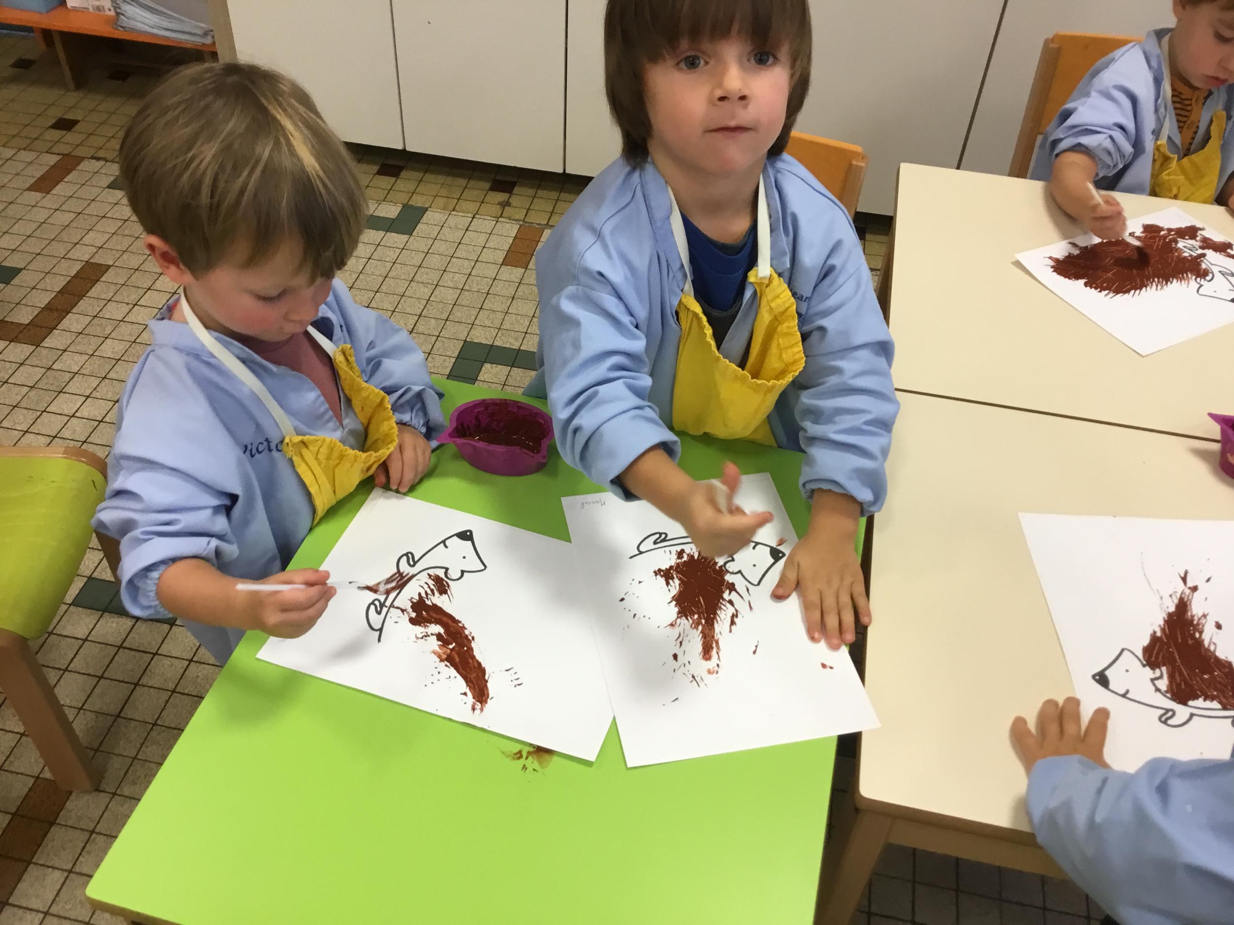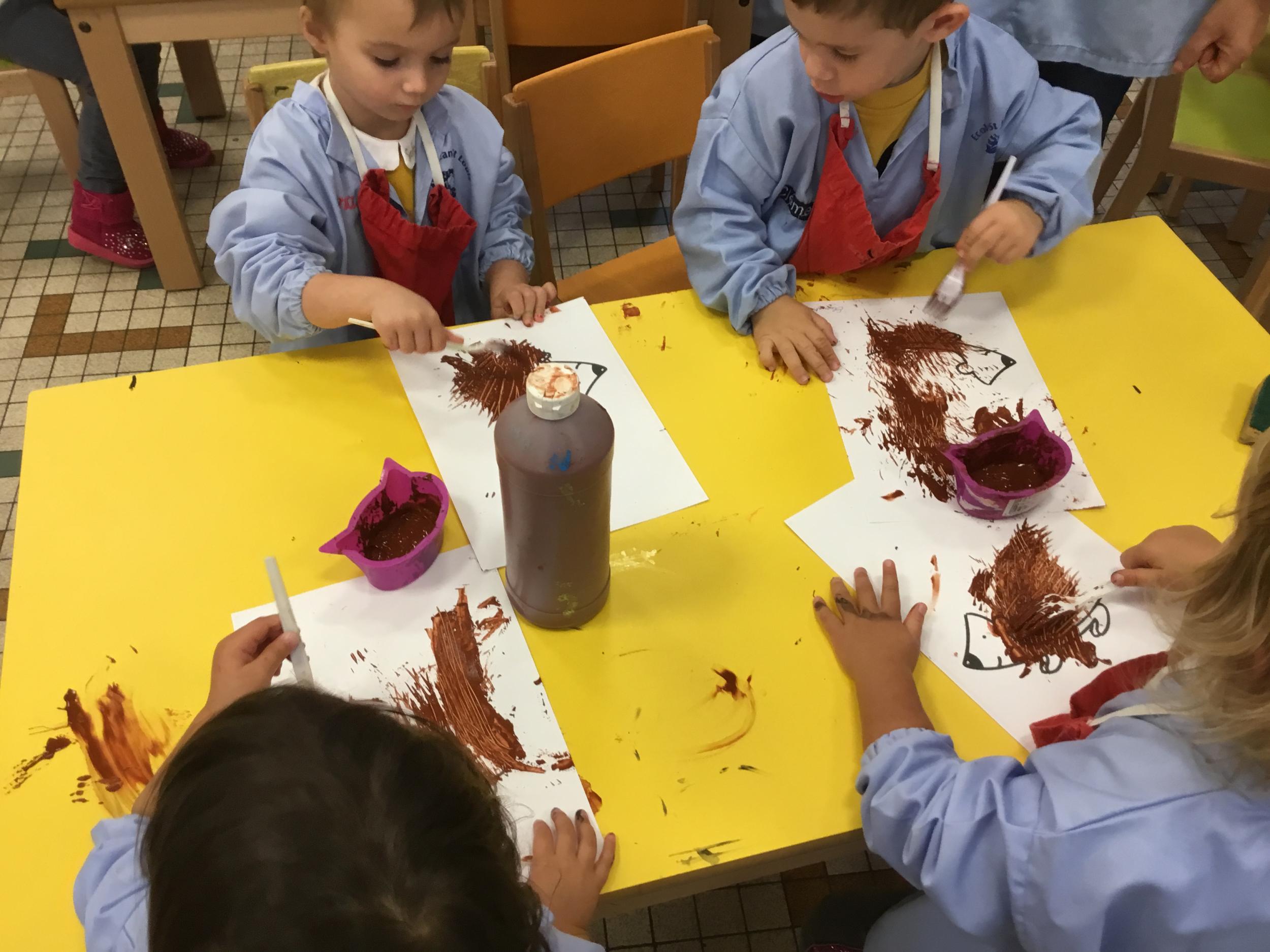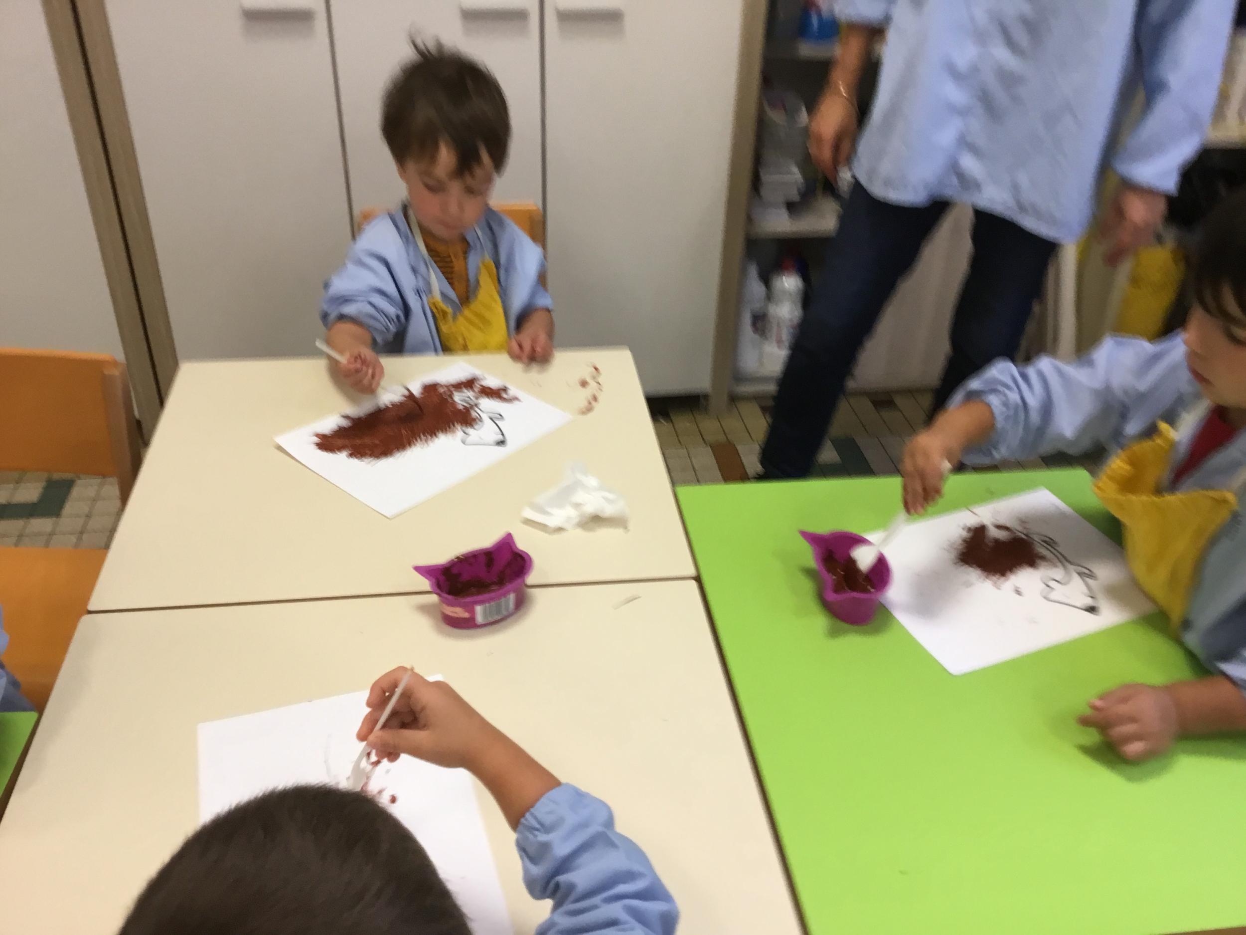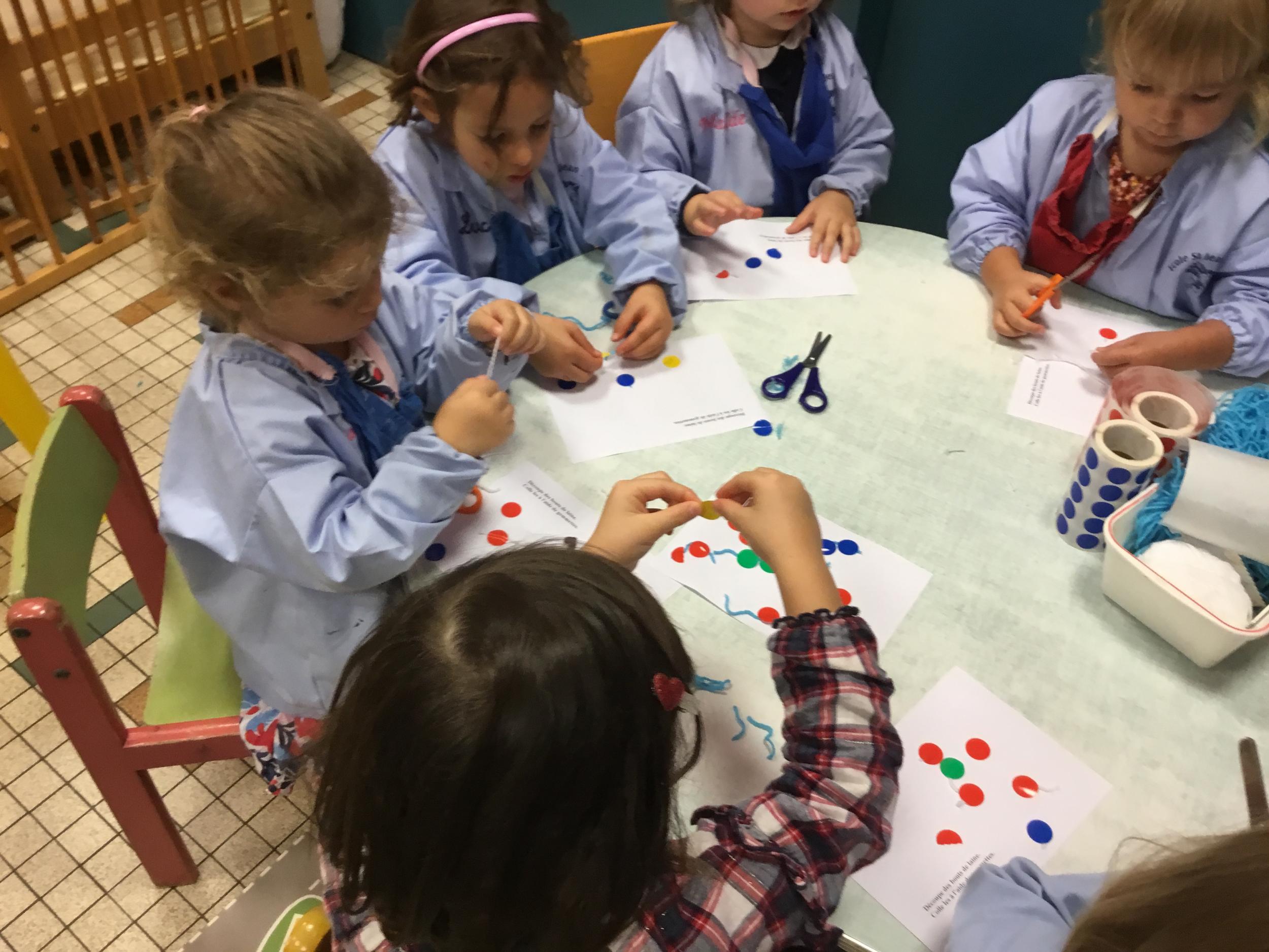 Petite et moyenne section 15/10/2020 Les élèves continuent à laisser des traces à l’aide de différents outils: la fourchette et le coton tige Le bonhomme du mois d’octobre Découper des bouts de laine. Les consignes sont données en anglais Écouter une histoire et la raconter à l’aide de marionnettes Atelier en autonomie: colorier la fiche du mois d’octobre pour le cahier de vie