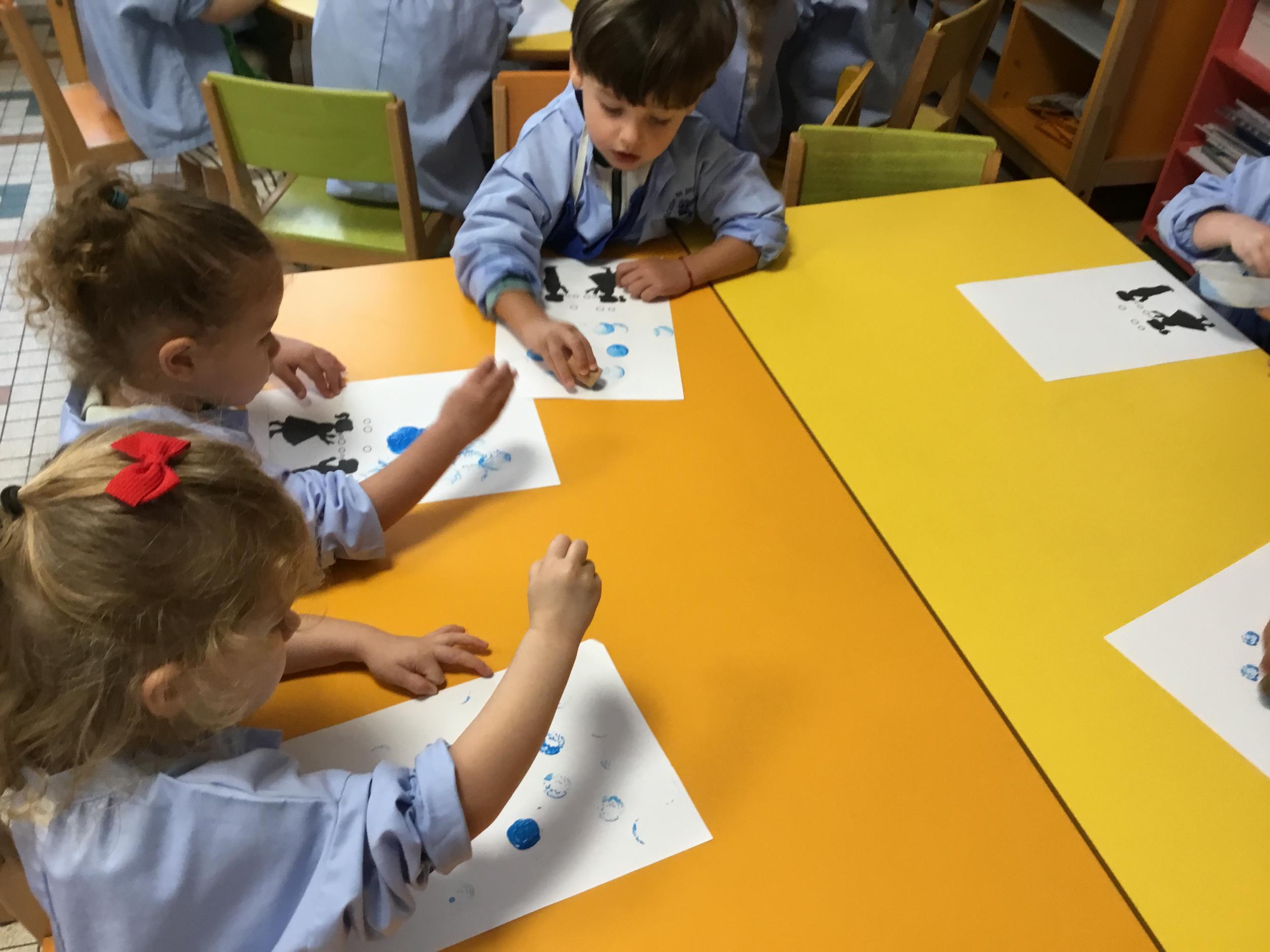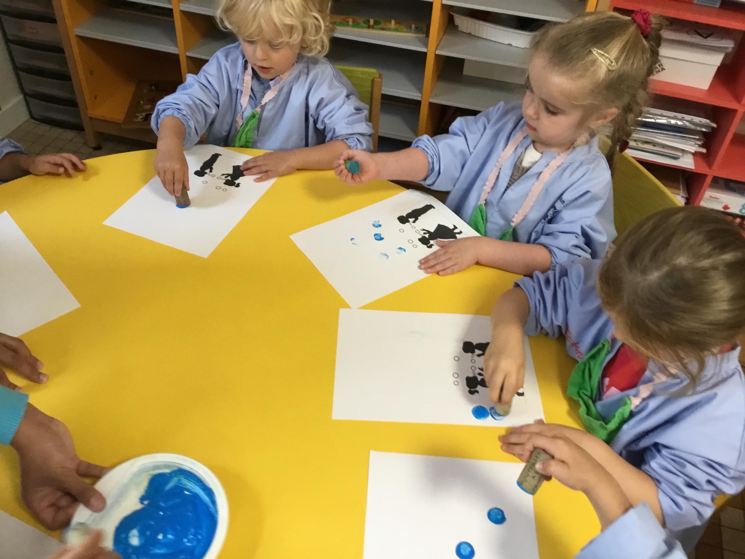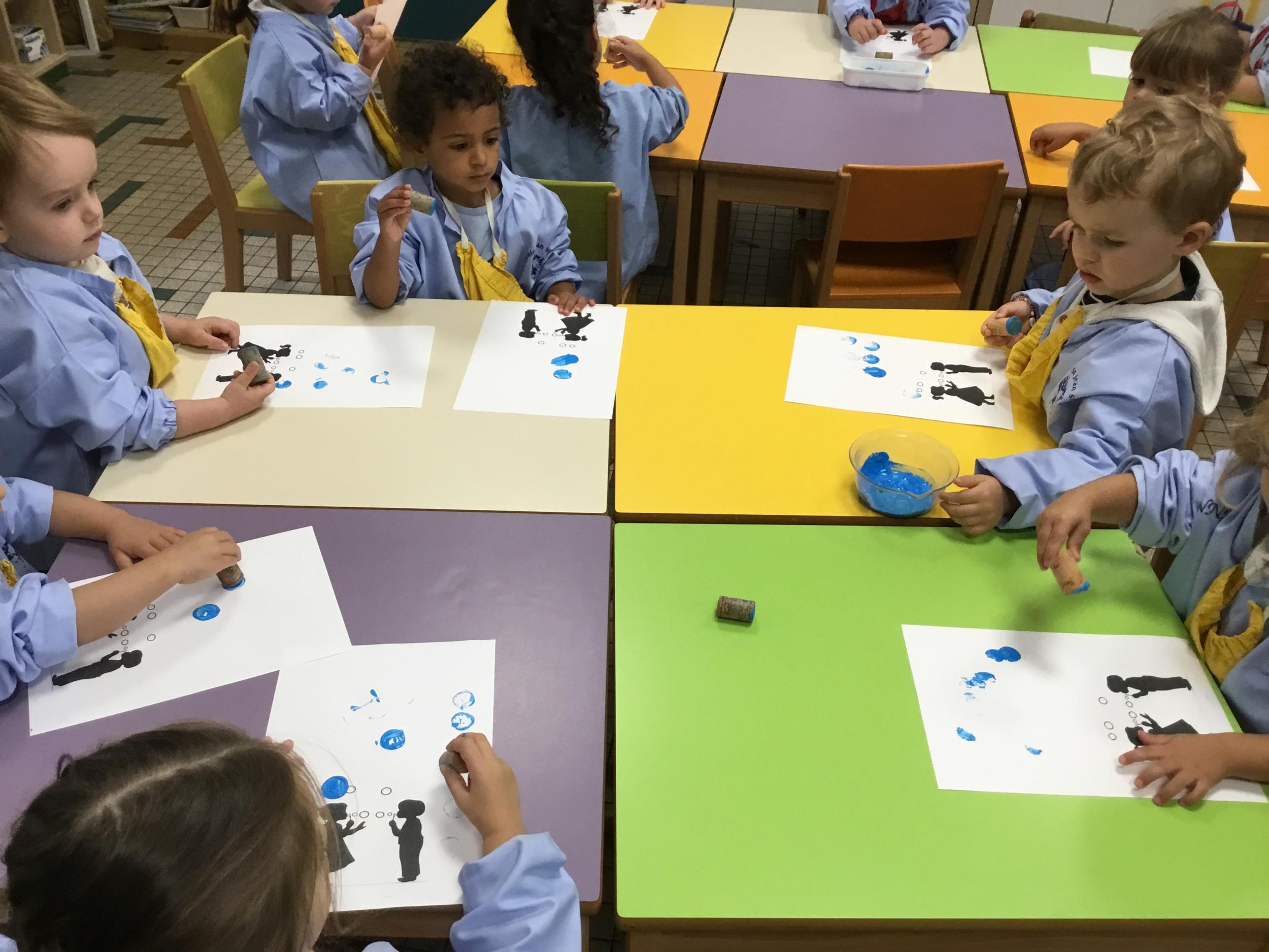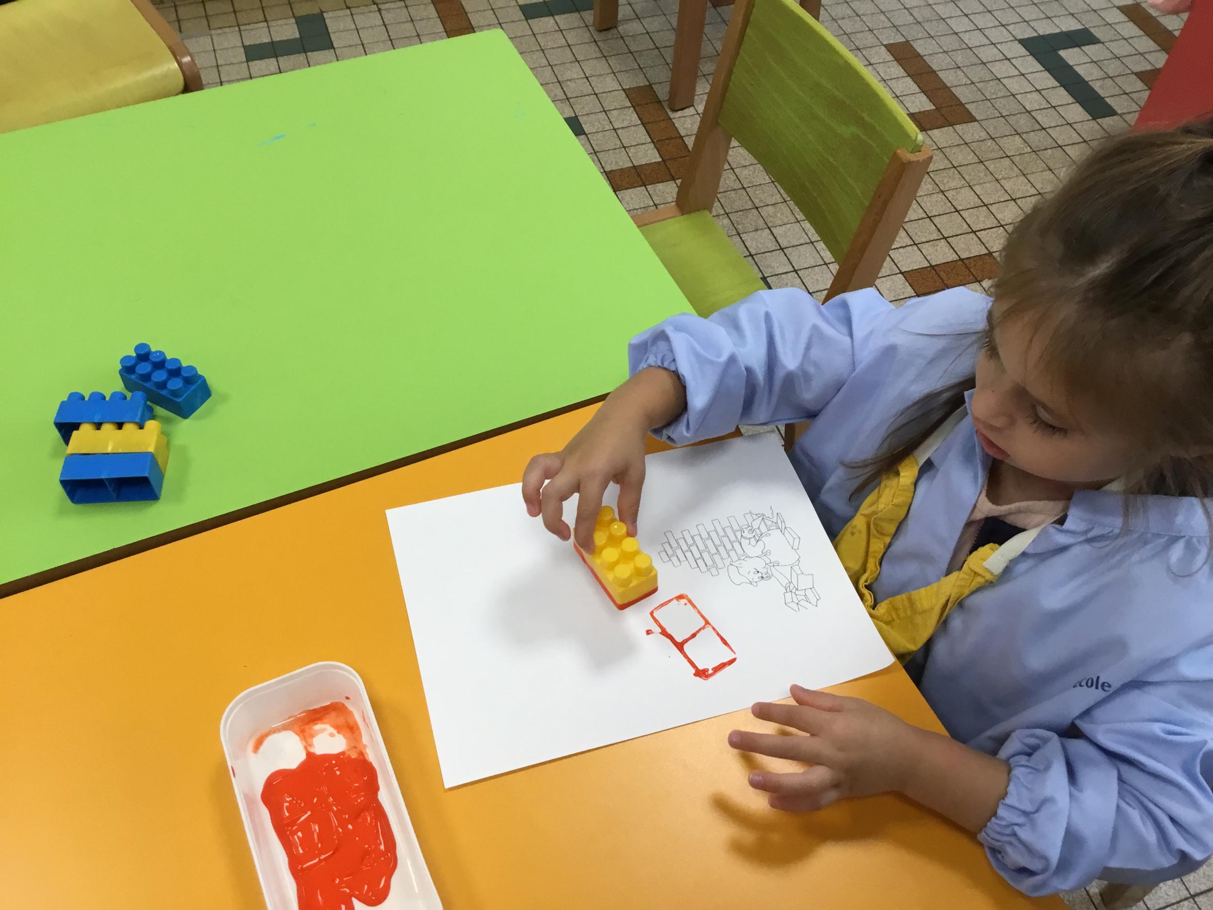 Cette période les élèves expérimentent des différents outils pour laisser des traces. Il faut s’approprier l’espace de la feuille et maîtriser son geste: poser et lever l’outil pour le reposer à un autre endroit de la feuille. Ils ont utilisé des légos et des bouchons, d’autres outils sont à venir.