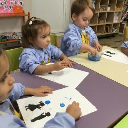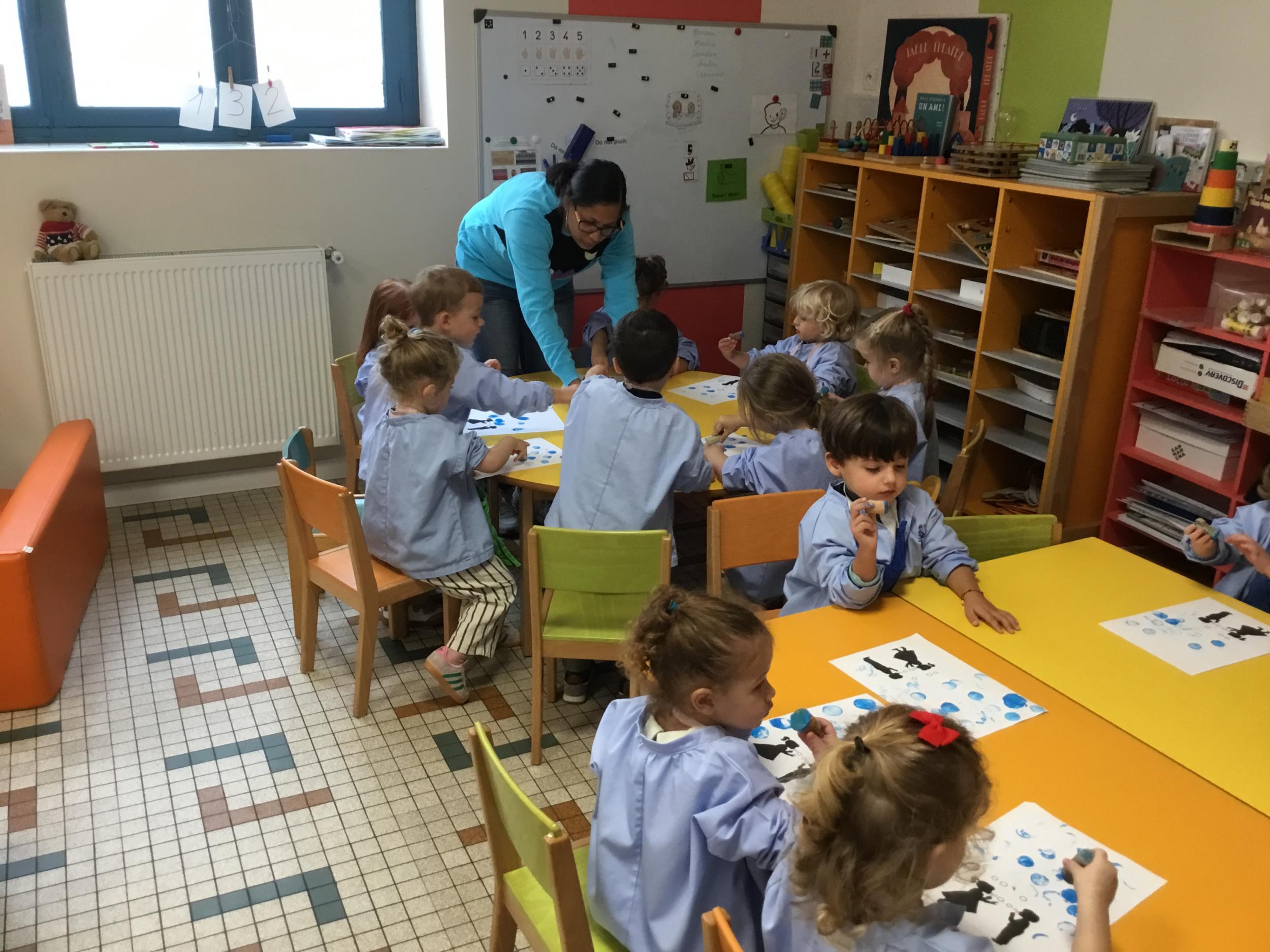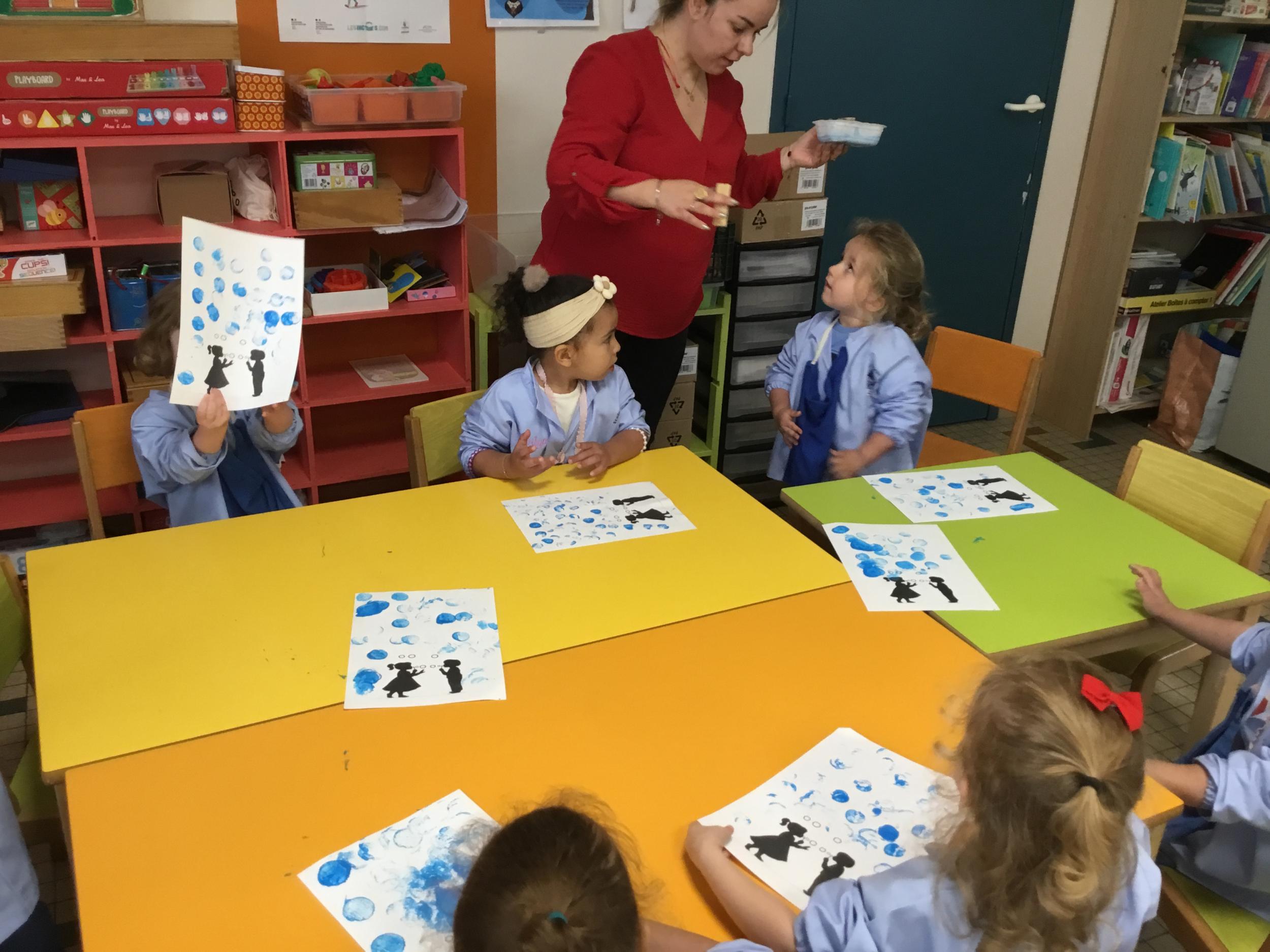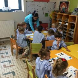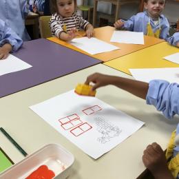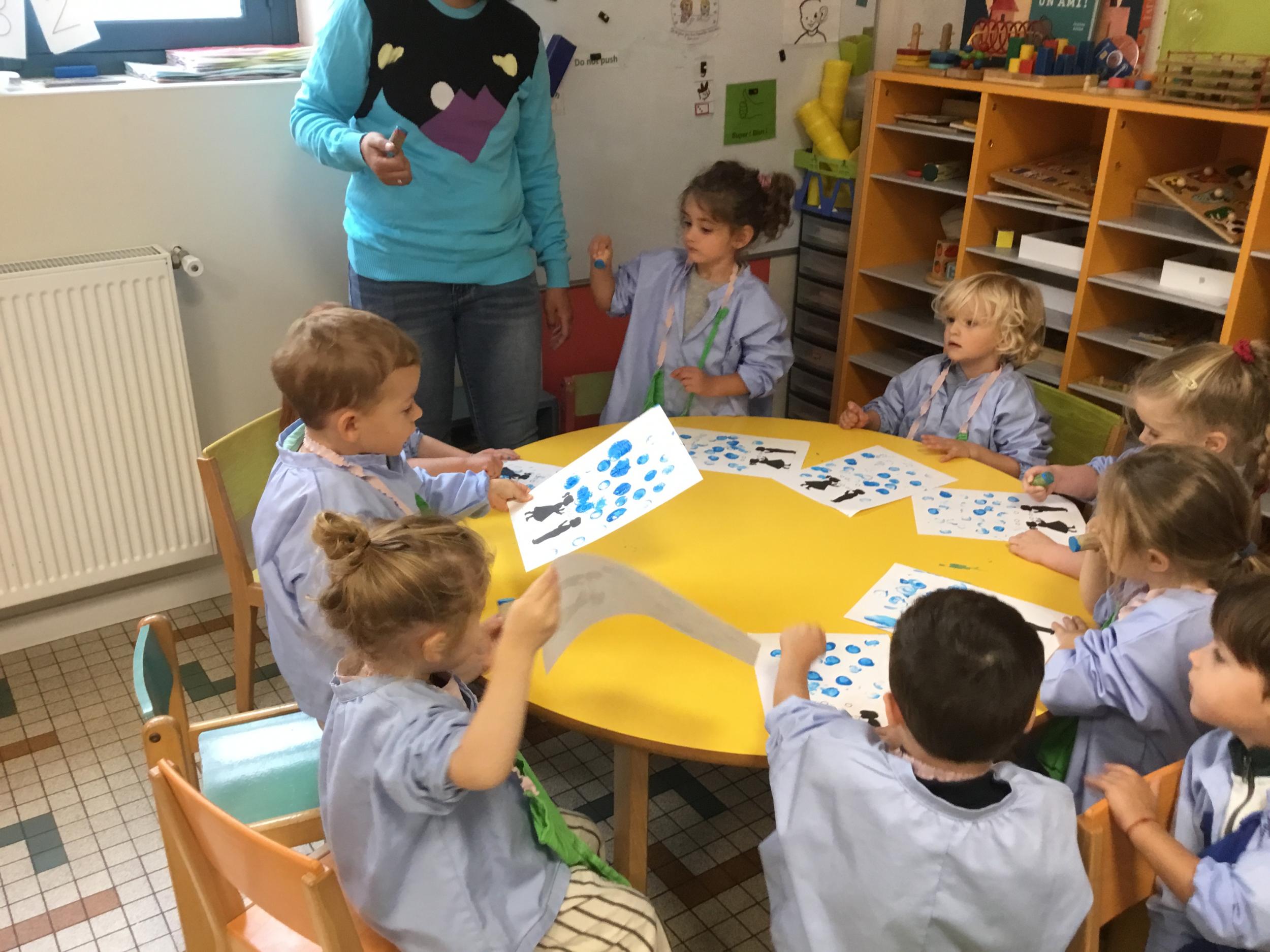 Cette période les élèves expérimentent des différents outils pour laisser des traces. Il faut s’approprier l’espace de la feuille et maîtriser son geste: poser et lever l’outil pour le reposer à un autre endroit de la feuille. Ils ont utilisé des légos et des bouchons, d’autres outils sont à venir.