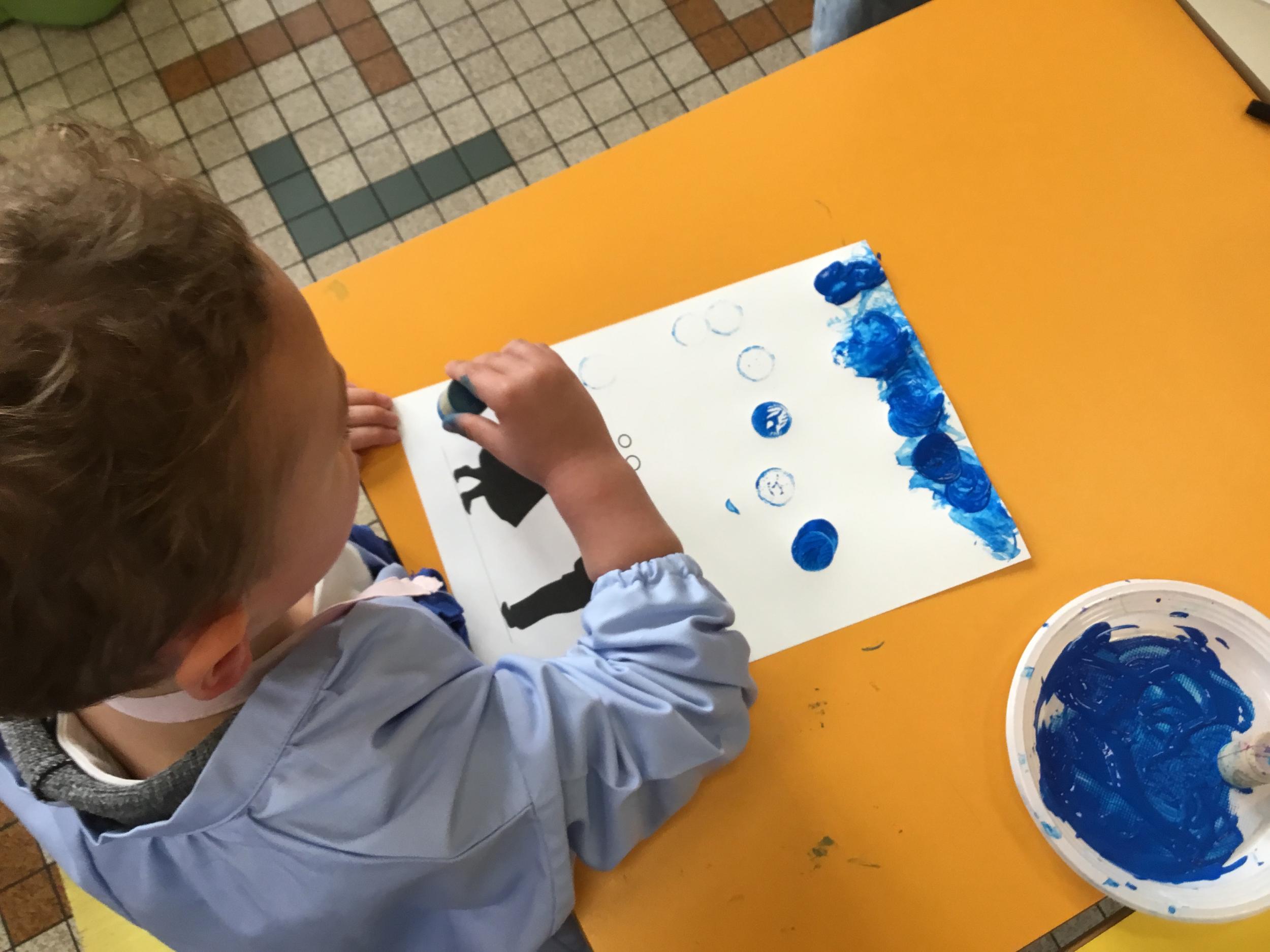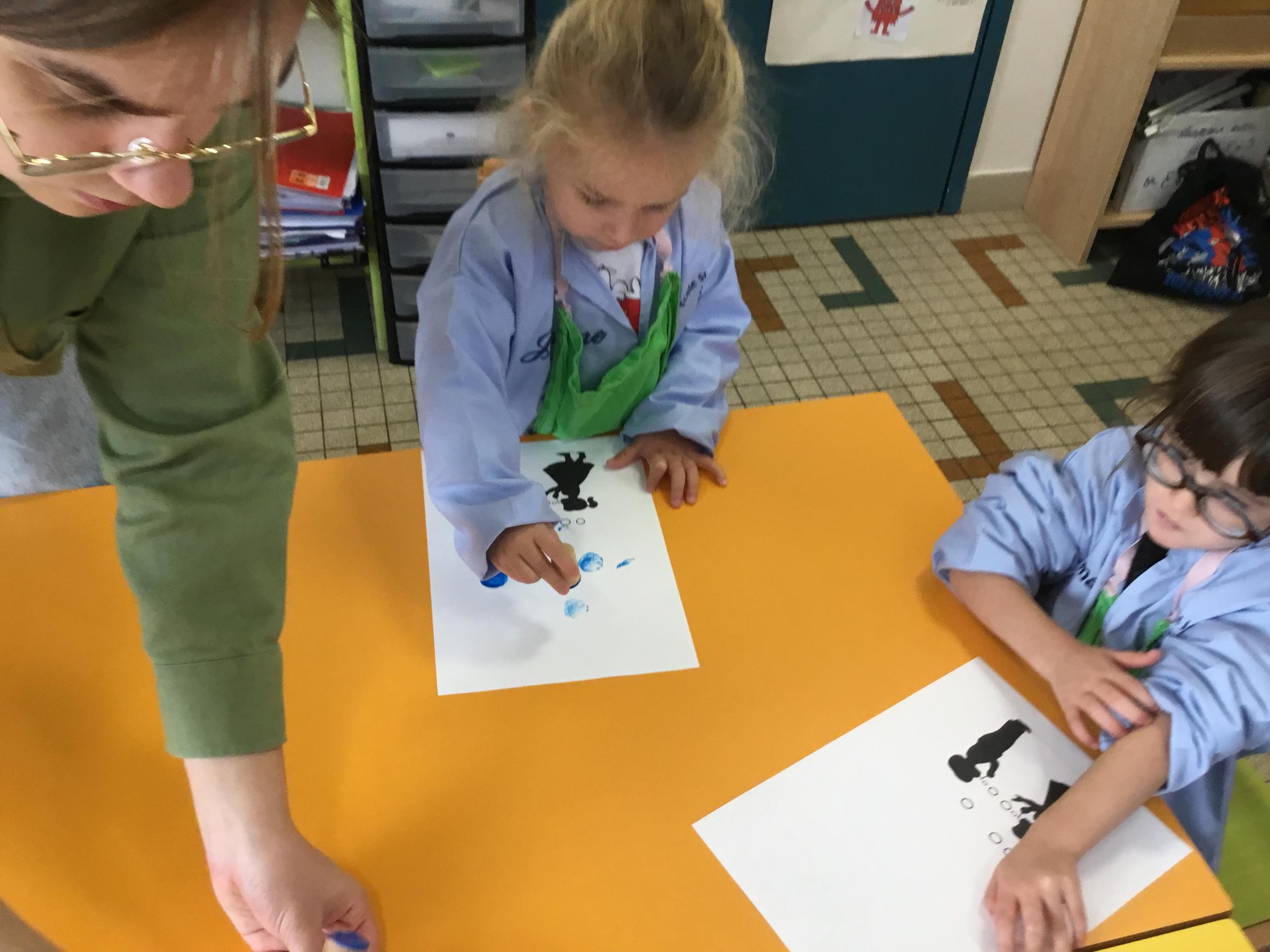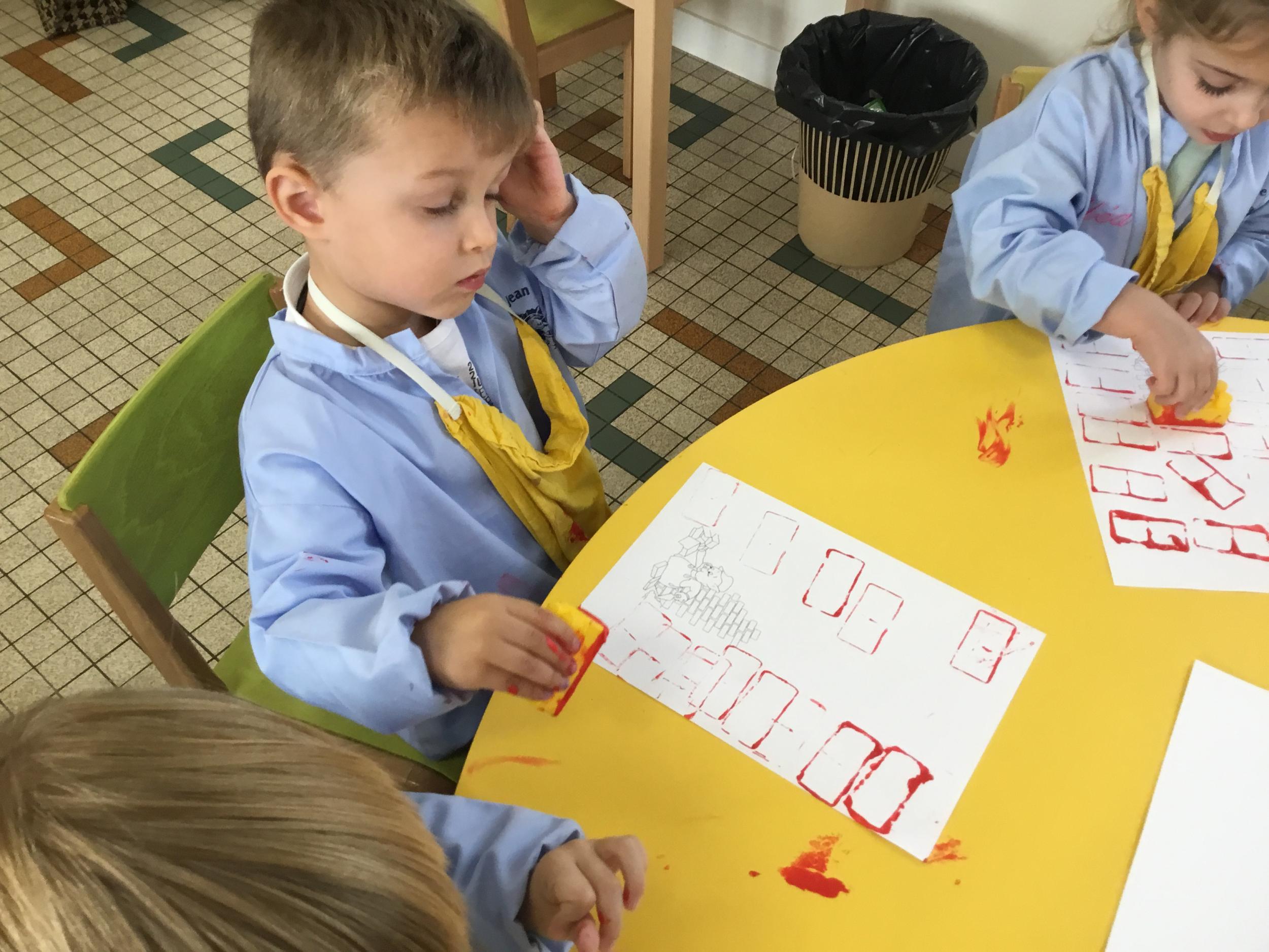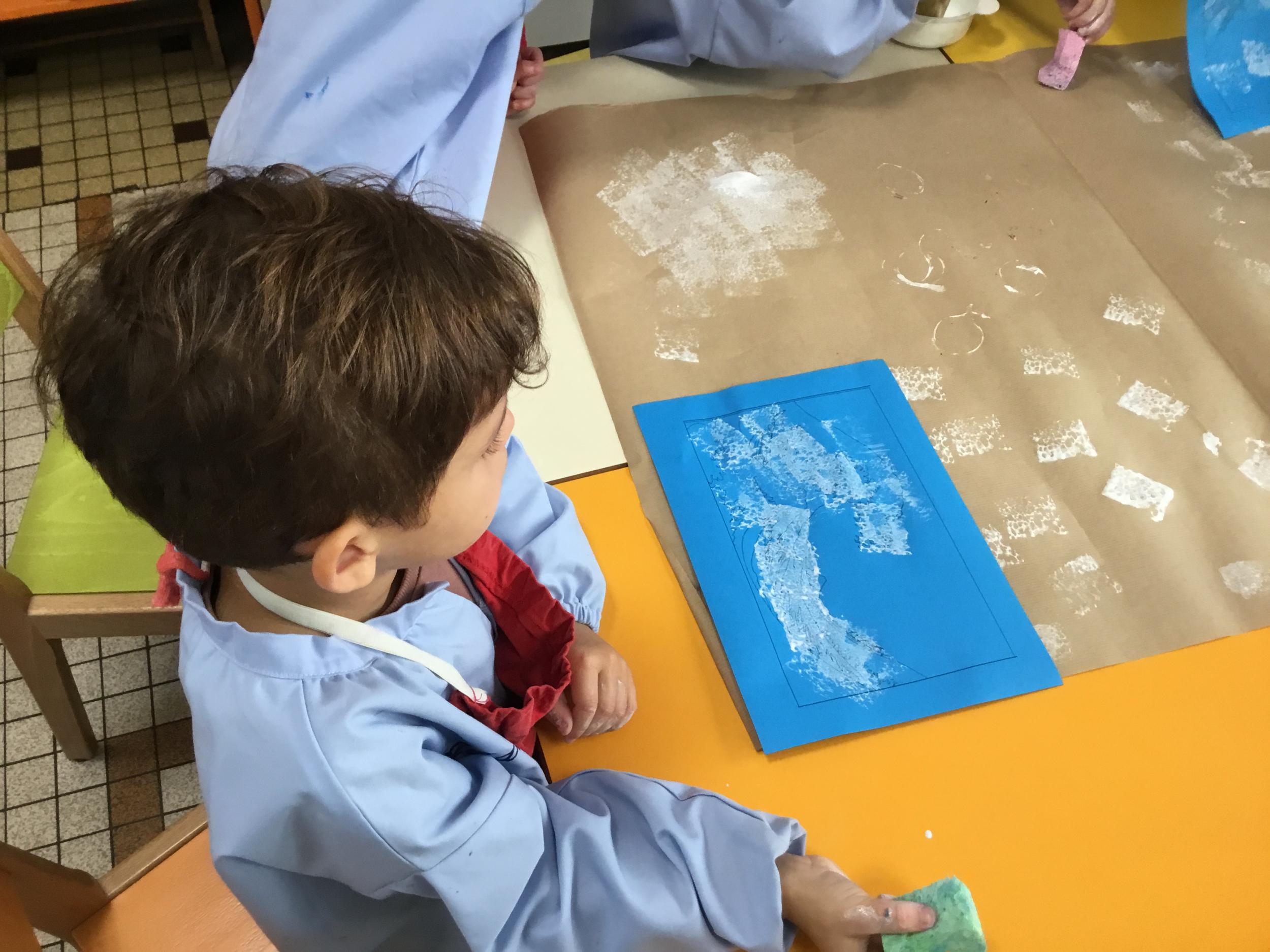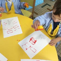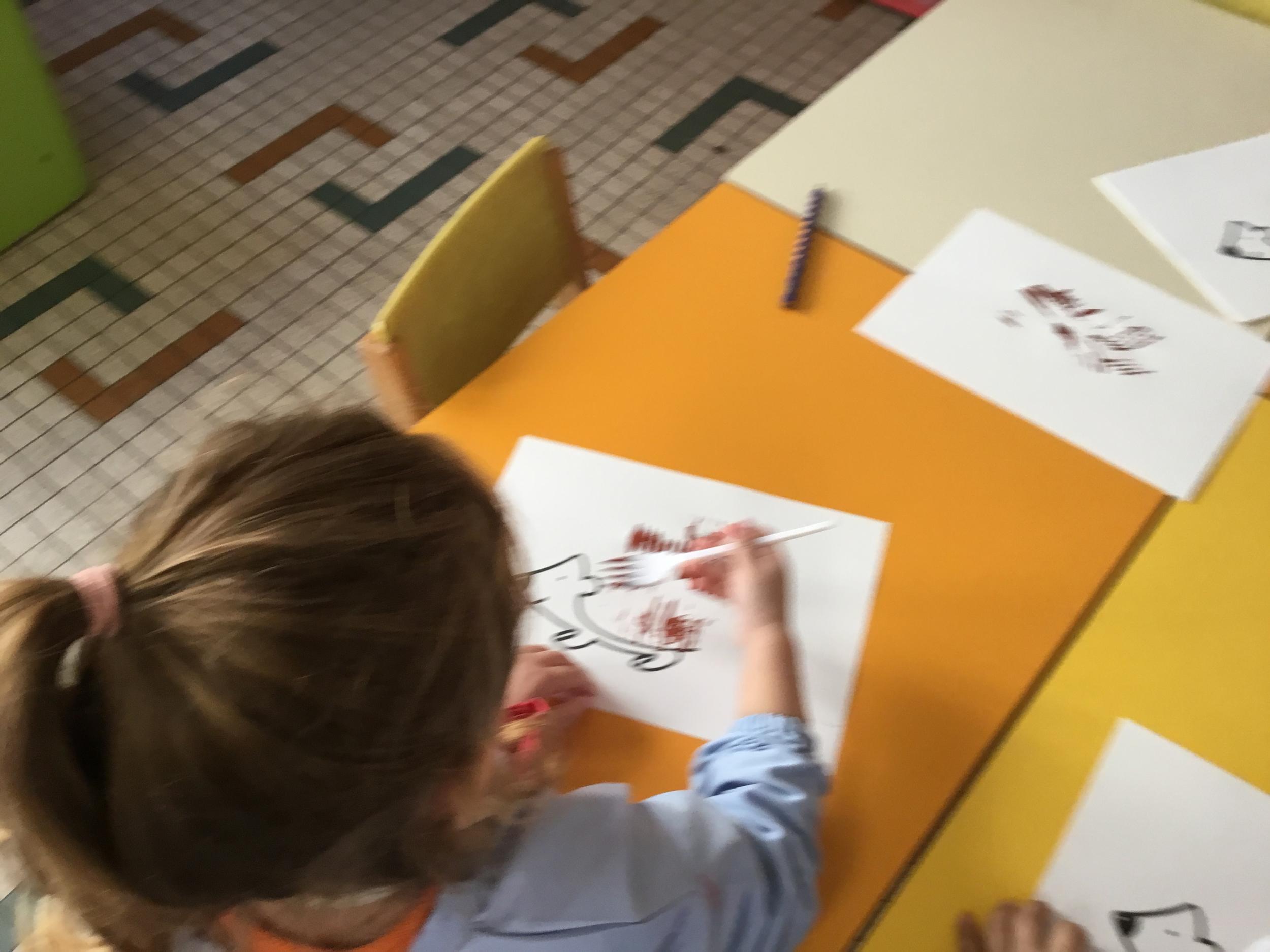 Les élèves ont travaillé en arts visuels autour de l’empreinte. Ils ont laissé des traces avec différents outils: un lego, un bouchon, une éponge, une fourchette.