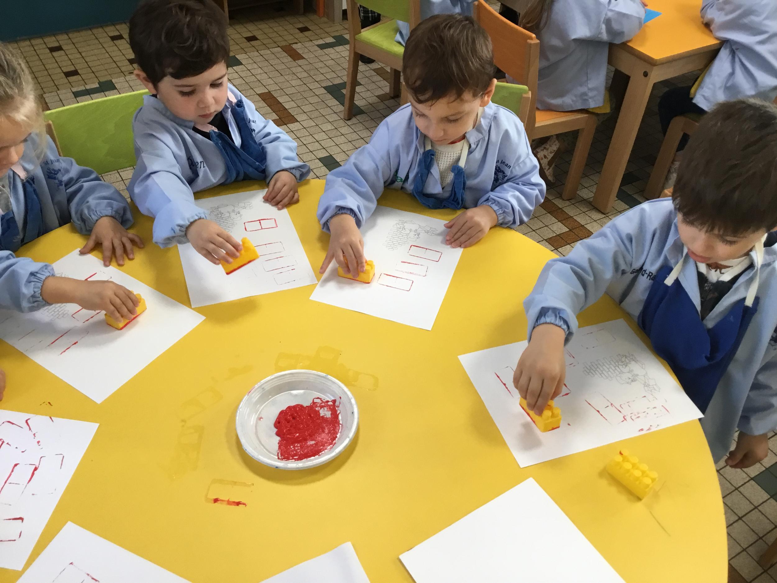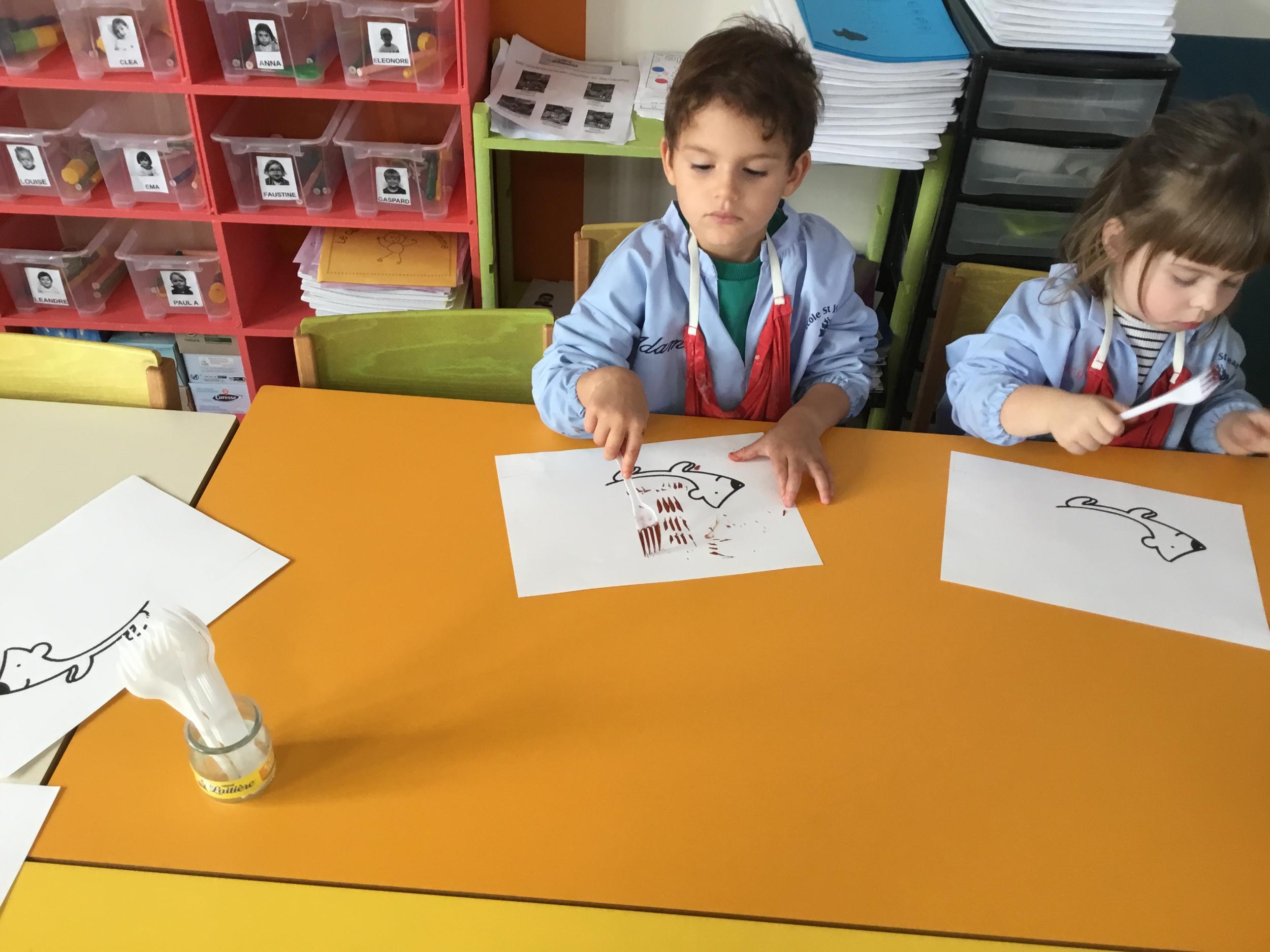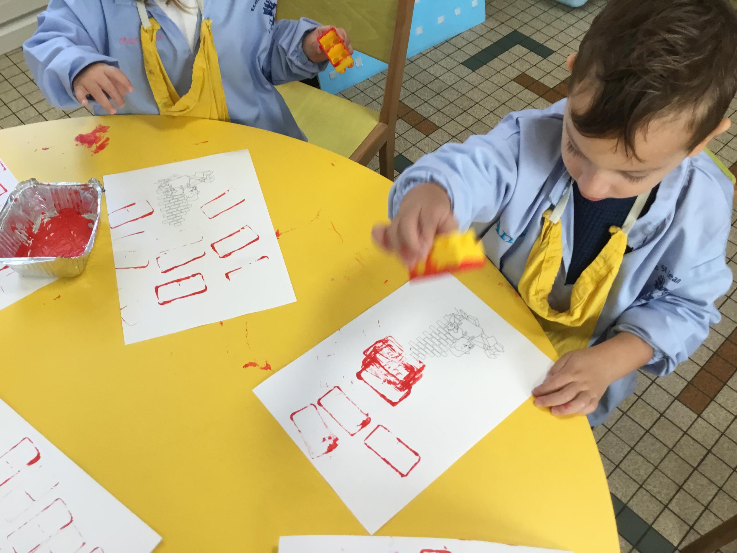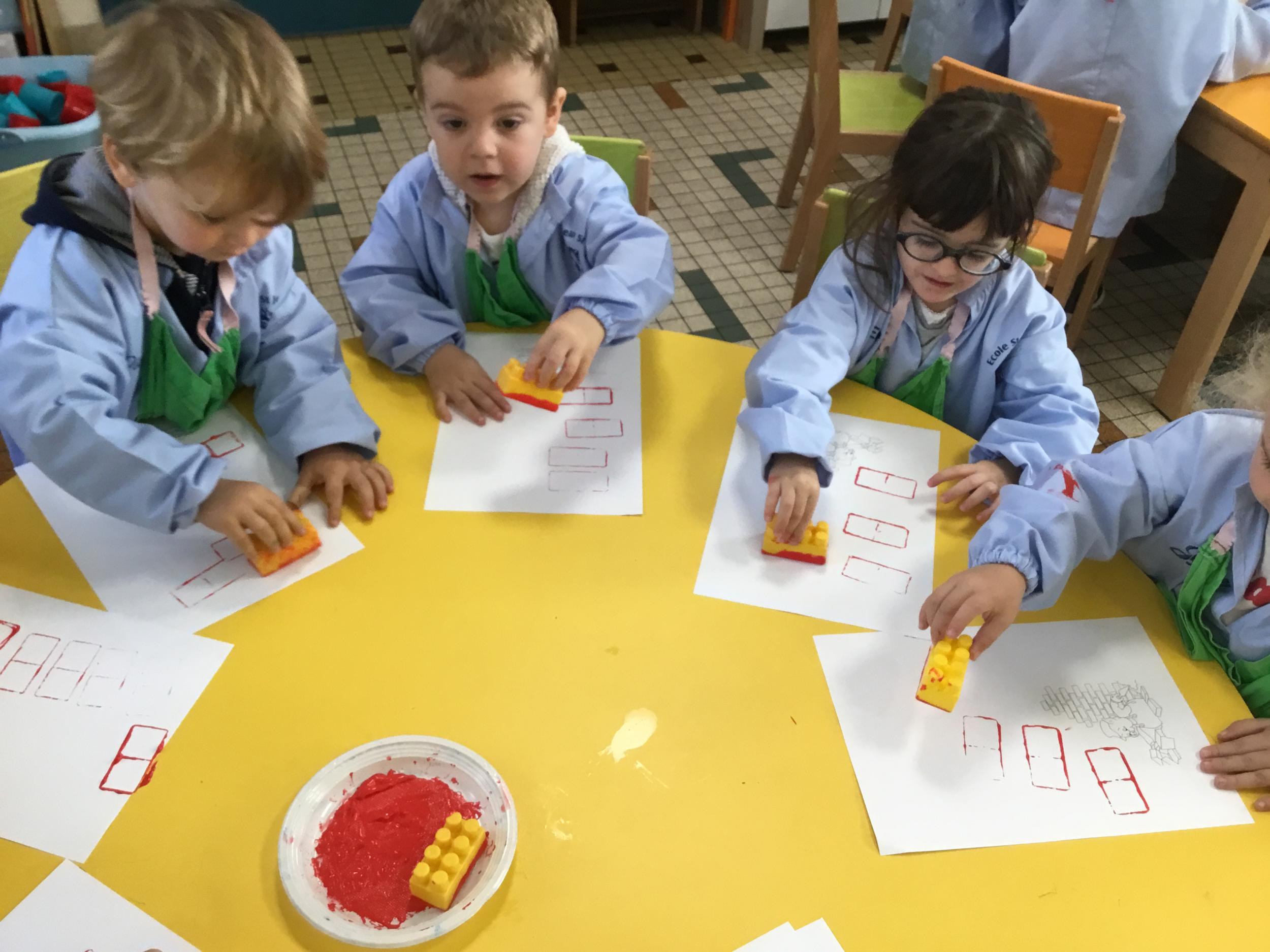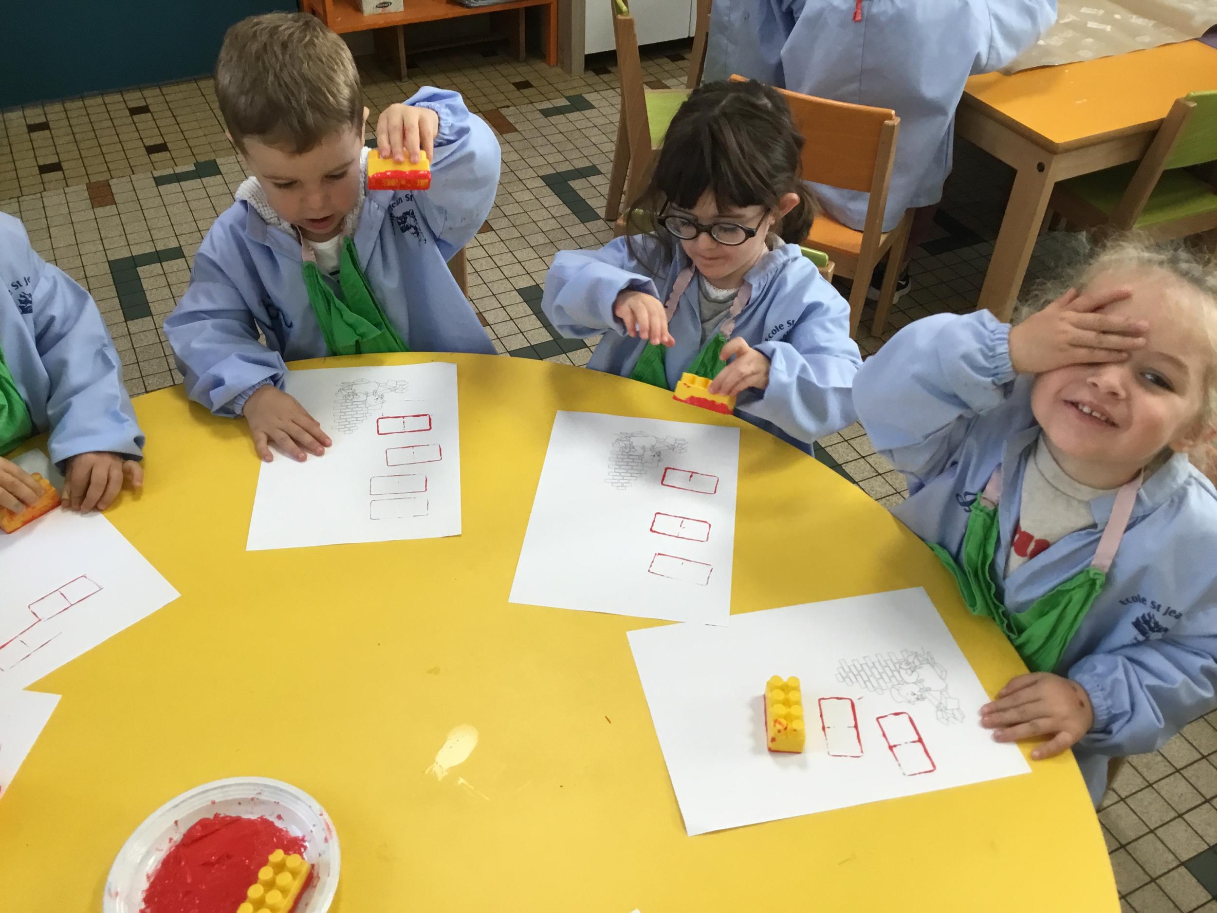 Les élèves ont travaillé en arts visuels autour de l’empreinte. Ils ont laissé des traces avec différents outils: un lego, un bouchon, une éponge, une fourchette.
