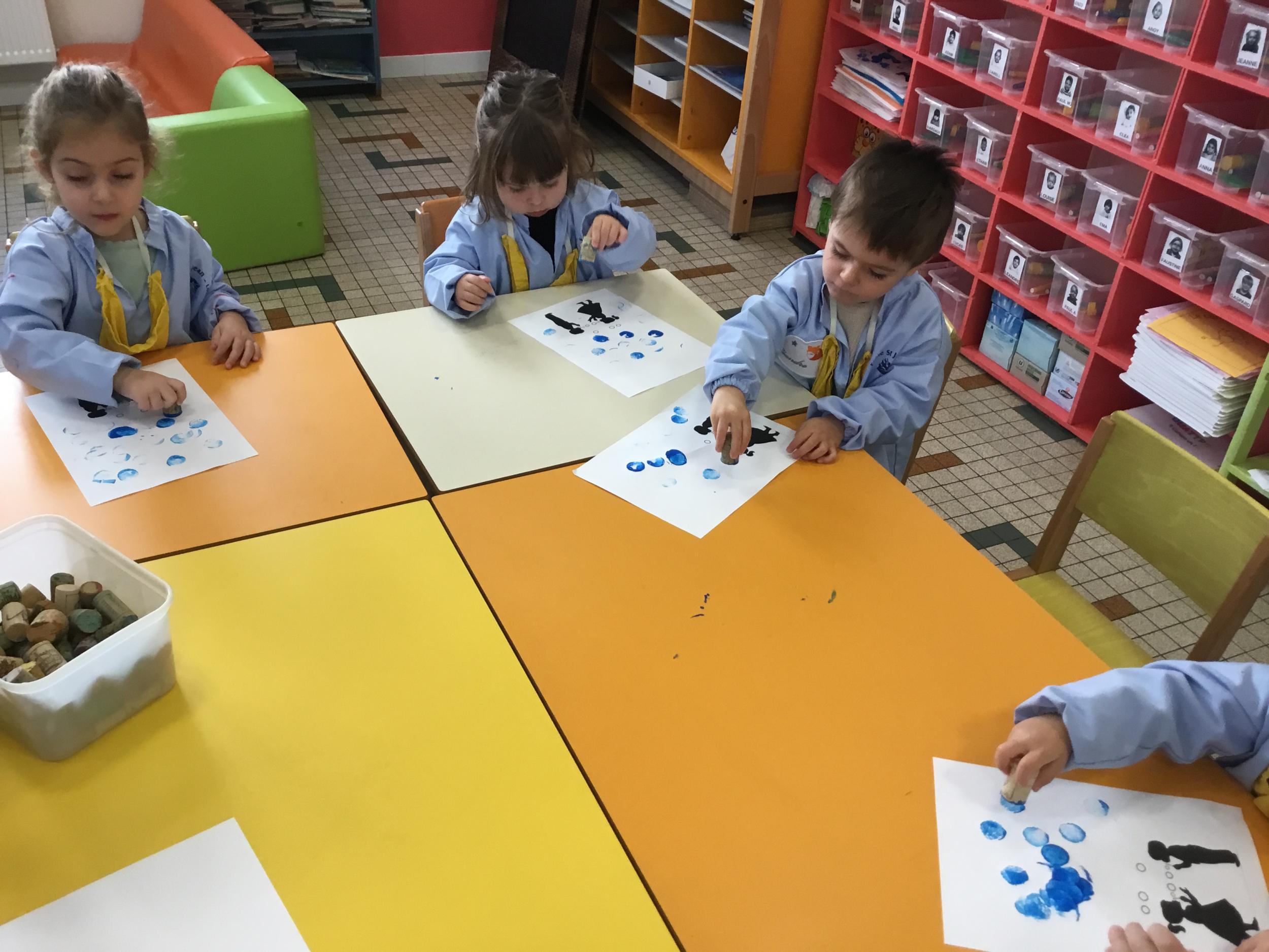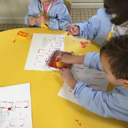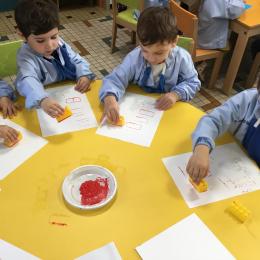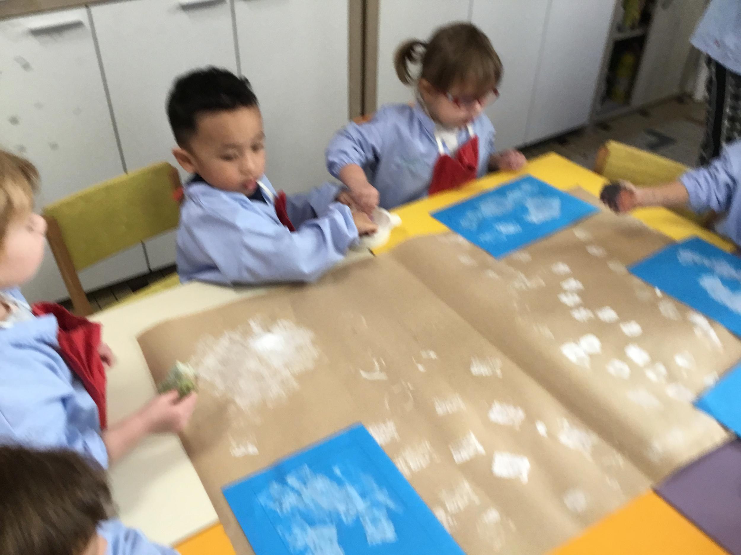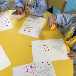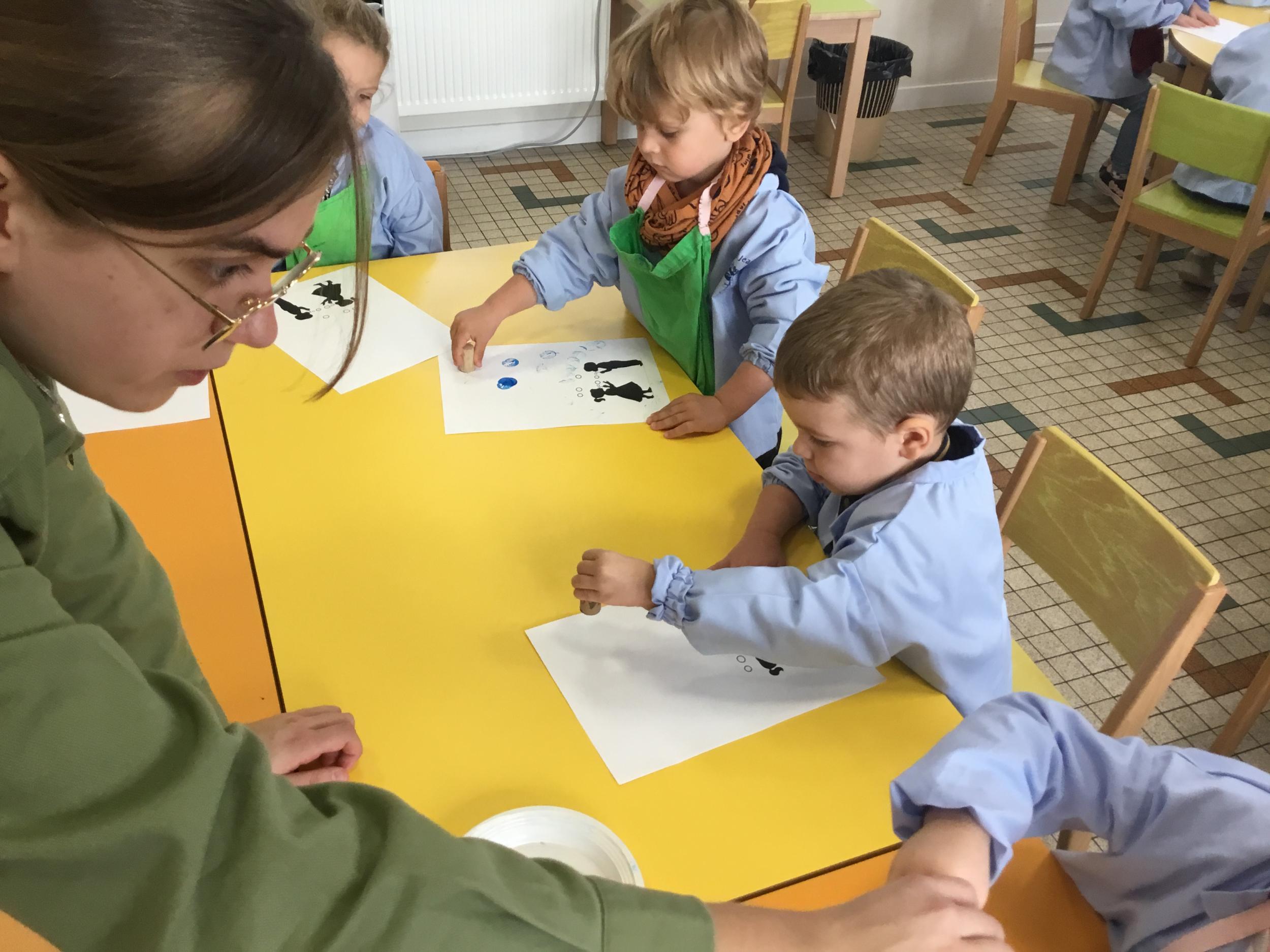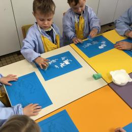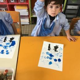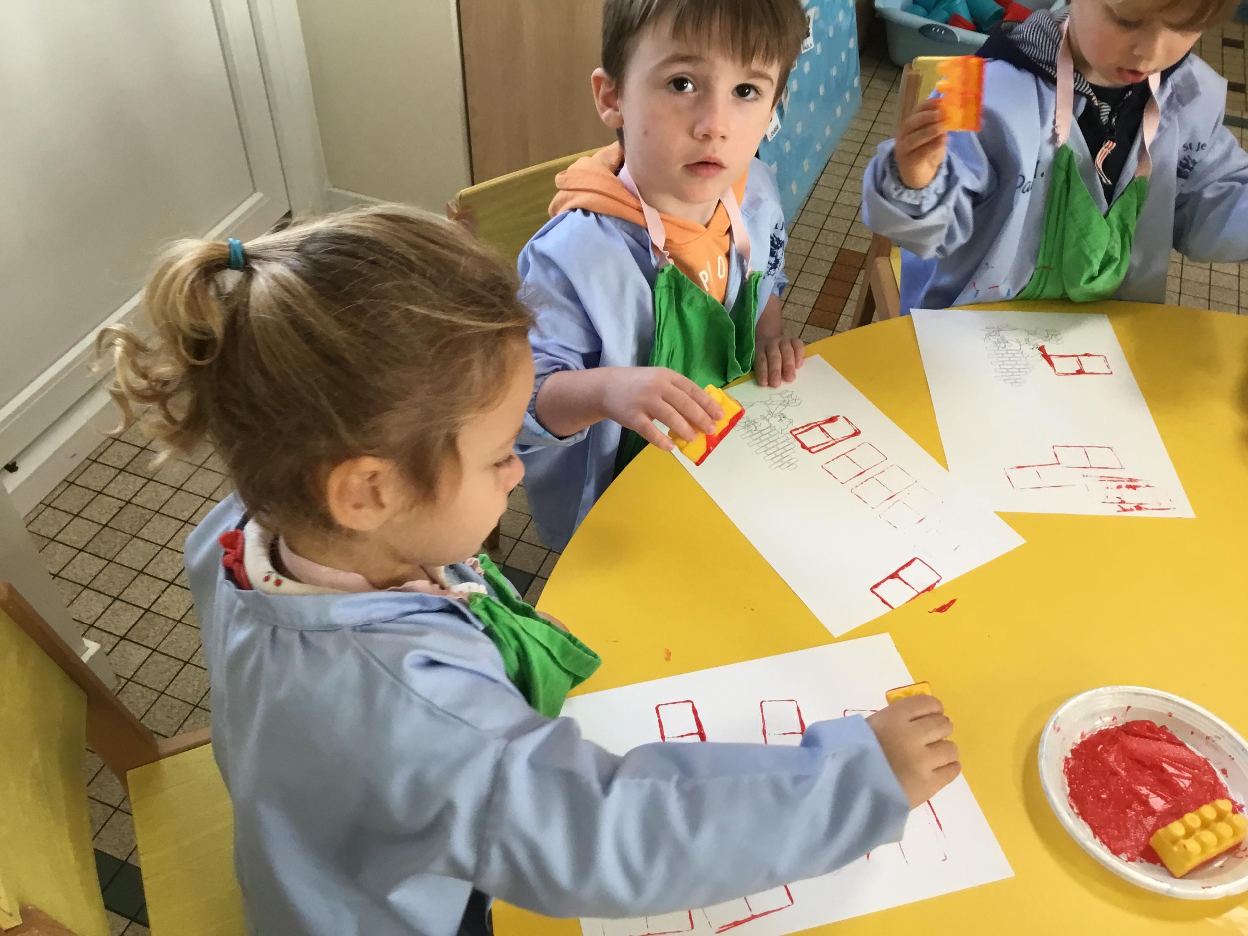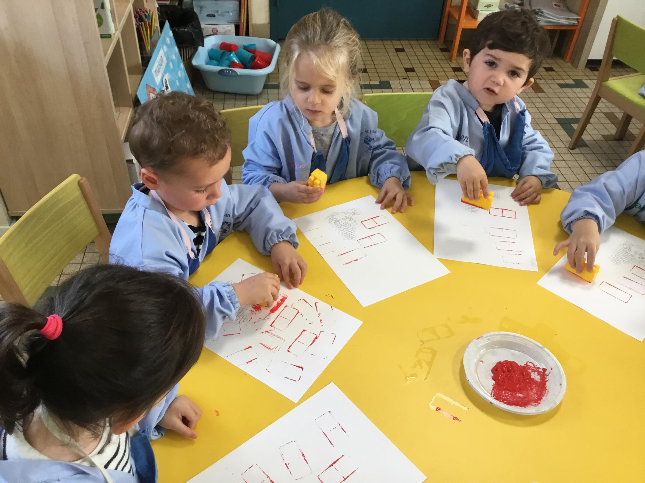 Les élèves ont travaillé en arts visuels autour de l’empreinte. Ils ont laissé des traces avec différents outils: un lego, un bouchon, une éponge, une fourchette.