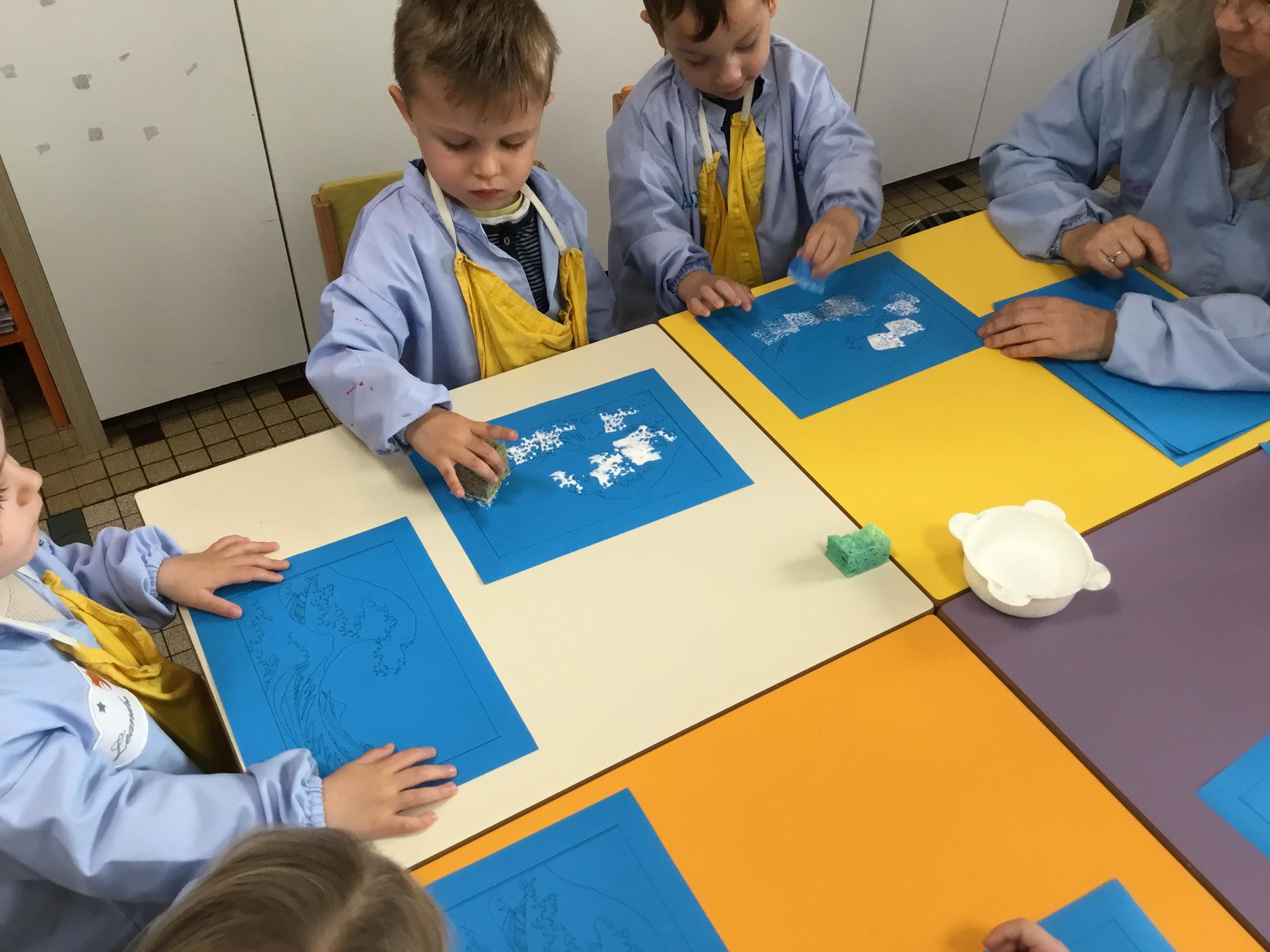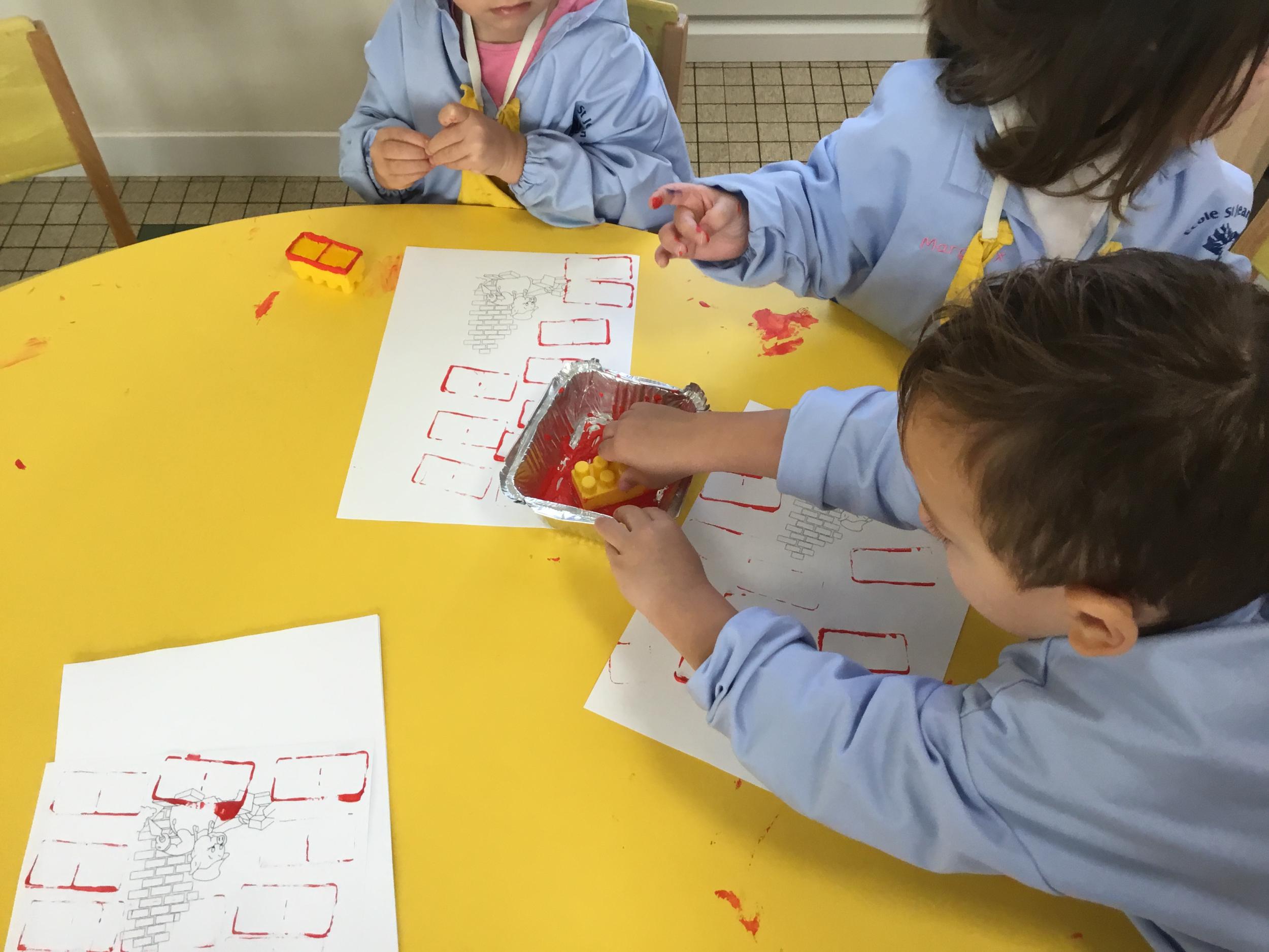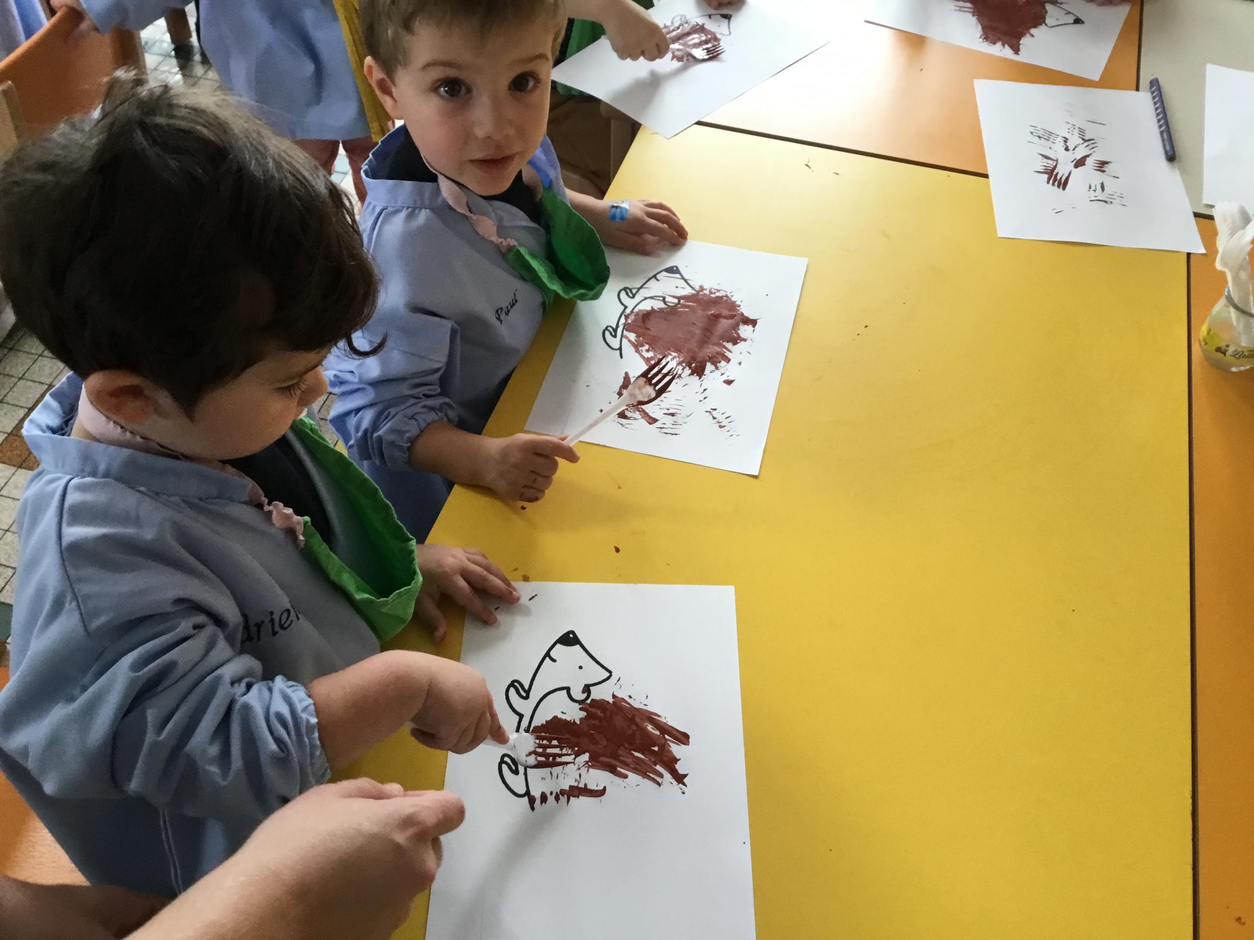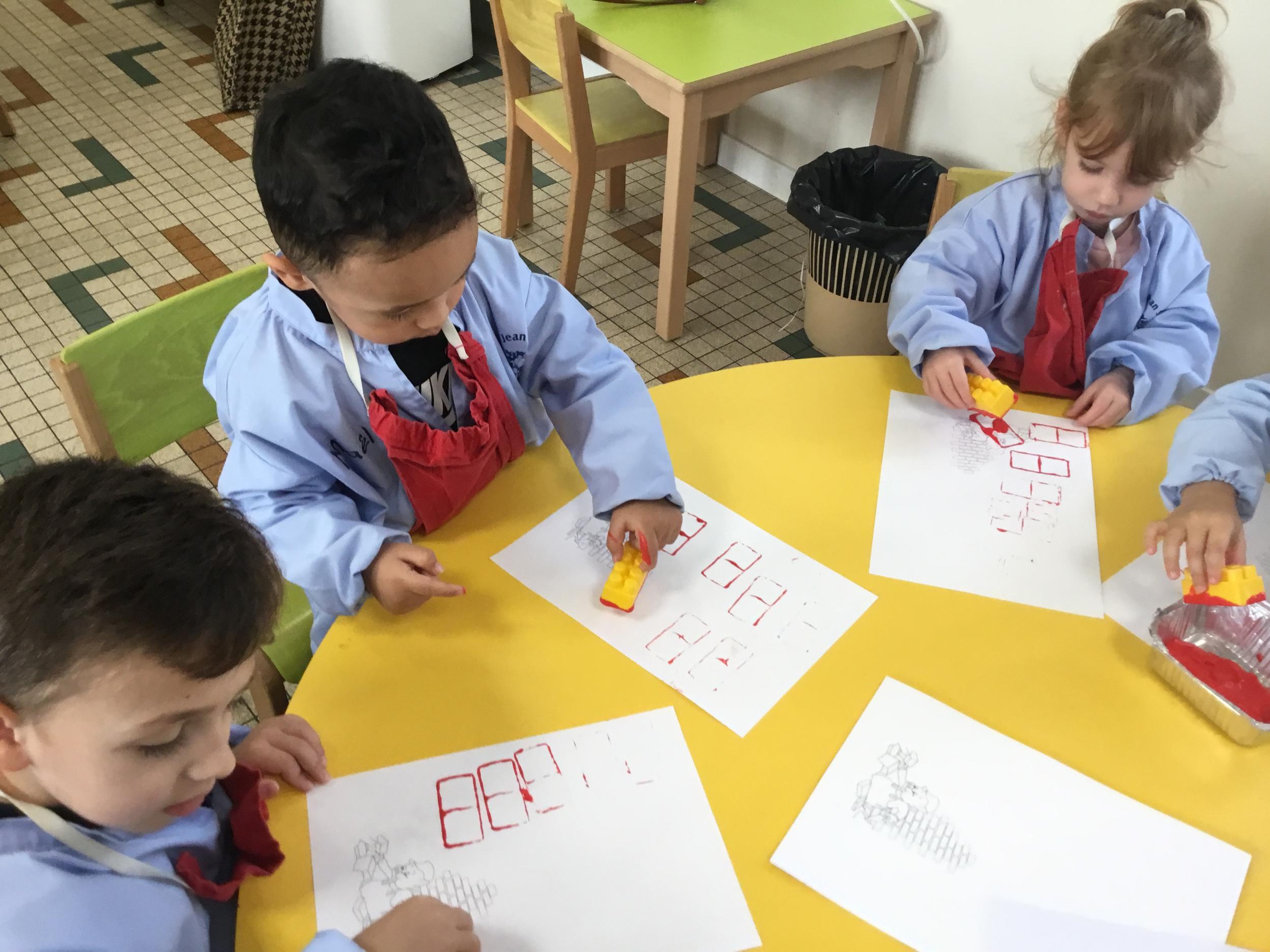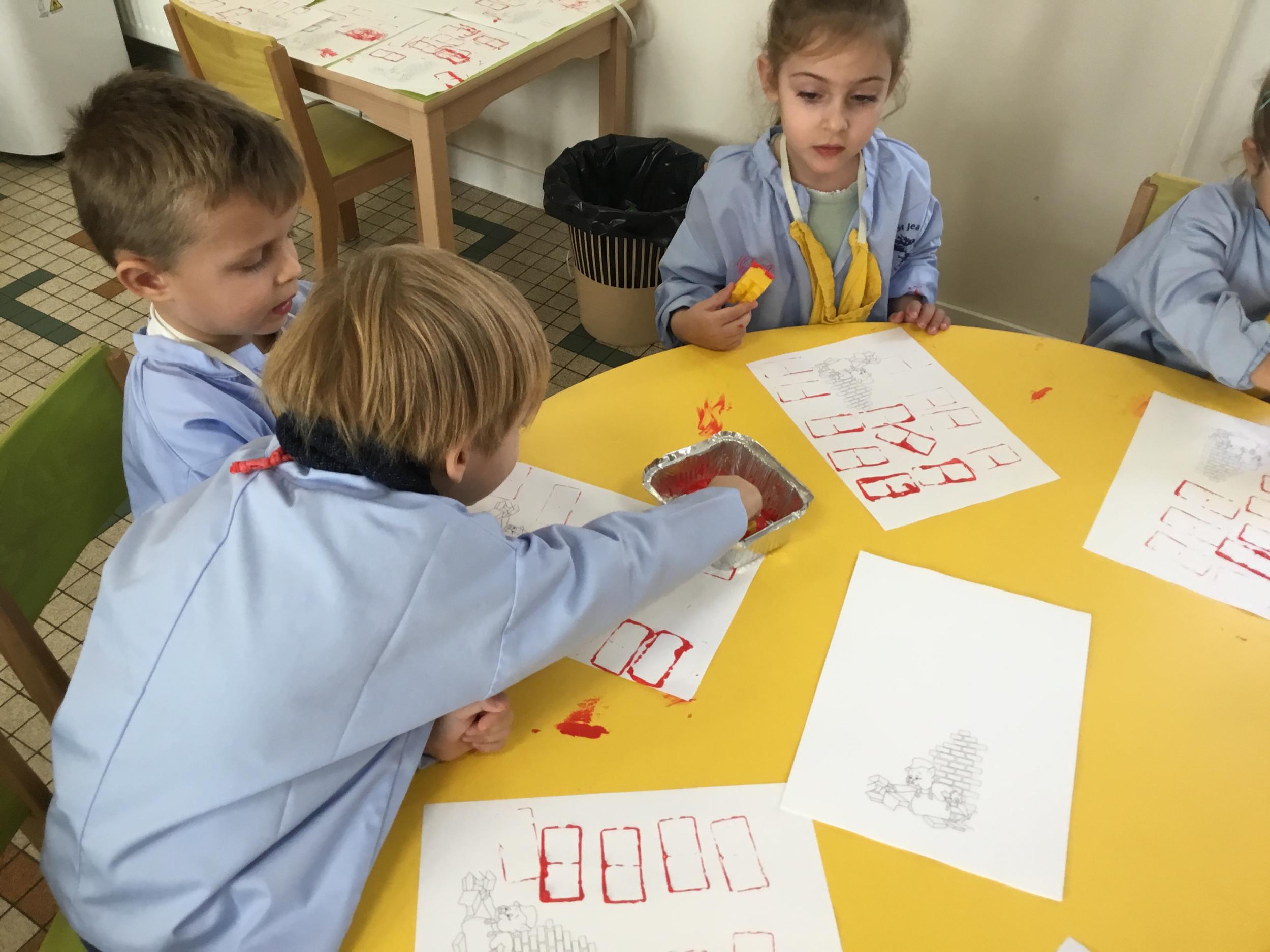 Les élèves ont travaillé en arts visuels autour de l’empreinte. Ils ont laissé des traces avec différents outils: un lego, un bouchon, une éponge, une fourchette.