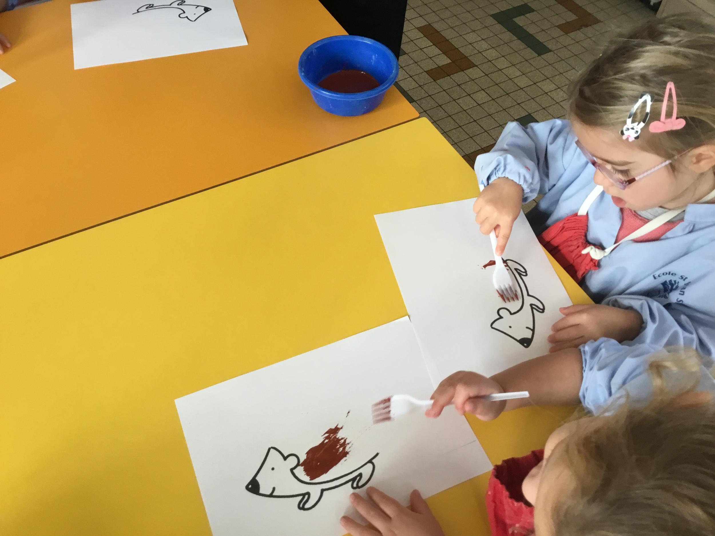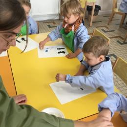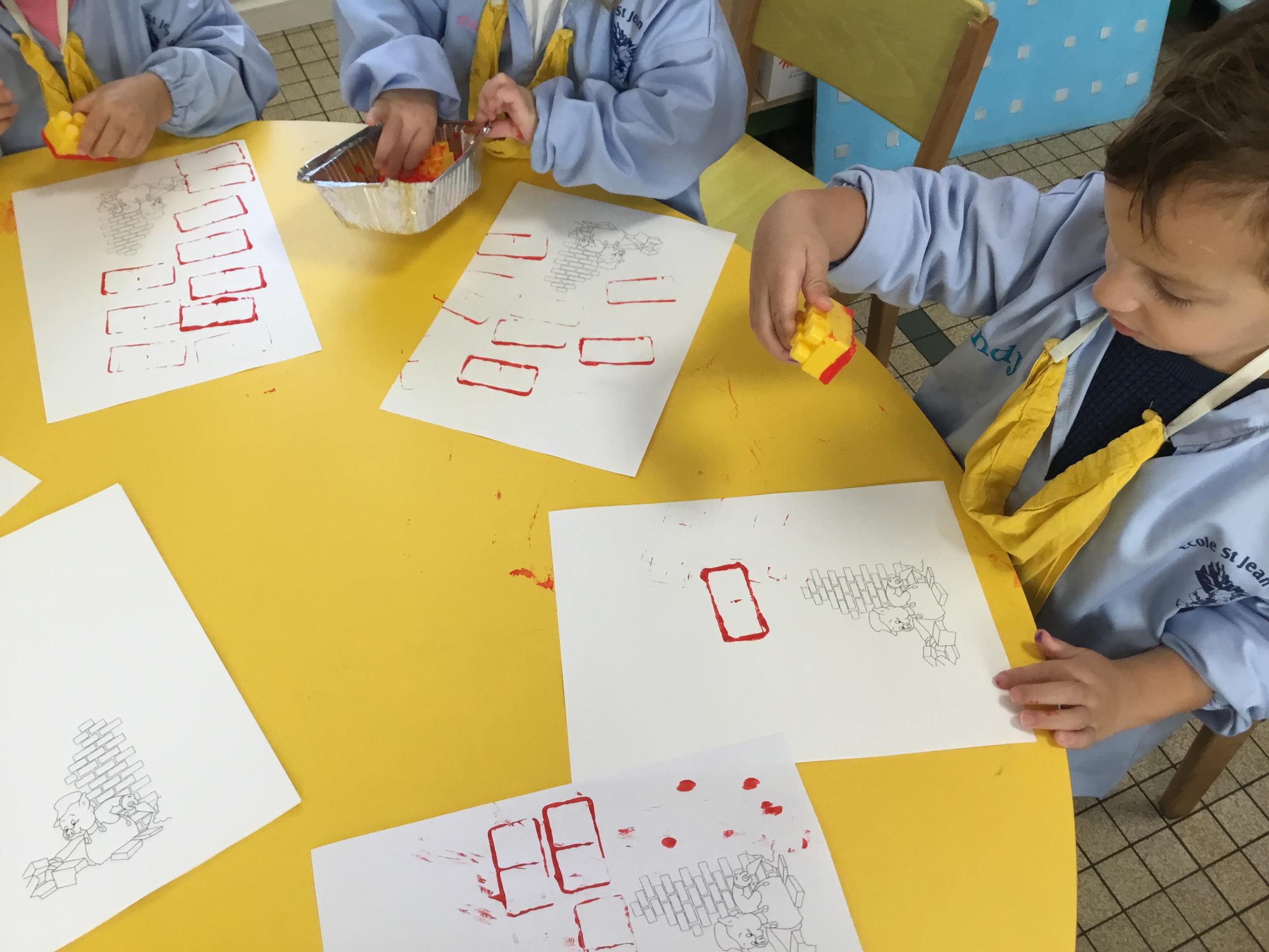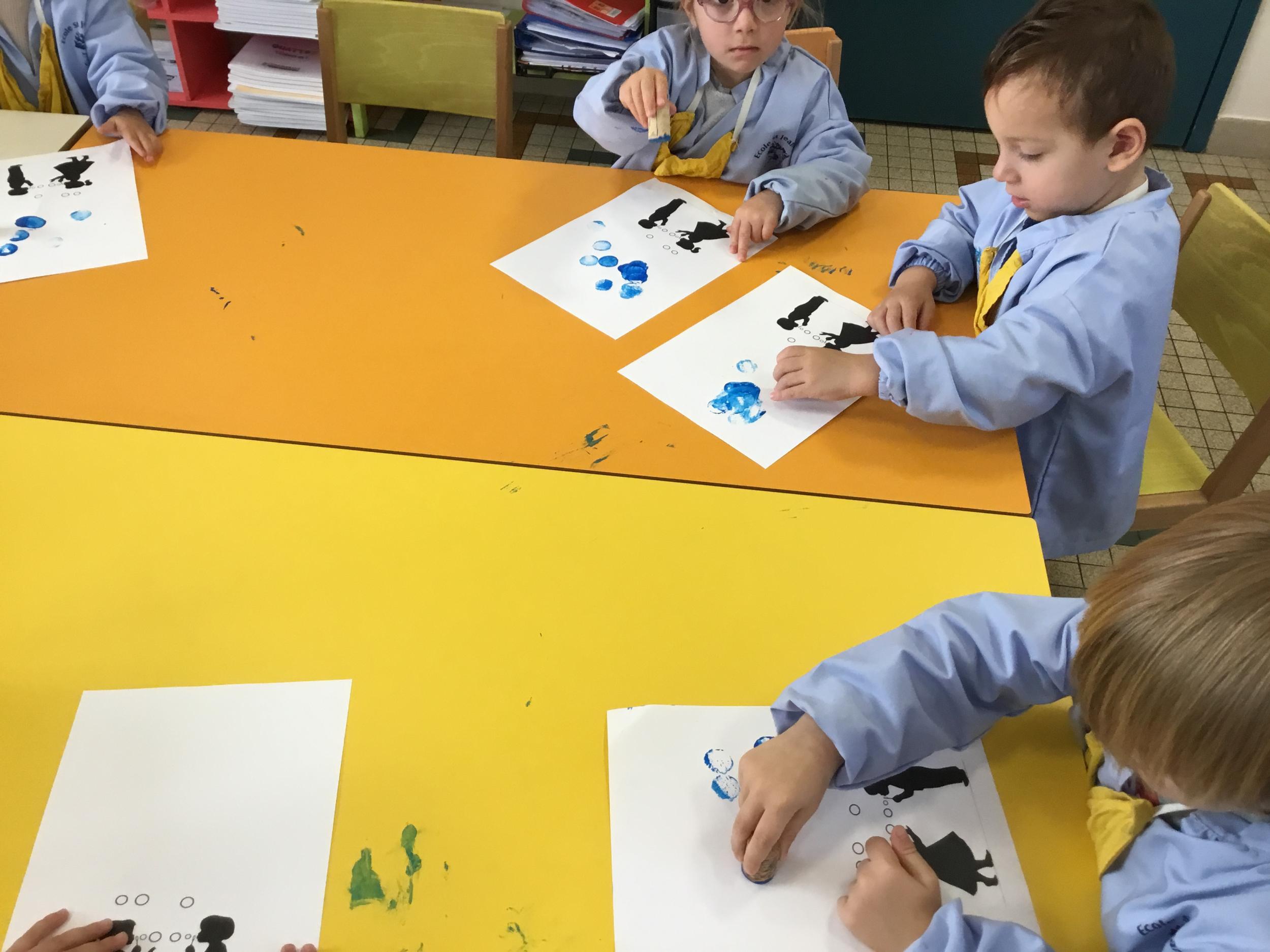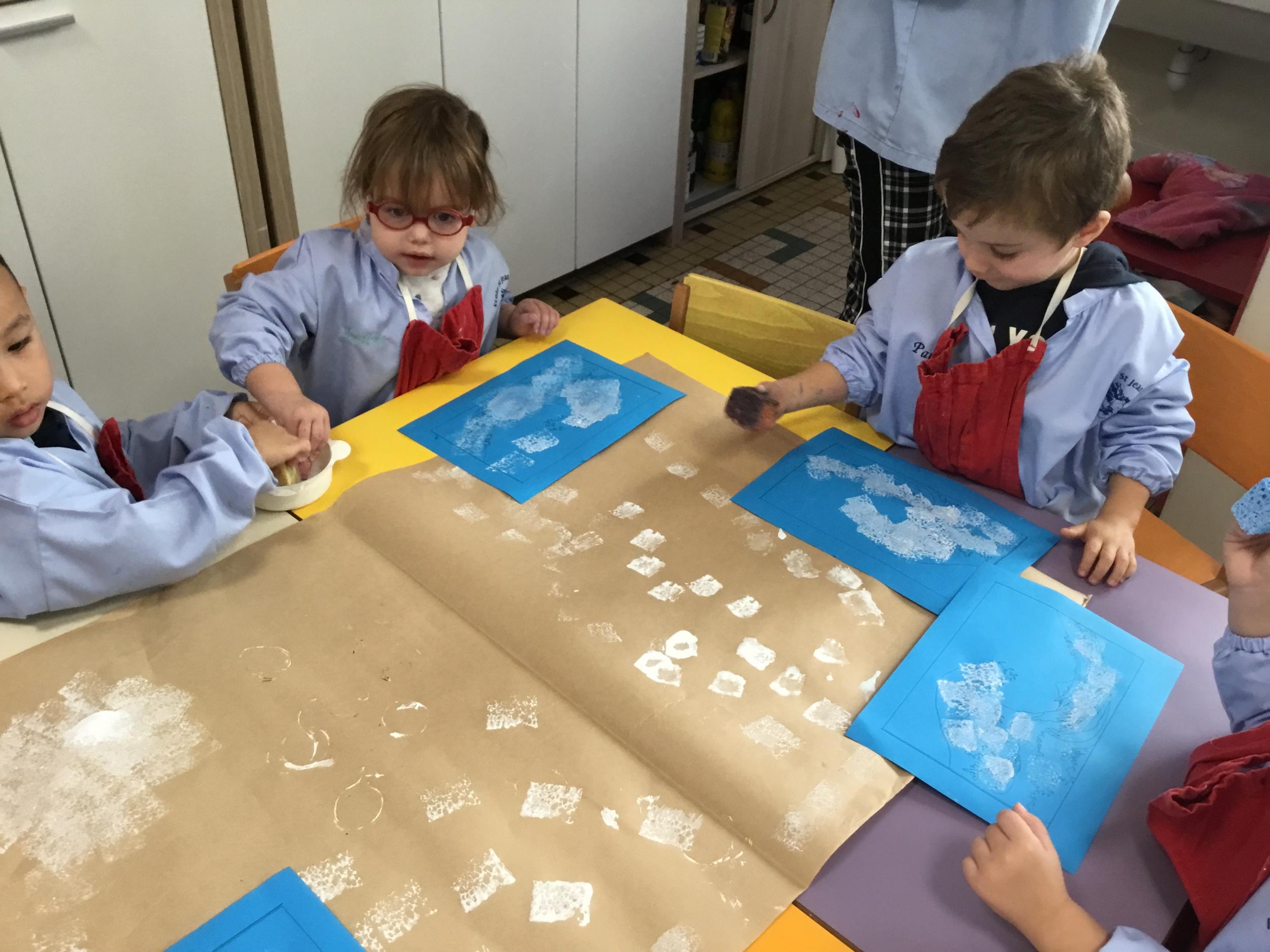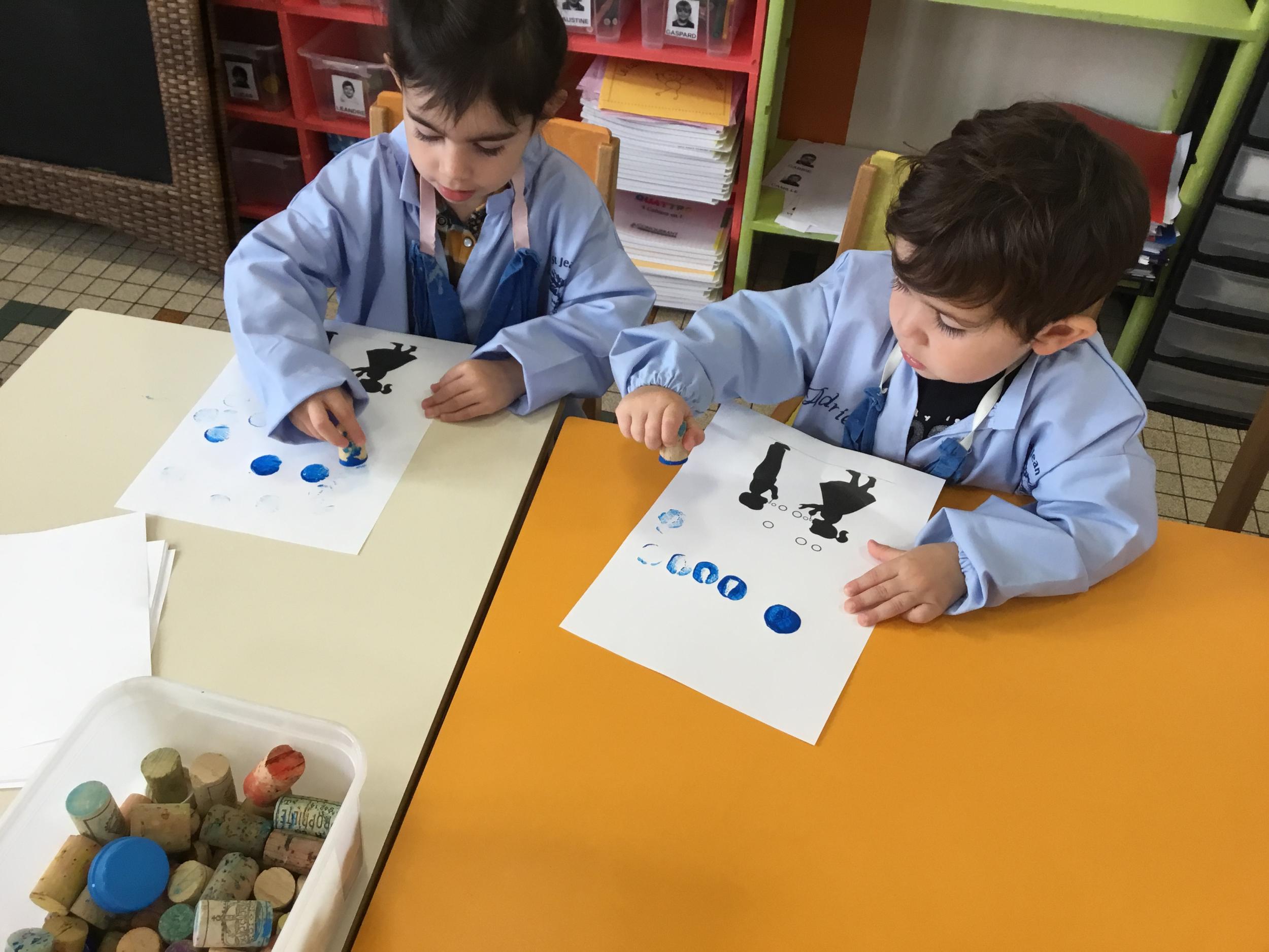 Les élèves ont travaillé en arts visuels autour de l’empreinte. Ils ont laissé des traces avec différents outils: un lego, un bouchon, une éponge, une fourchette.