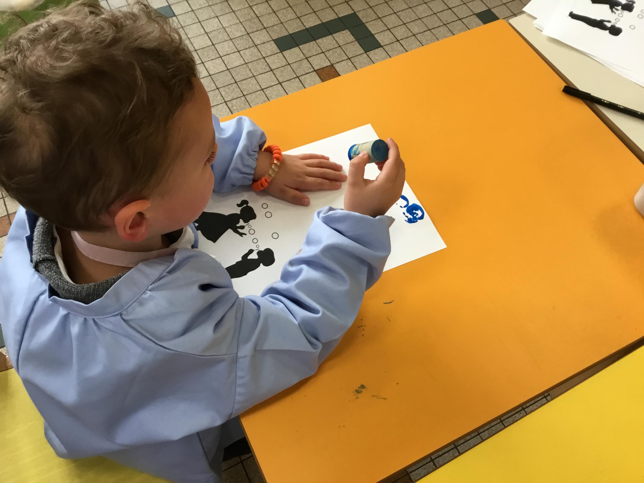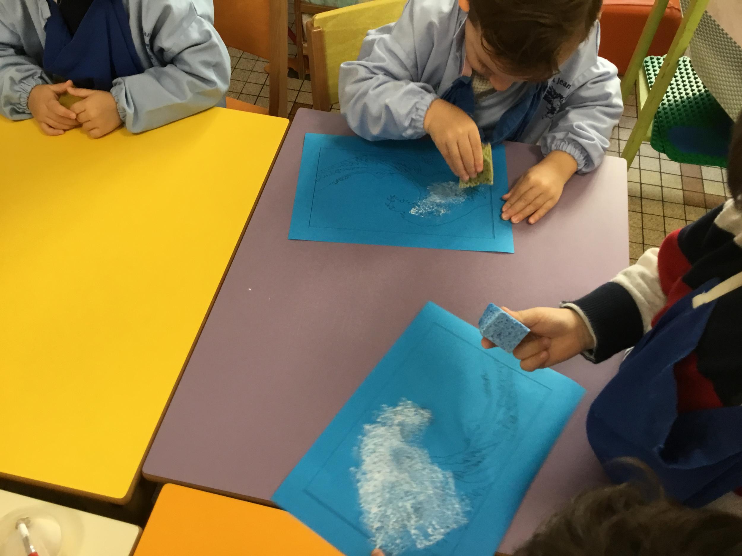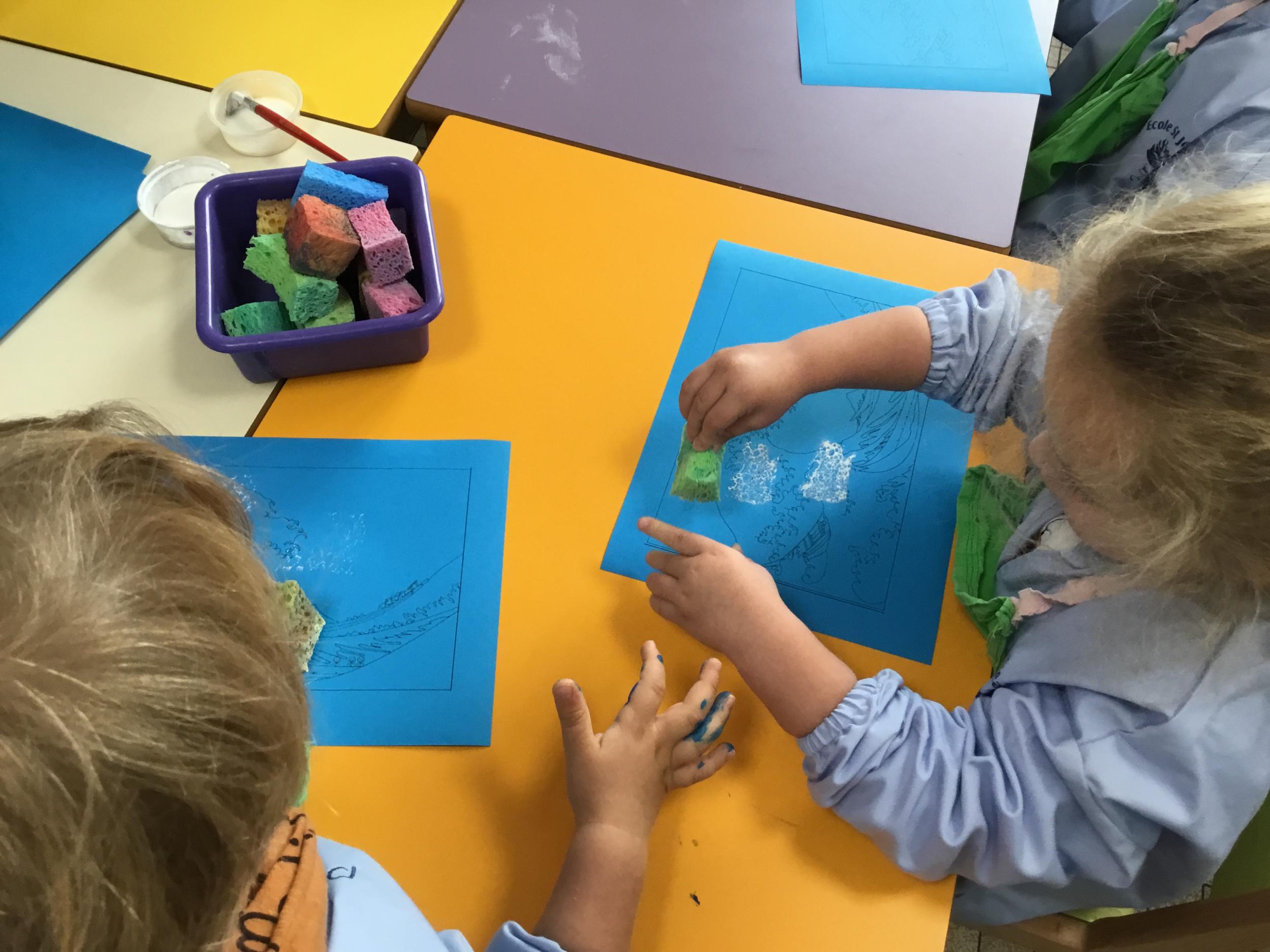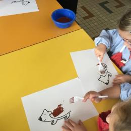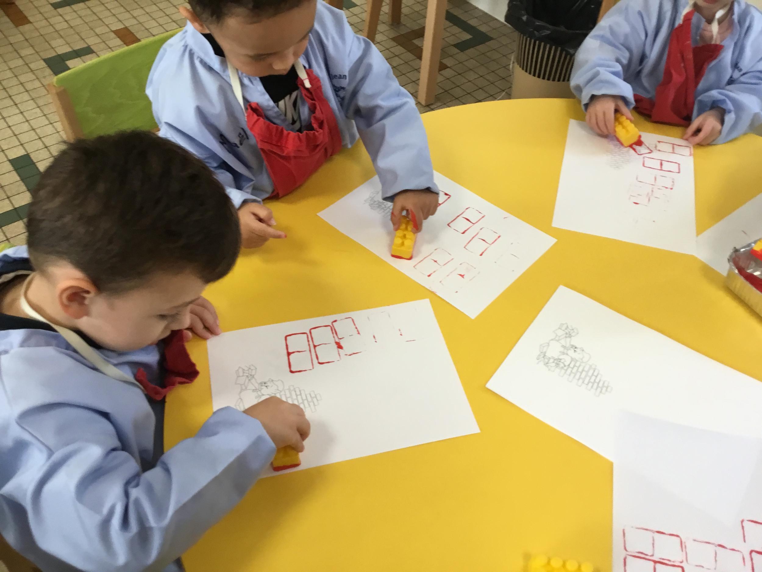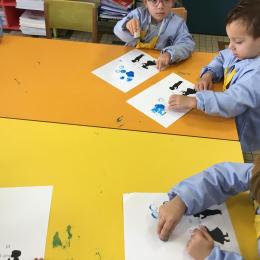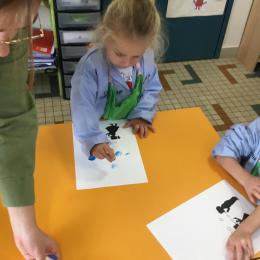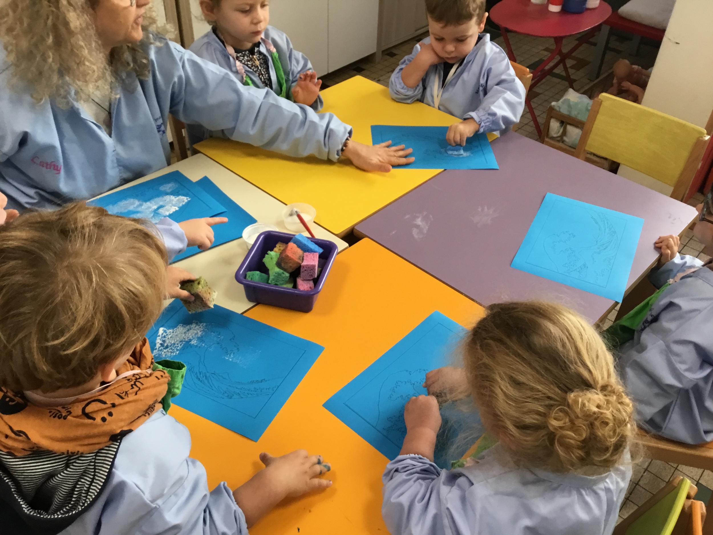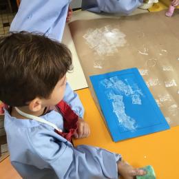 Les élèves ont travaillé en arts visuels autour de l’empreinte. Ils ont laissé des traces avec différents outils: un lego, un bouchon, une éponge, une fourchette.