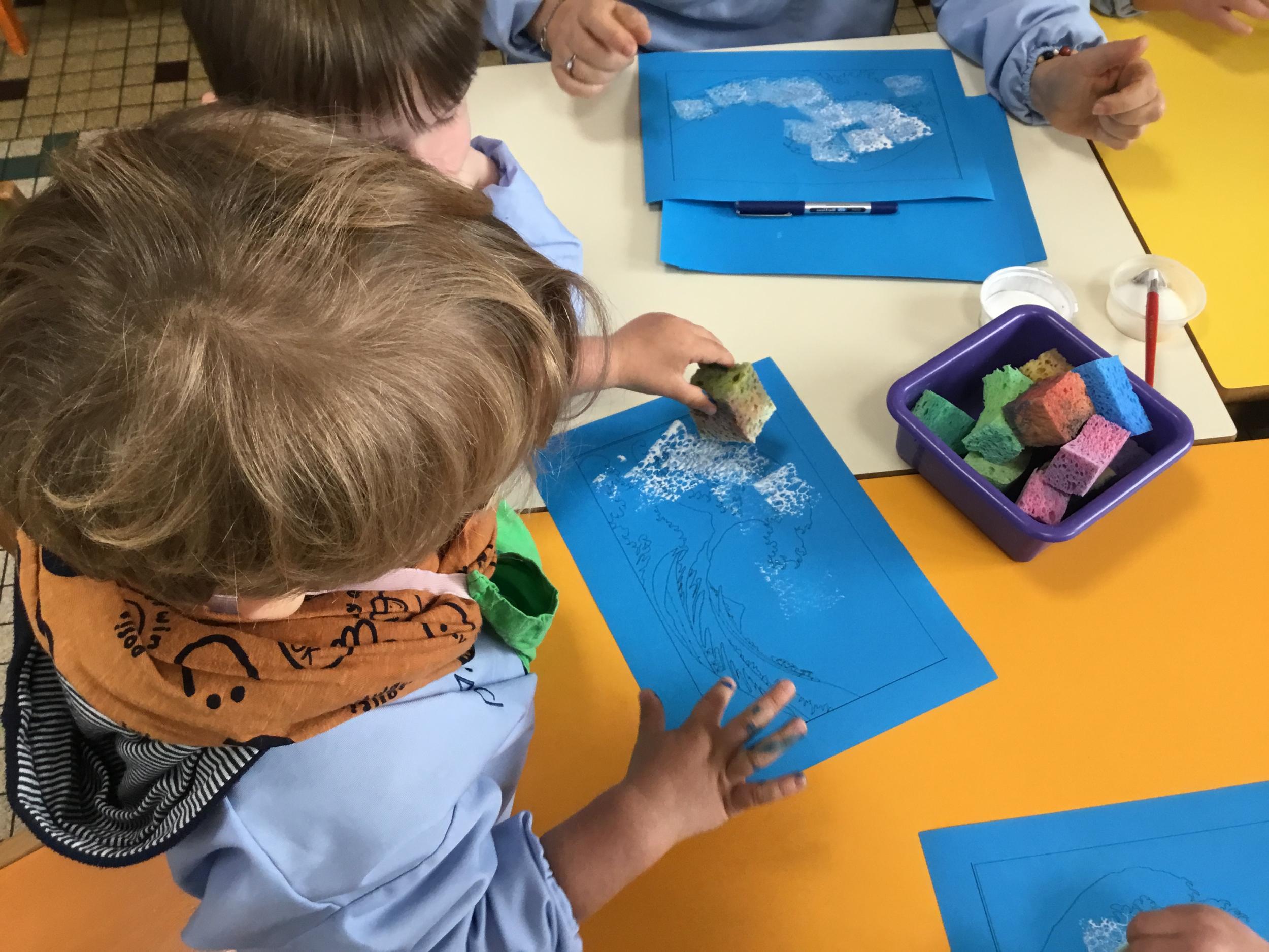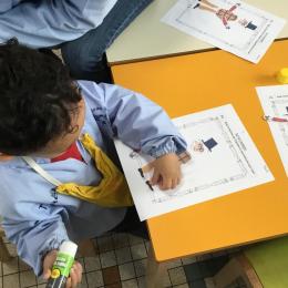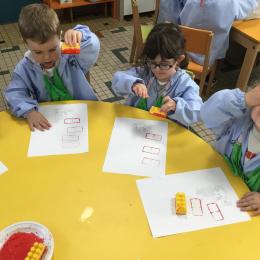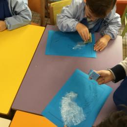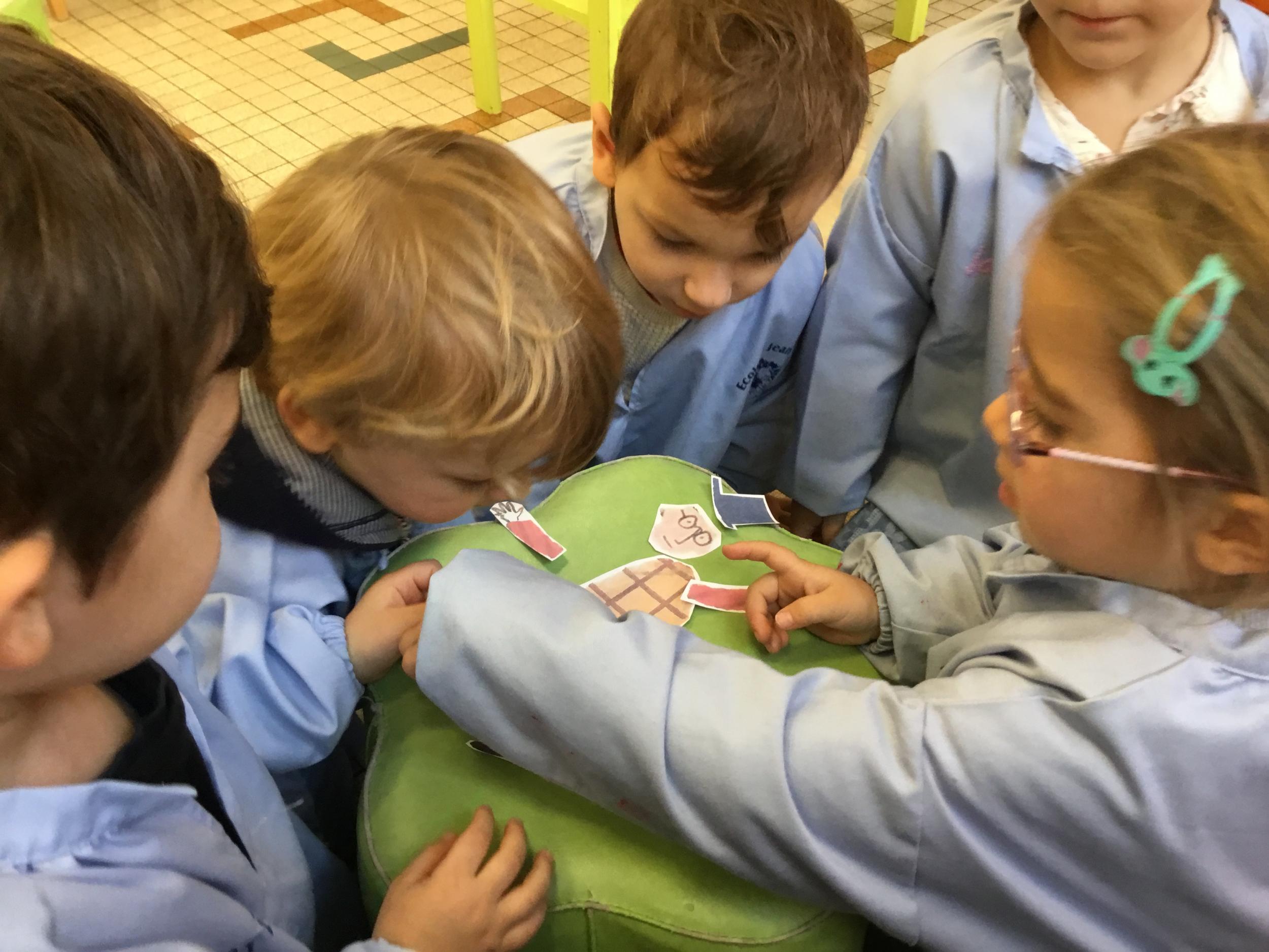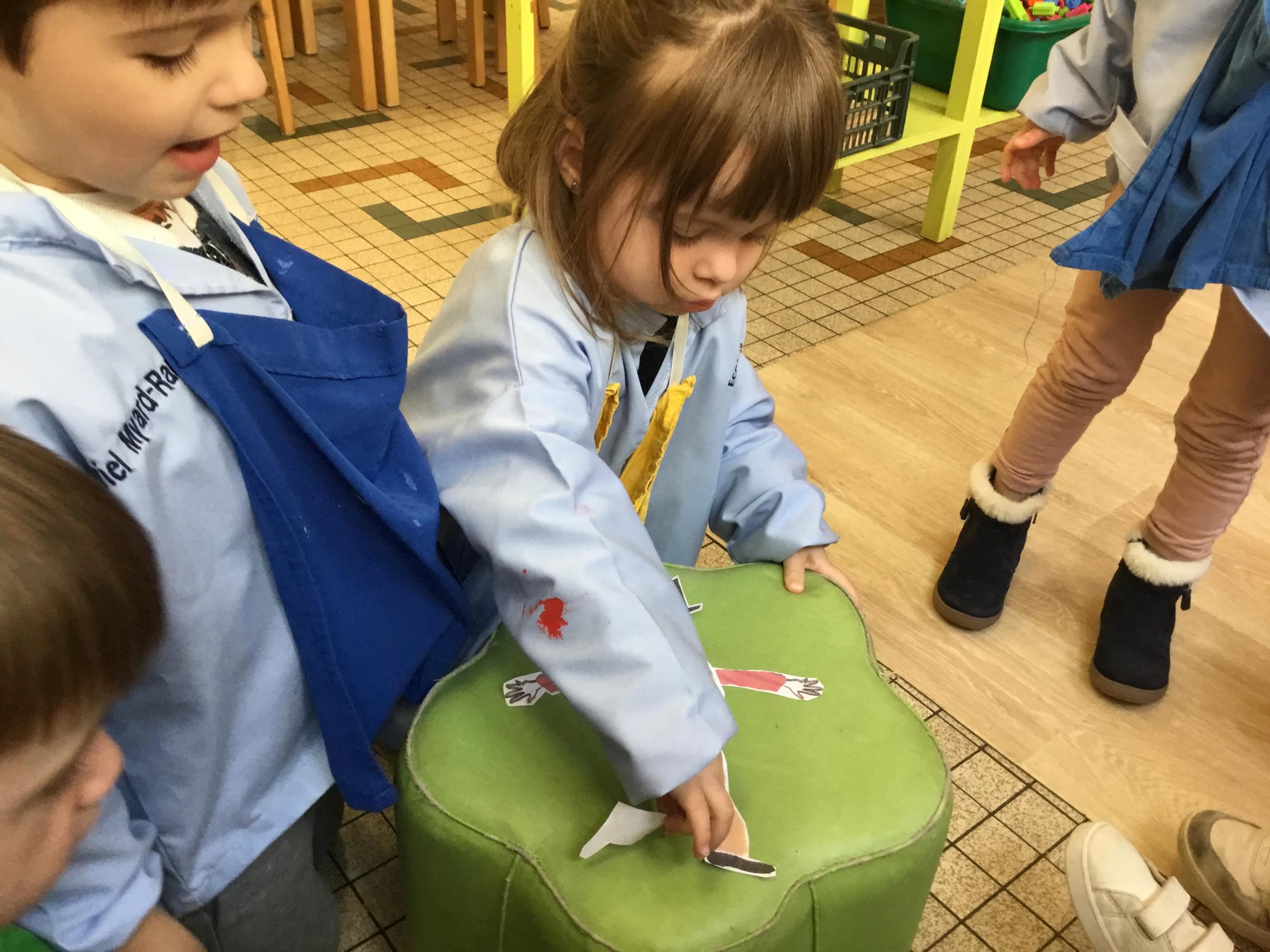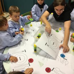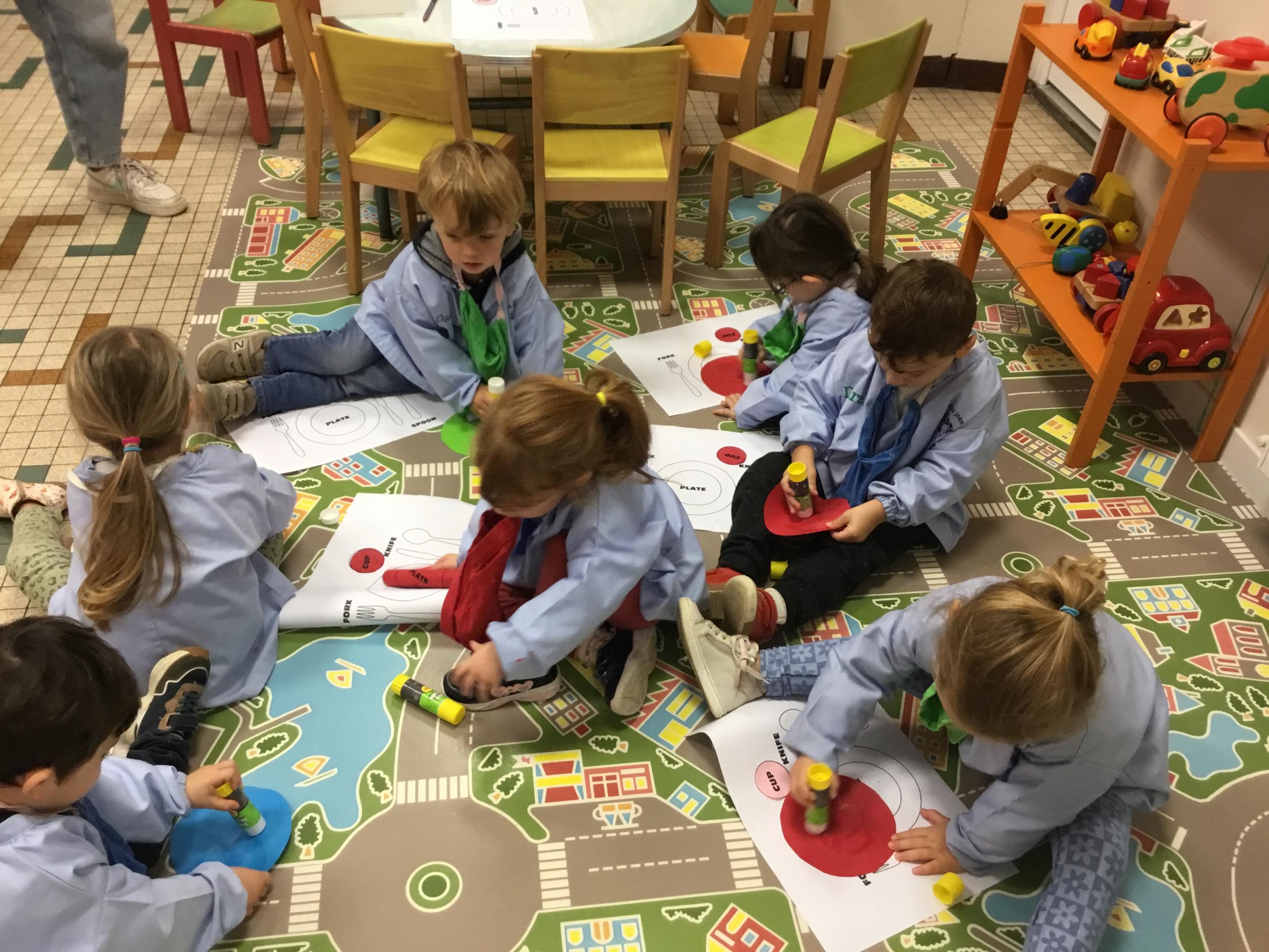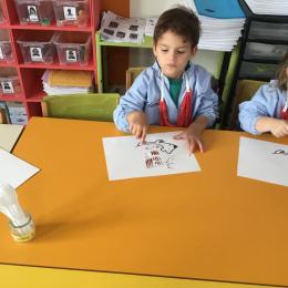 Les élèves ont travaillé en arts visuels autour de l’empreinte. Ils ont laissé des traces avec différents outils: un lego, un bouchon, une éponge, une fourchette.