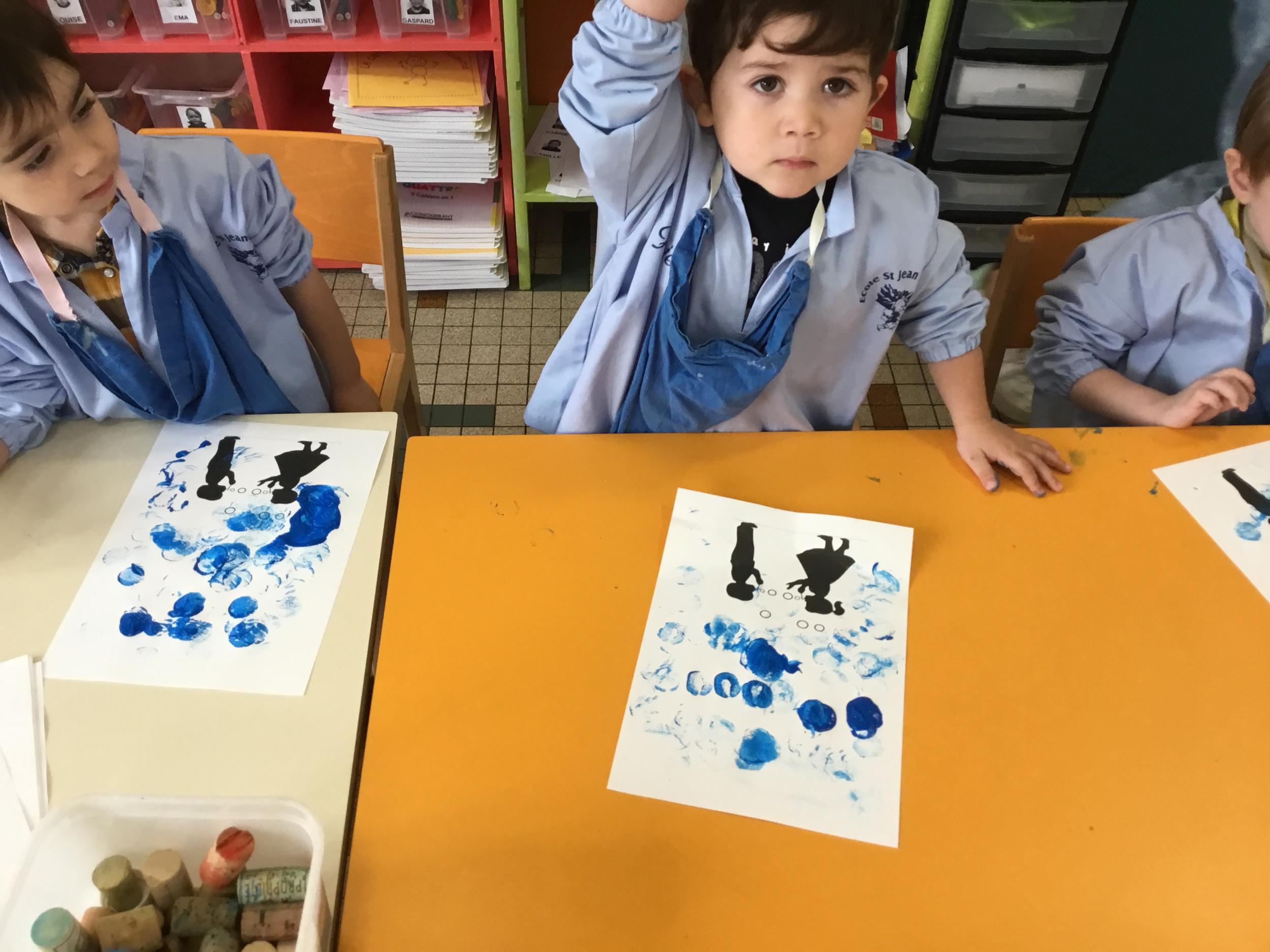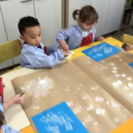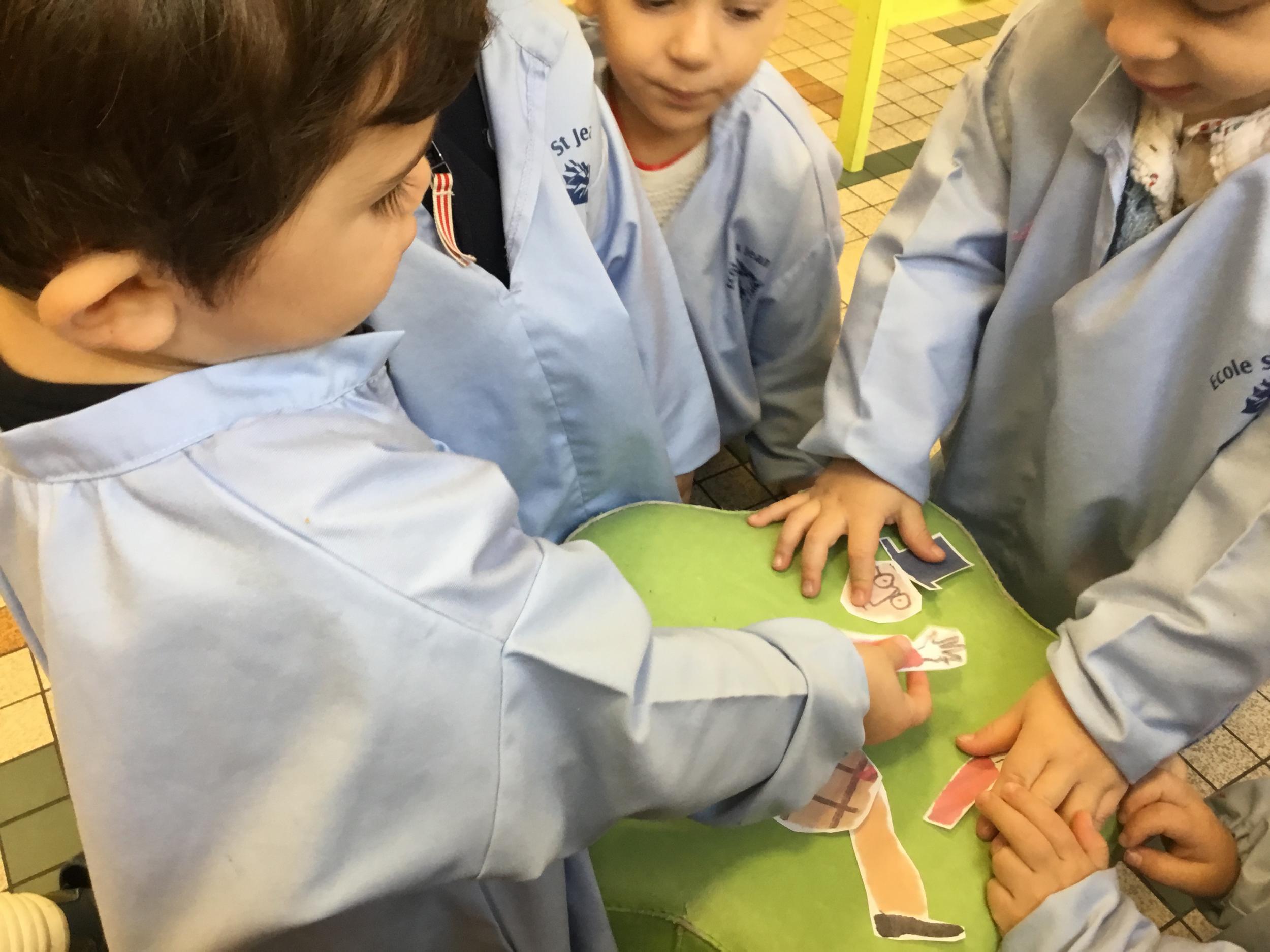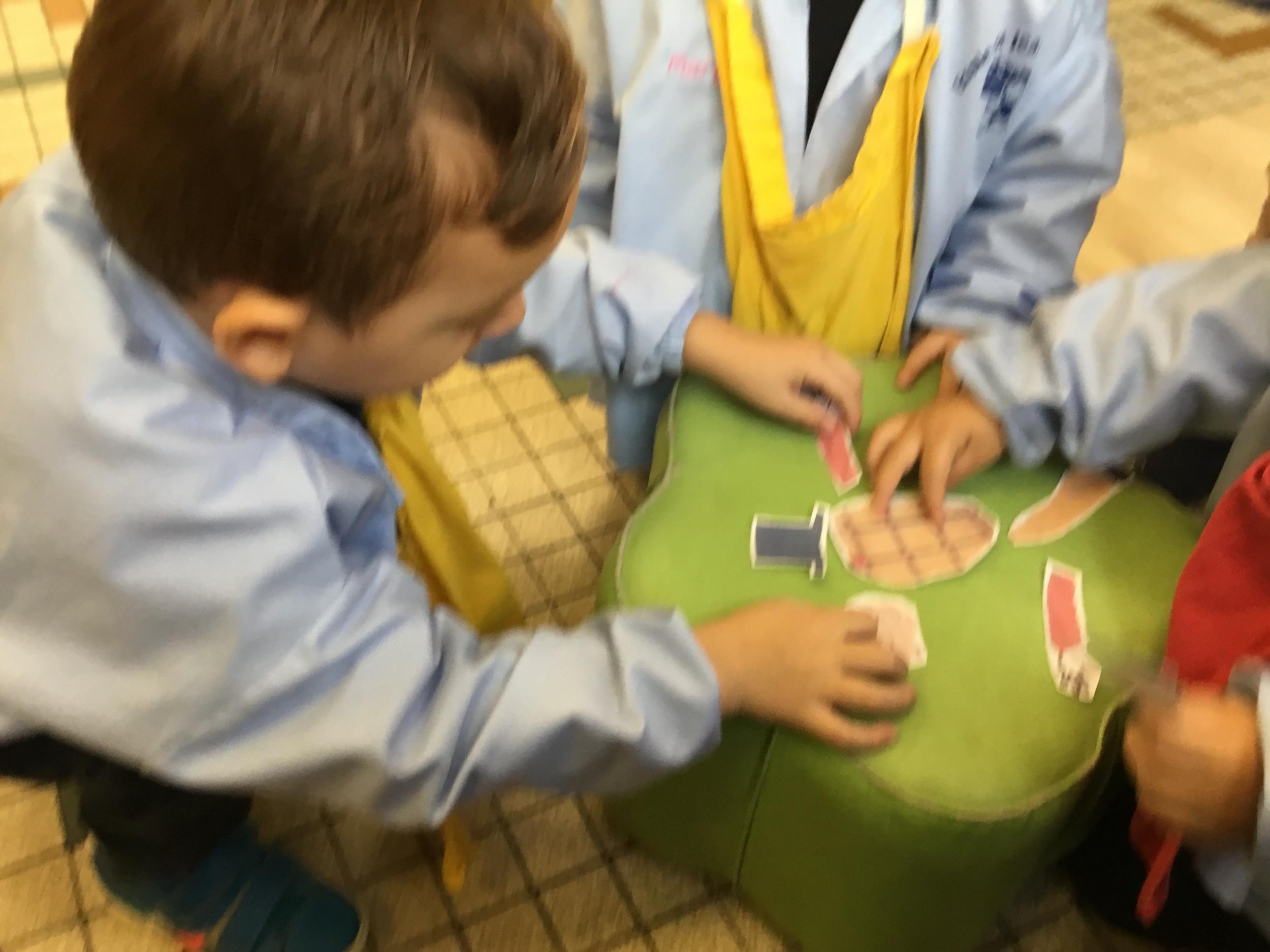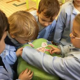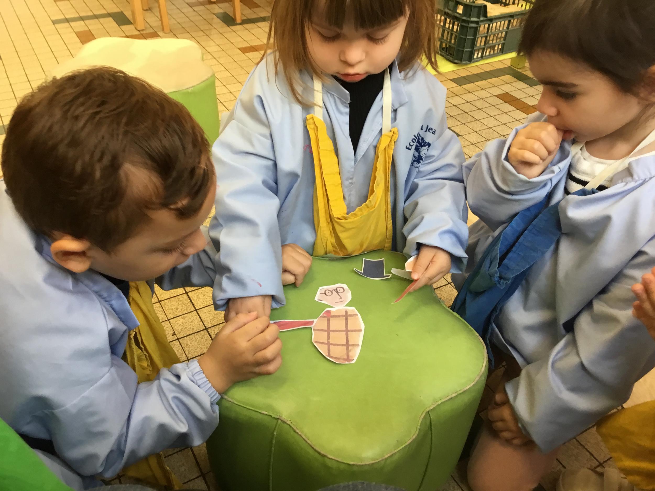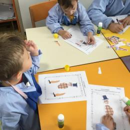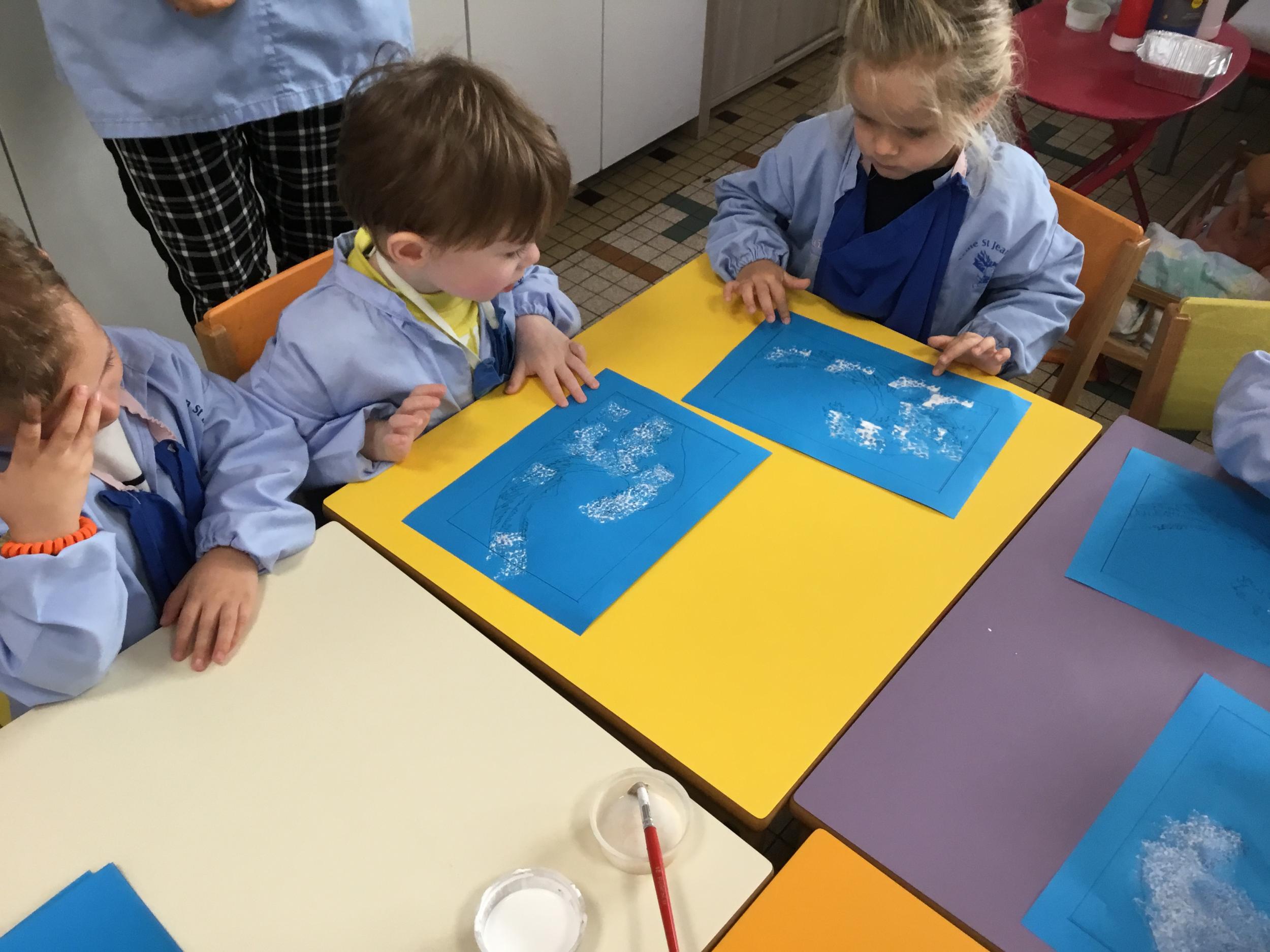 Les élèves ont travaillé en arts visuels autour de l’empreinte. Ils ont laissé des traces avec différents outils: un lego, un bouchon, une éponge, une fourchette.