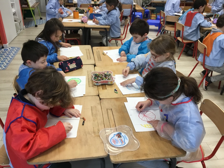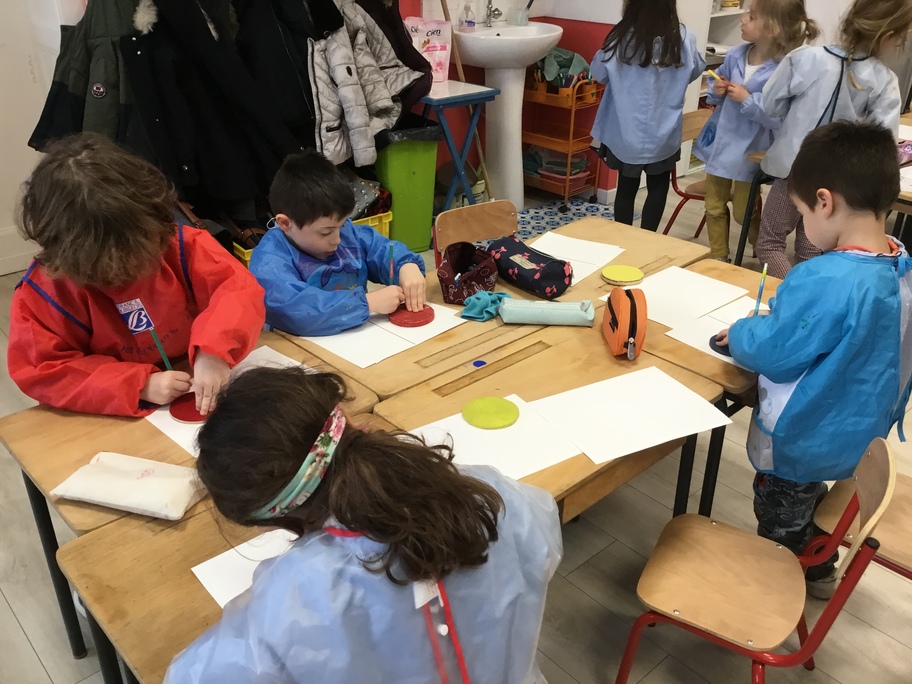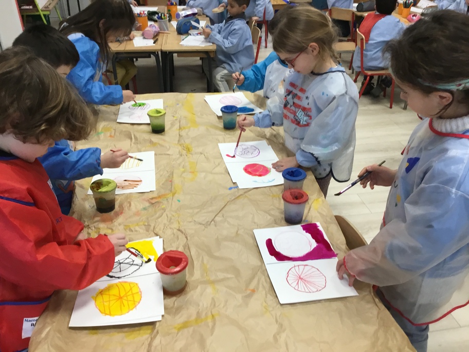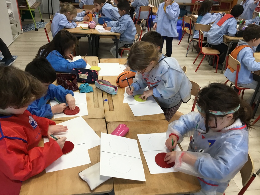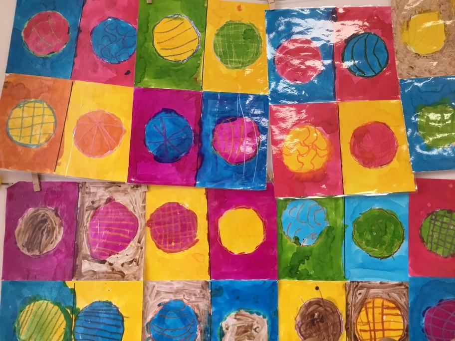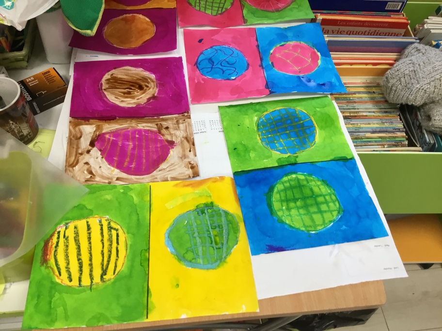 A l'image d'Andy Warhol et de ses fleurs ou Marylin, nous avons fait des galettes en art visuel : travail autour du gabarit pour tracer sa galette, contours et motifs aux pastels gras, colorisation à l'encre en alternant les couleur... puis plastification des tableaux pour faire briller les galettes... comme pour les croquer!