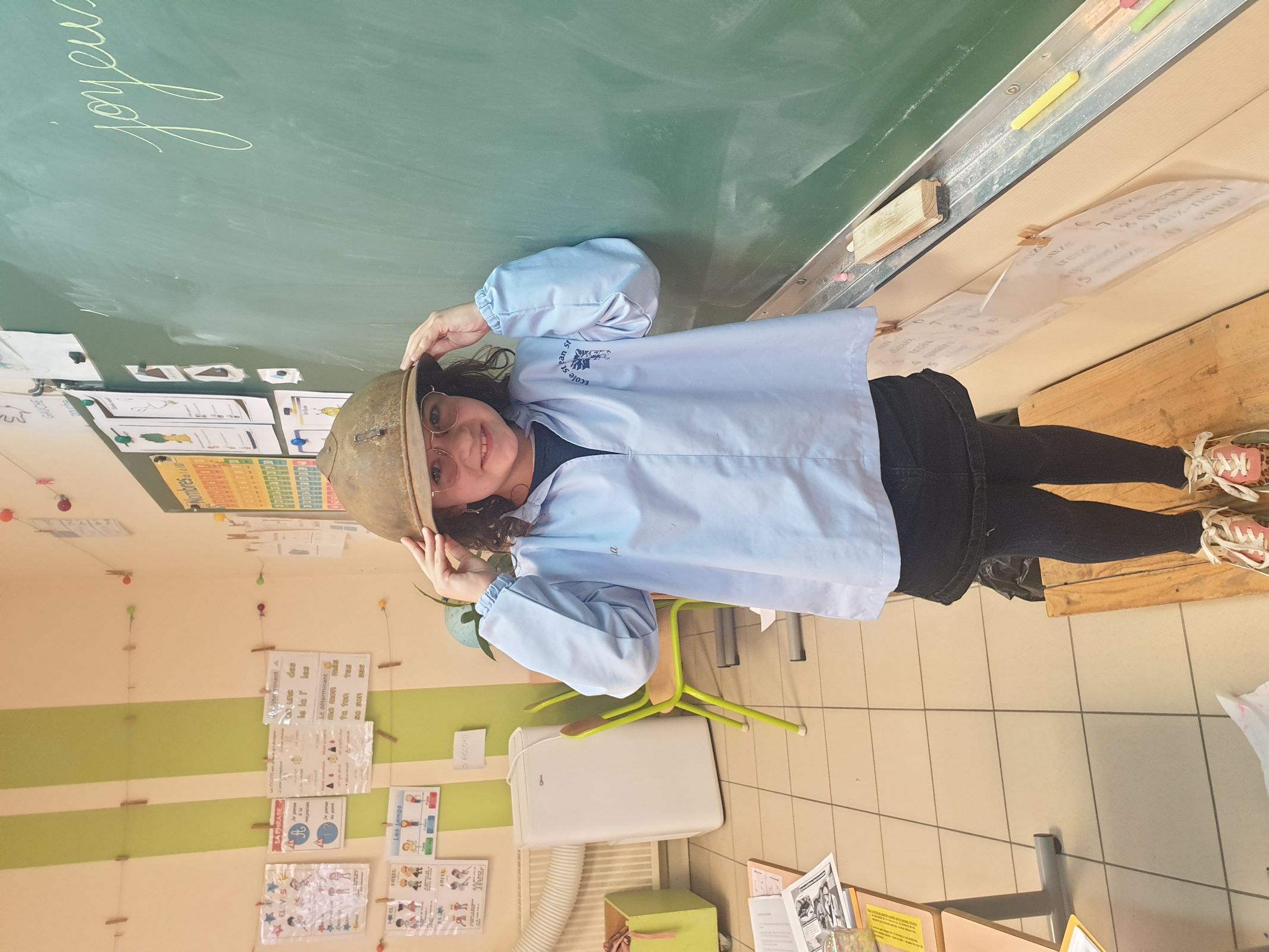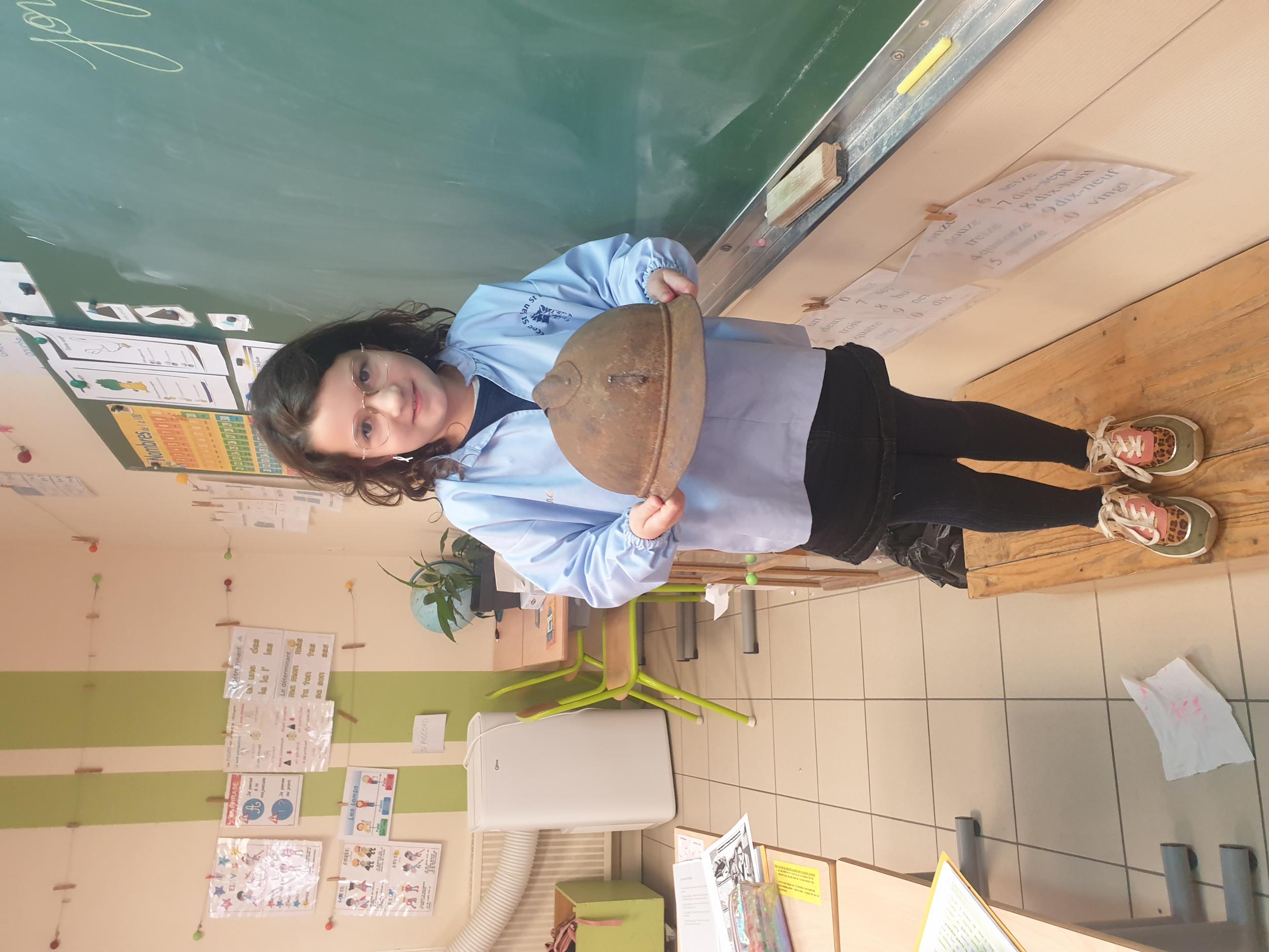 La semaine dernière, nous avons parlé du 11 novembre, de la signification de cette date. A cette occasion, Anna, une élève de la classe, a amené des effets appartenant à son arrière grand-père. Elle a amené un casque de la première guerre mondiale, une ogive d'obus désamorcée et des cartes/ lettres envoyées par le soldat durant cette période.