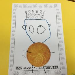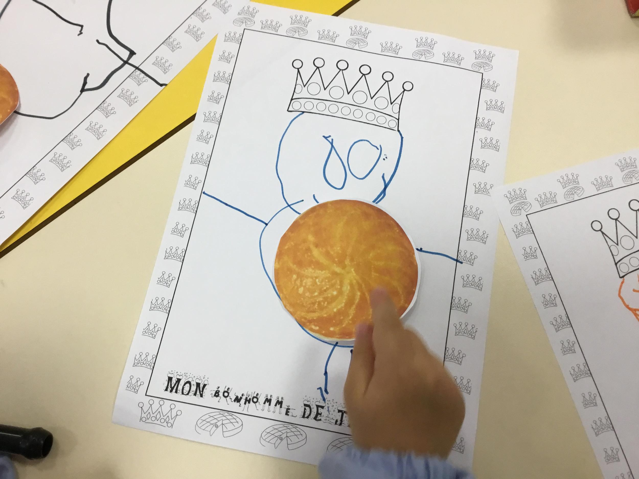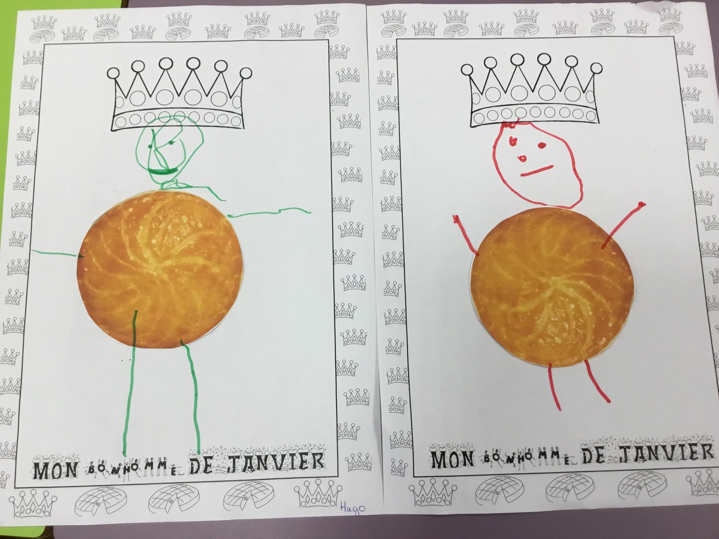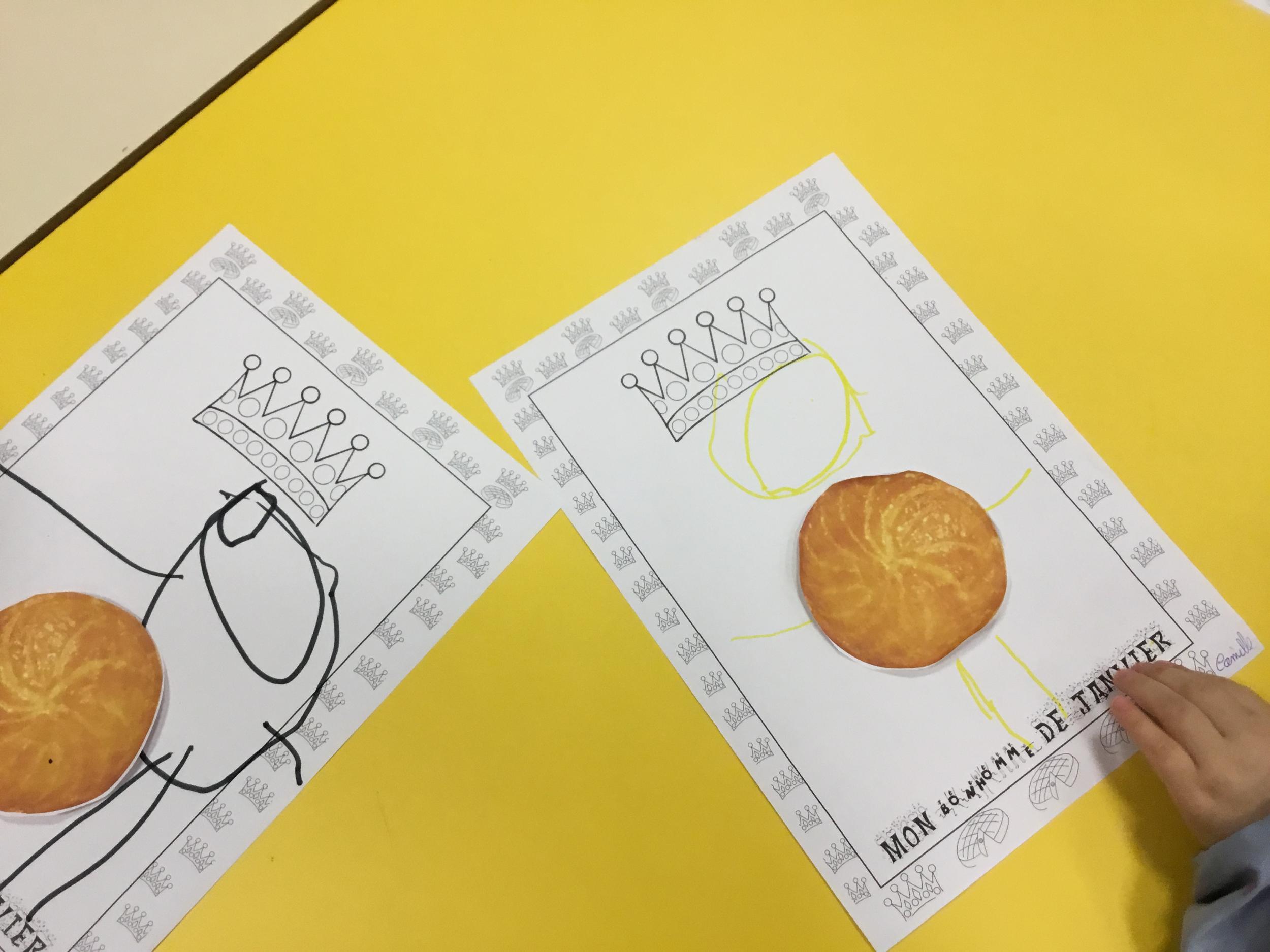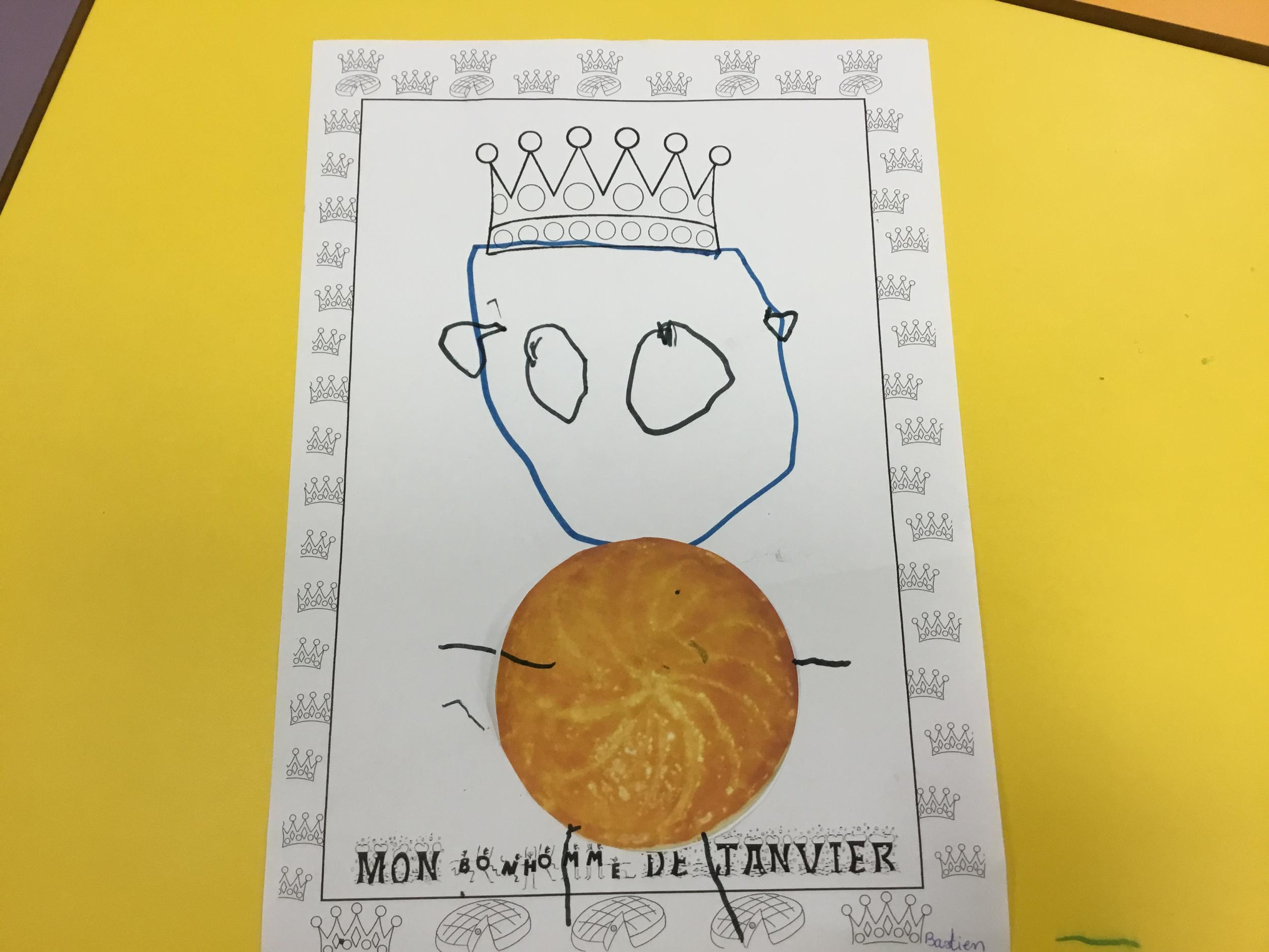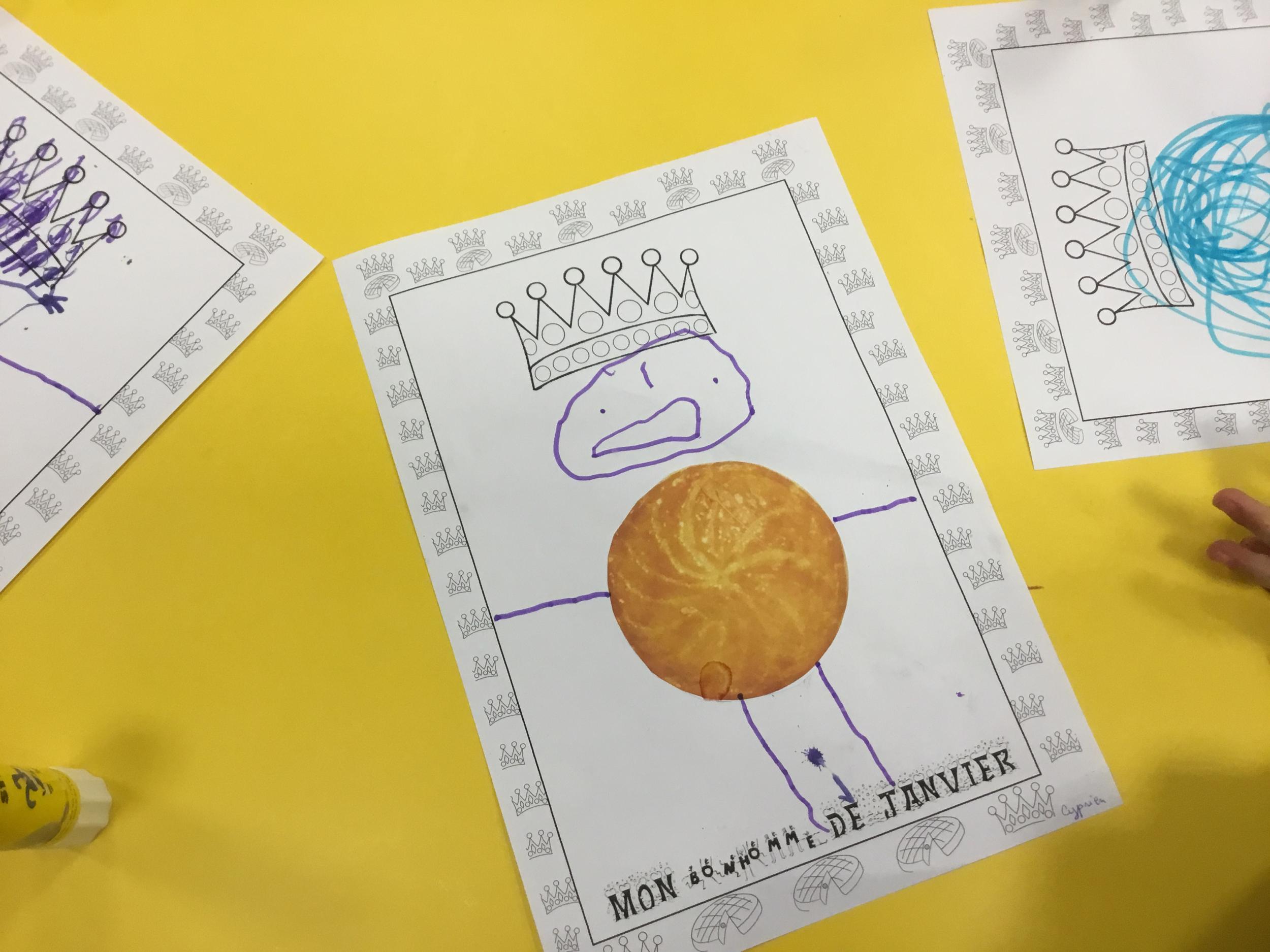 Ce mois-ci le bonhomme a un drôle de ventre en forme de galette et une bien jolie couronne. Ils ont d’abord dessiné une tête toute ronde sans oublier les yeux, la bouche, le nez et les oreilles pour certains élèves. Ensuite ils ont collé la galette et dessiné les bras et les jambes. Le résultat est magnifique.