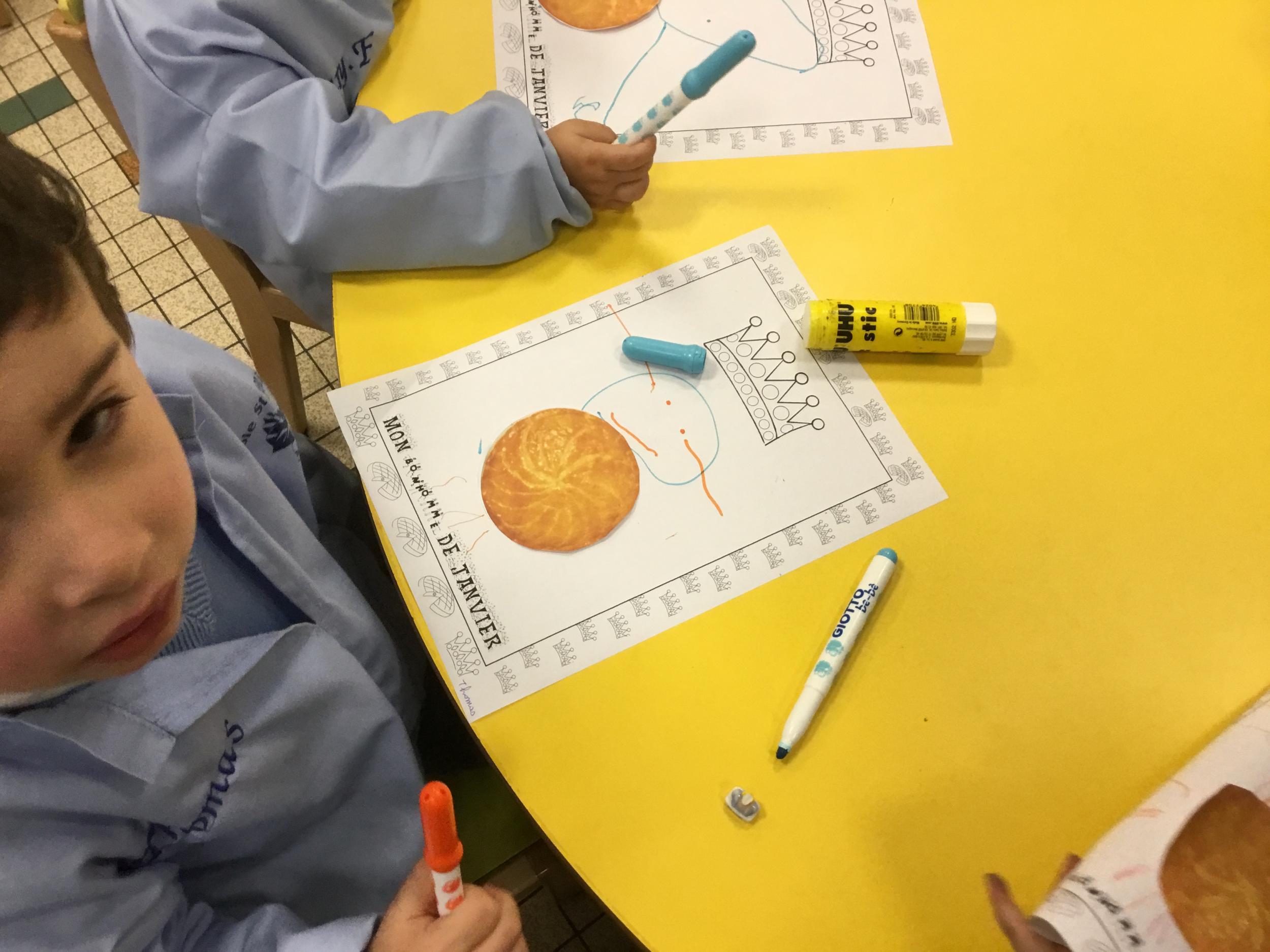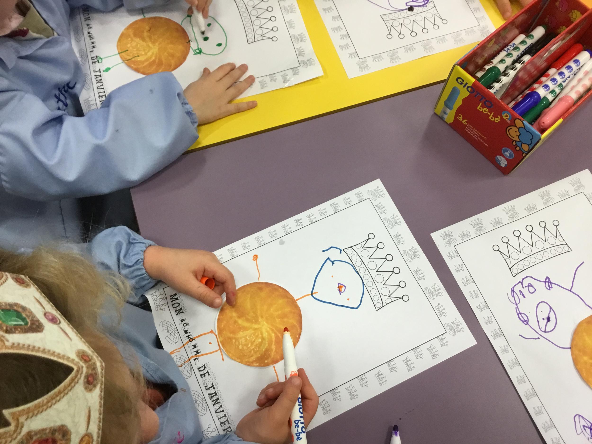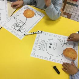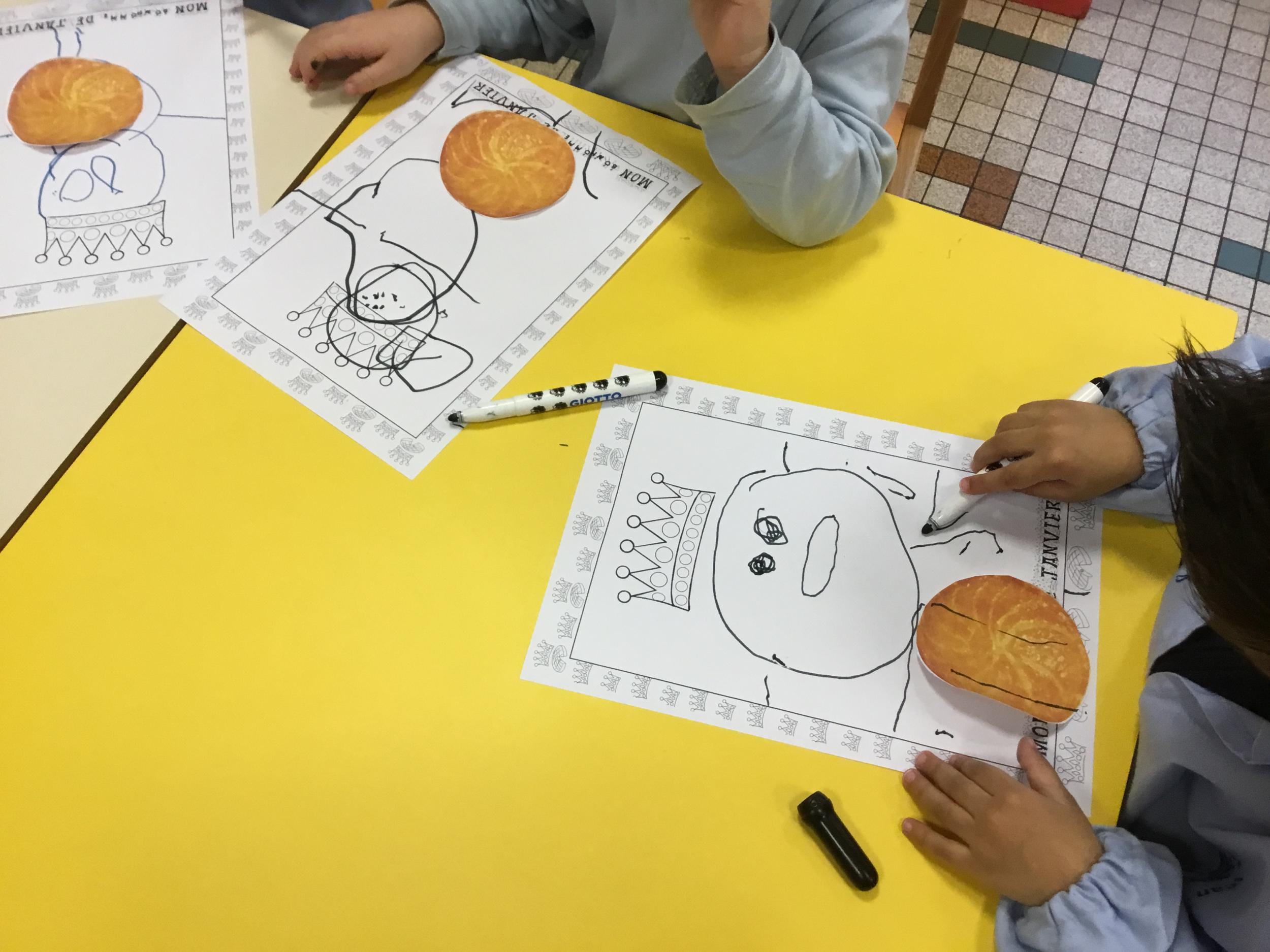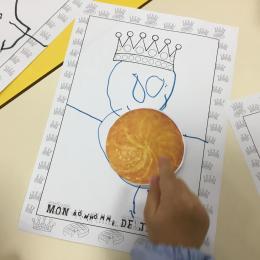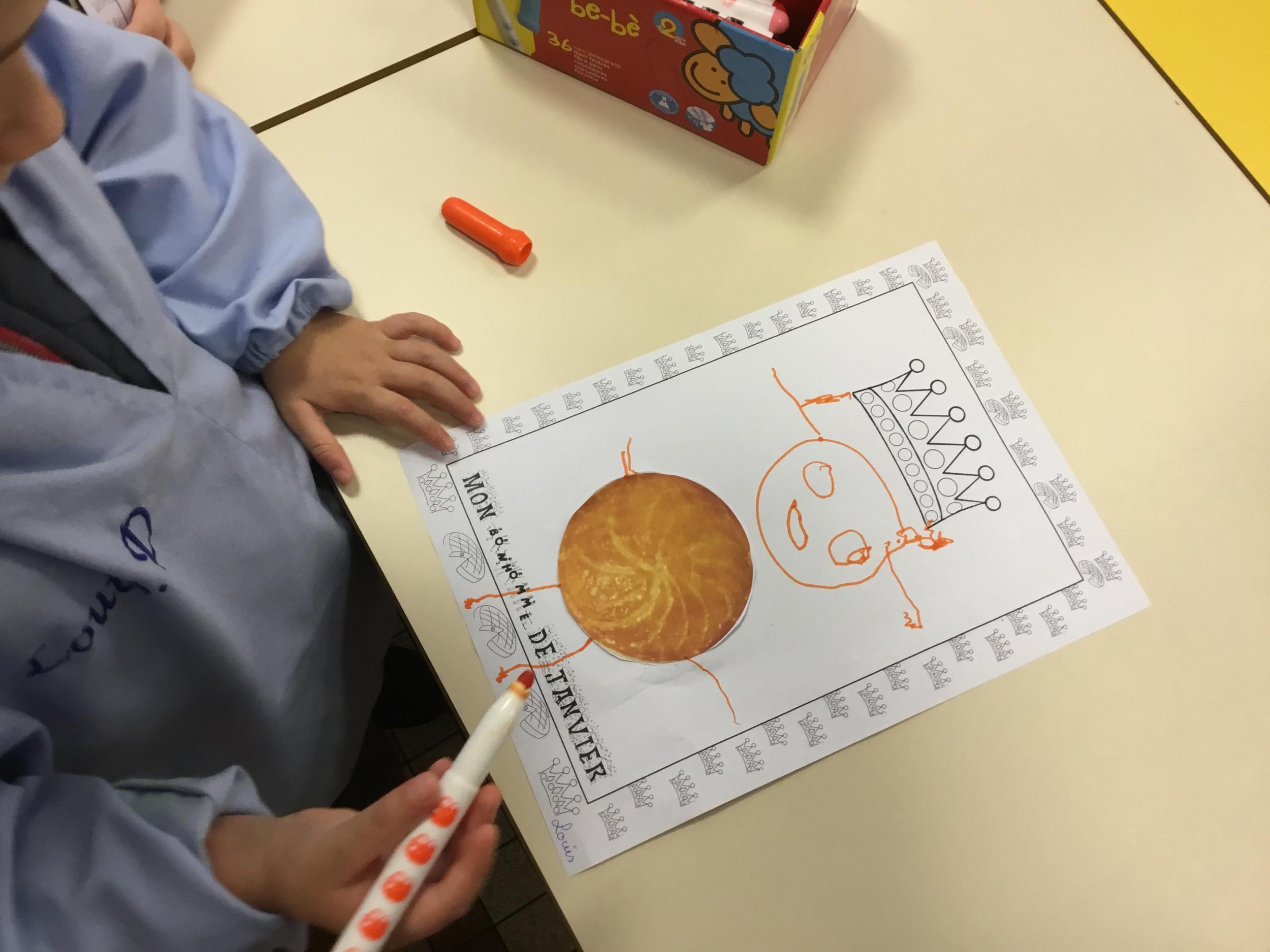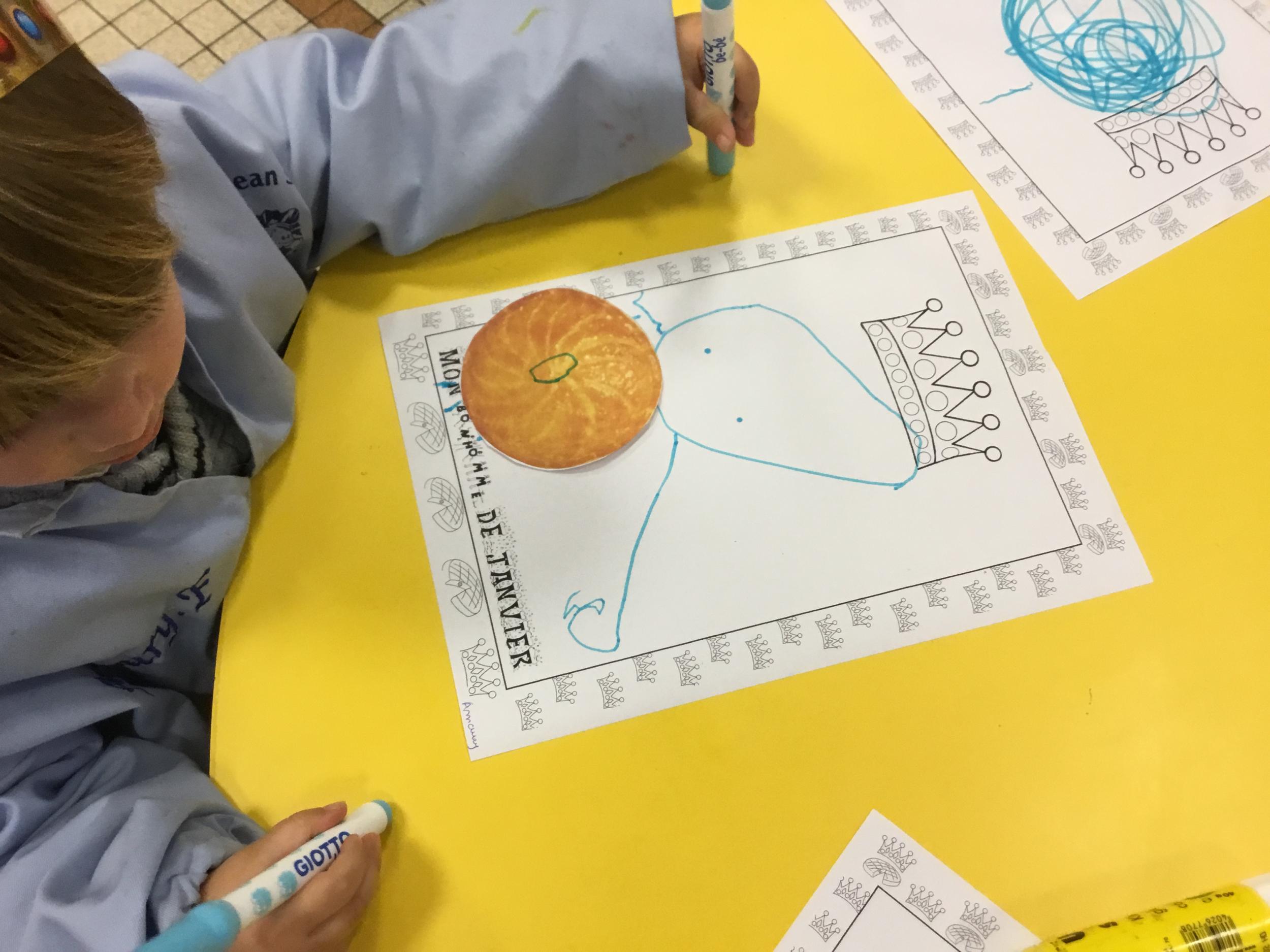 Ce mois-ci le bonhomme a un drôle de ventre en forme de galette et une bien jolie couronne. Ils ont d’abord dessiné une tête toute ronde sans oublier les yeux, la bouche, le nez et les oreilles pour certains élèves. Ensuite ils ont collé la galette et dessiné les bras et les jambes. Le résultat est magnifique.