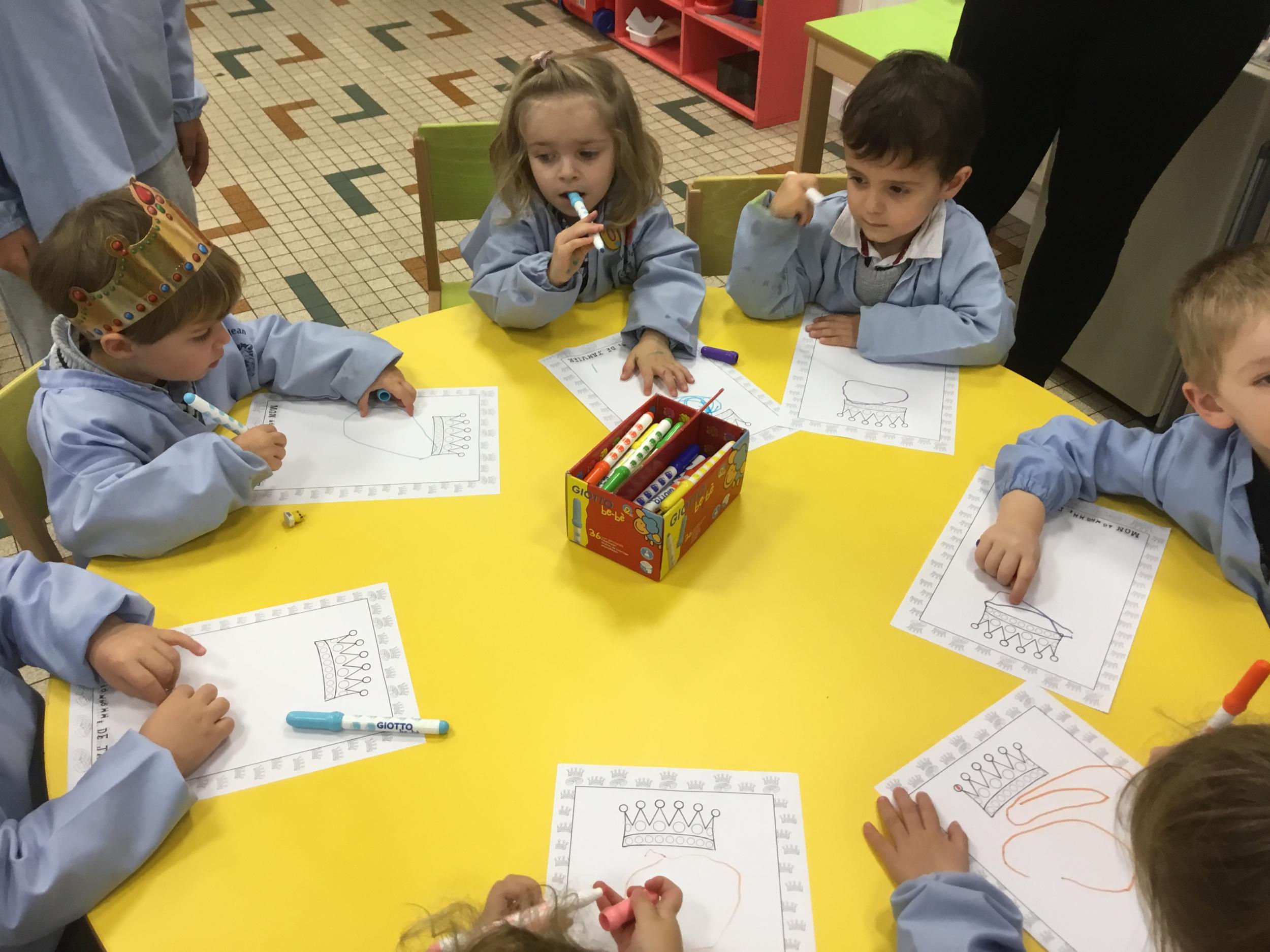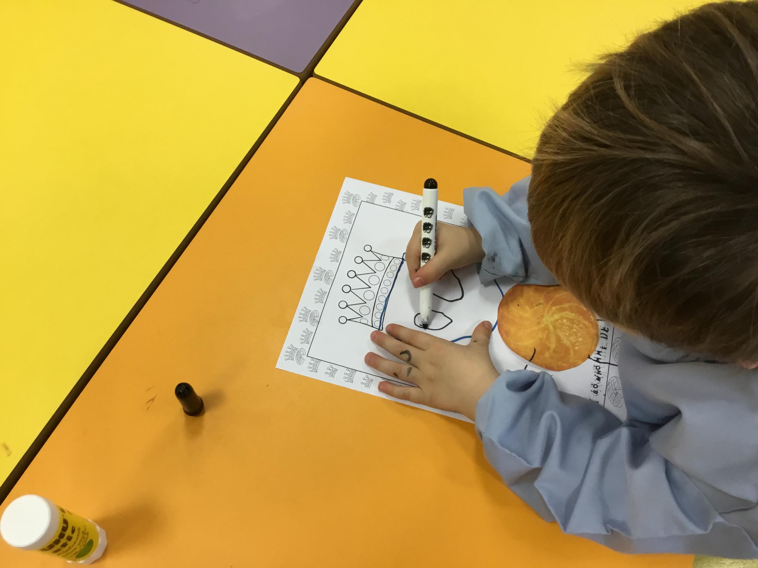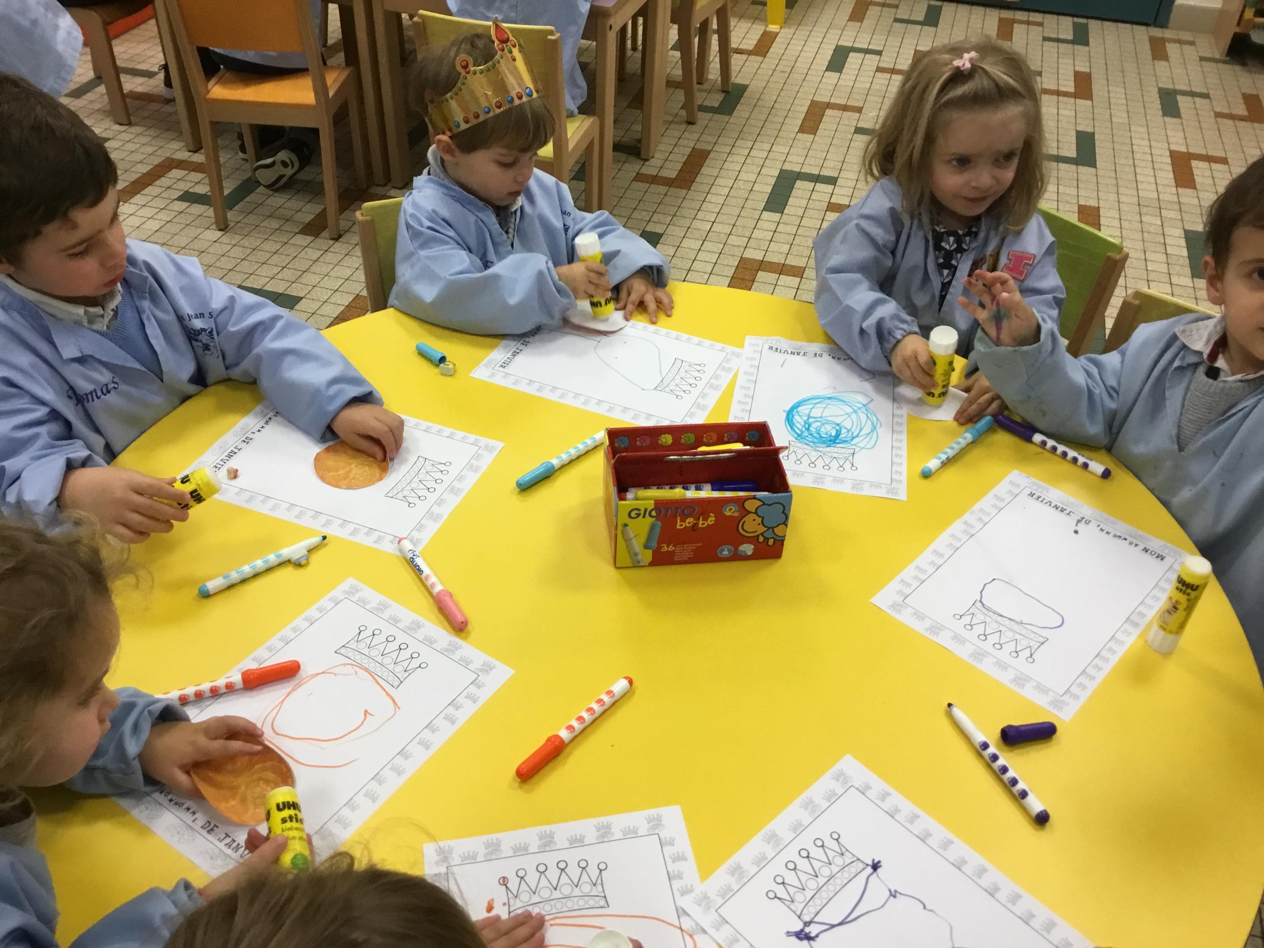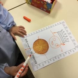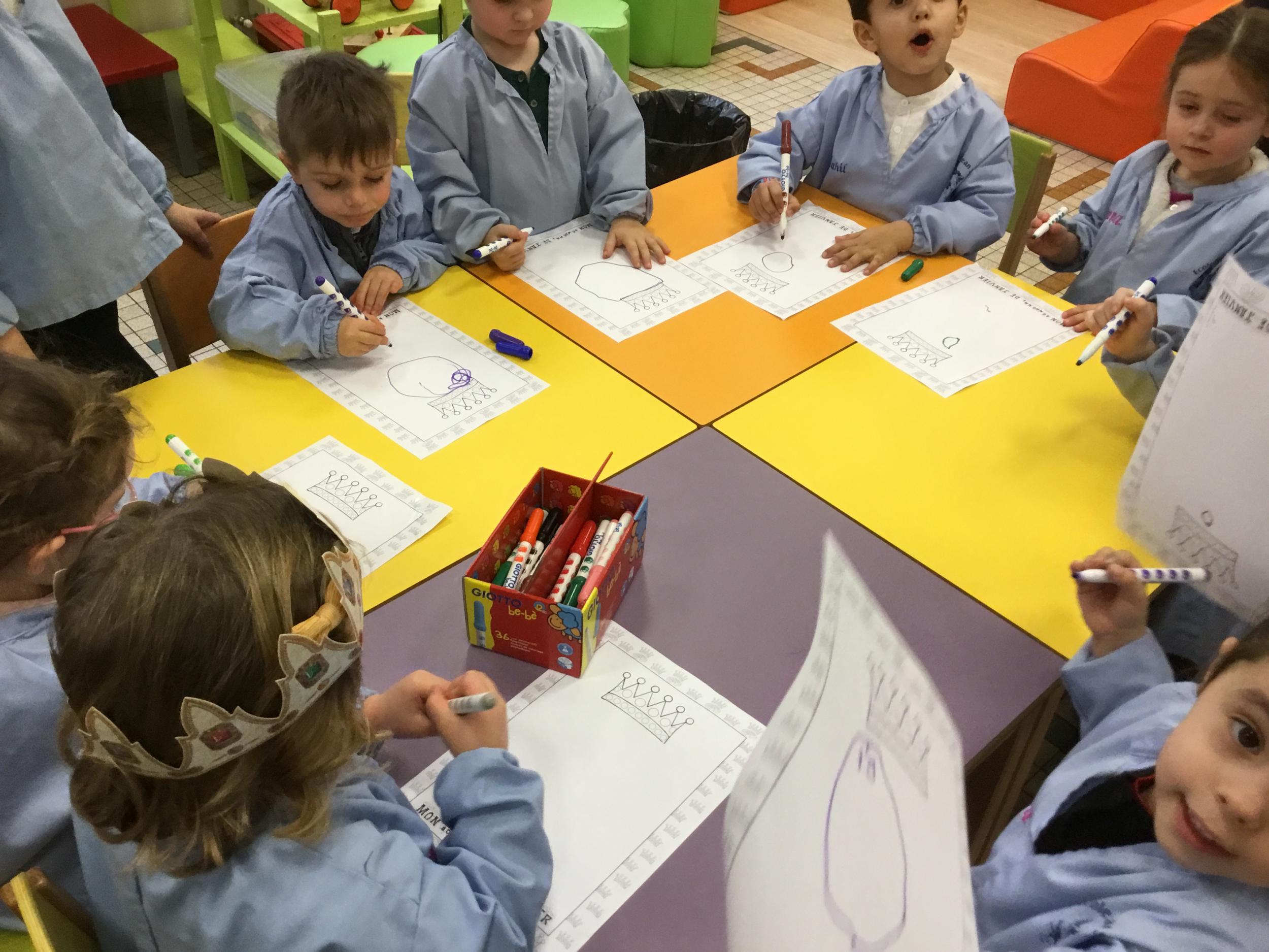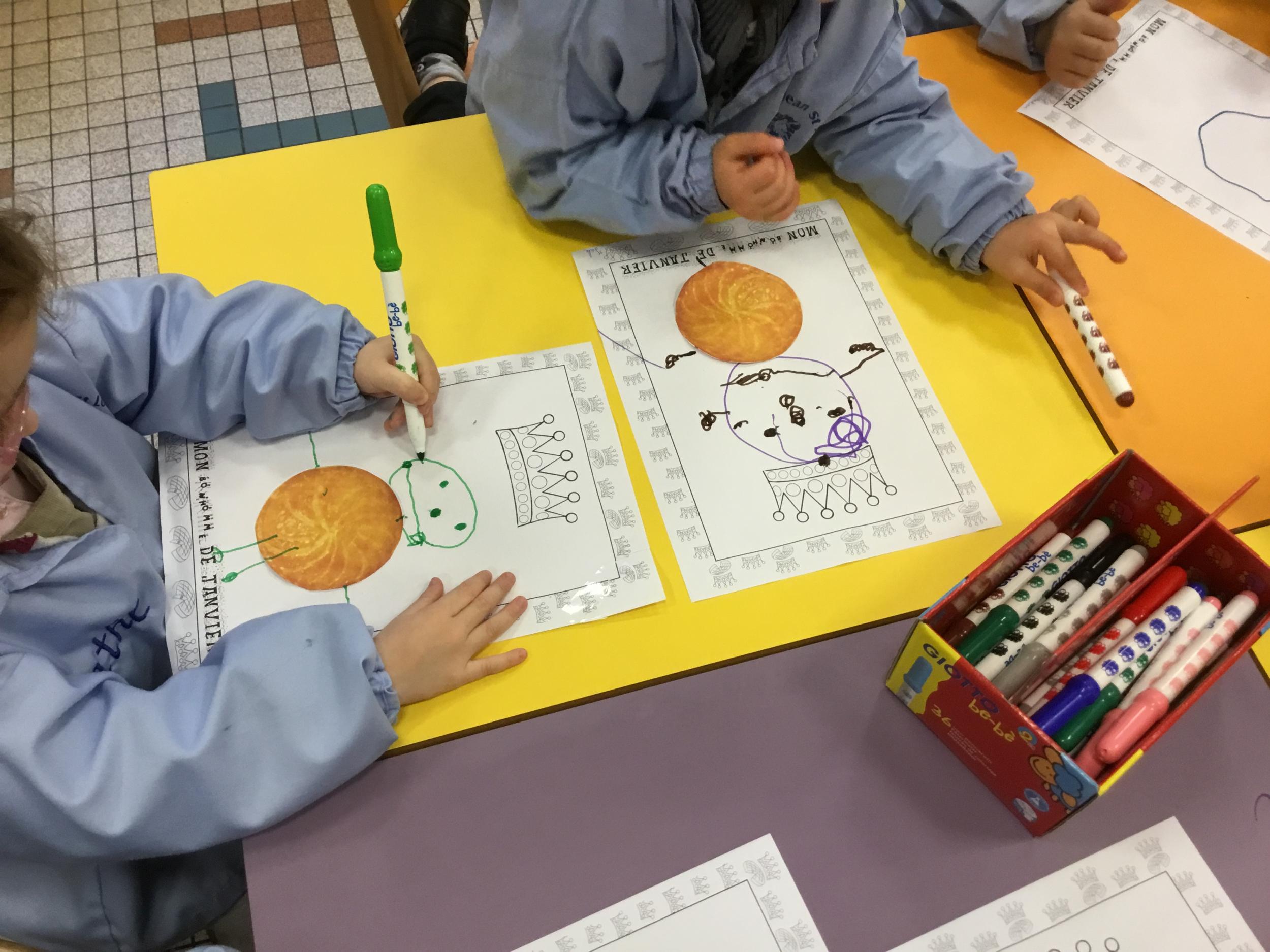 Ce mois-ci le bonhomme a un drôle de ventre en forme de galette et une bien jolie couronne. Ils ont d’abord dessiné une tête toute ronde sans oublier les yeux, la bouche, le nez et les oreilles pour certains élèves. Ensuite ils ont collé la galette et dessiné les bras et les jambes. Le résultat est magnifique.