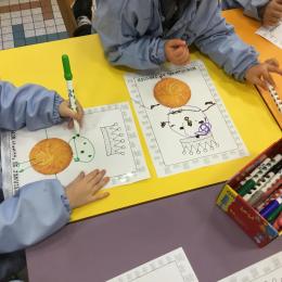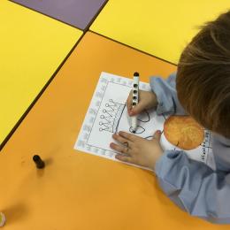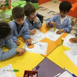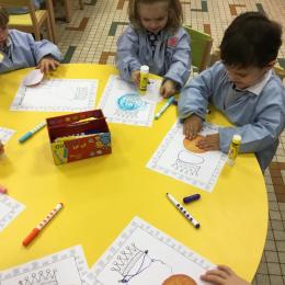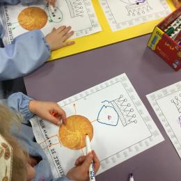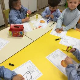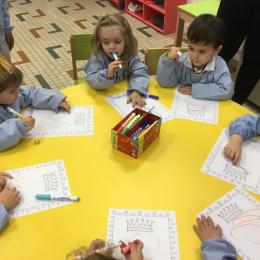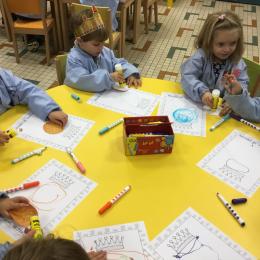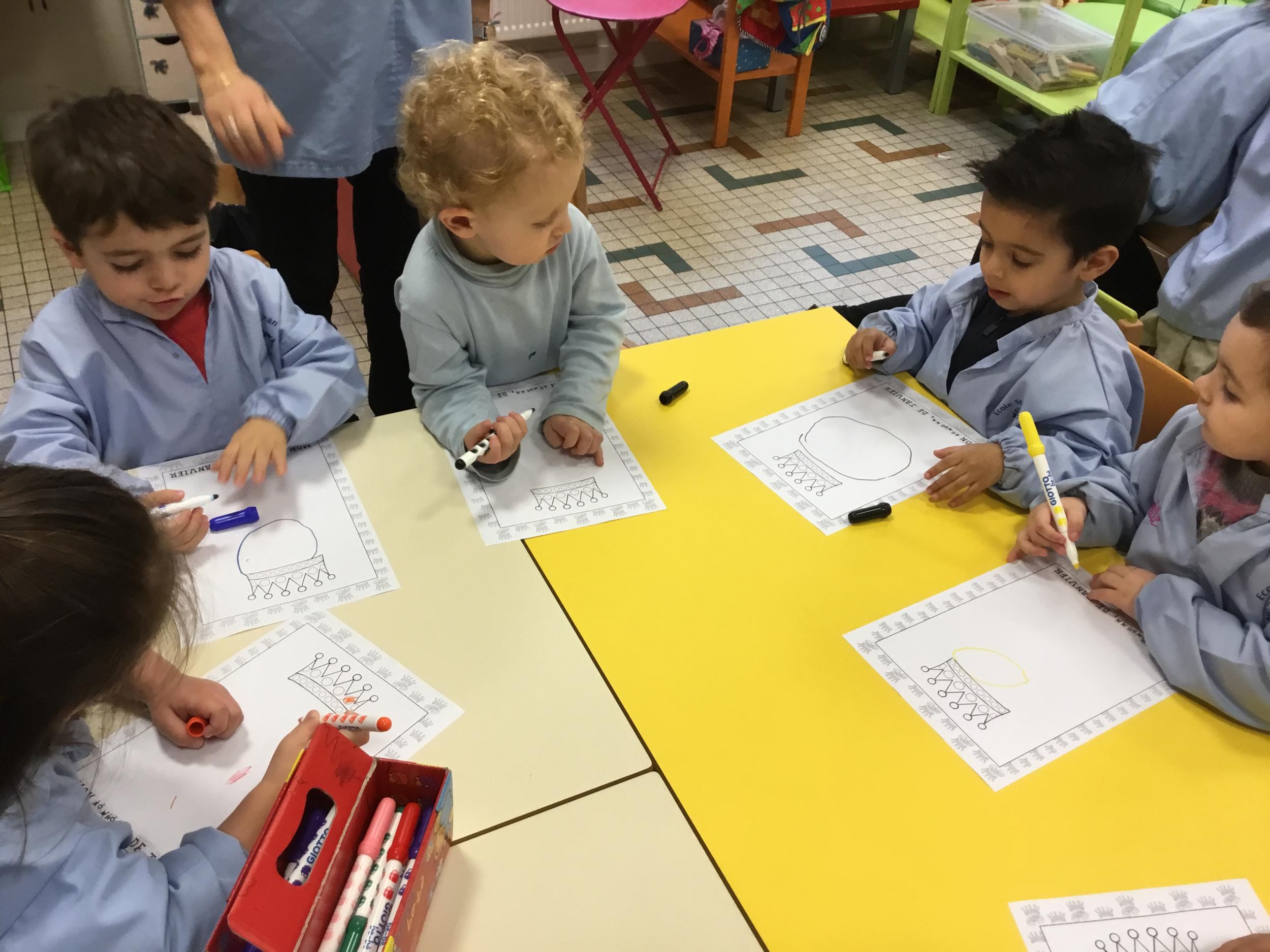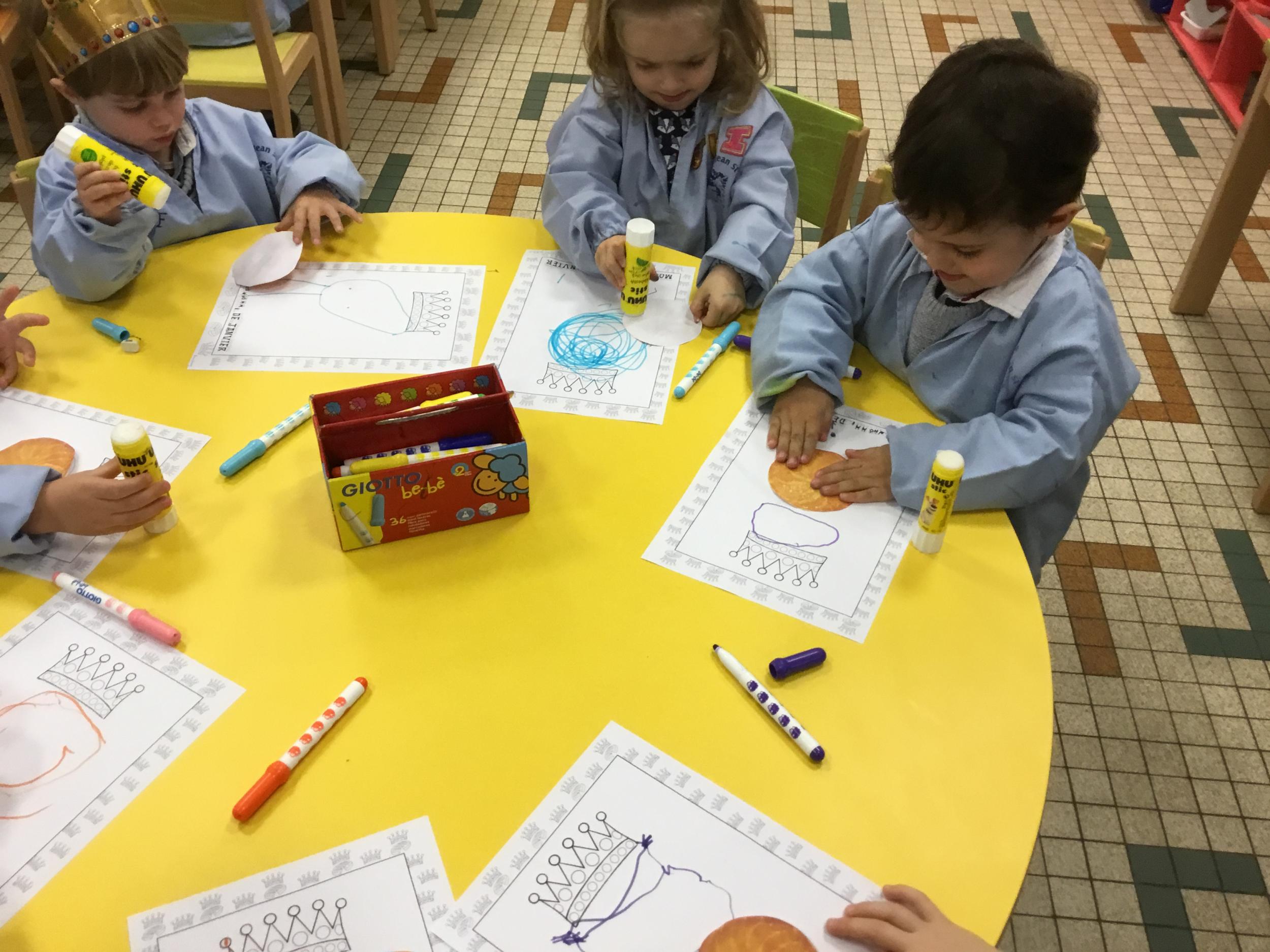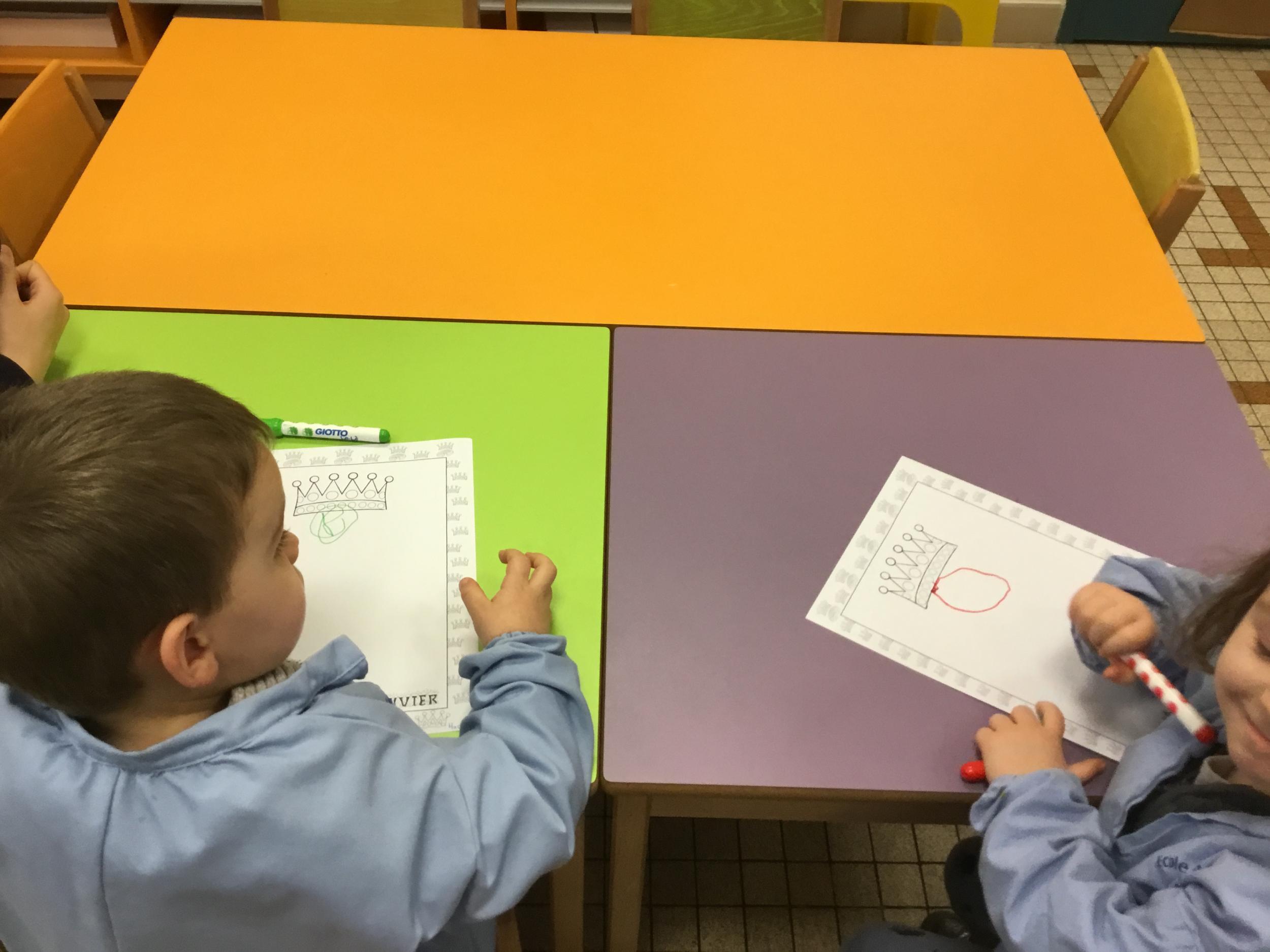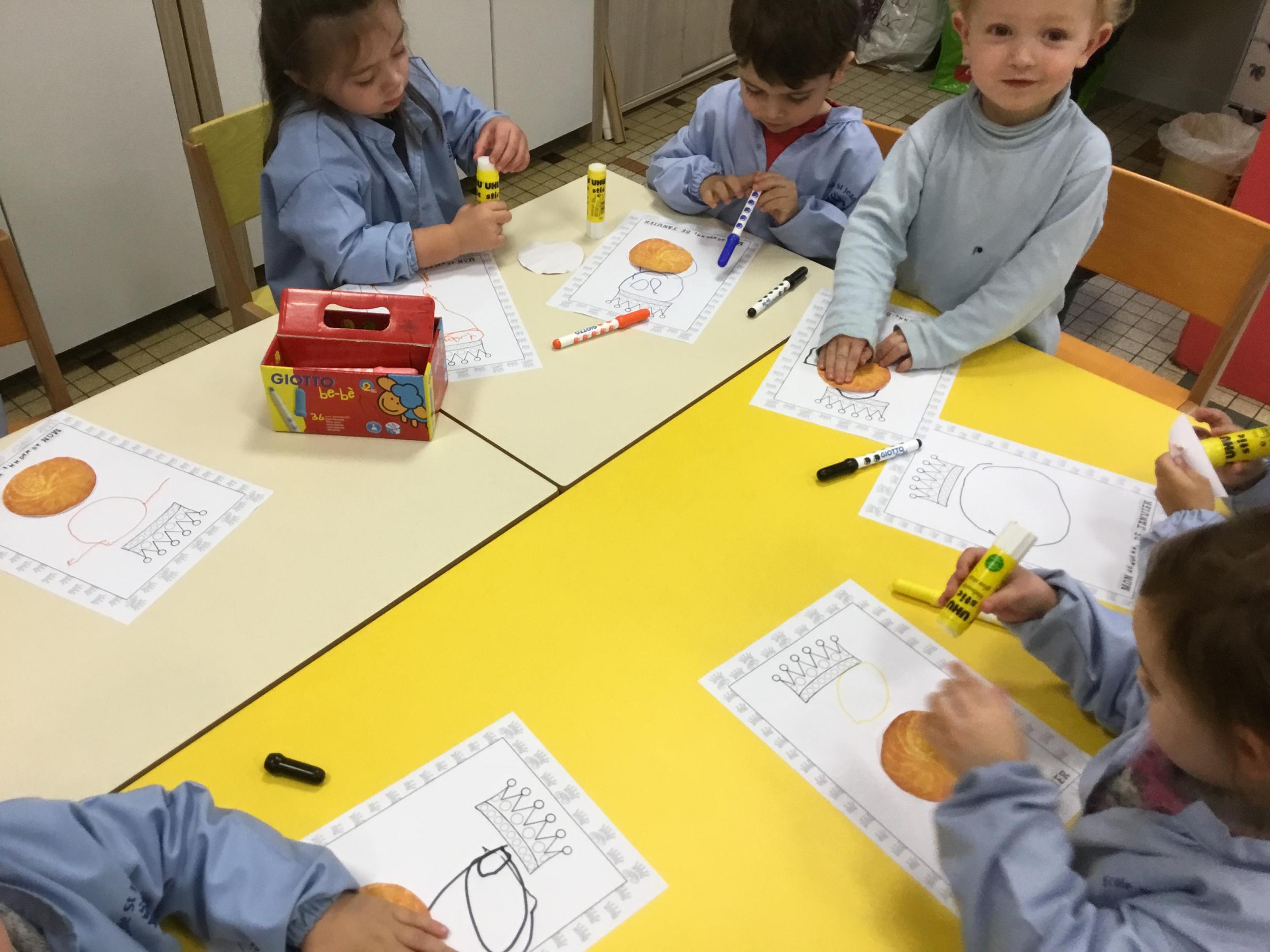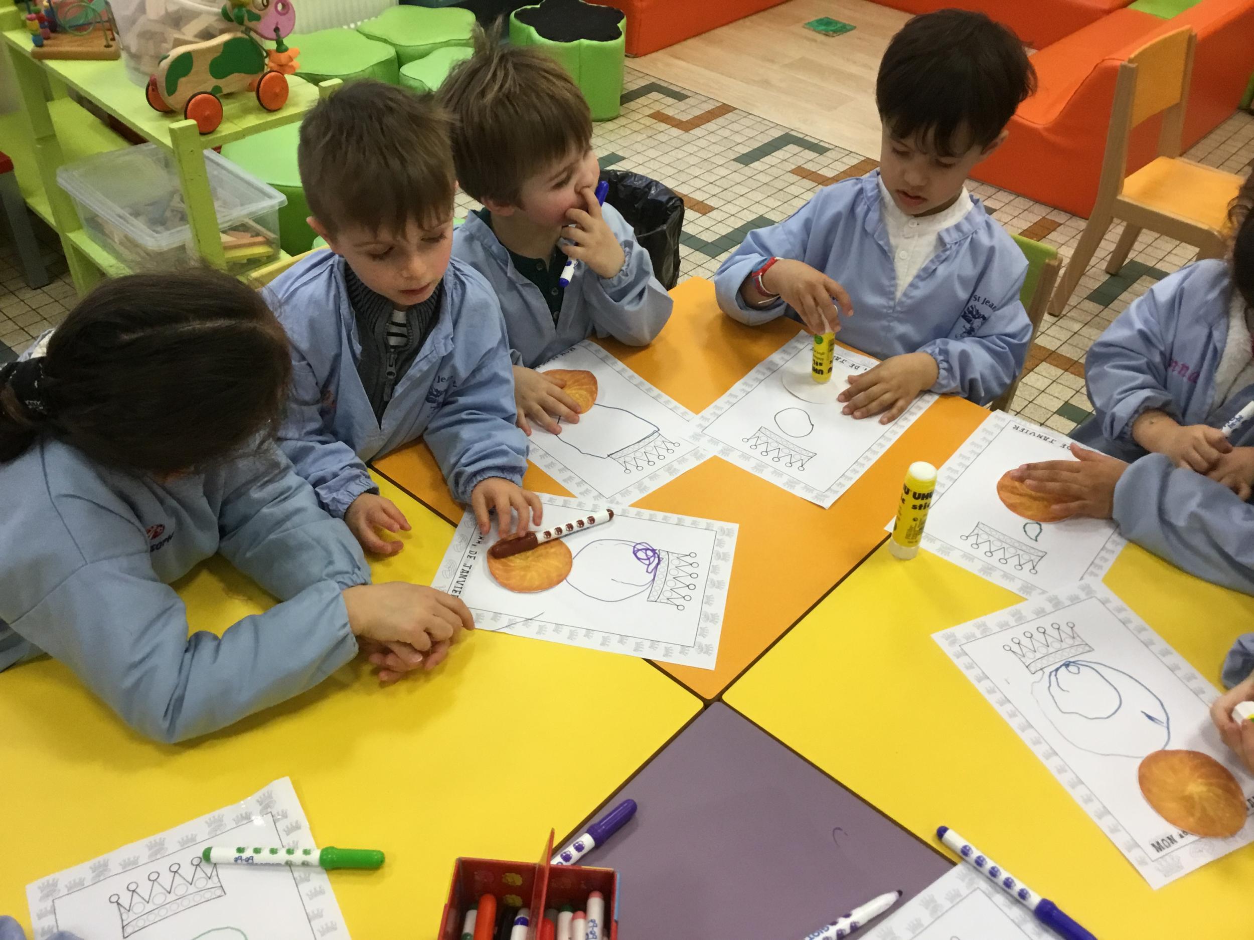 Ce mois-ci le bonhomme a un drôle de ventre en forme de galette et une bien jolie couronne. Ils ont d’abord dessiné une tête toute ronde sans oublier les yeux, la bouche, le nez et les oreilles pour certains élèves. Ensuite ils ont collé la galette et dessiné les bras et les jambes. Le résultat est magnifique.