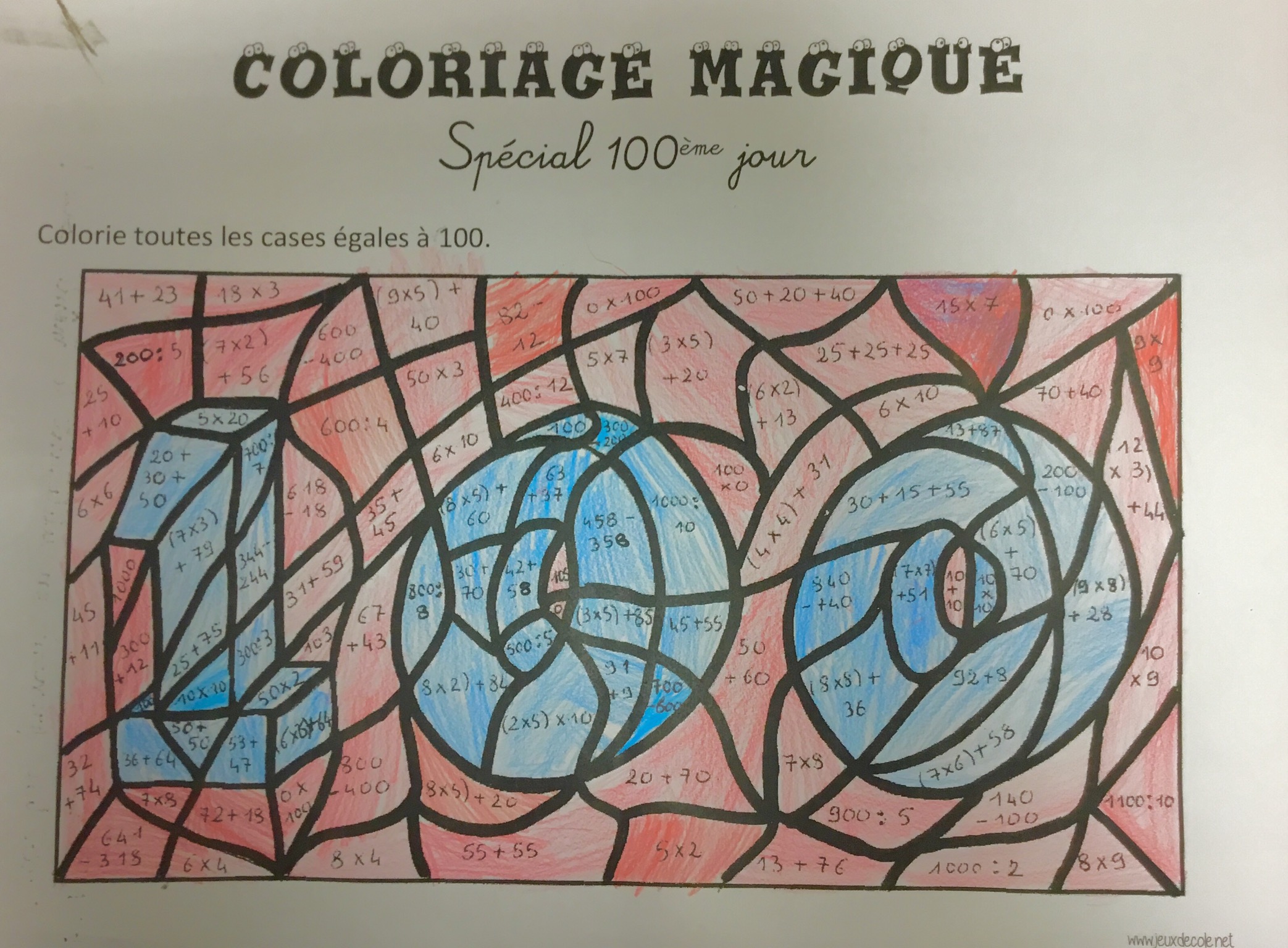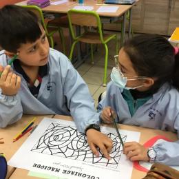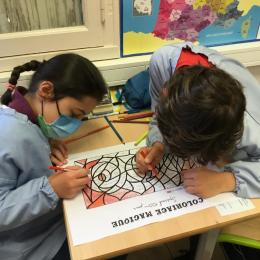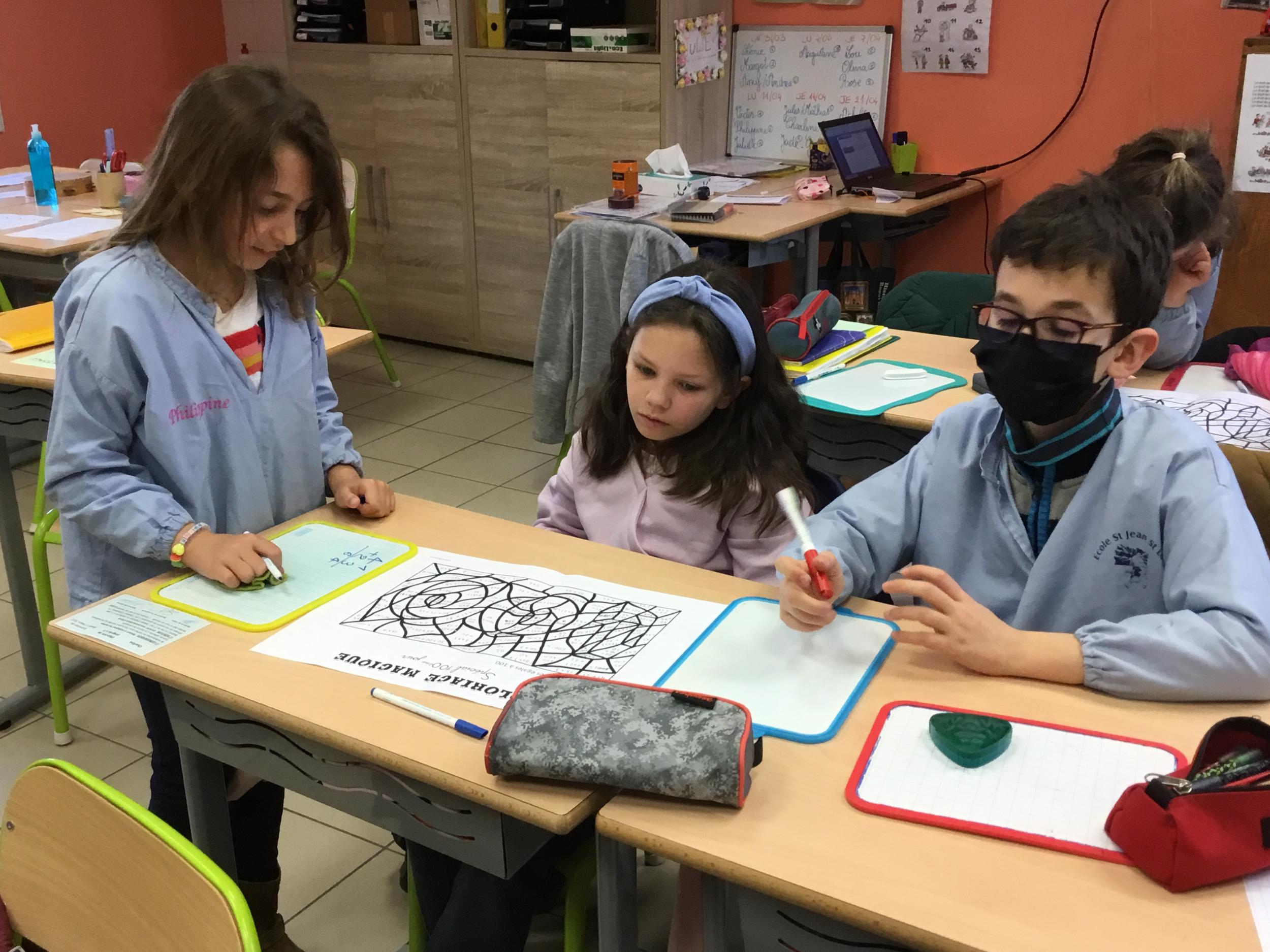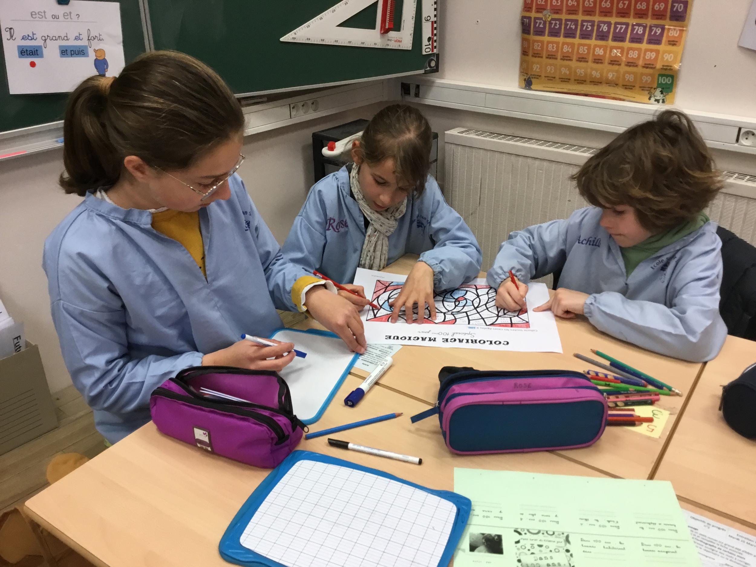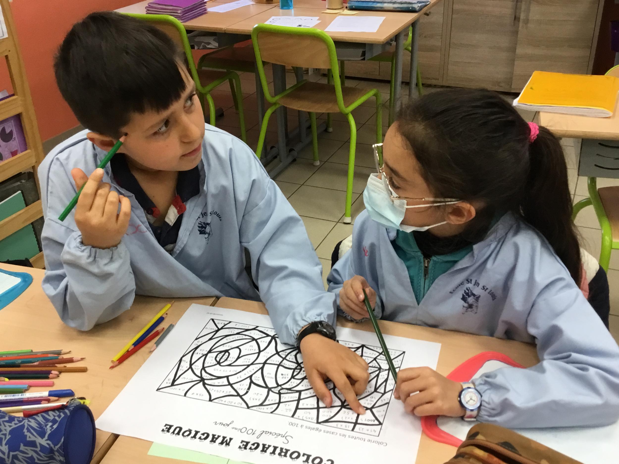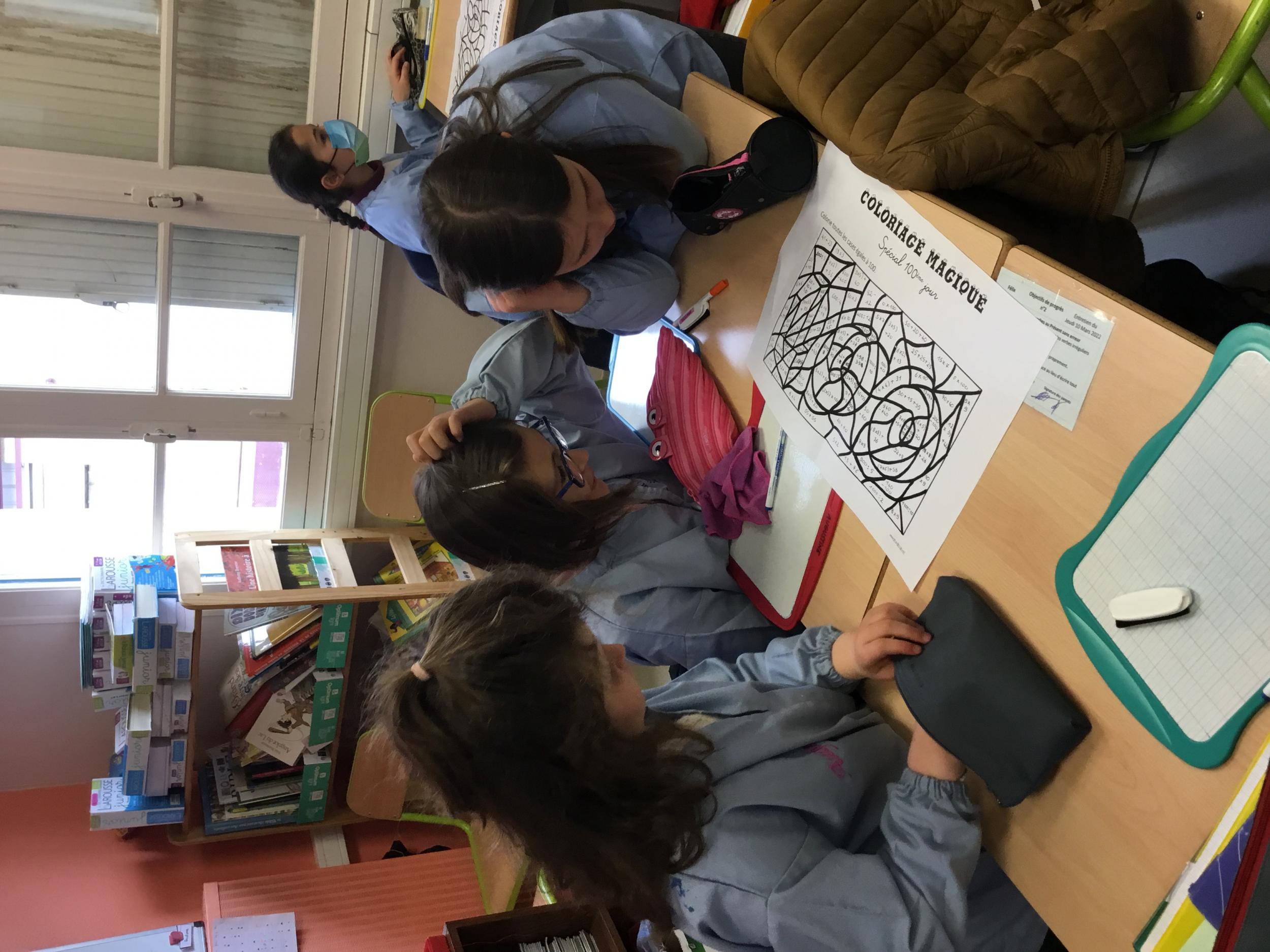 Enfin, par équipes mixtes (1 CE1 avec 2 CM1), ils ont collaboré pour faire un coloriage magique, composé de calculs faciles et de quelques divisions... pour les deux niveaux.