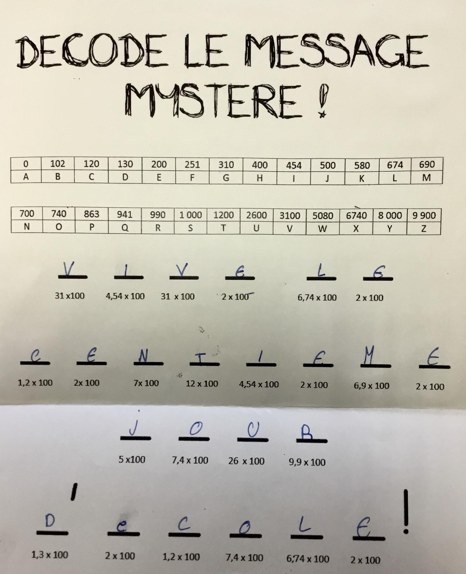 Un message à décrypter à l’aide d’un code a constitué une bonne raison pour les CM1 d’apprendre à multiplier un nombre décimal par 10, 100 ou 1000...