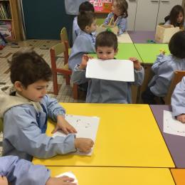 Nous travaillons les lettres, le son des lettres ( ce qu’elles chantent) mais aussi leur forme et le sens de leur graphie.