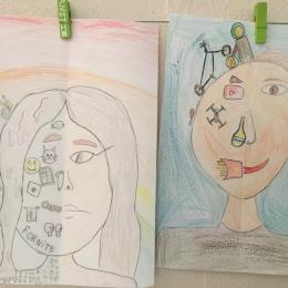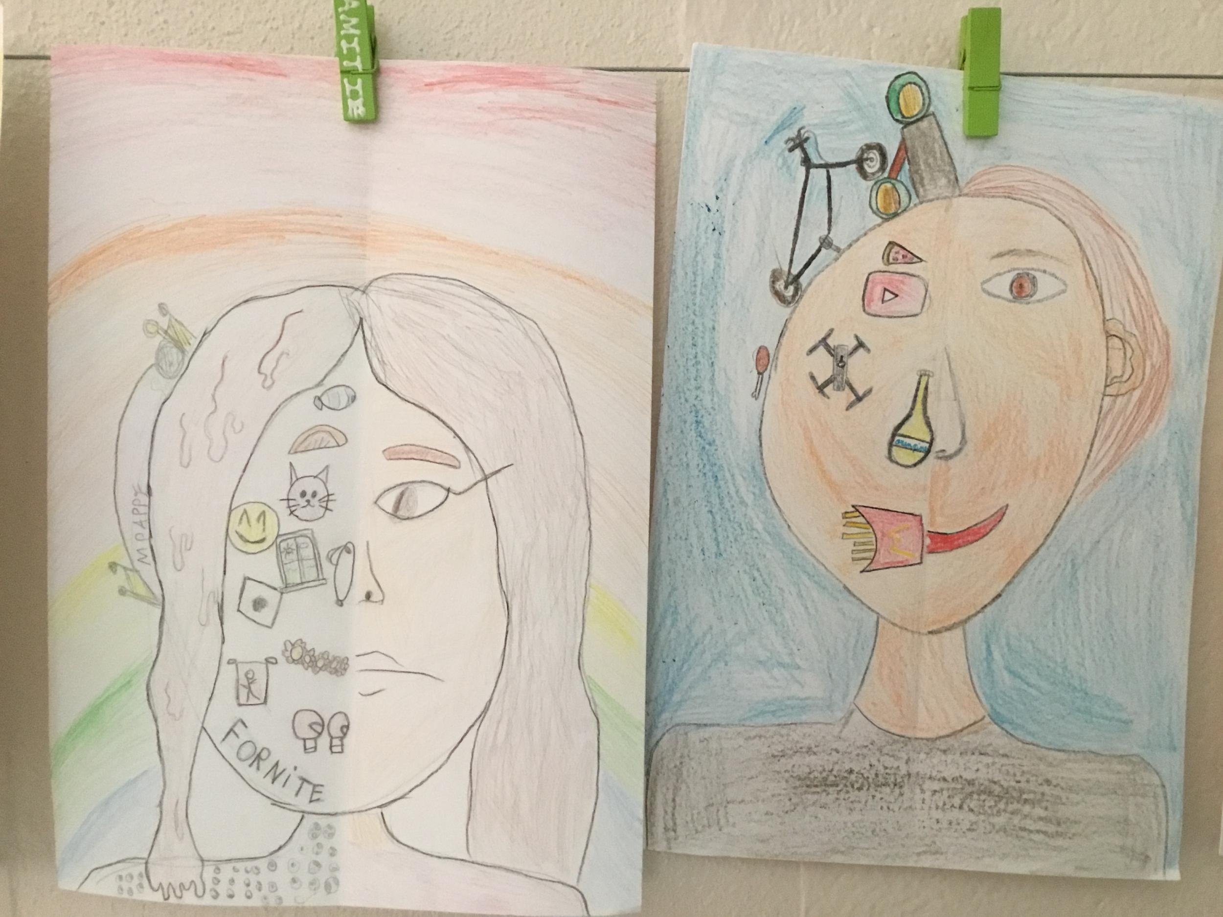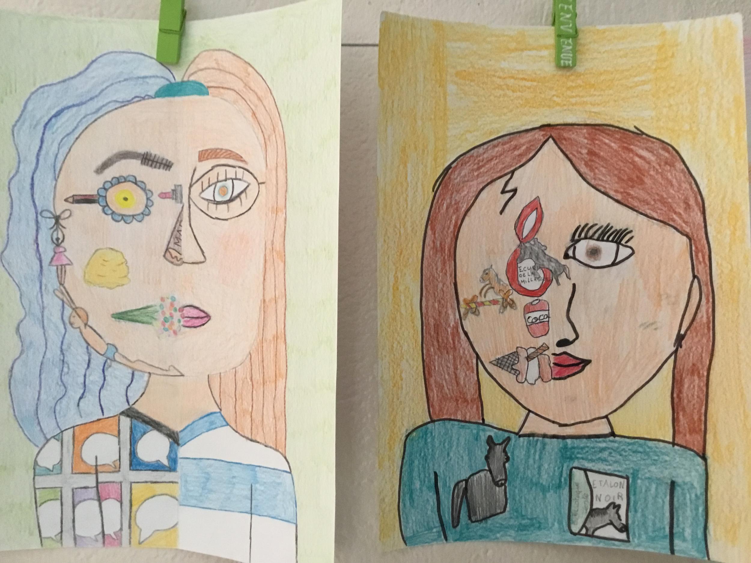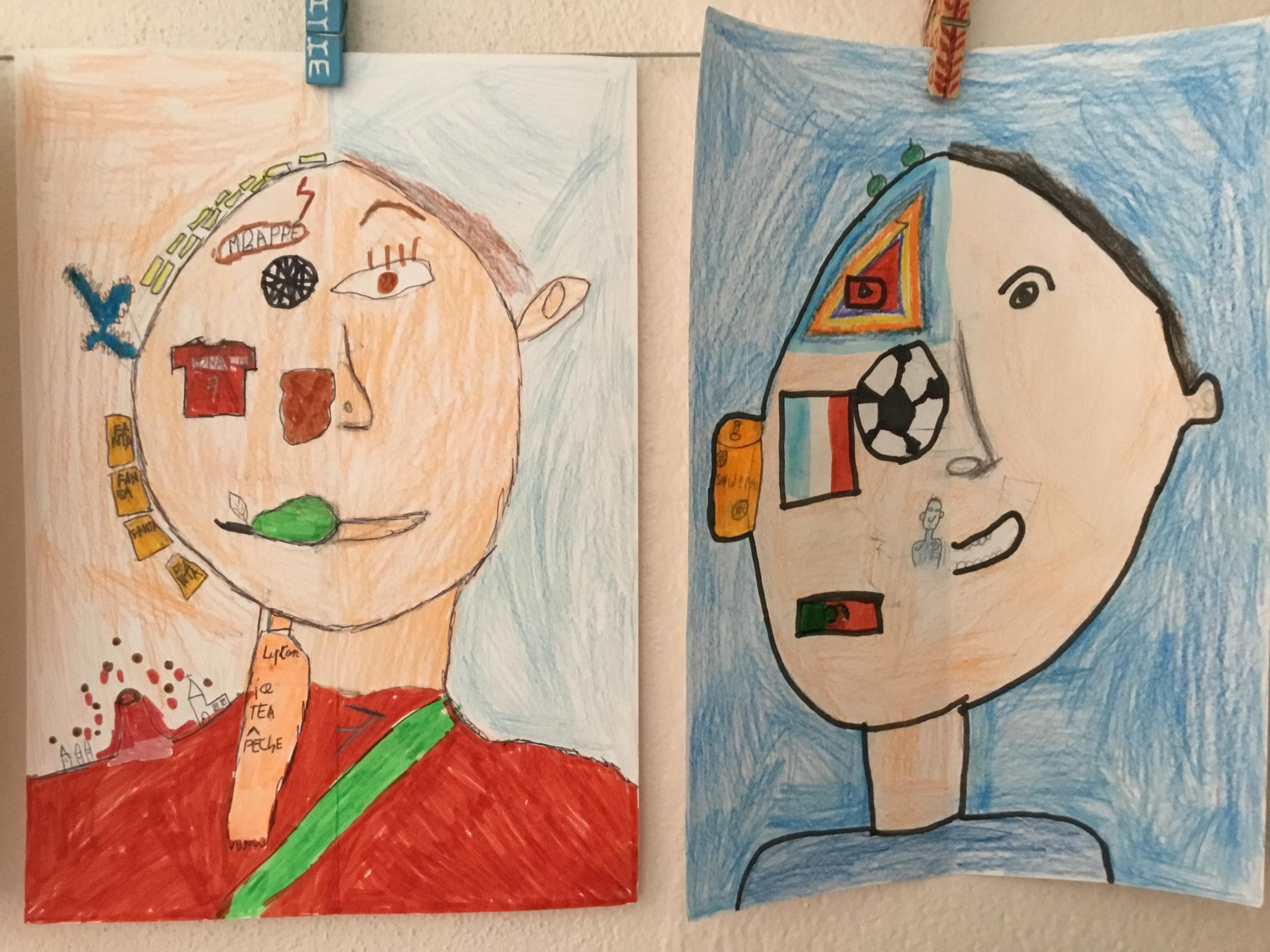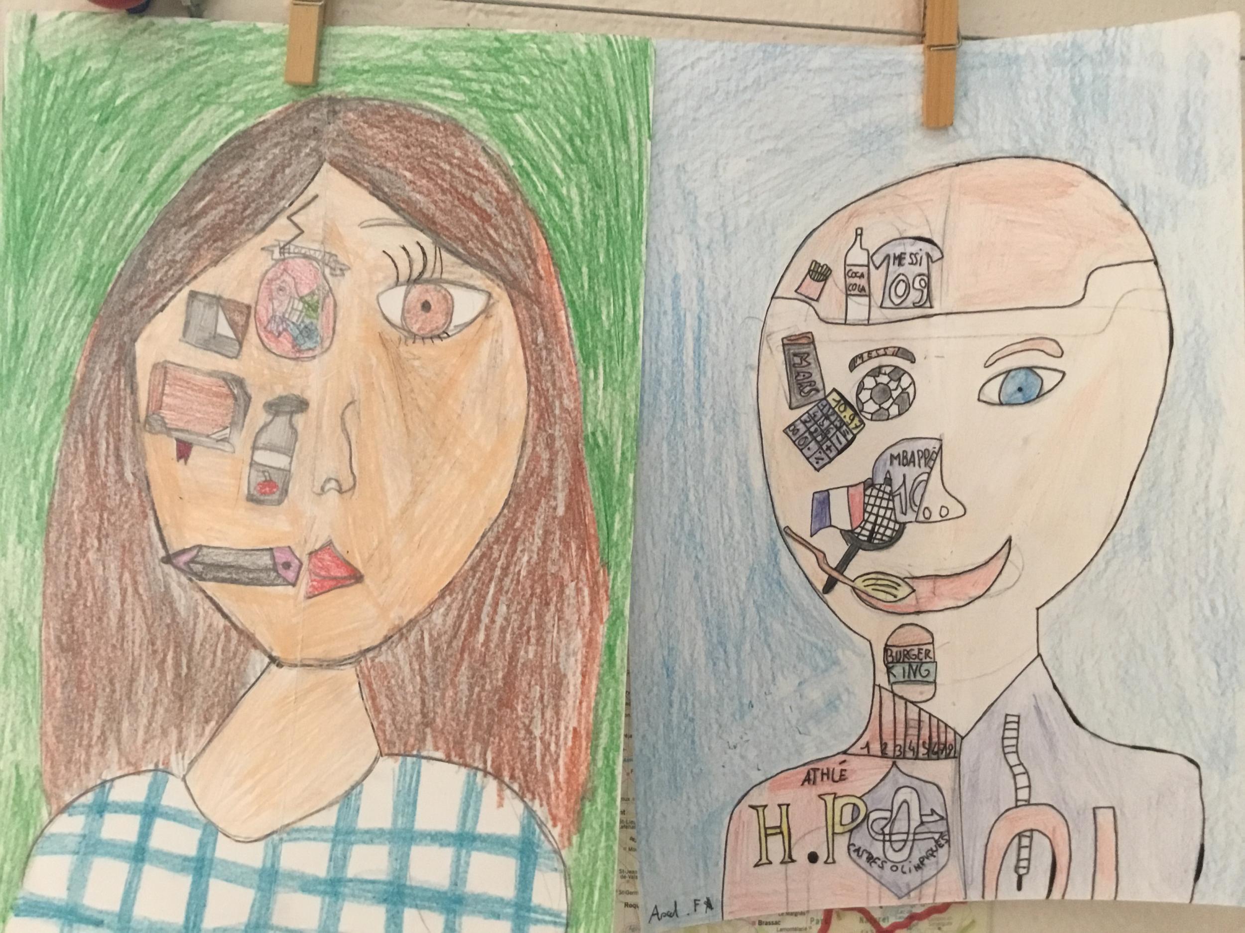 Depuis le début de l’année, les élèves travaillent autour du portrait. Voici leurs nouvelles œuvres. Un portrait qui permet aux autres élèves de mieux connaitre leurs camarades; un portrait qui montre pour une moitié du visage un portrait physique et pour l’autre moitié ce qu’ils sont. Au préalable, un travail de réflexion a été réalisé sur ce qu’ils aiment faire, lire, regarder, manger …