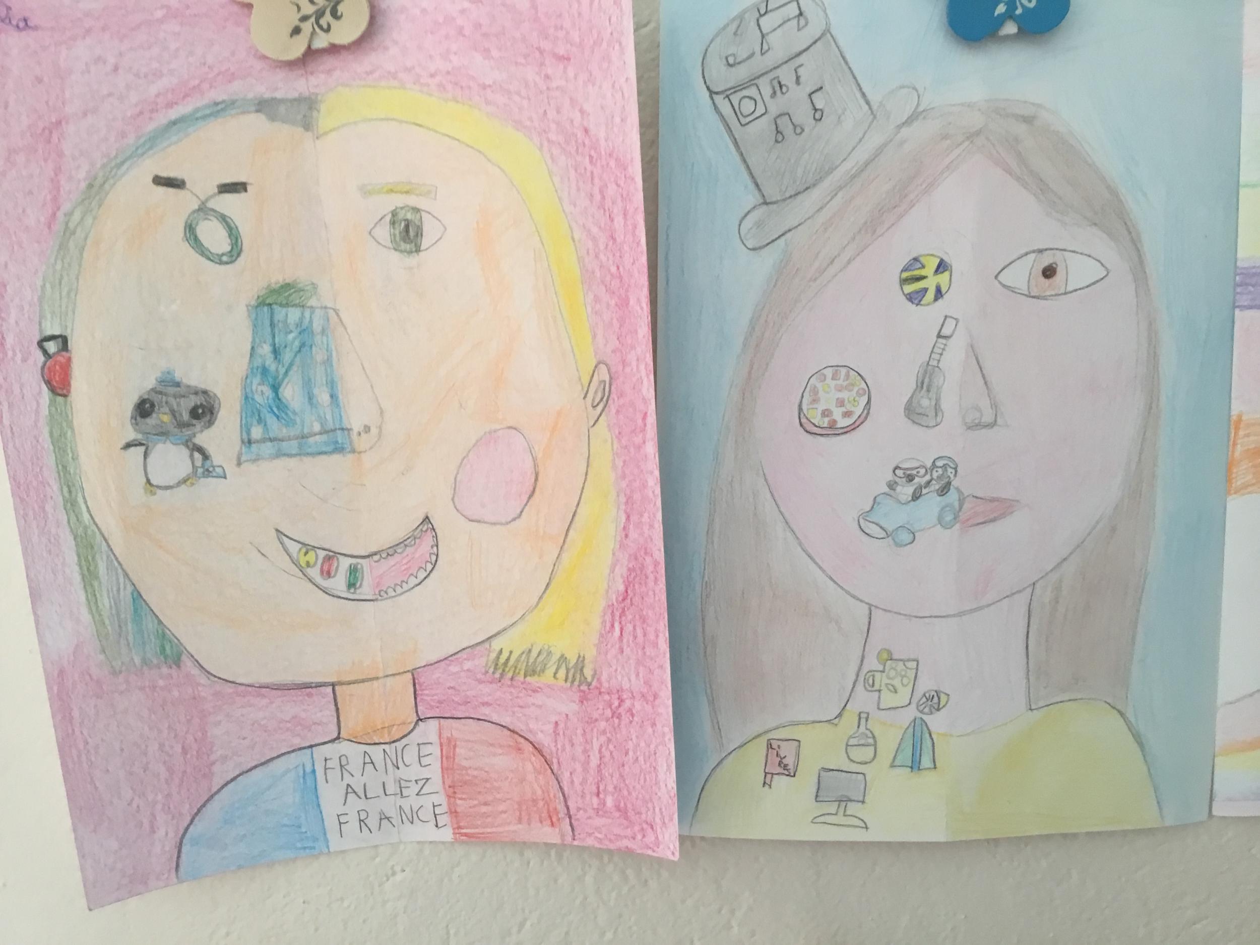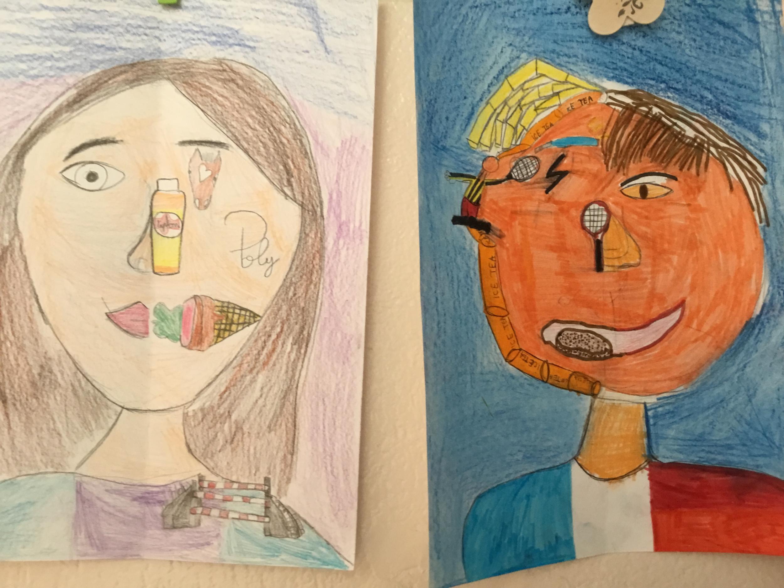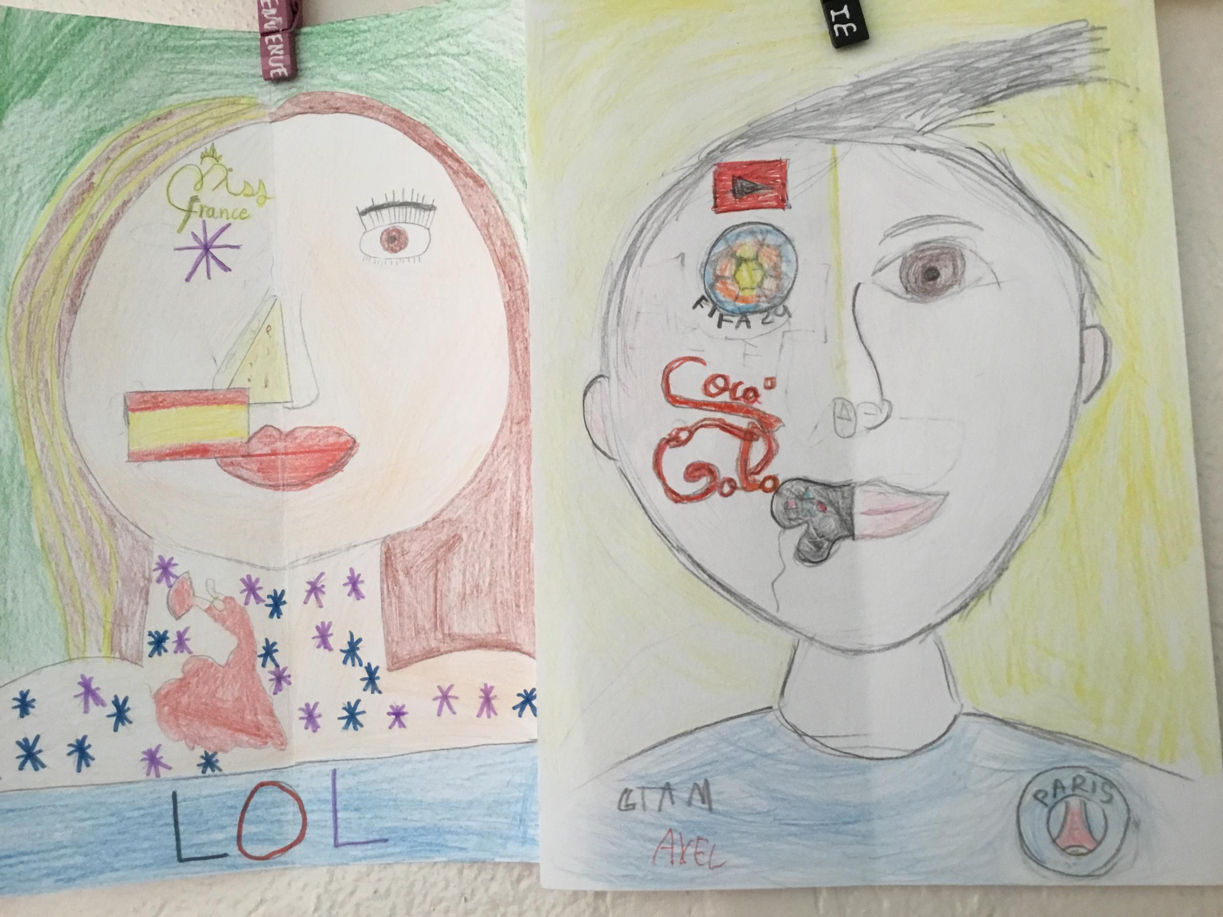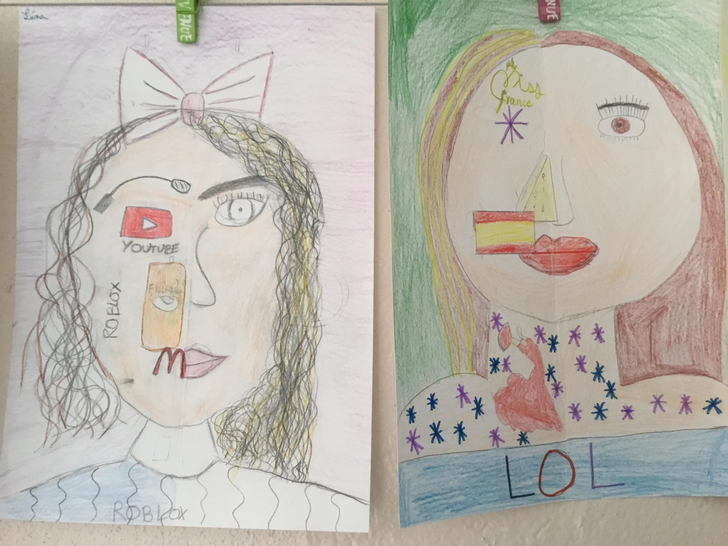 Depuis le début de l’année, les élèves travaillent autour du portrait. Voici leurs nouvelles œuvres. Un portrait qui permet aux autres élèves de mieux connaitre leurs camarades; un portrait qui montre pour une moitié du visage un portrait physique et pour l’autre moitié ce qu’ils sont. Au préalable, un travail de réflexion a été réalisé sur ce qu’ils aiment faire, lire, regarder, manger …