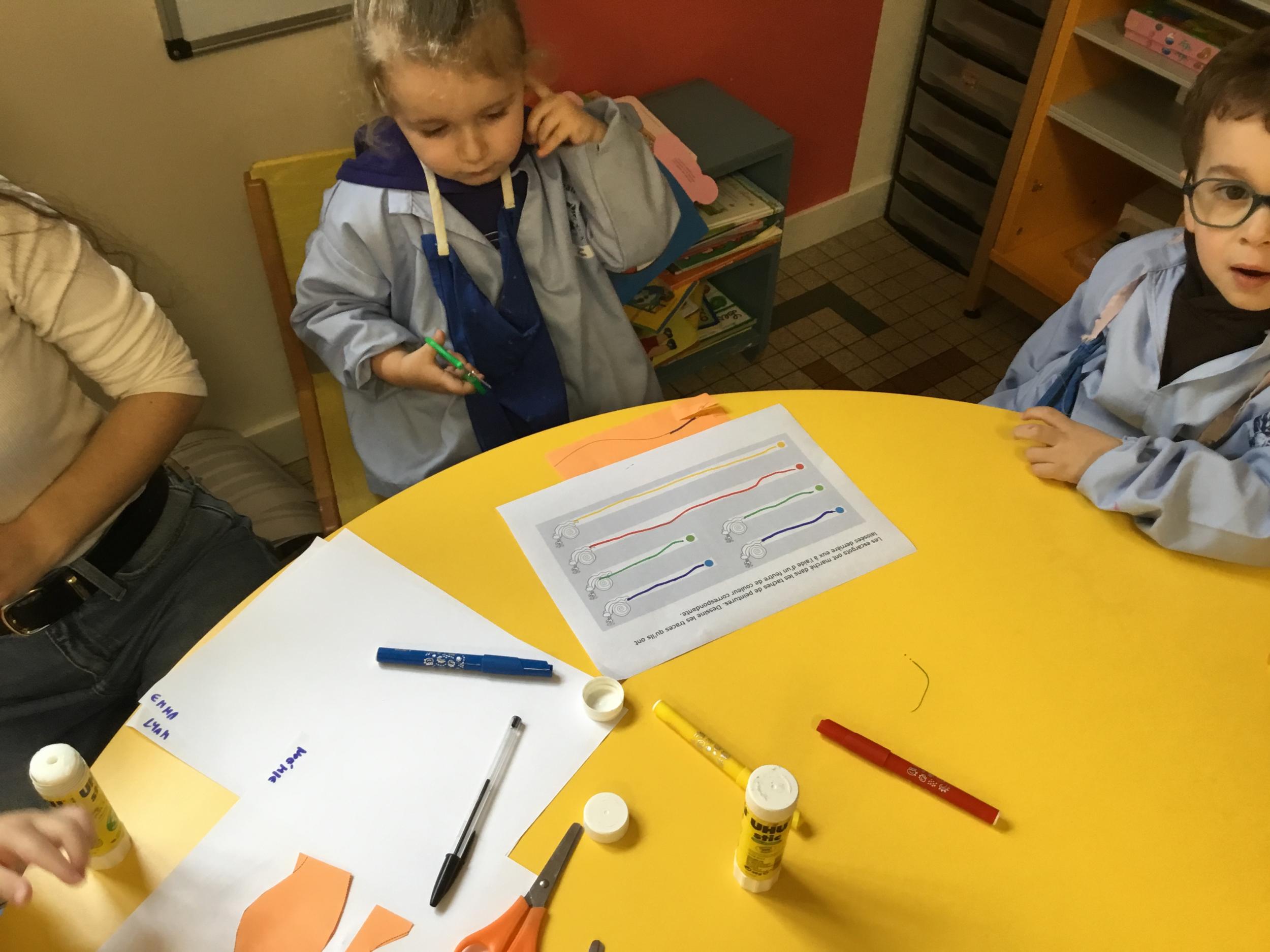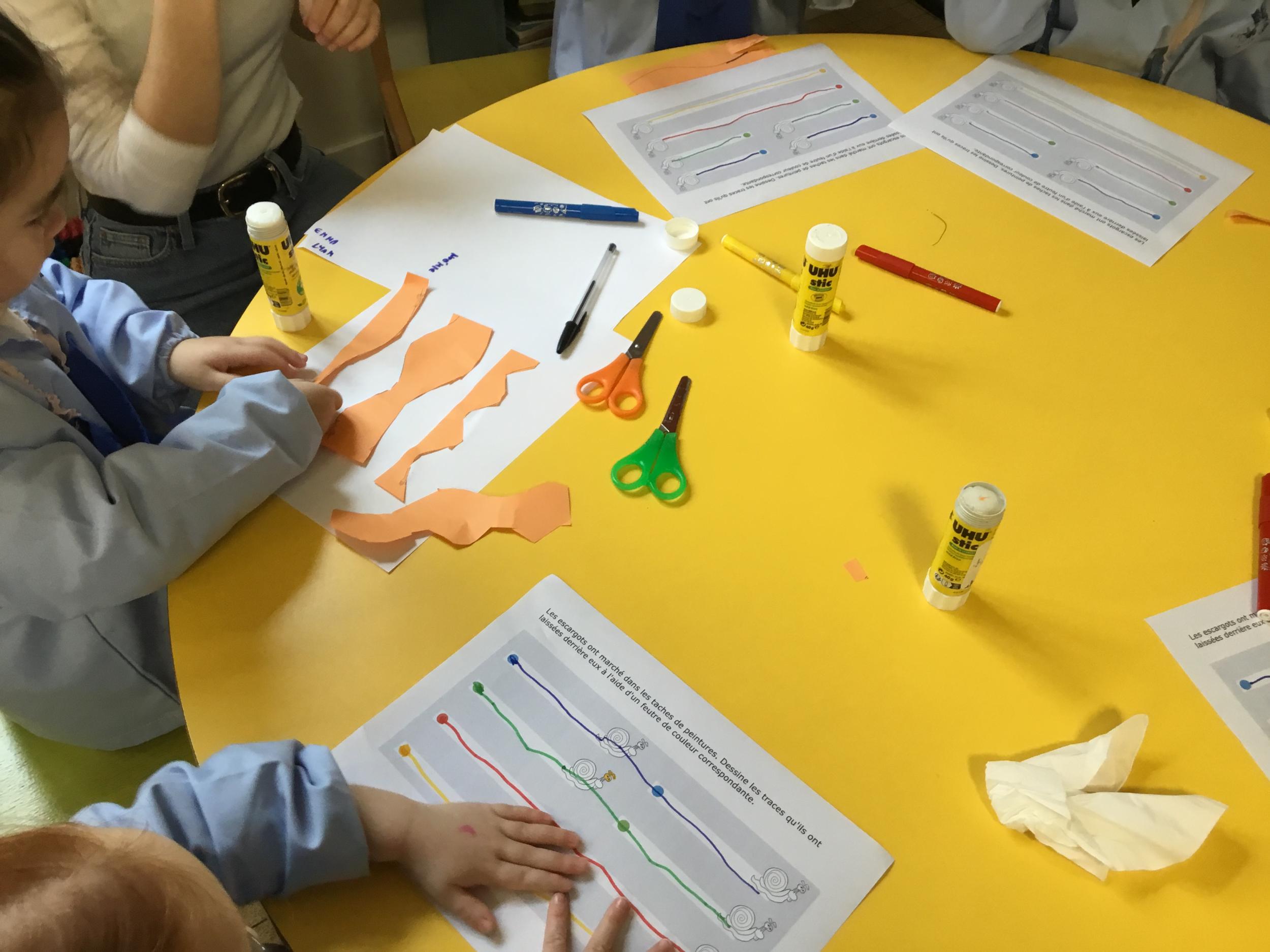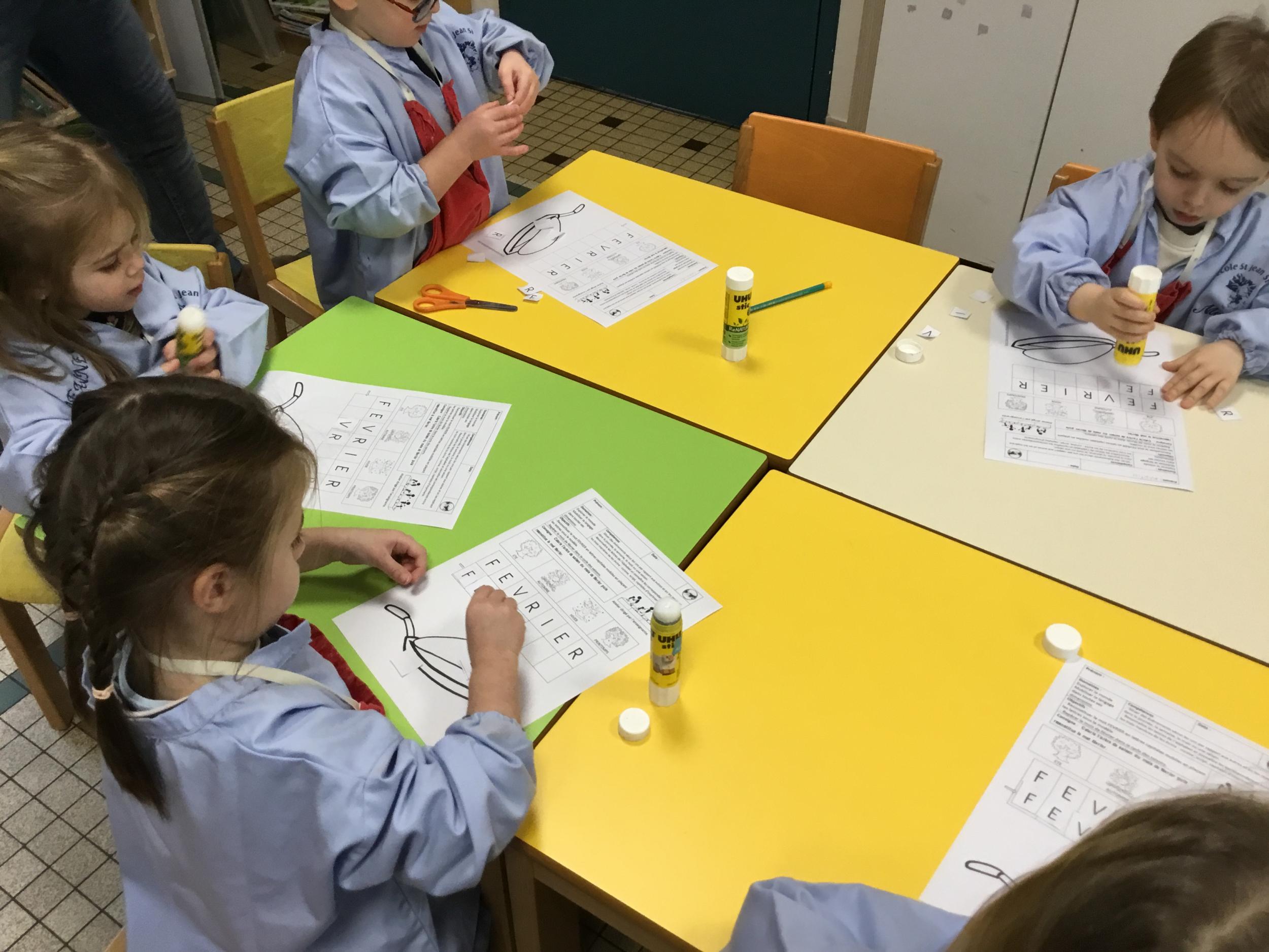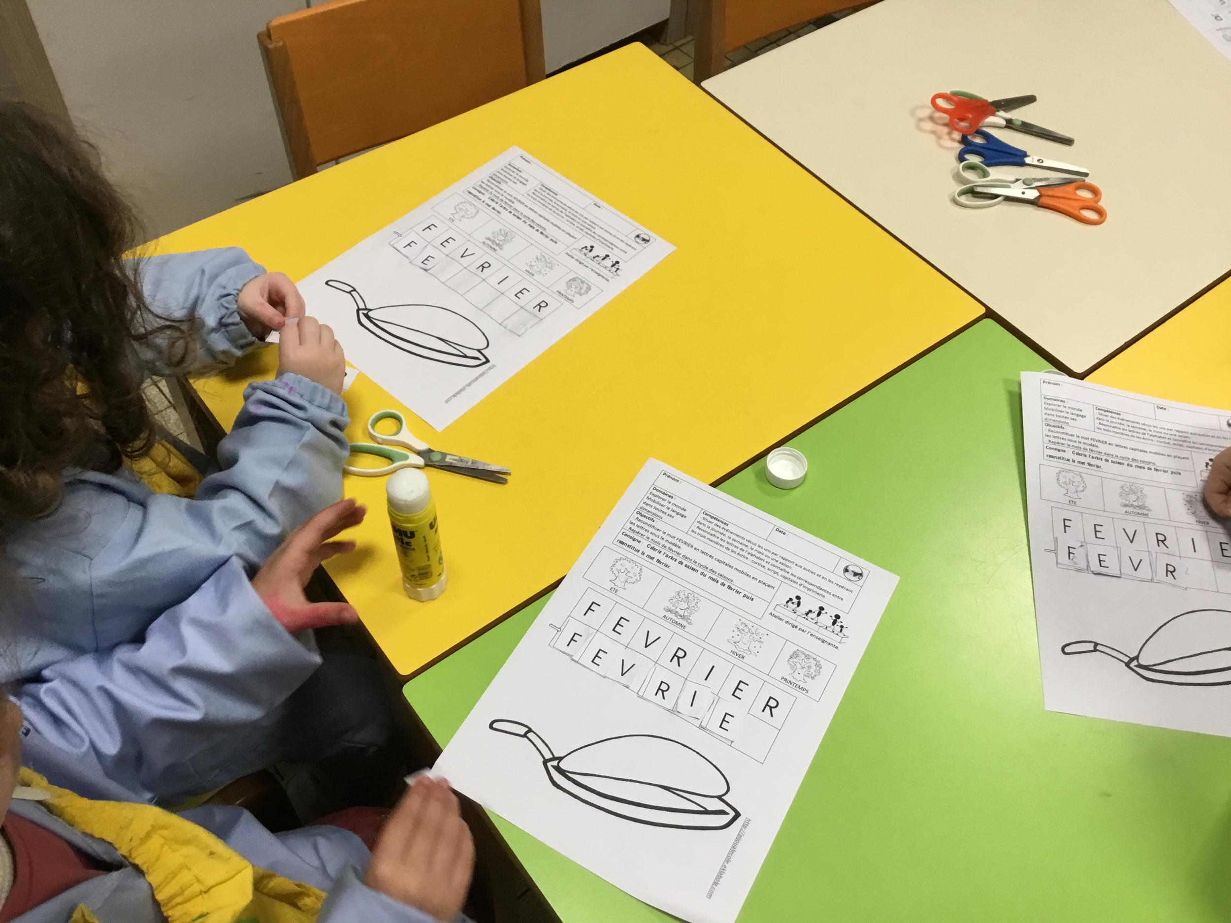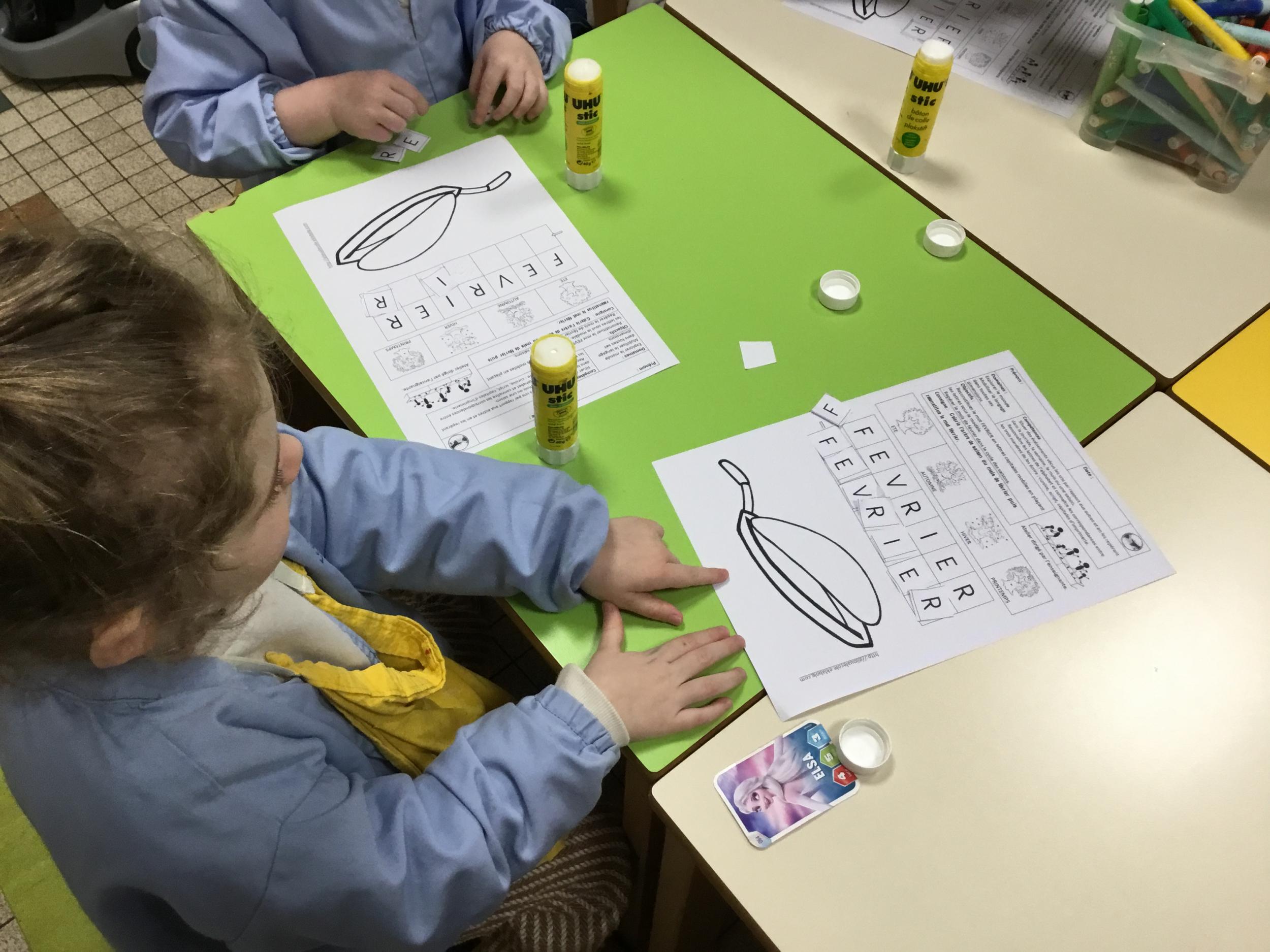 Petite et moyenne section 15/02/2026 Cette semaine découpage, graphisme et écriture du mot « Février » Aligner des gommettes Tracer des traits horizontaux en respectant un code couleur Découper La fiche du mois de février Les émotions en anglais Bravo Emma !