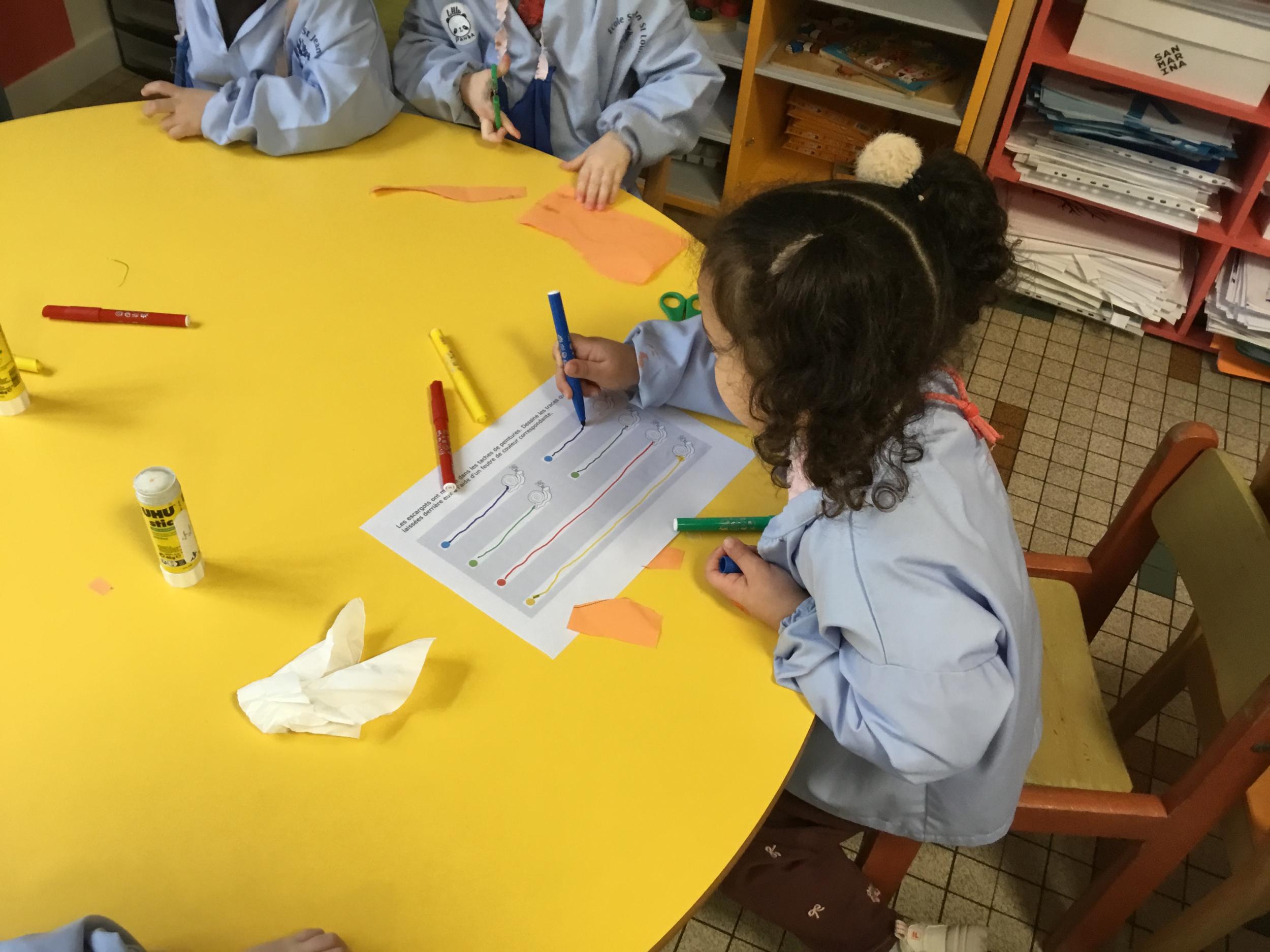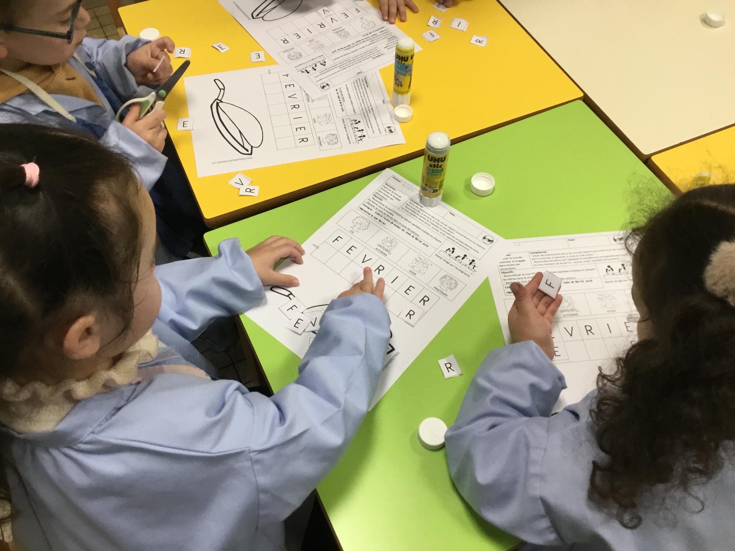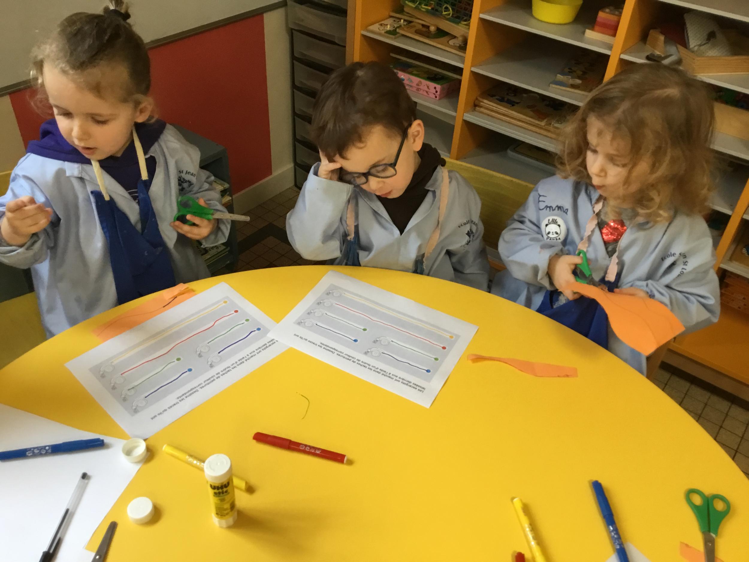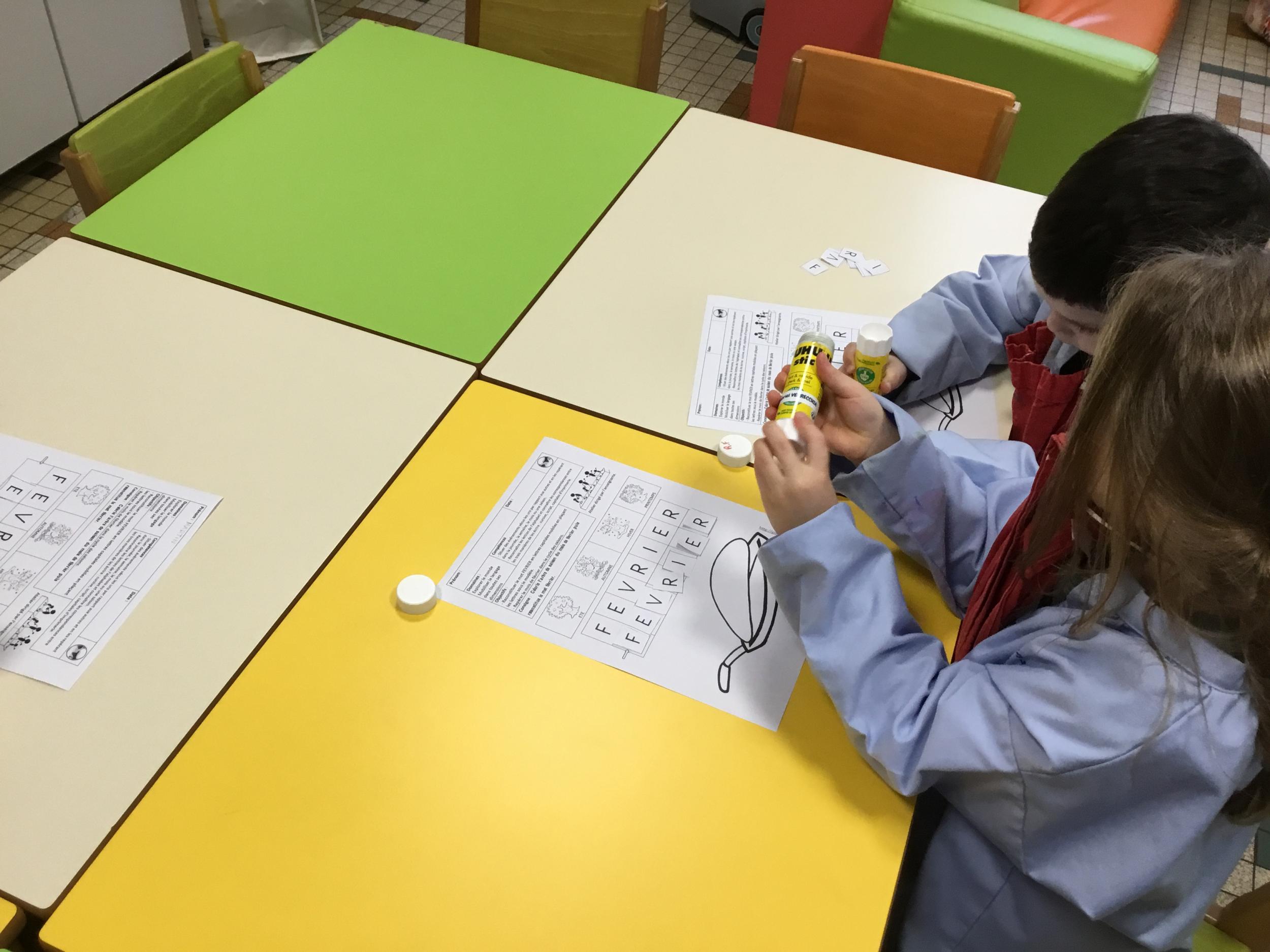 Petite et moyenne section 15/02/2026 Cette semaine découpage, graphisme et écriture du mot « Février » Aligner des gommettes Tracer des traits horizontaux en respectant un code couleur Découper La fiche du mois de février Les émotions en anglais Bravo Emma !