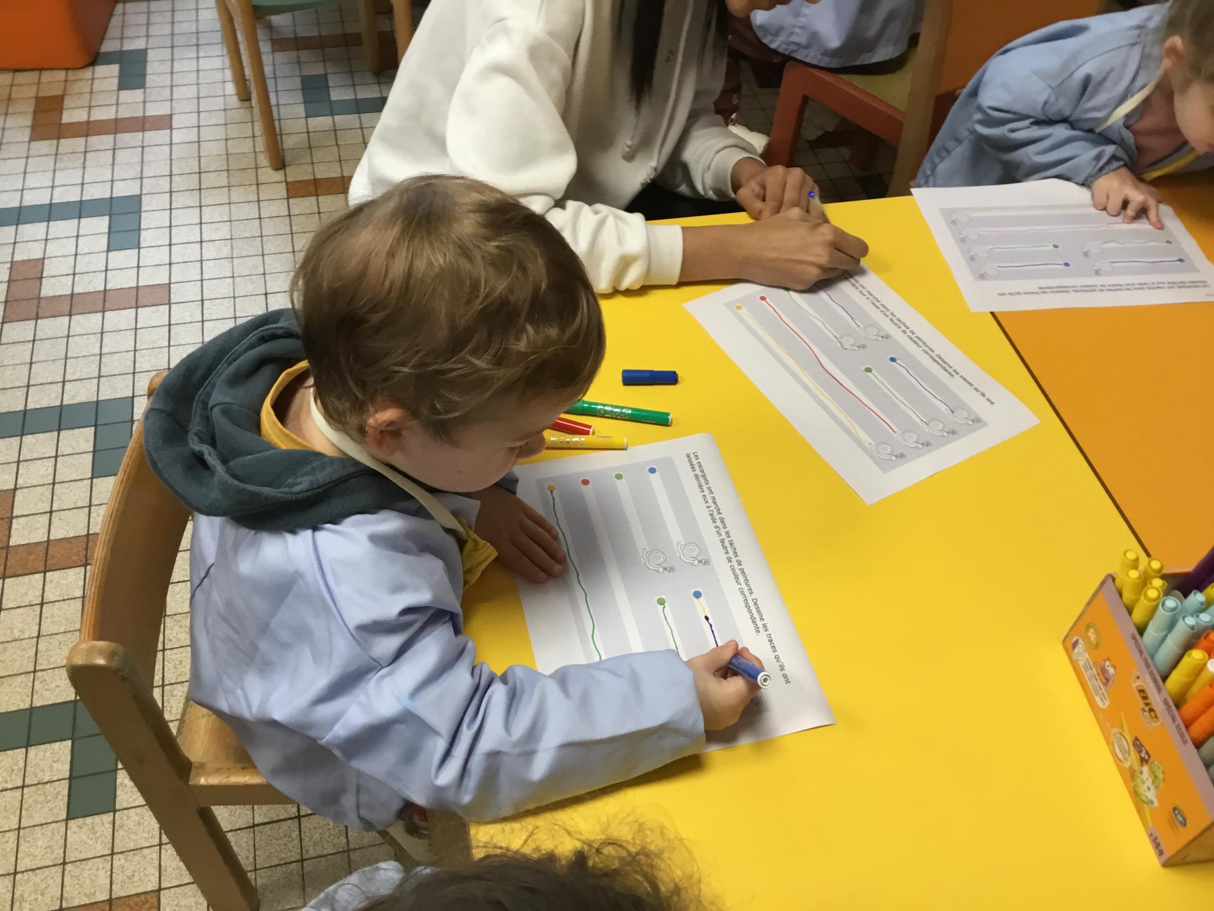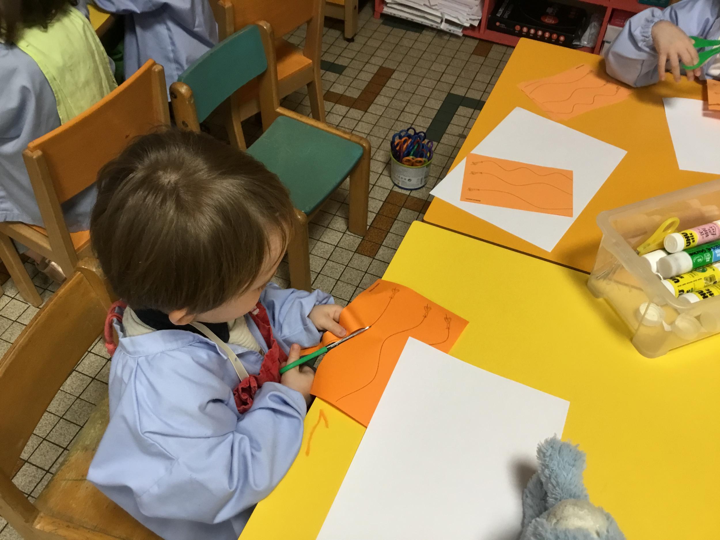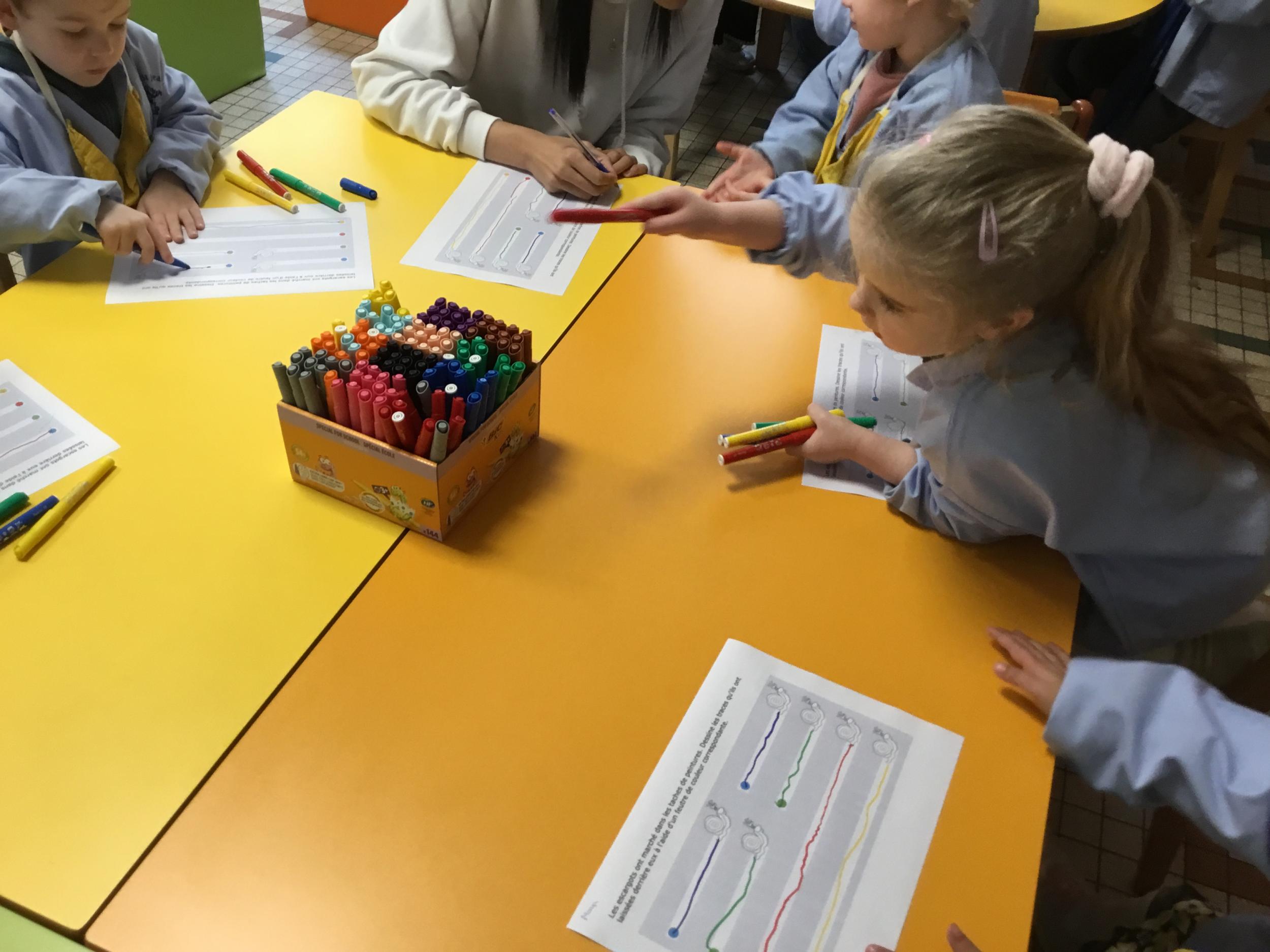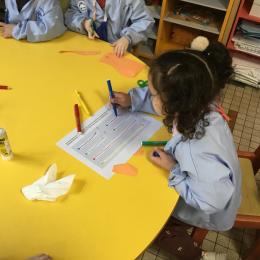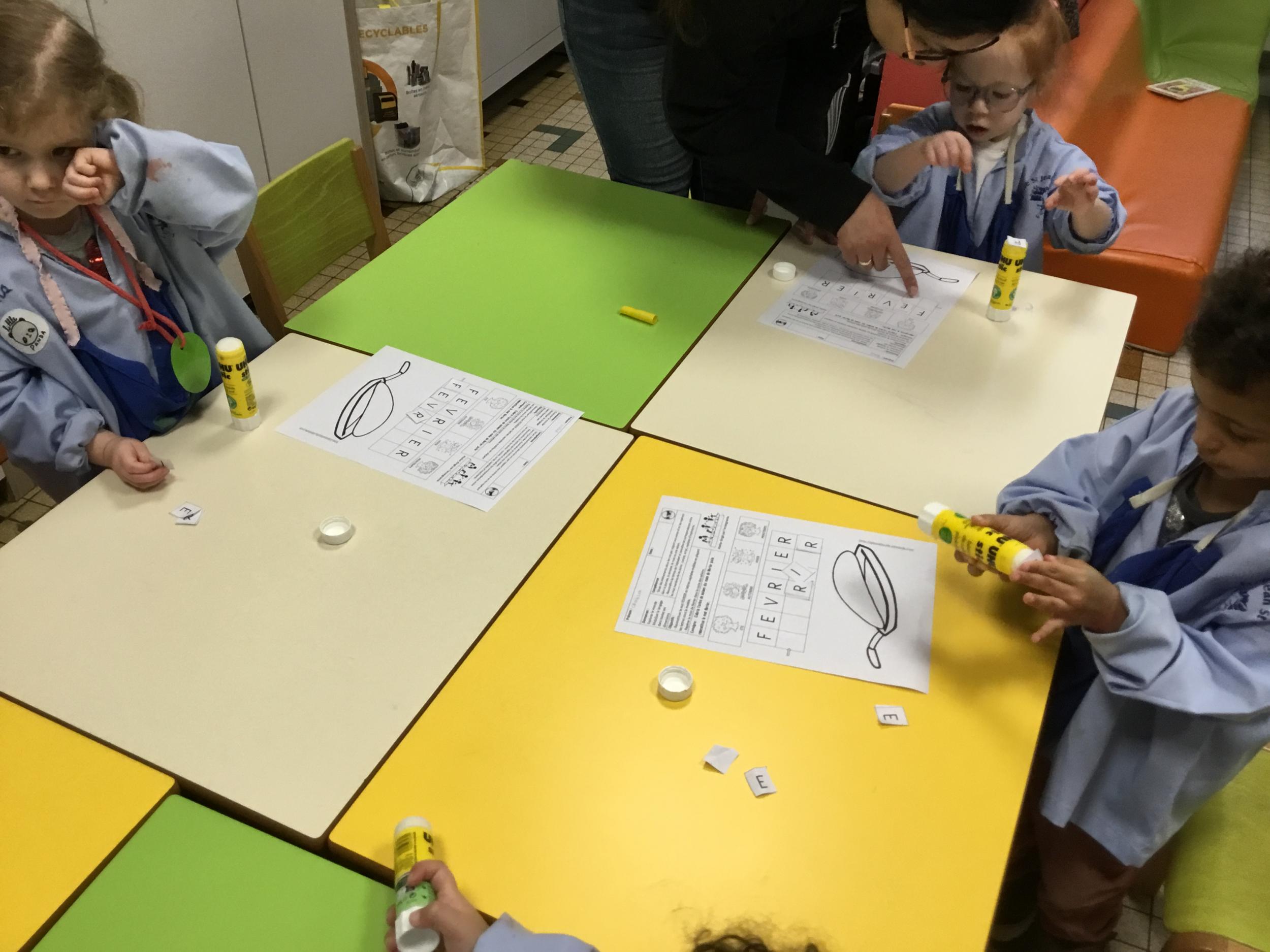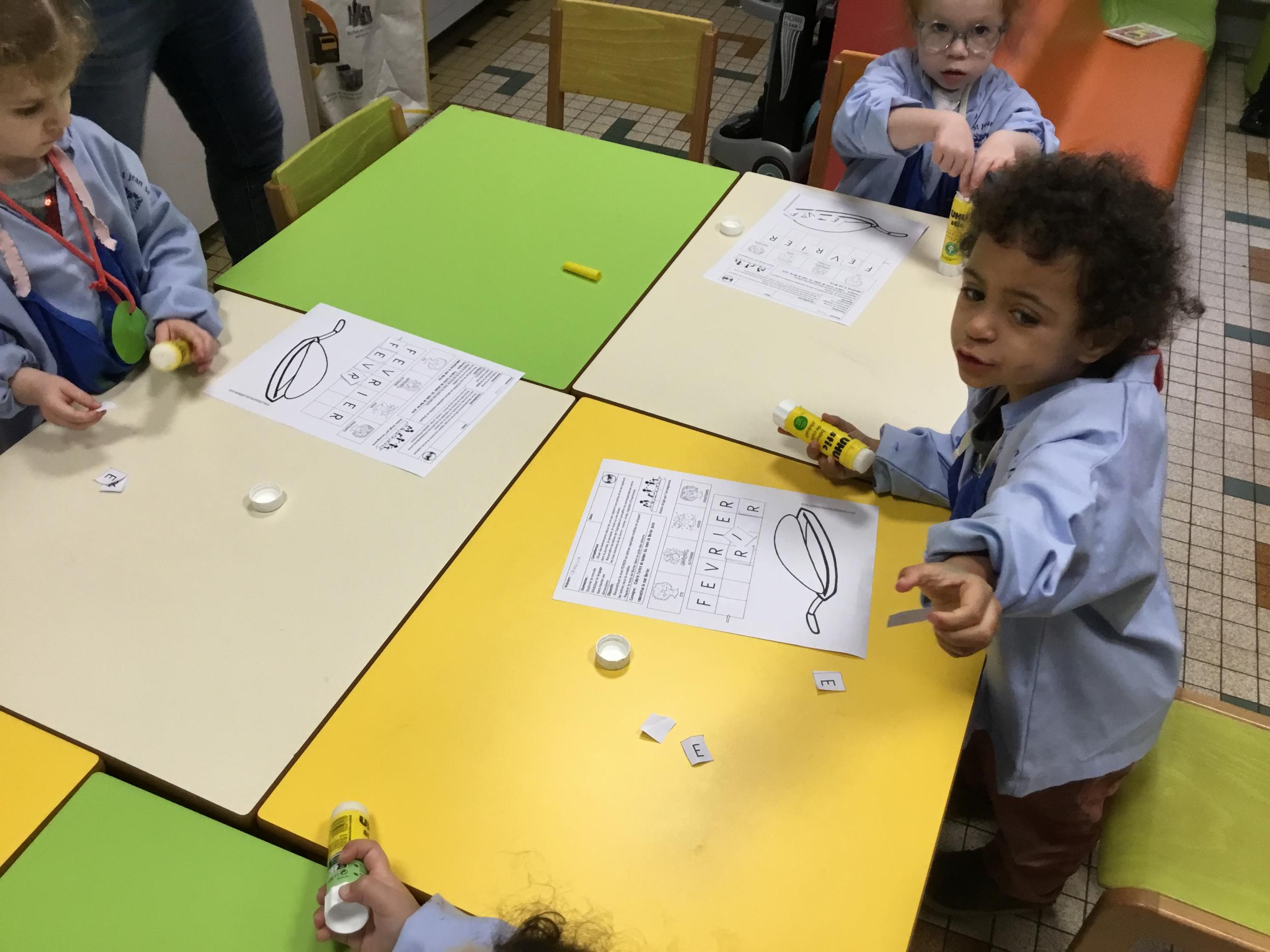 Petite et moyenne section 15/02/2026 Cette semaine découpage, graphisme et écriture du mot « Février » Aligner des gommettes Tracer des traits horizontaux en respectant un code couleur Découper La fiche du mois de février Les émotions en anglais Bravo Emma !