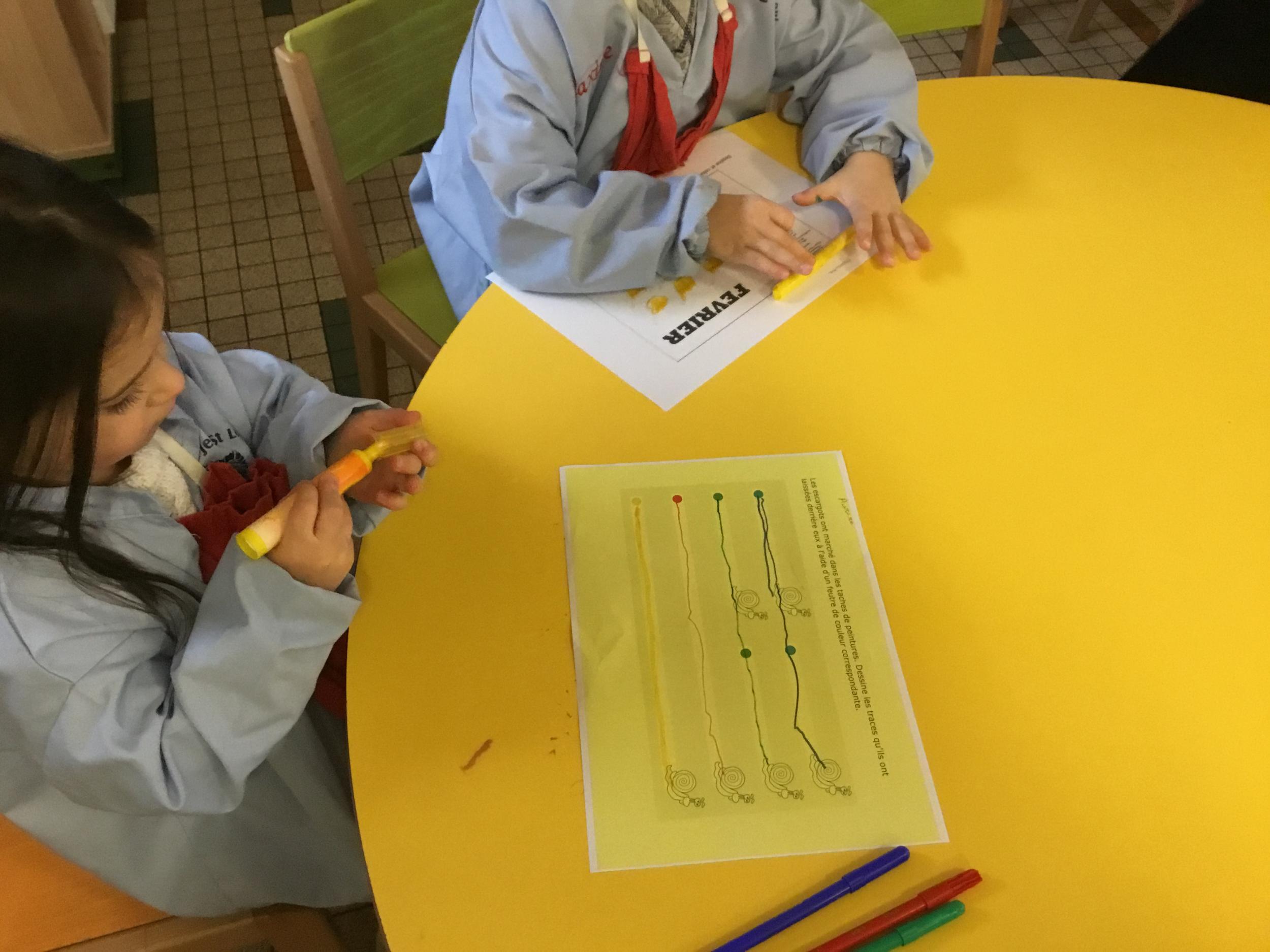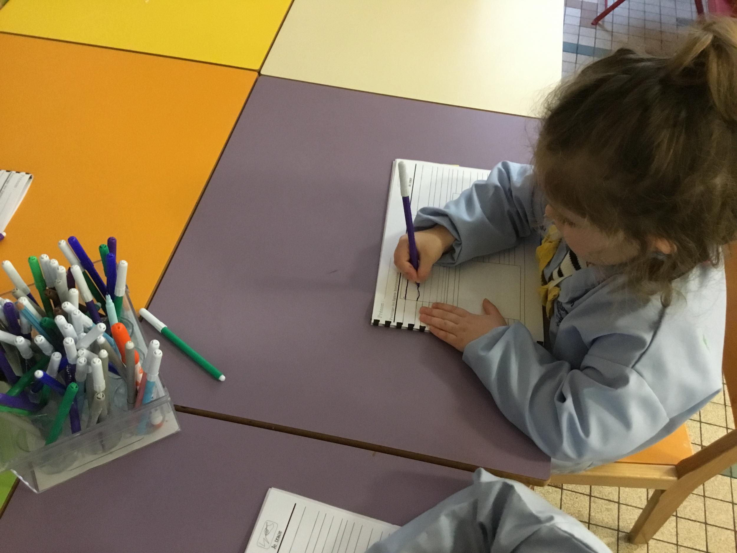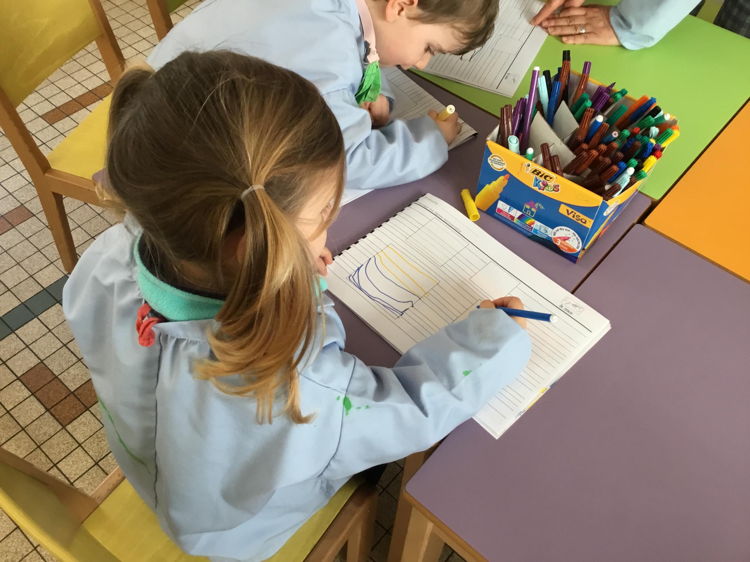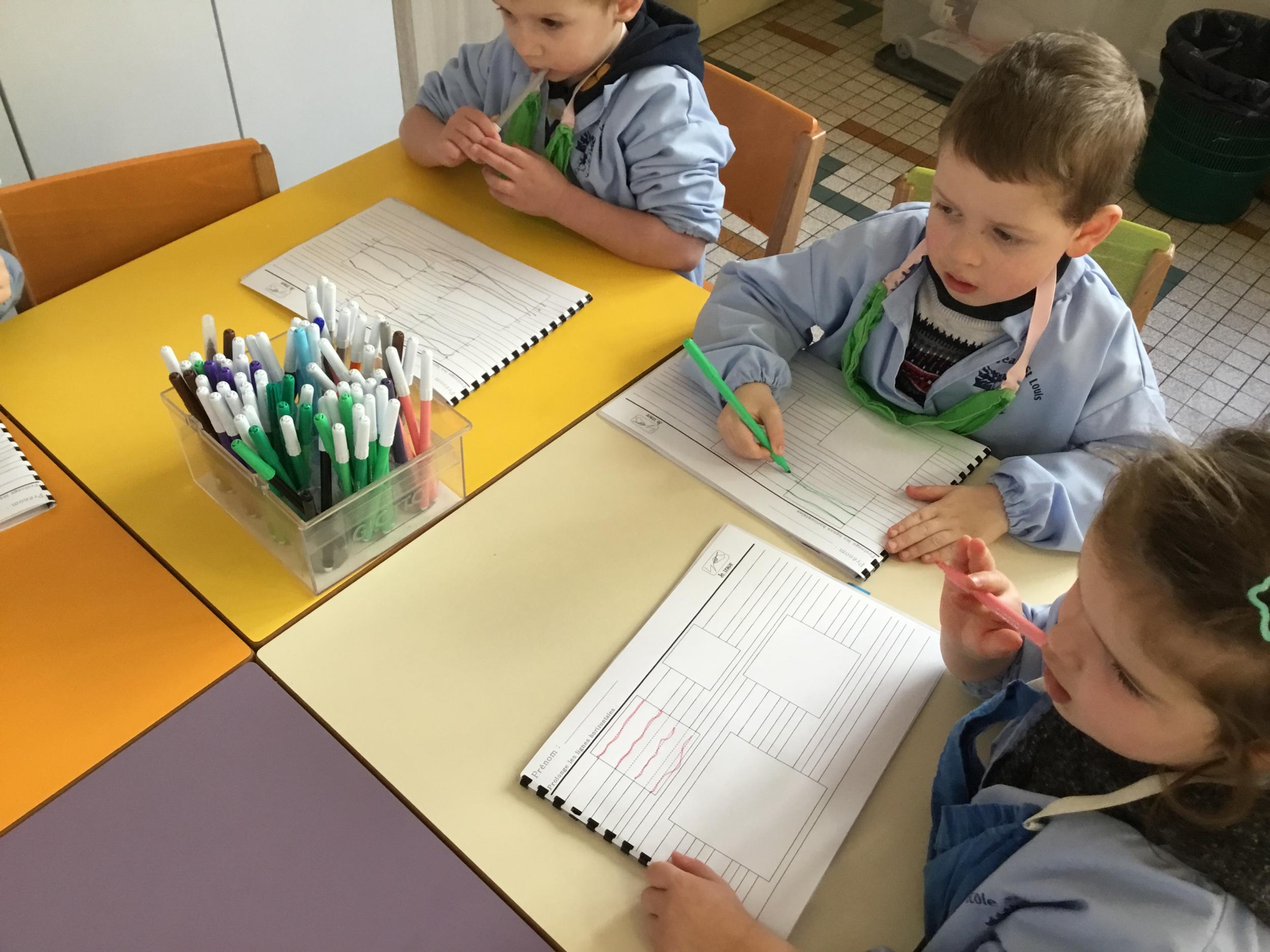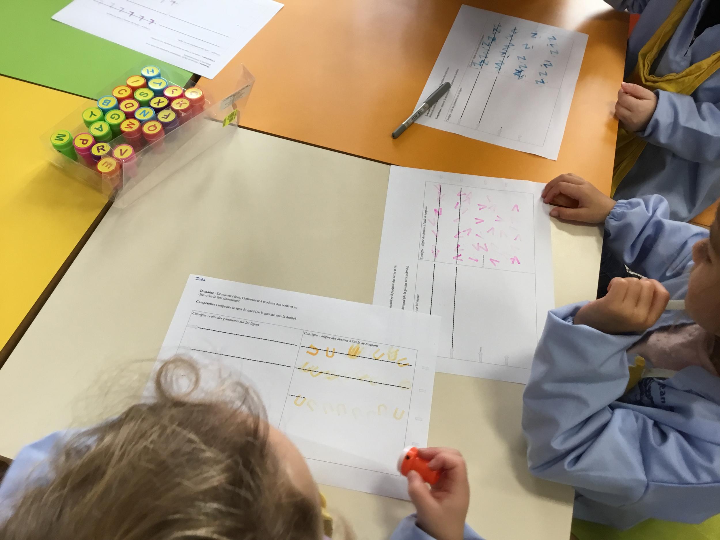 Après le trait vertical, les élèves ont travaillé autour du trait horizontal. Ces séances leur ont permis d’appréhender le sens de l’écrit de la gauche vers la droite et de maîtriser leur geste.